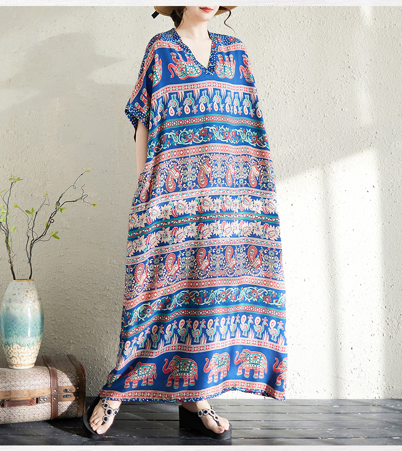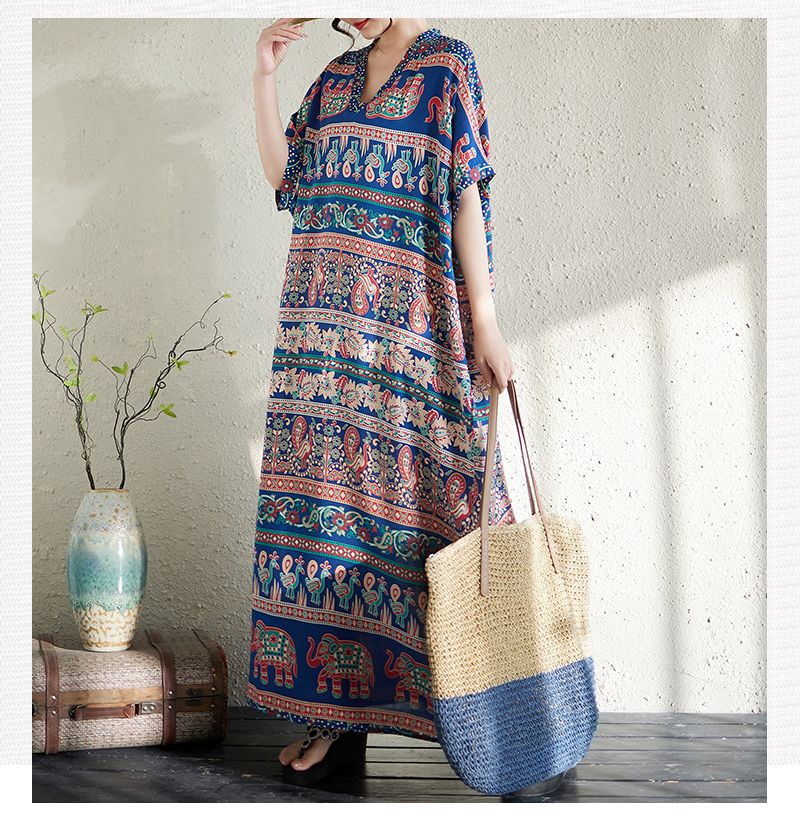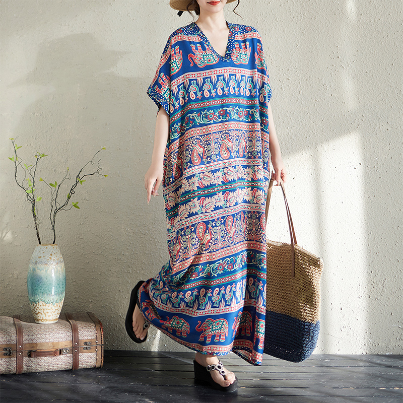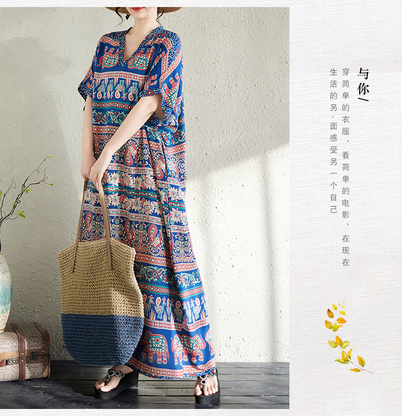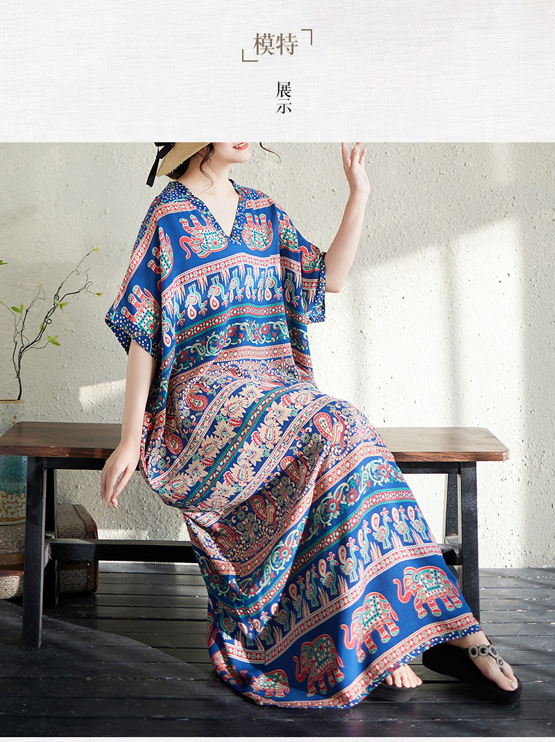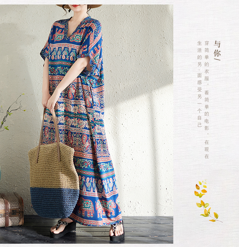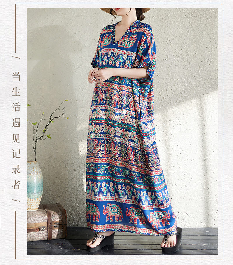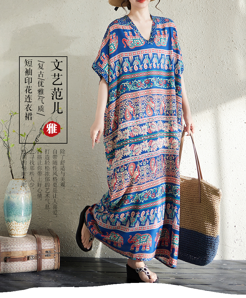 RY1196# 实拍2026夏季新款薄人棉印花v领宽松大码简约度假风长裙女沙滩裙