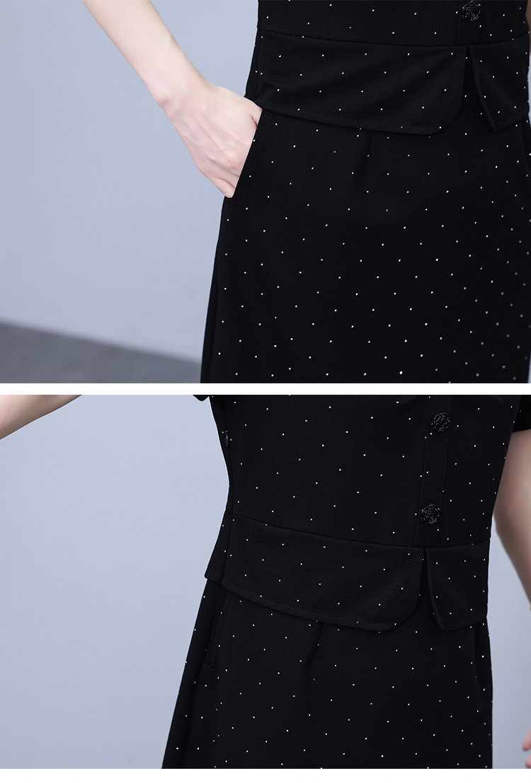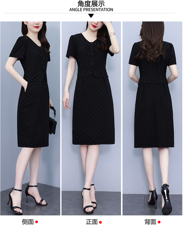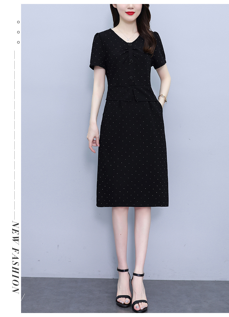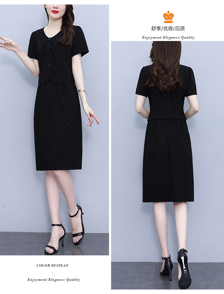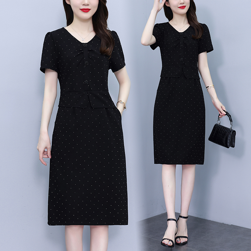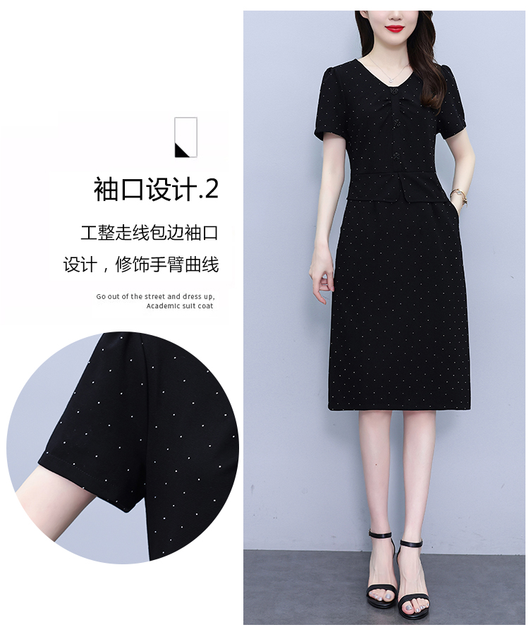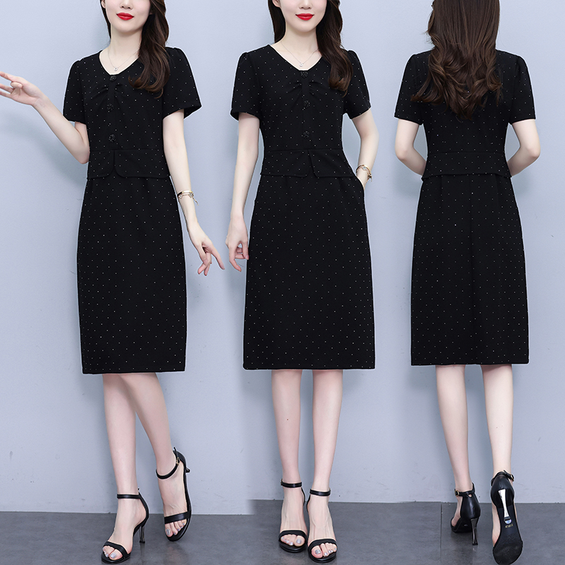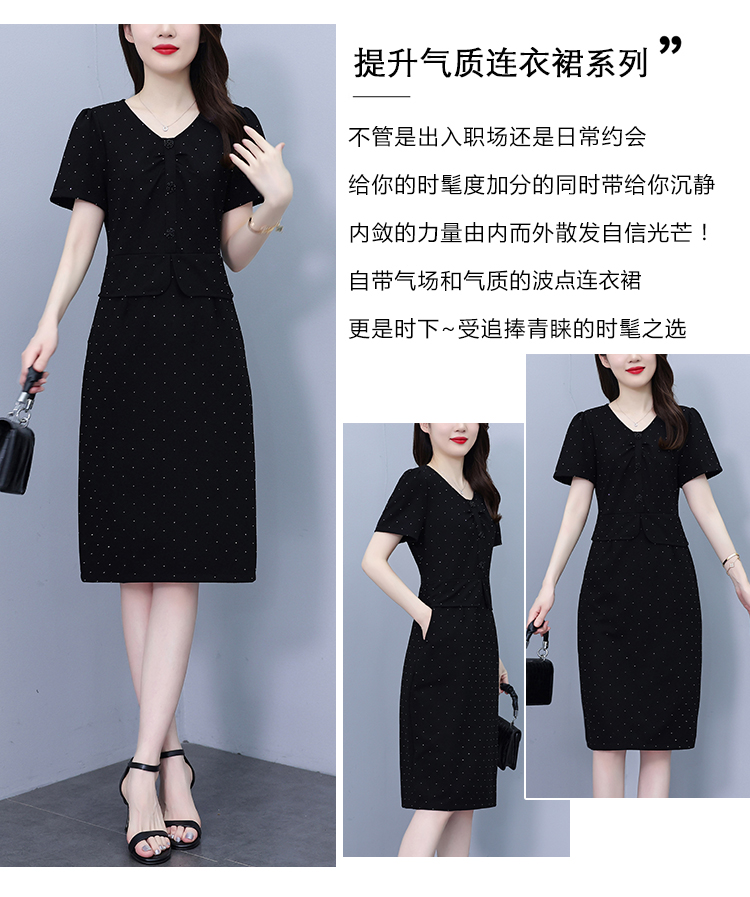 RY1198#夏季新款黑色精纺烫金修身花朵装饰显瘦遮肉大码连衣裙