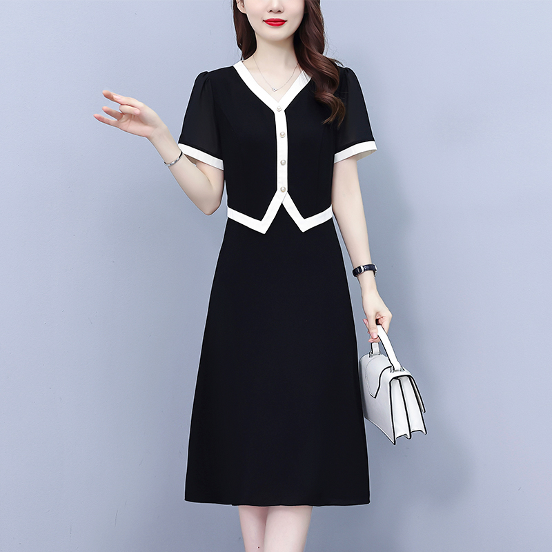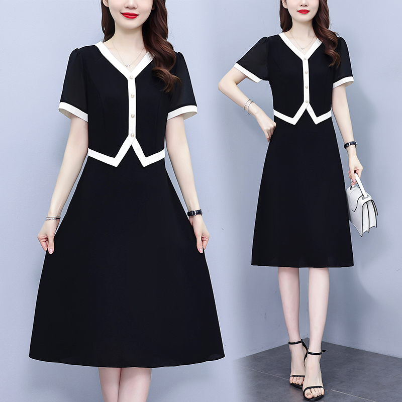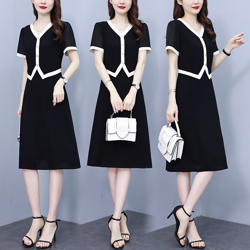RY1202# 大码女装连衣裙雪纺拼接假两件显瘦赫本风小黑裙