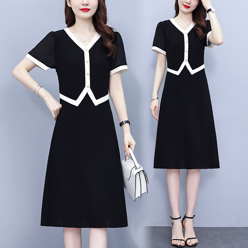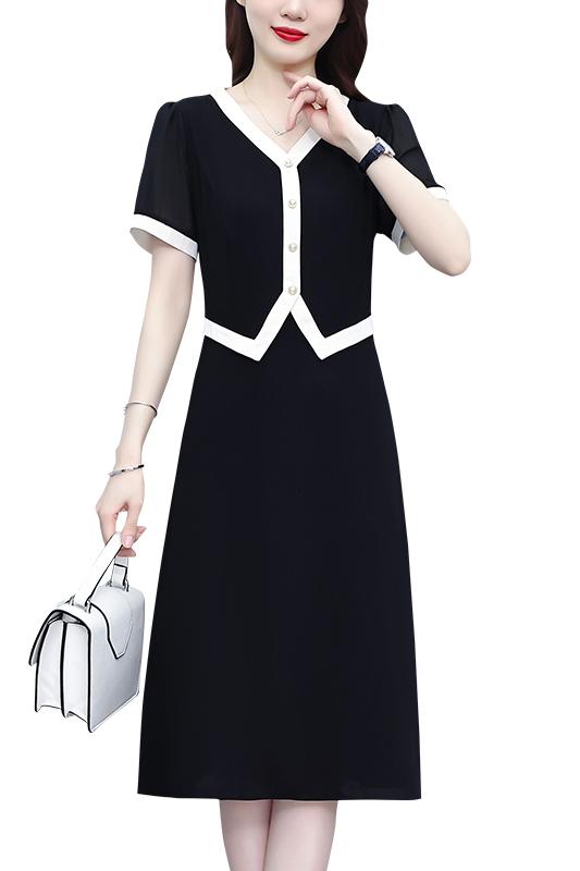 RY1209# 夏季新款大码女装连衣裙拼接优雅收腰中长款黑色裙子