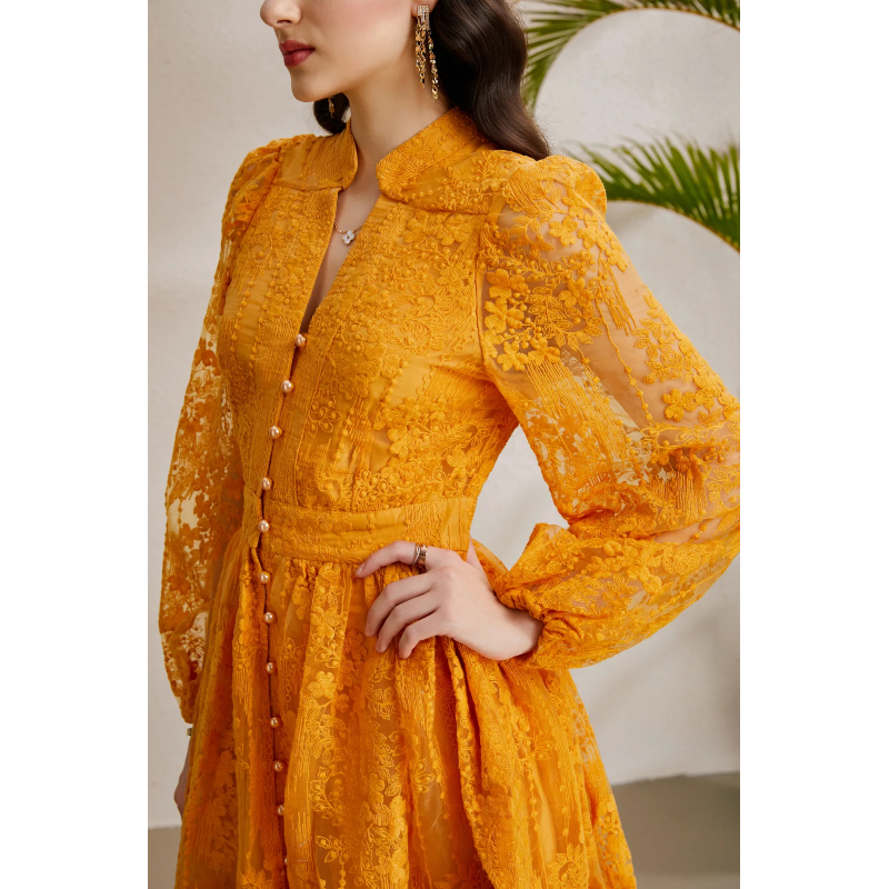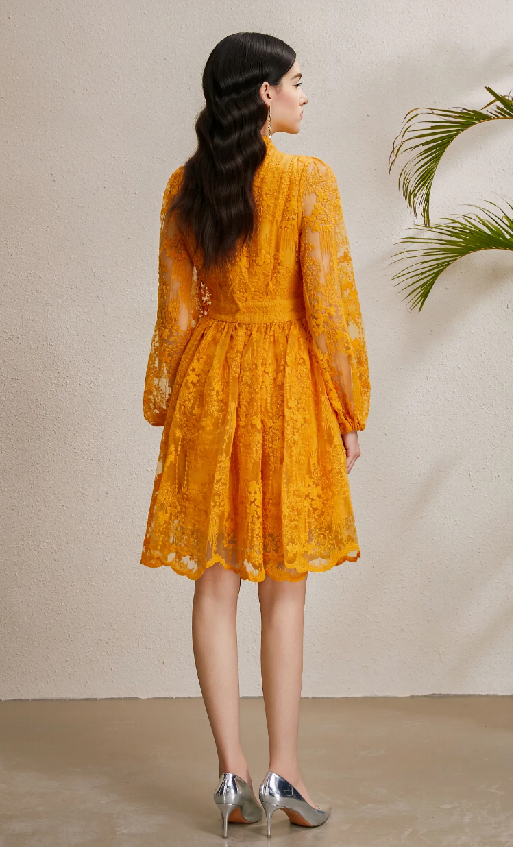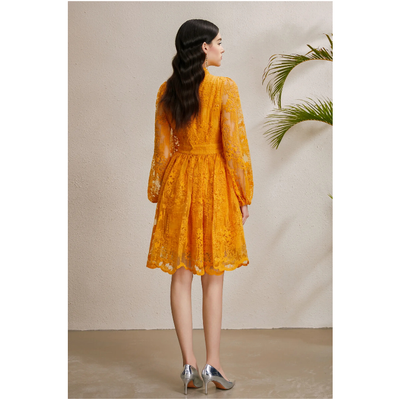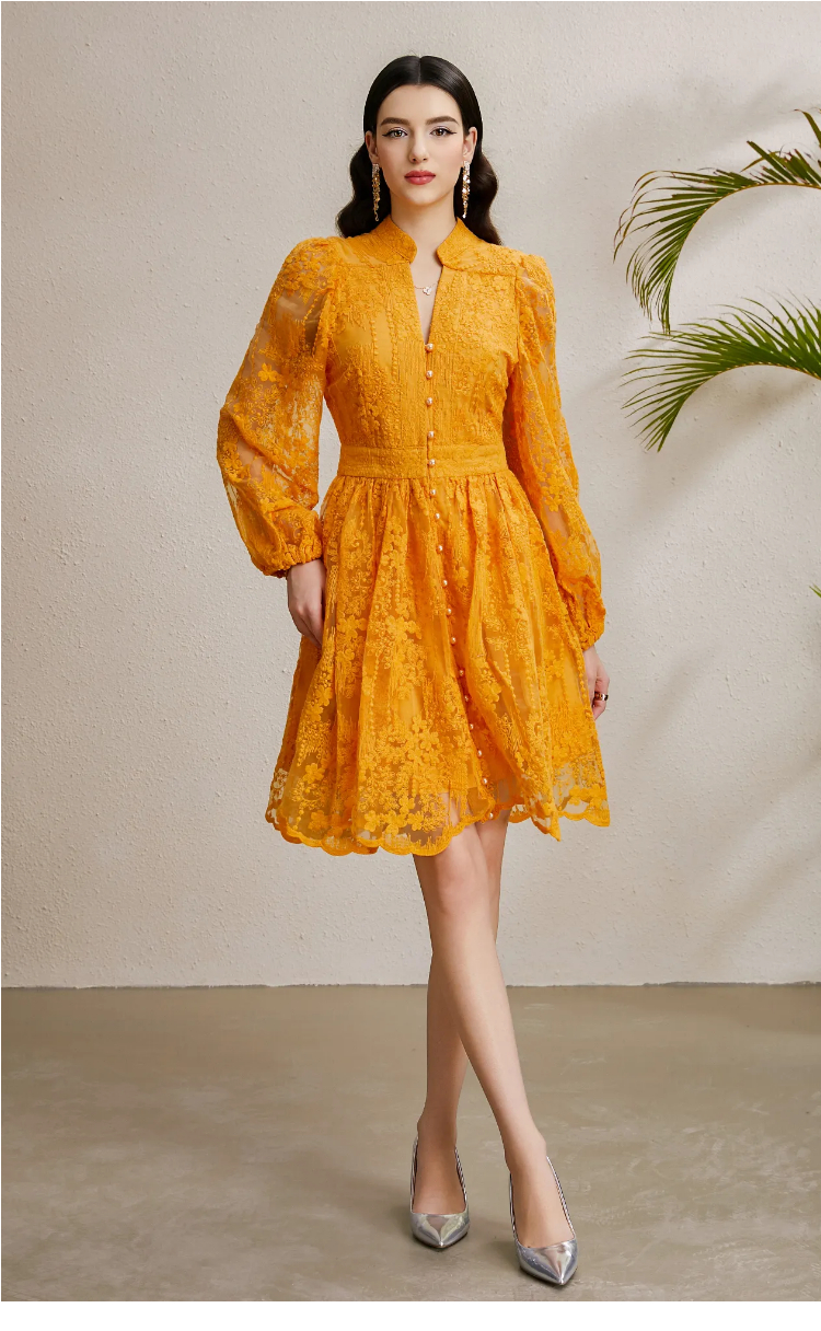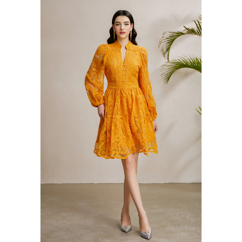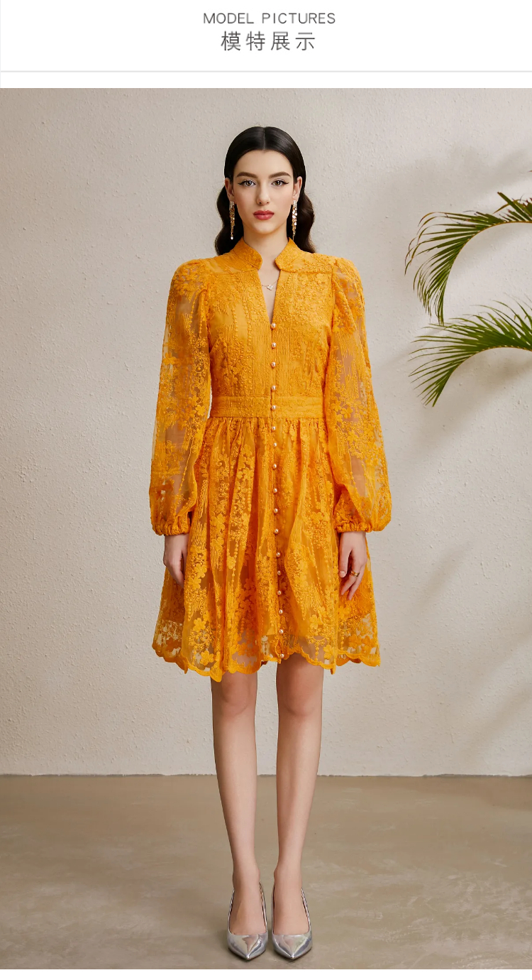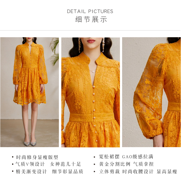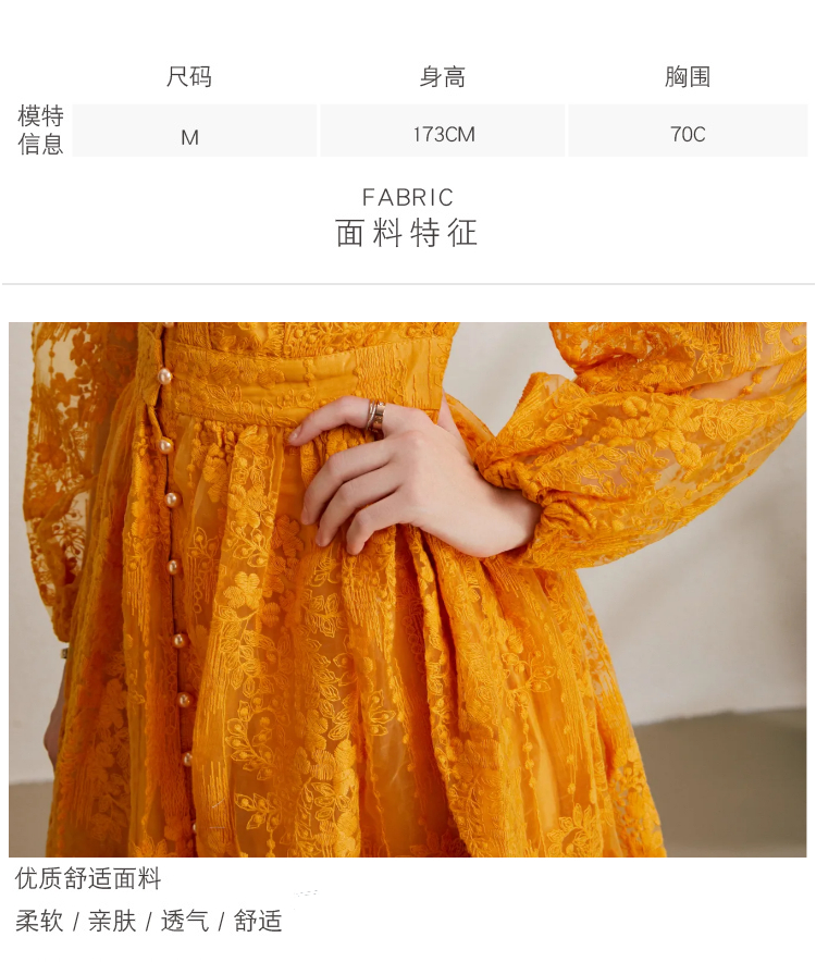 RY1229# 度假V领灯笼袖缩褶阔摆刺绣连衣裙