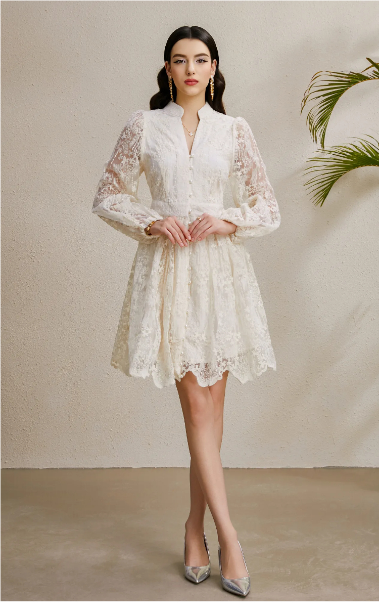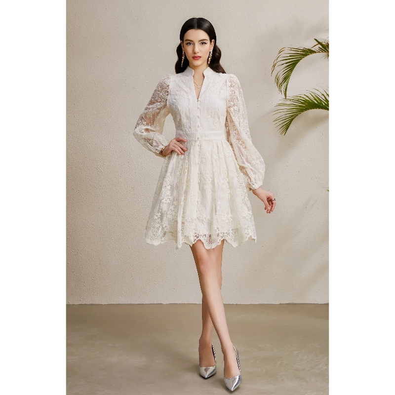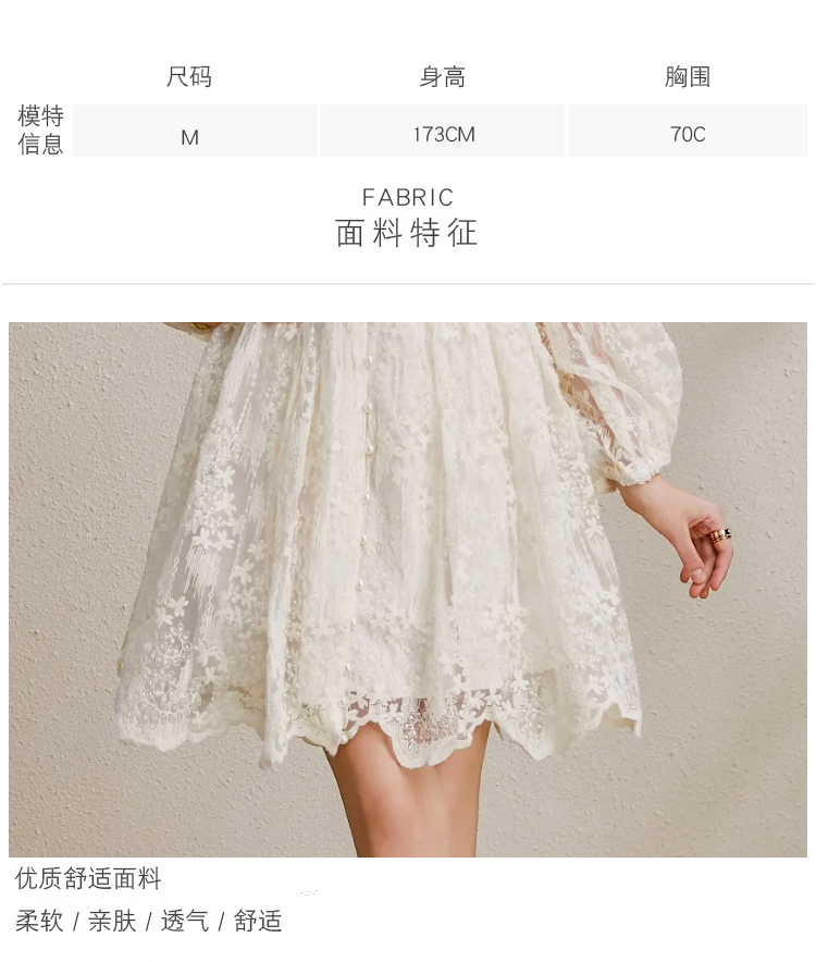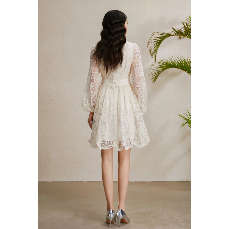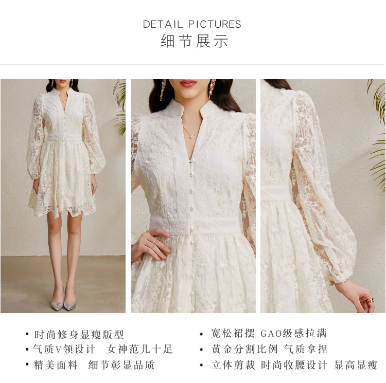 RY1233# 度假V领灯笼袖缩褶阔摆刺绣连衣裙