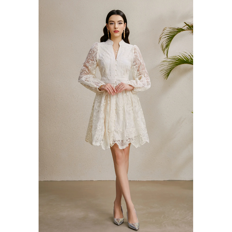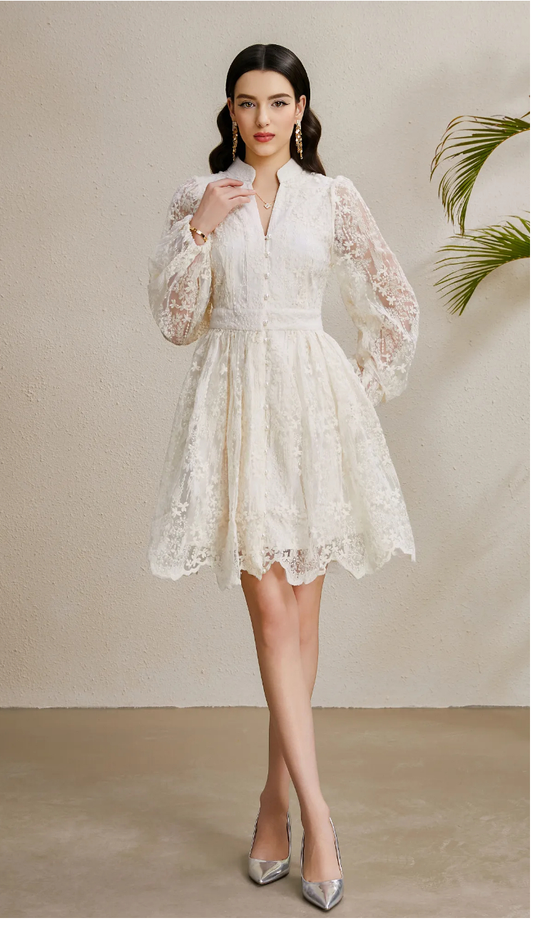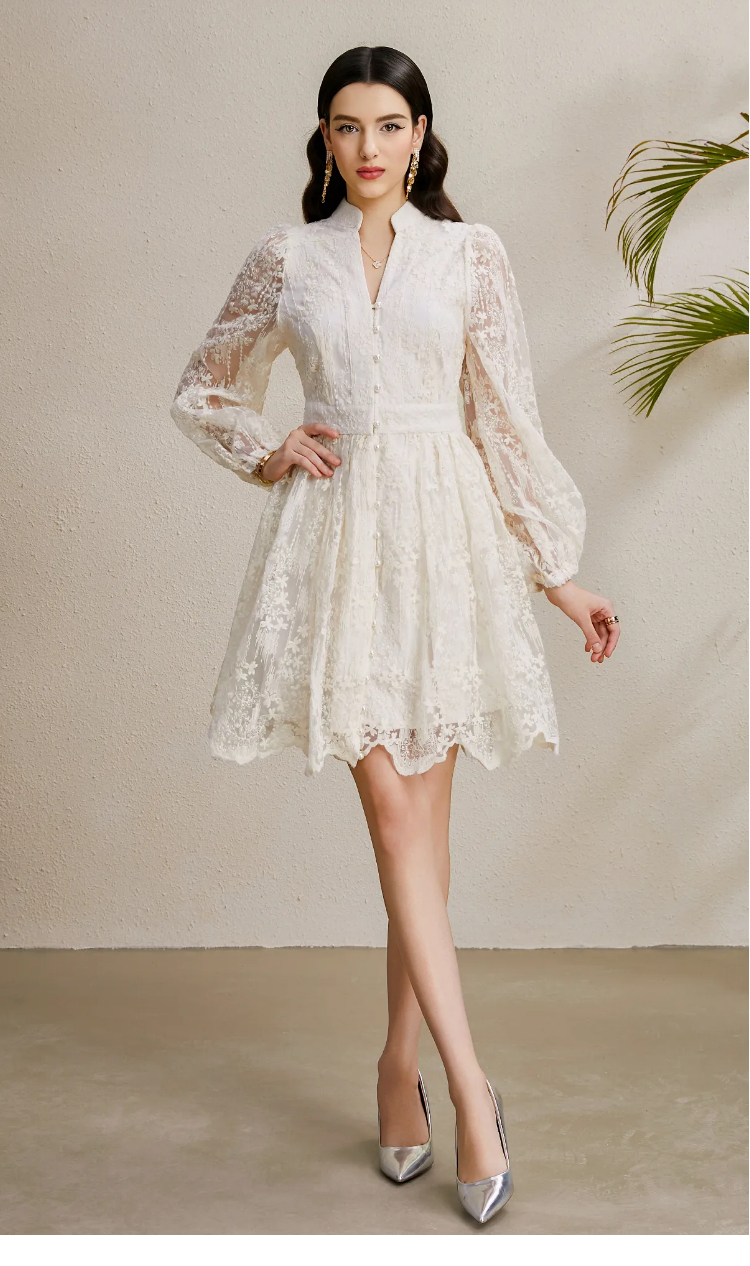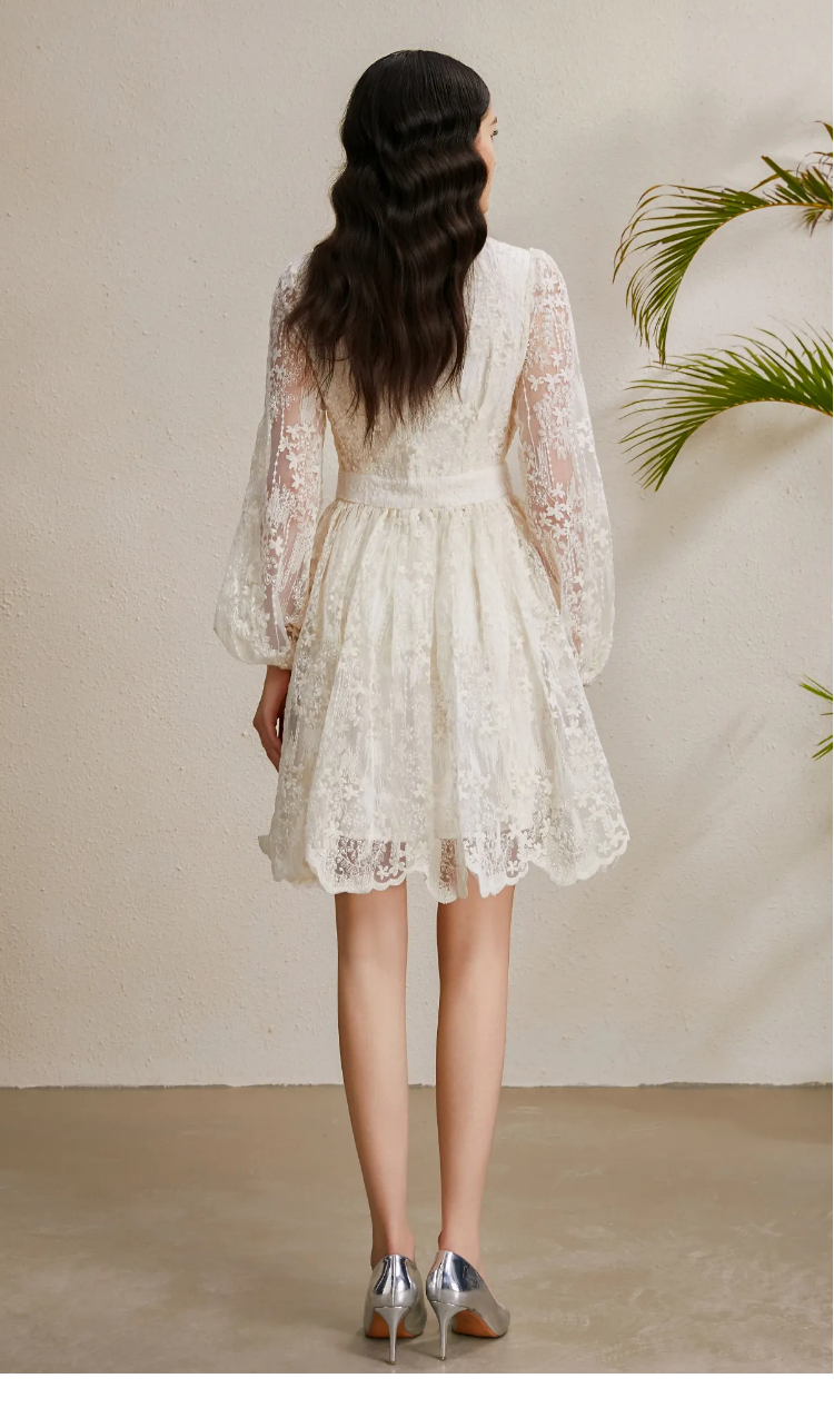 RY1233# 度假V领灯笼袖缩褶阔摆刺绣连衣裙
