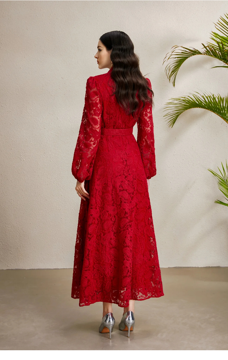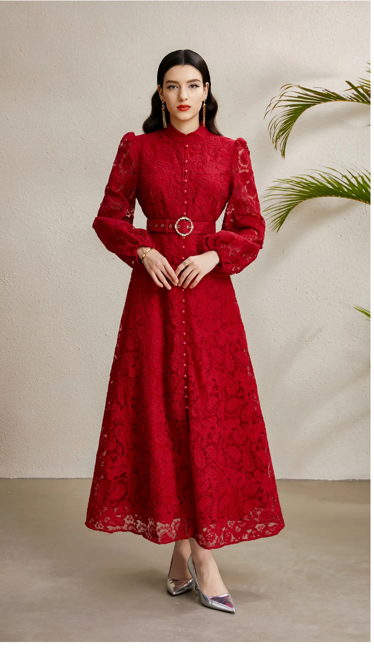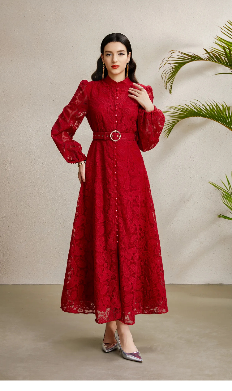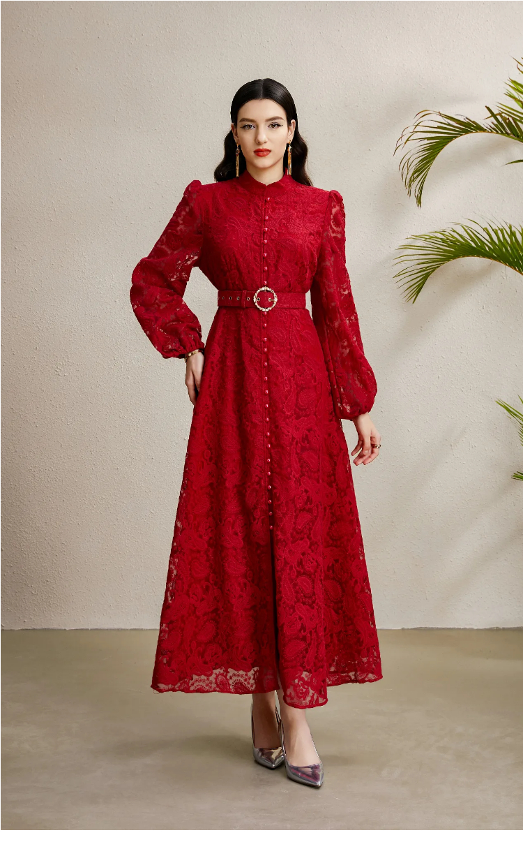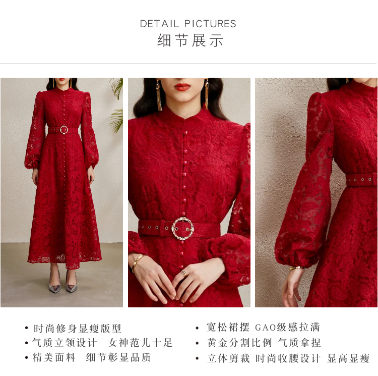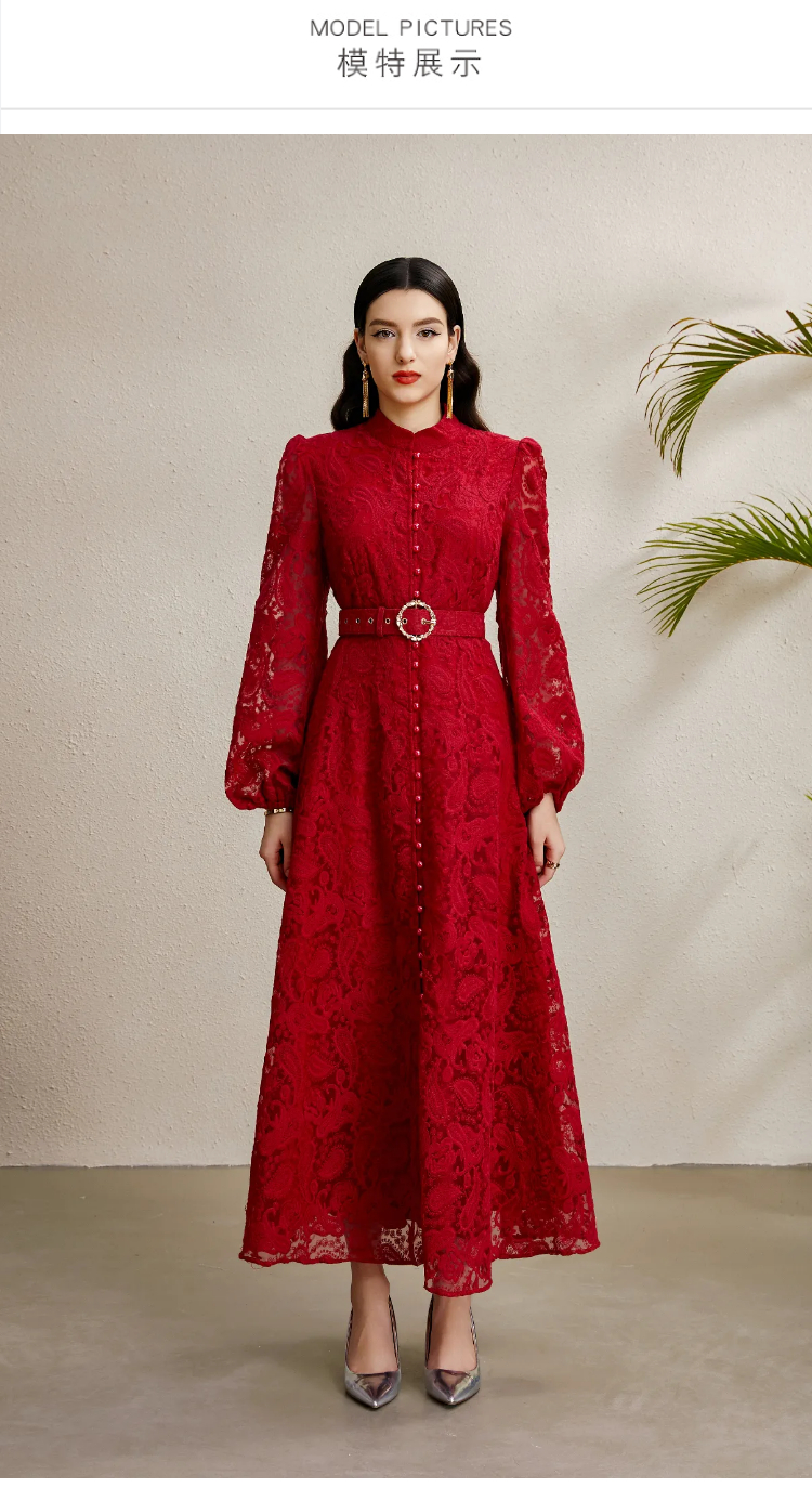 RY1238# 宫廷立领灯笼袖缩褶阔摆立体蕾丝连衣裙