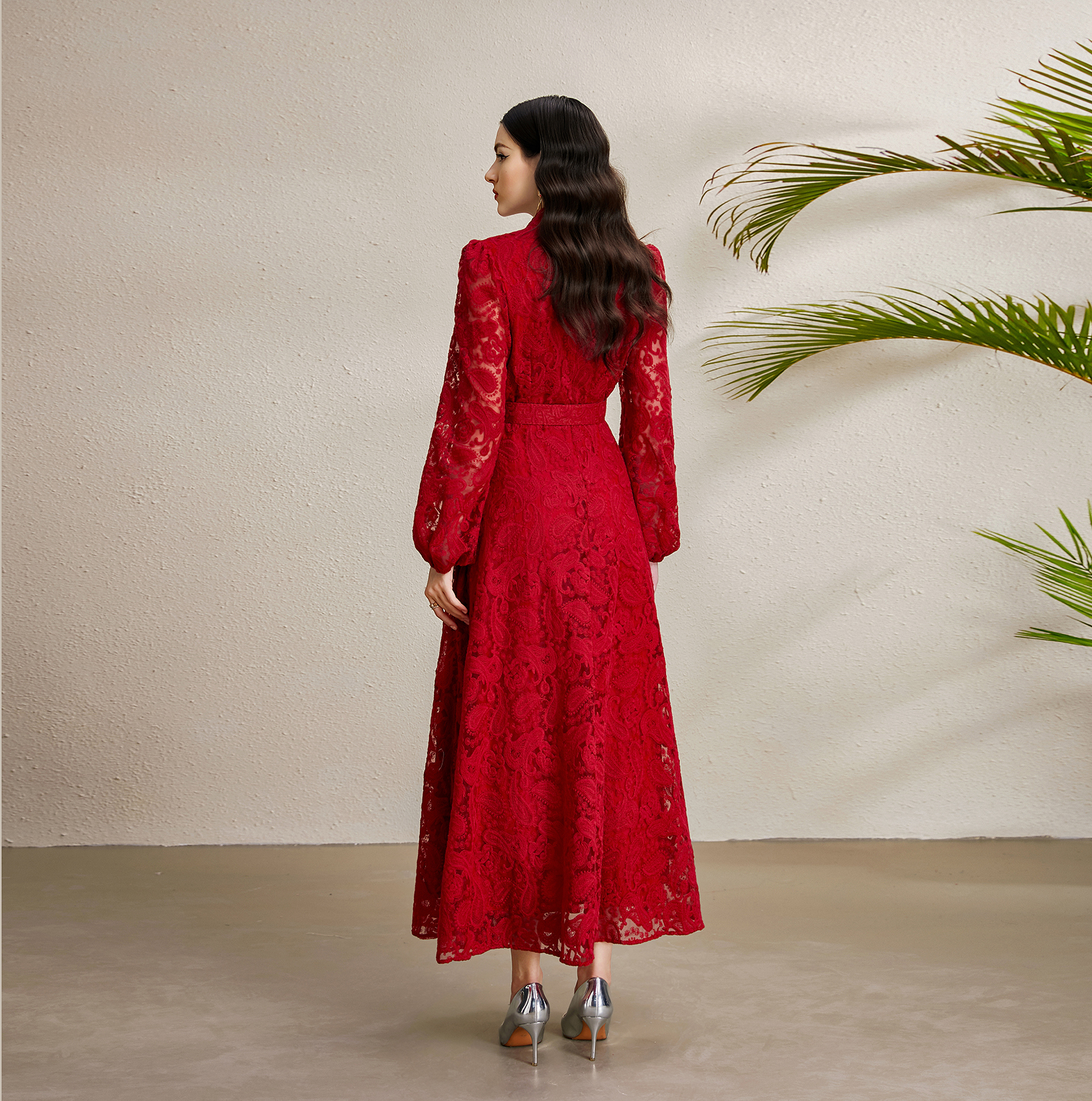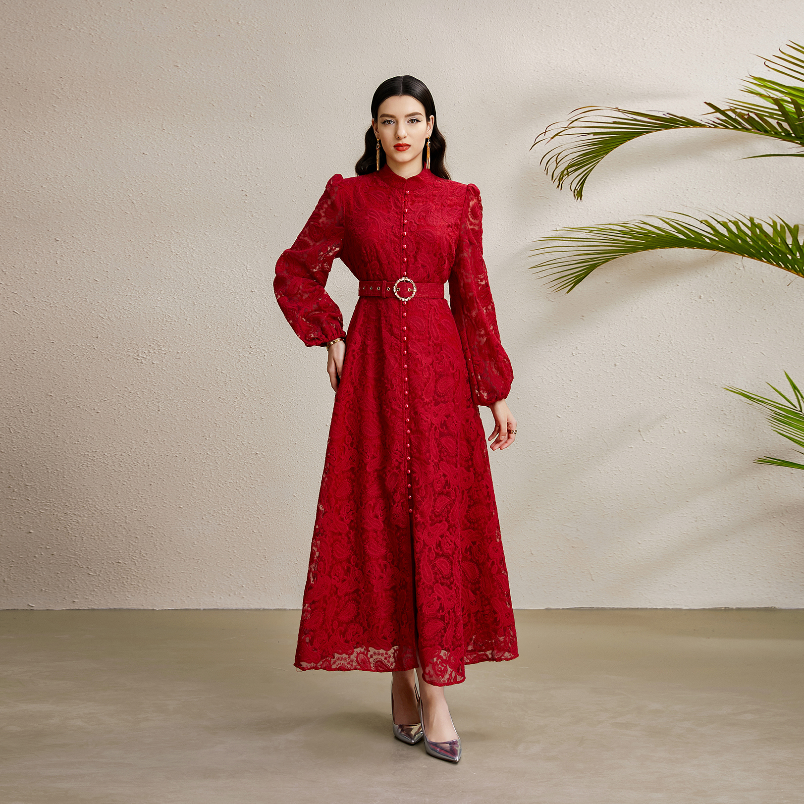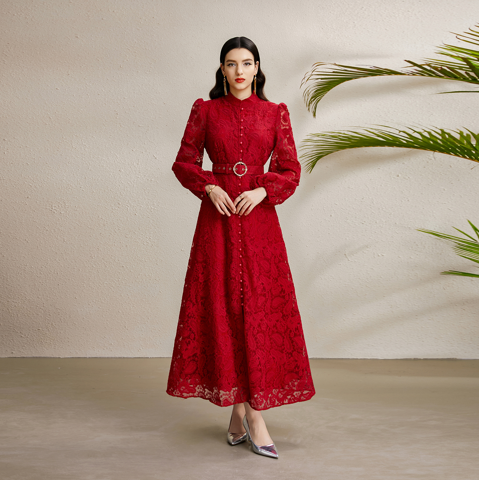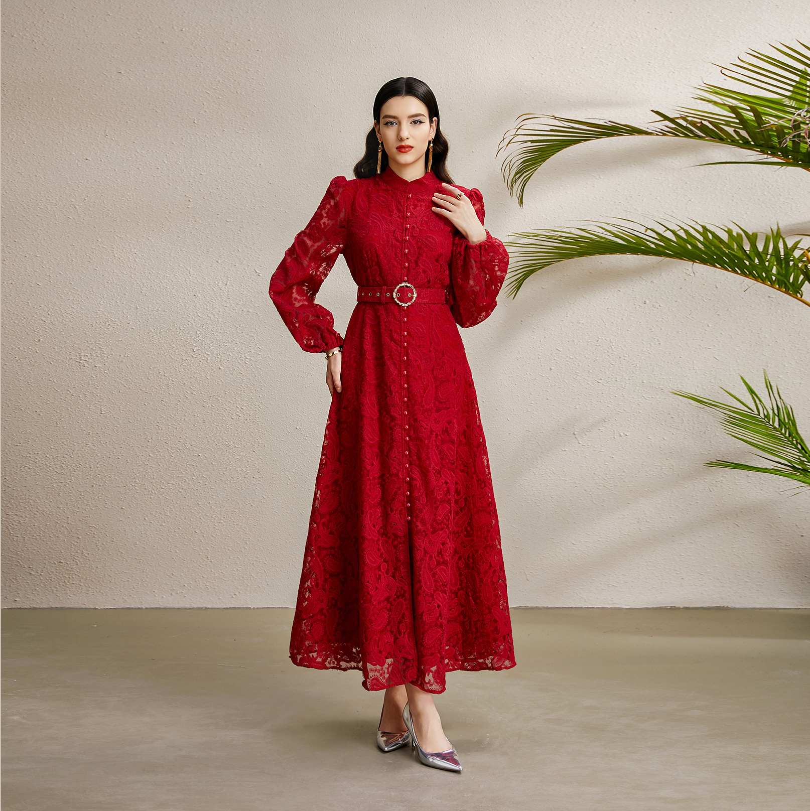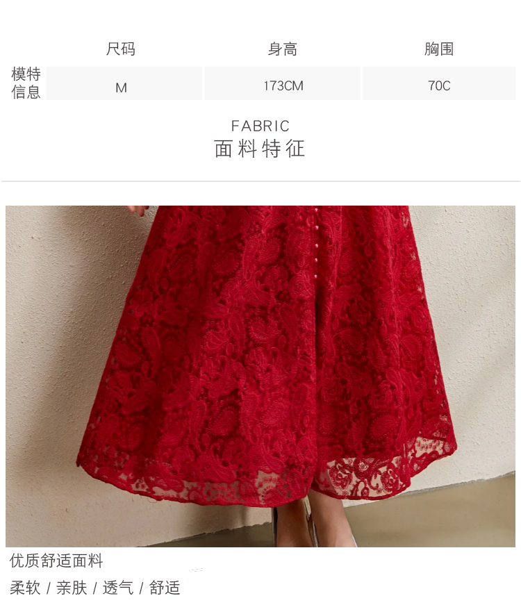 RY1238# 宫廷立领灯笼袖缩褶阔摆立体蕾丝连衣裙