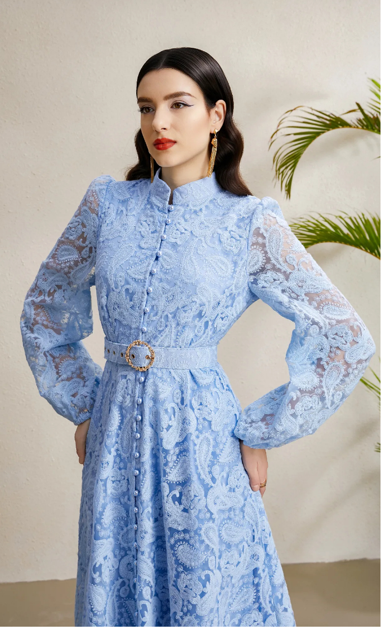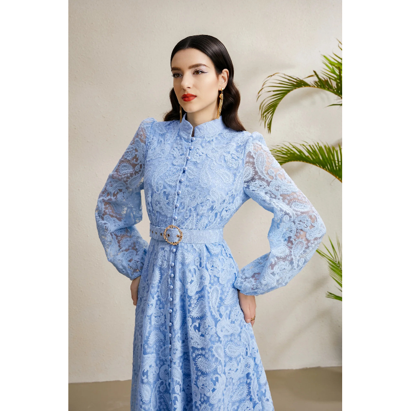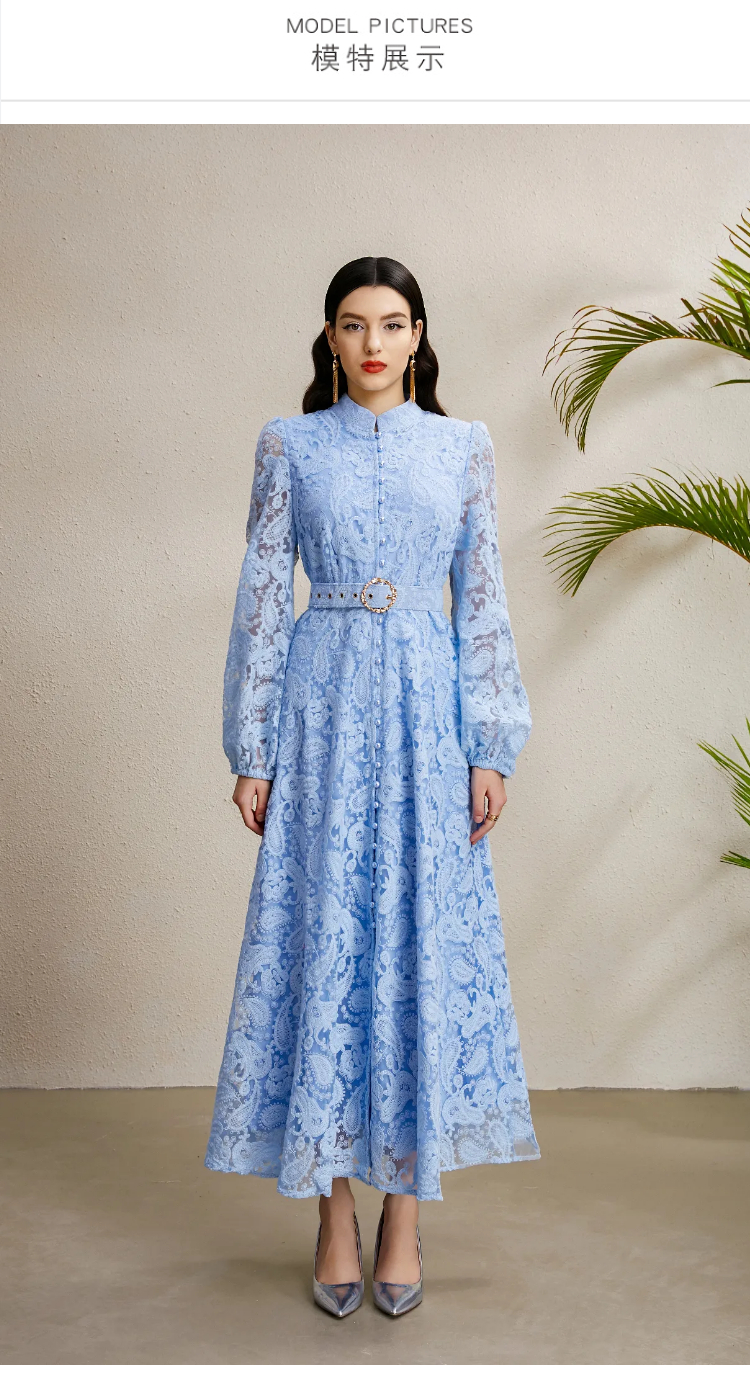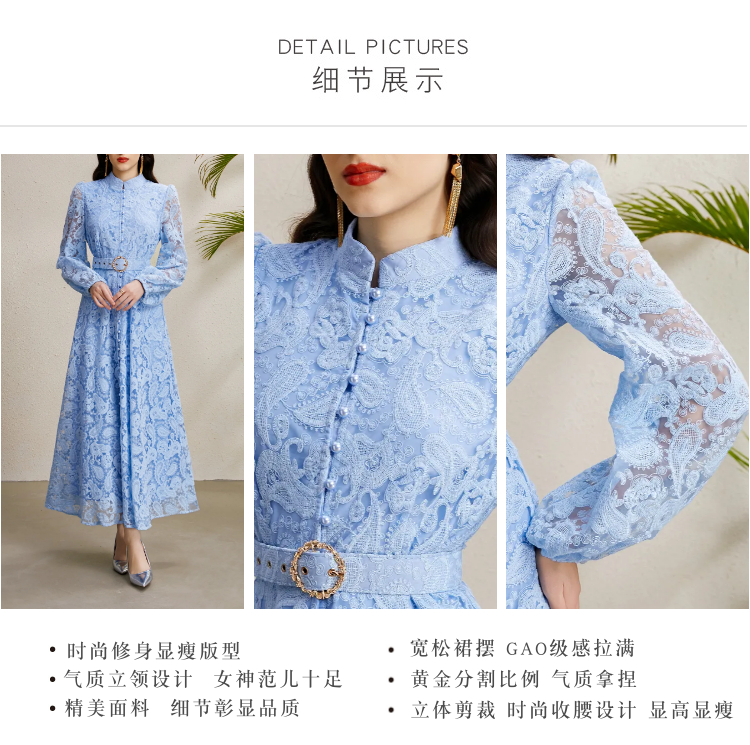 RY1240# 宫廷立领灯笼袖缩褶阔摆立体蕾丝连衣裙