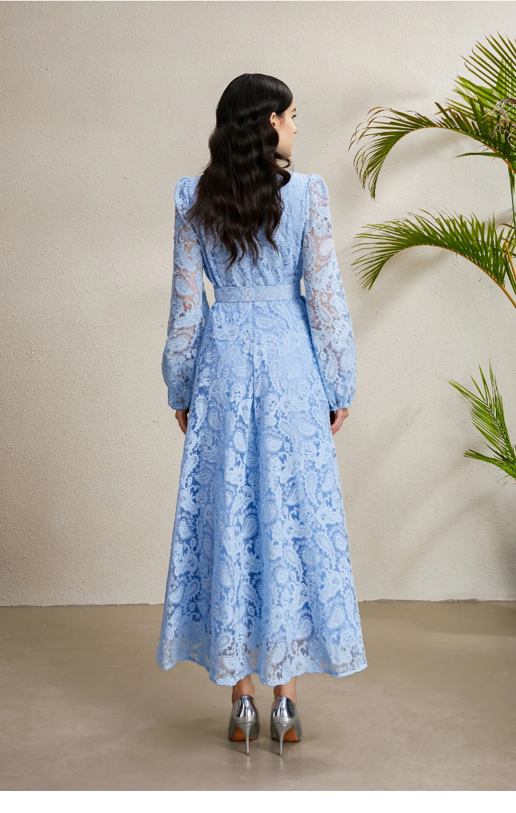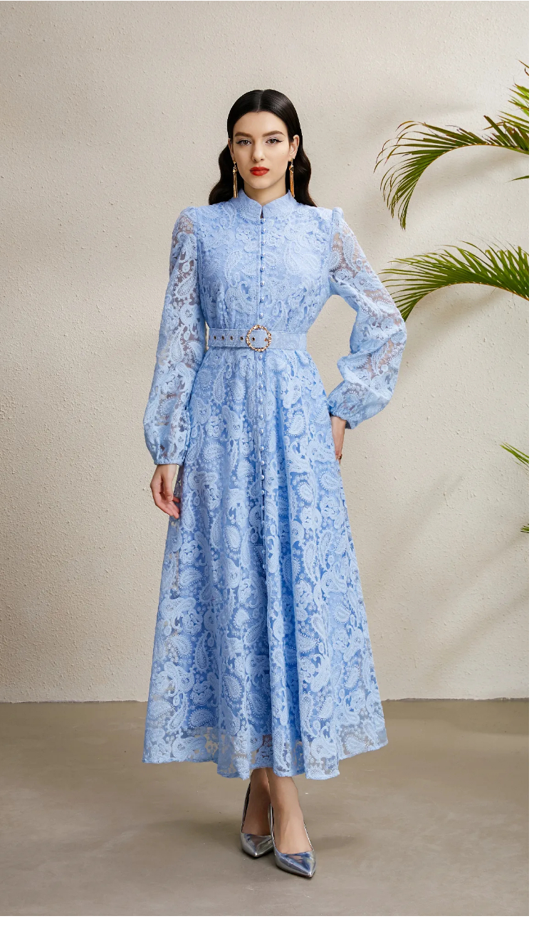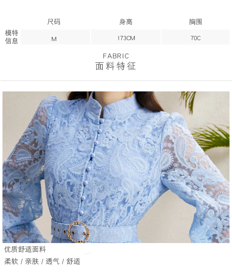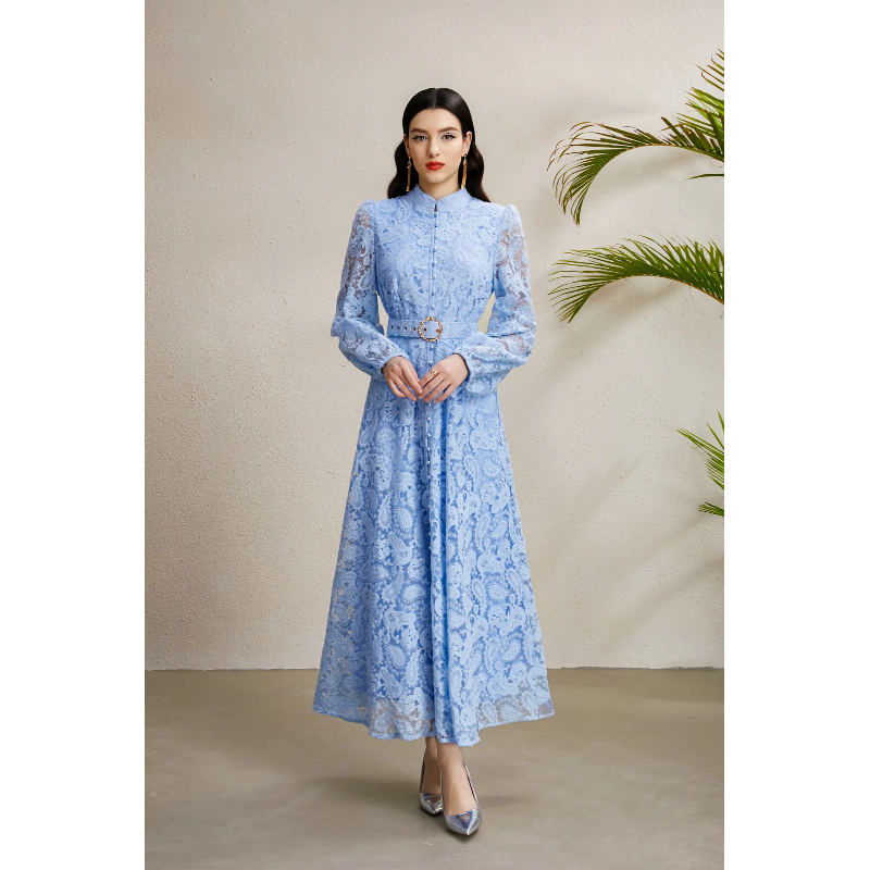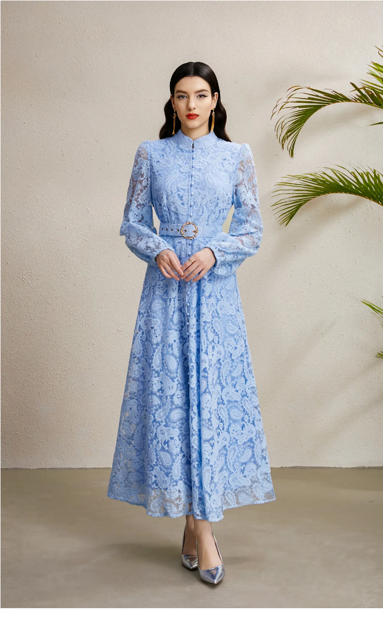 RY1240# 宫廷立领灯笼袖缩褶阔摆立体蕾丝连衣裙