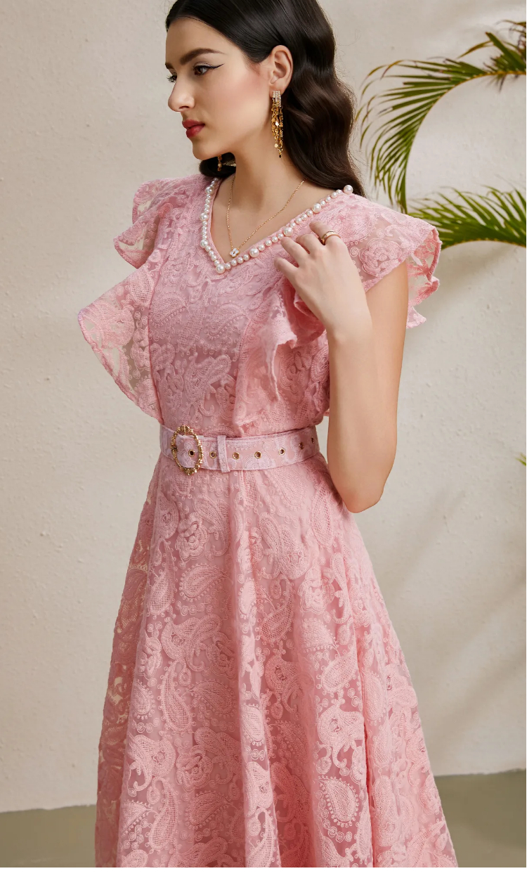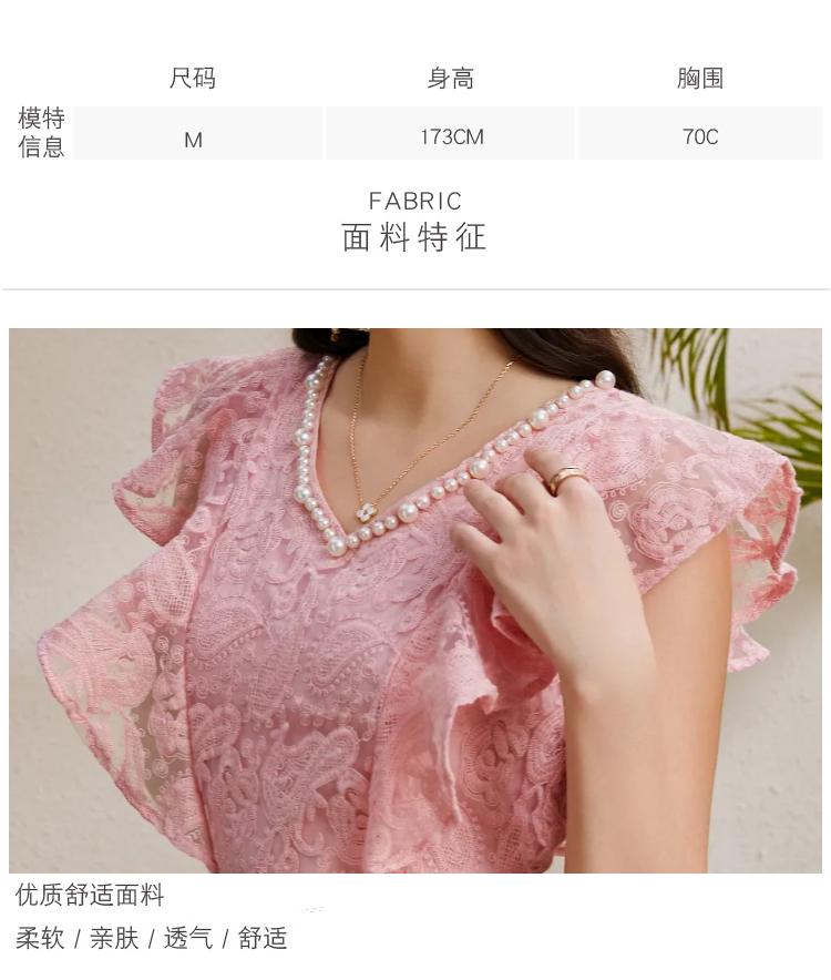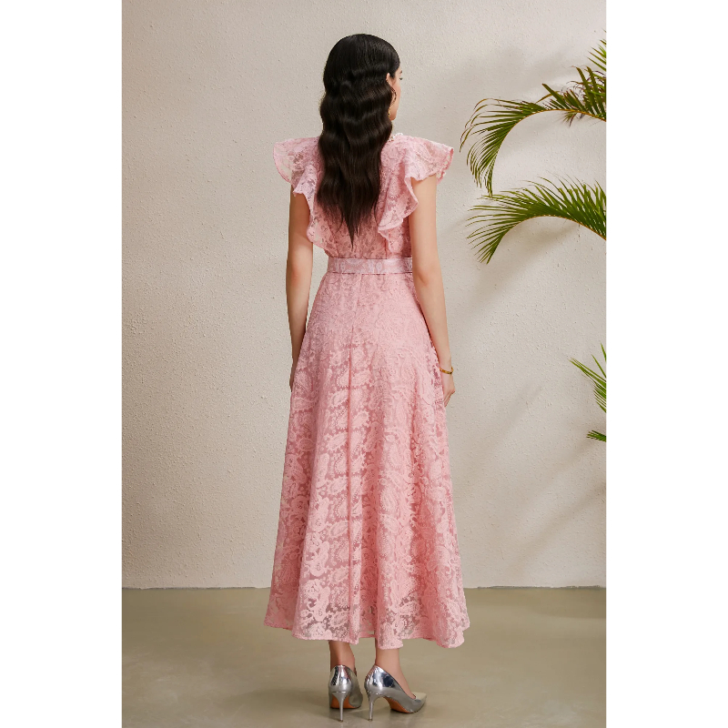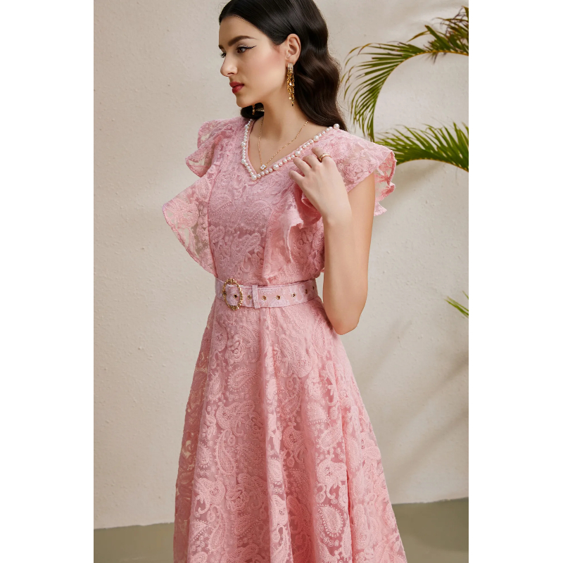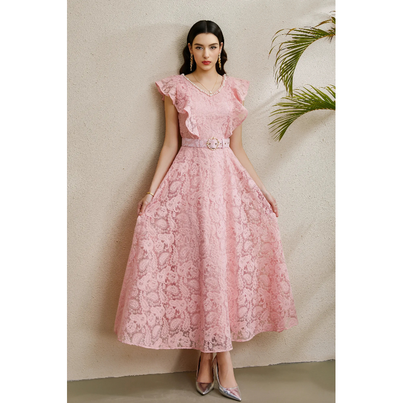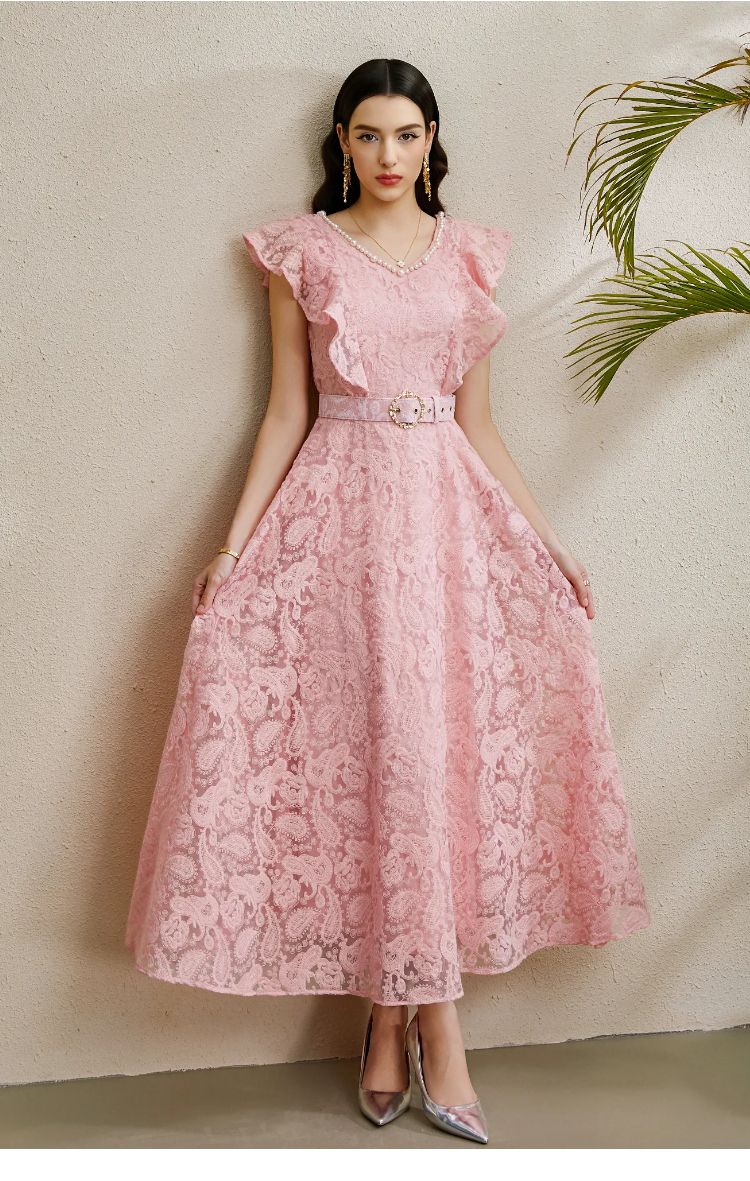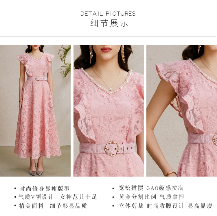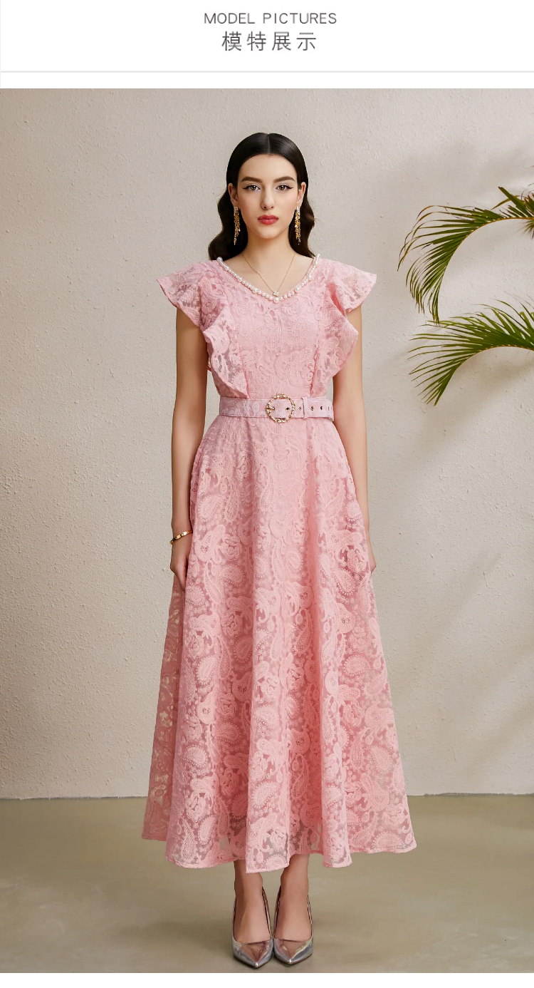 RY1242# 度假V领刺钉珠阔摆飞袖长款连衣裙