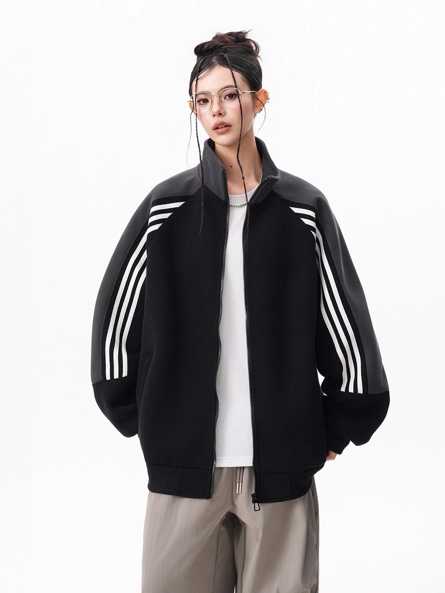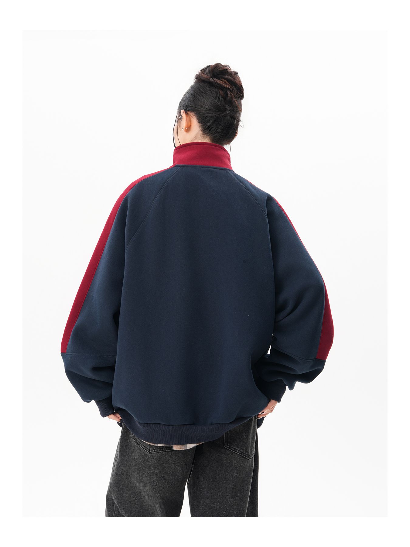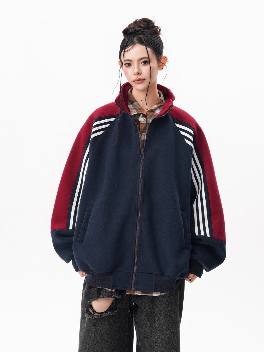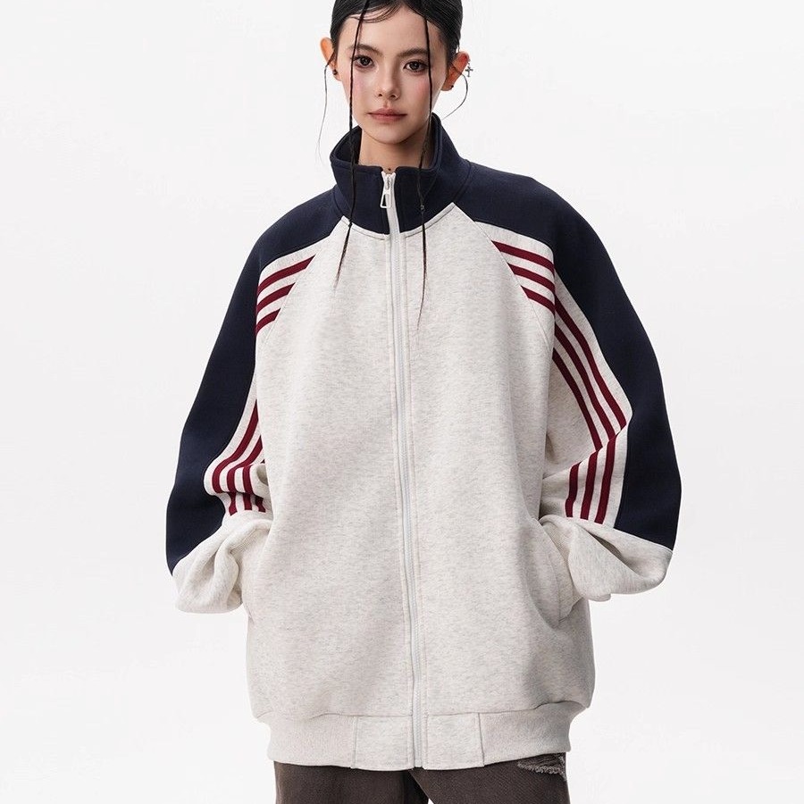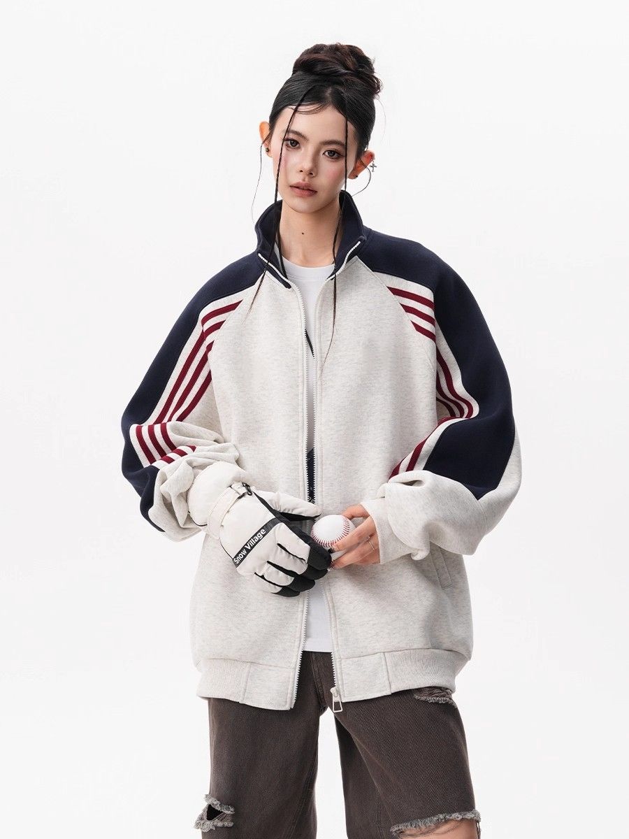 RY1278# 美式复古插肩袖立领卫衣女男宽松休闲运动棒球服情侣