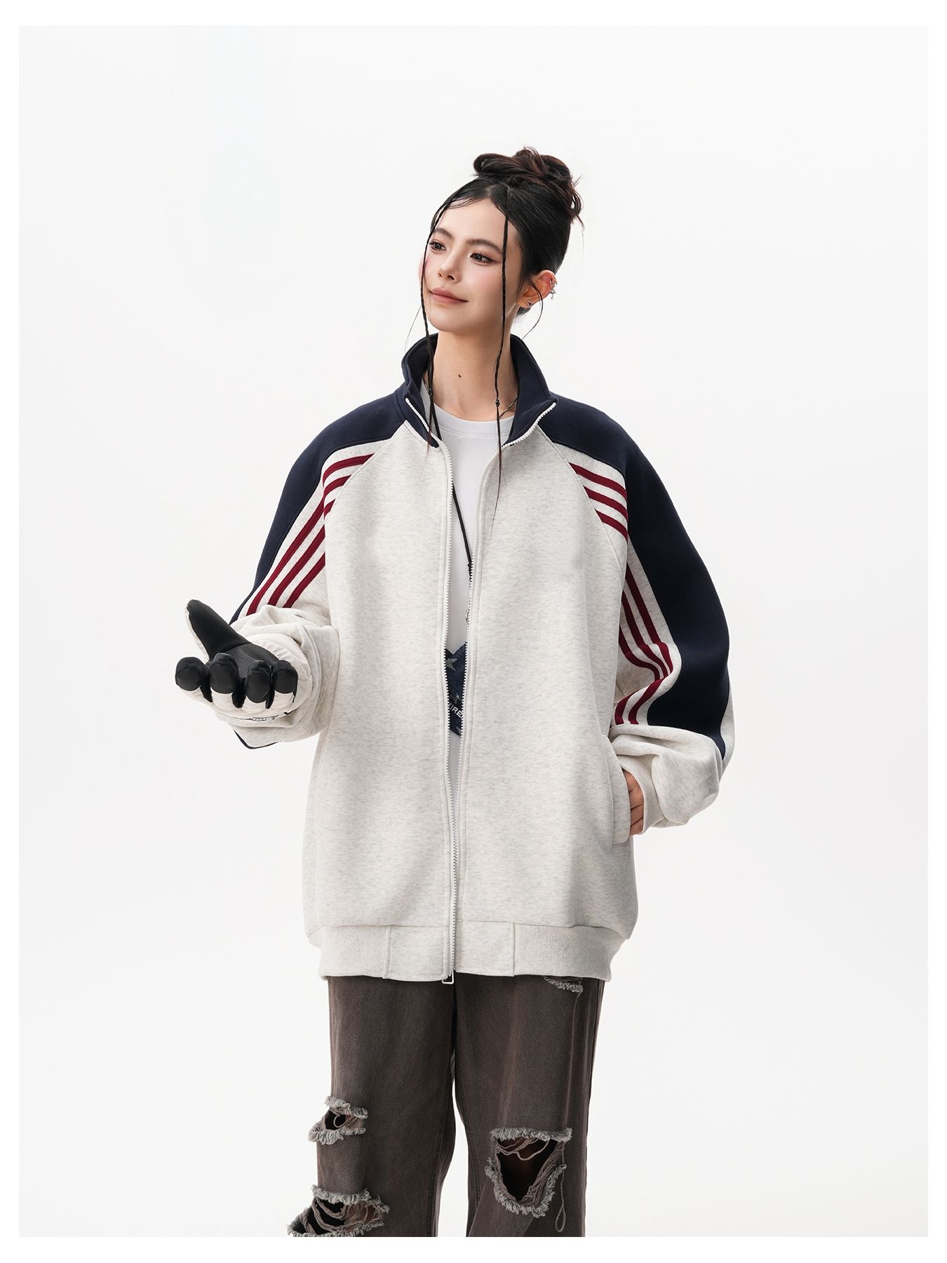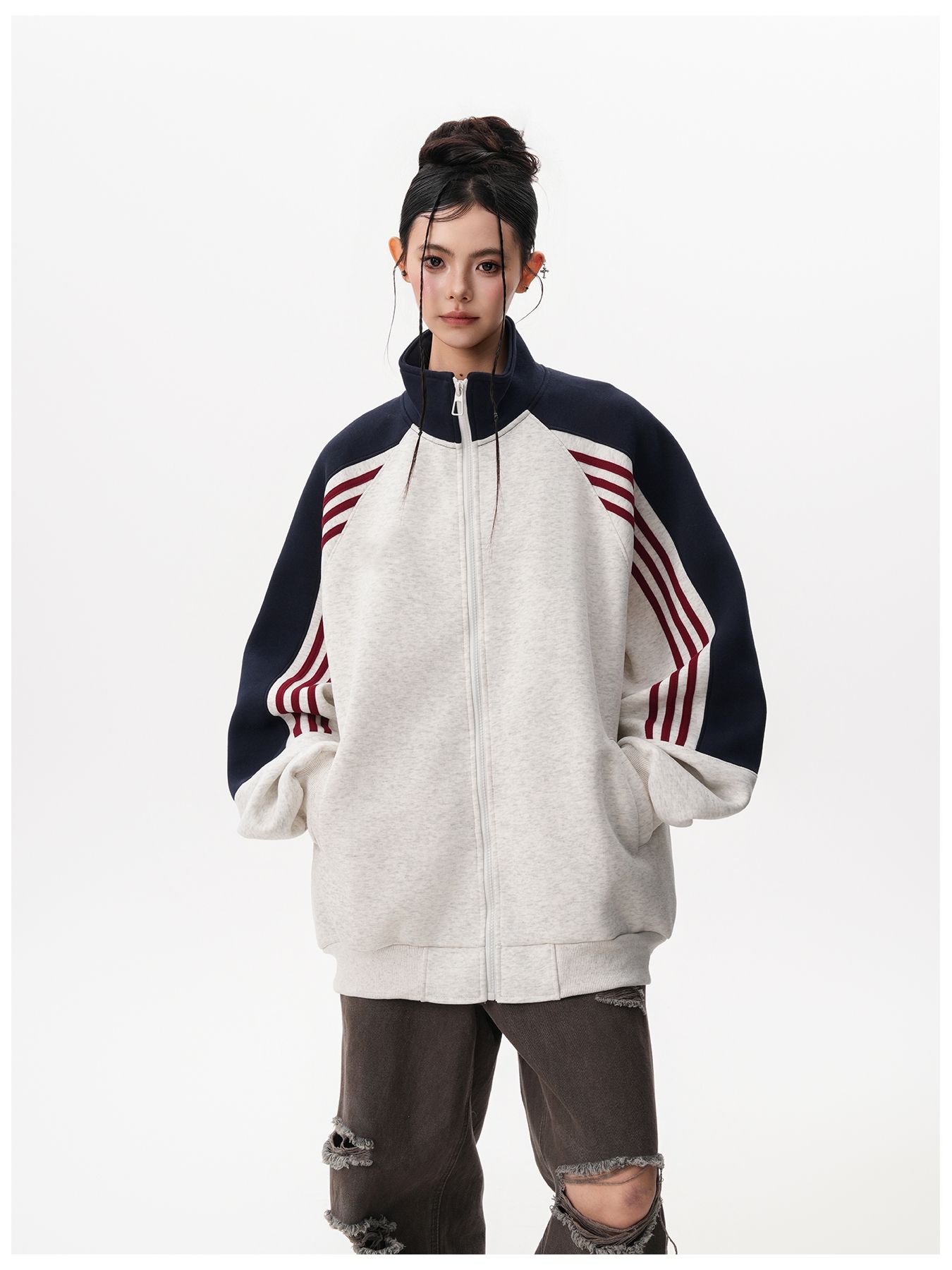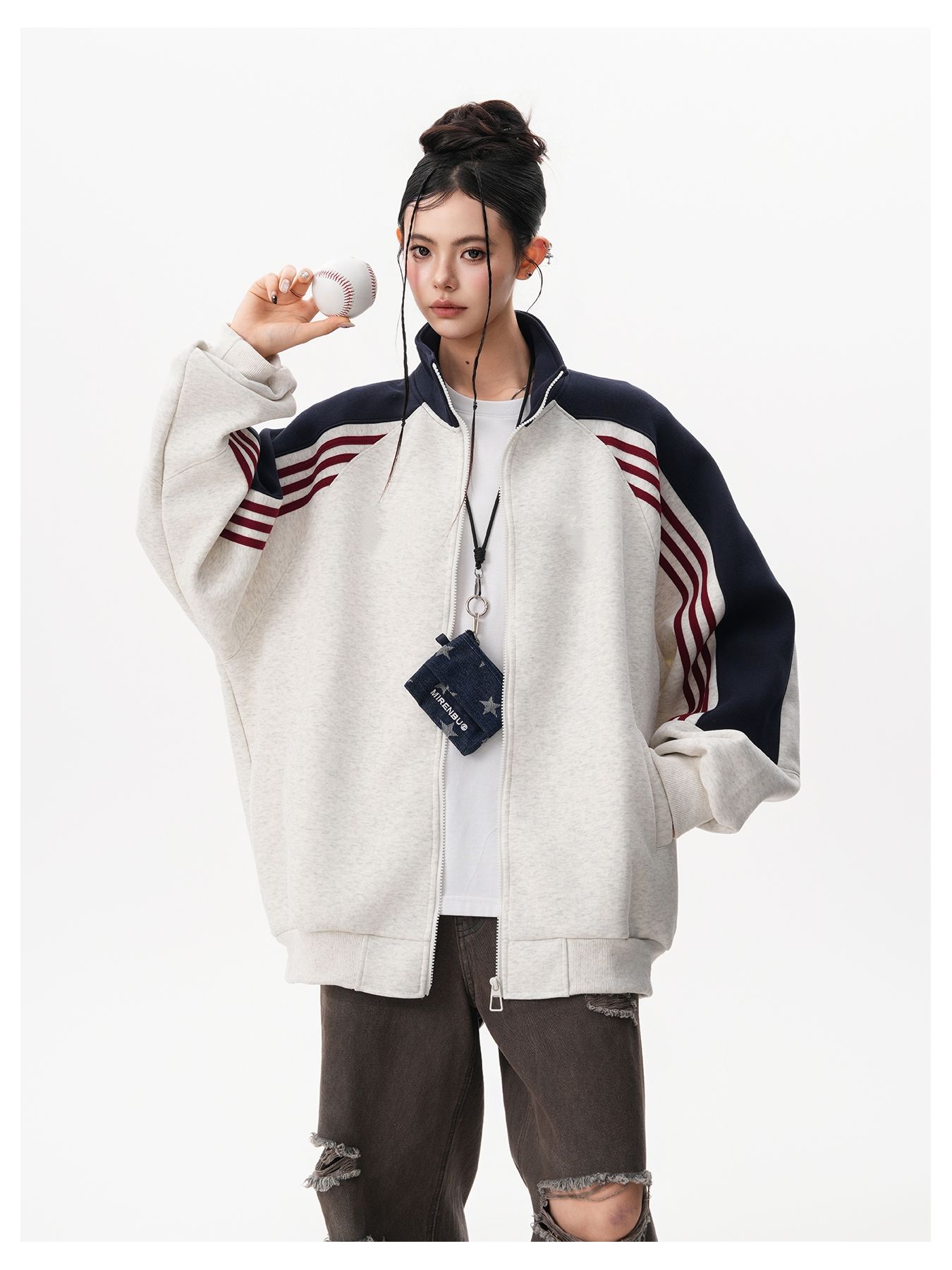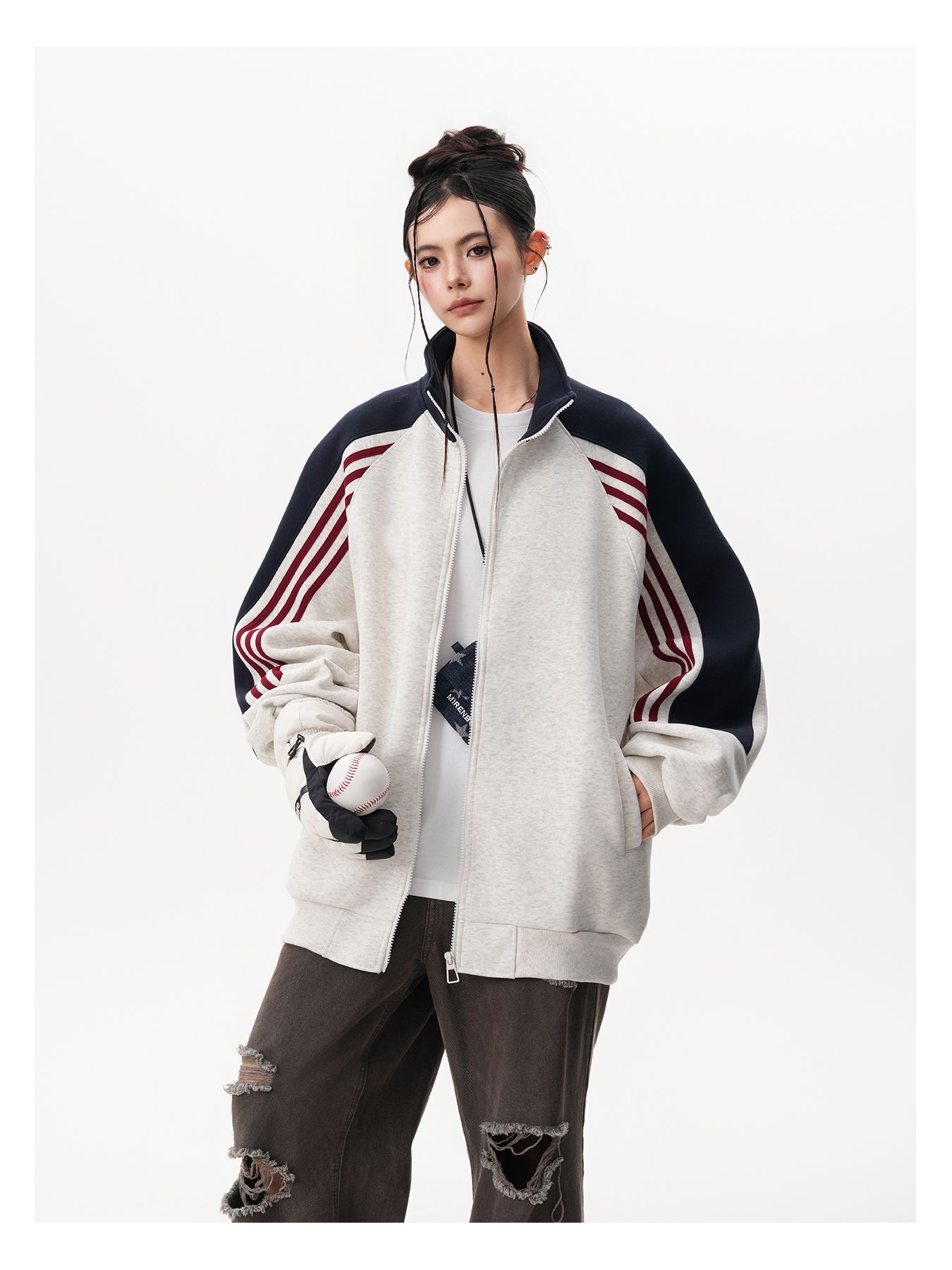 RY1278# 美式复古插肩袖立领卫衣女男宽松休闲运动棒球服情侣