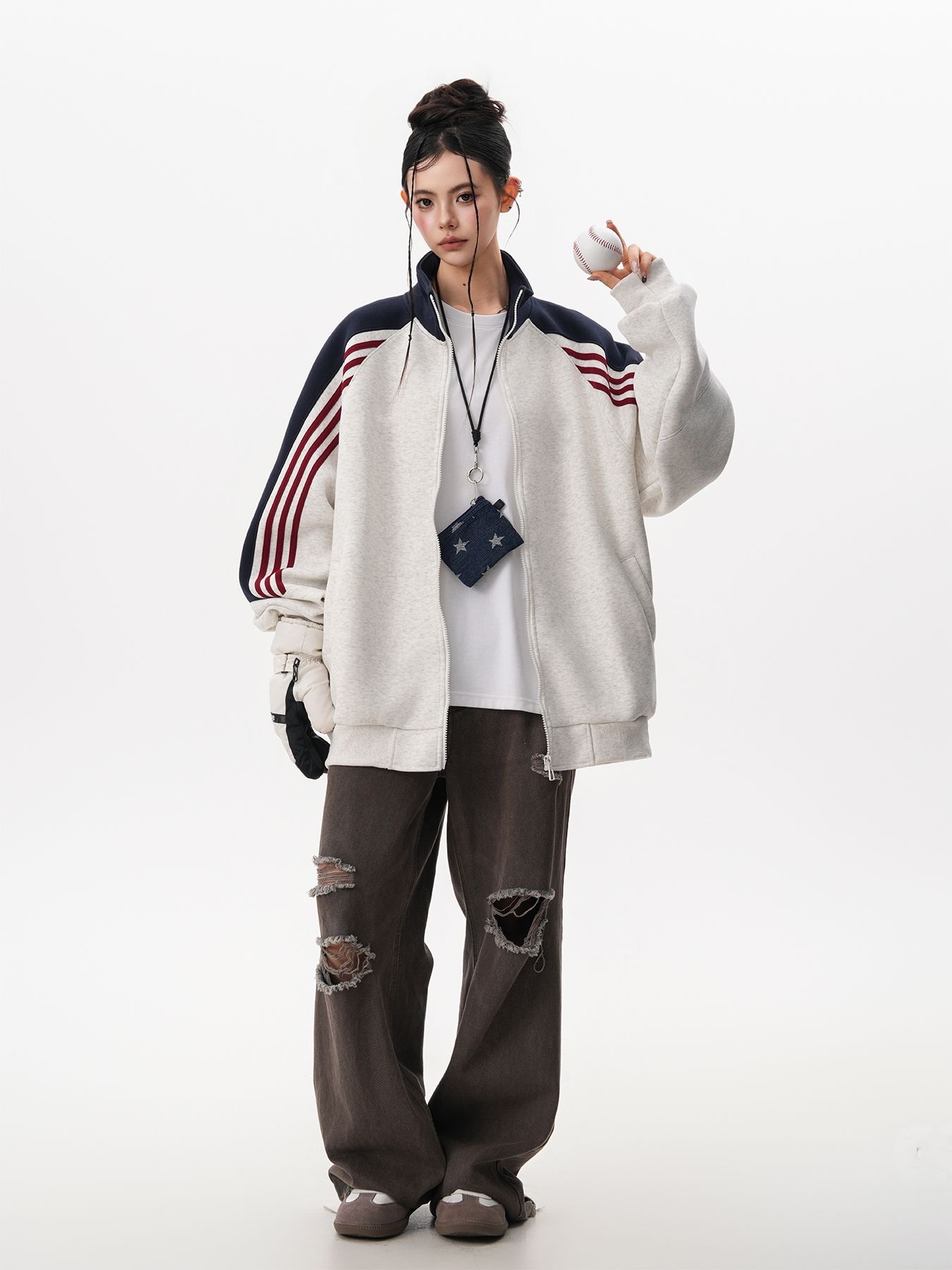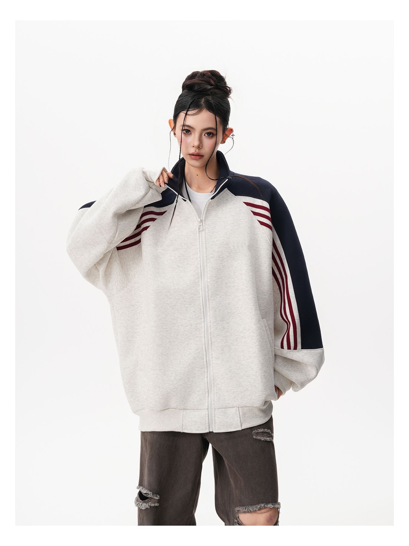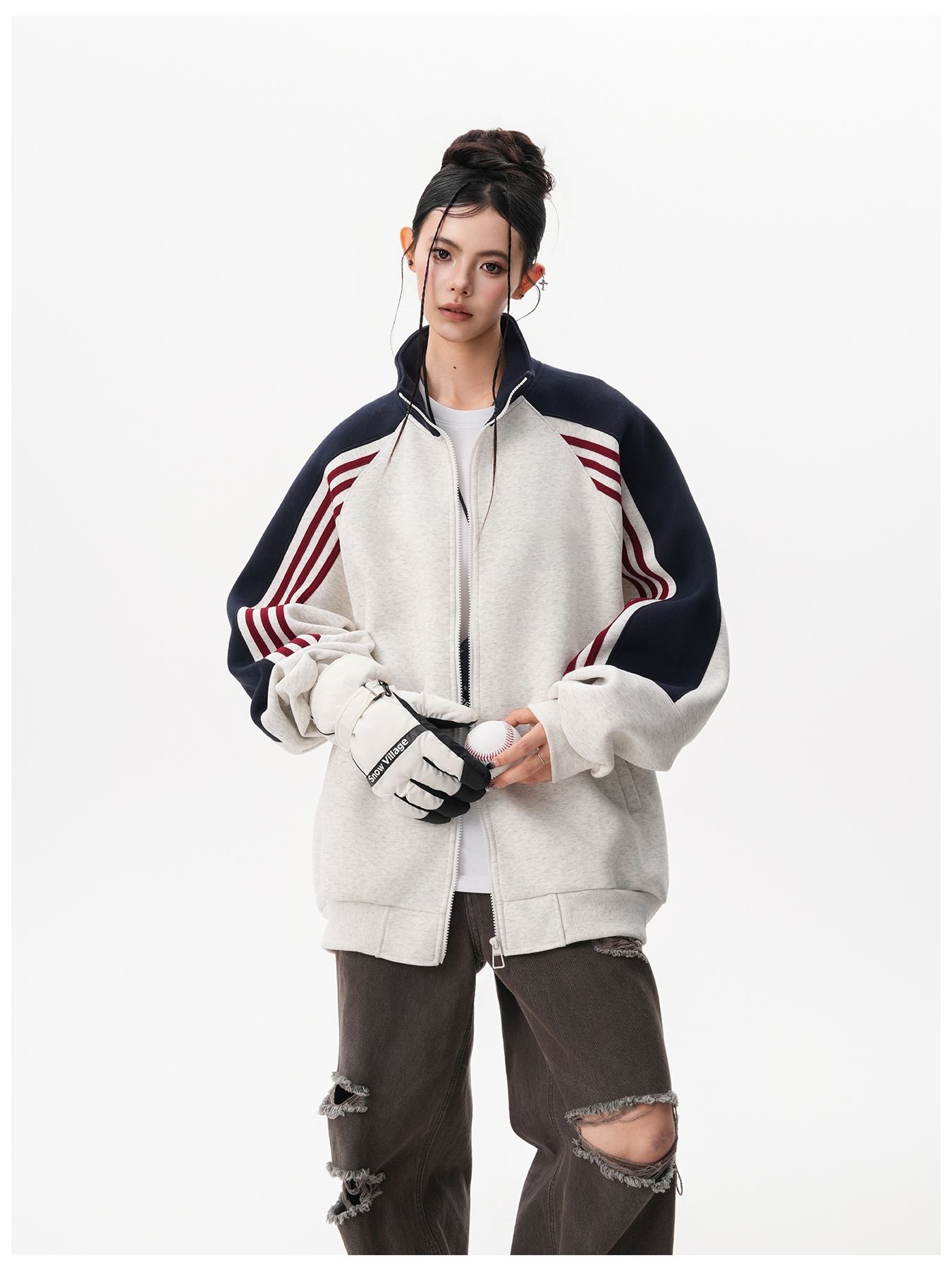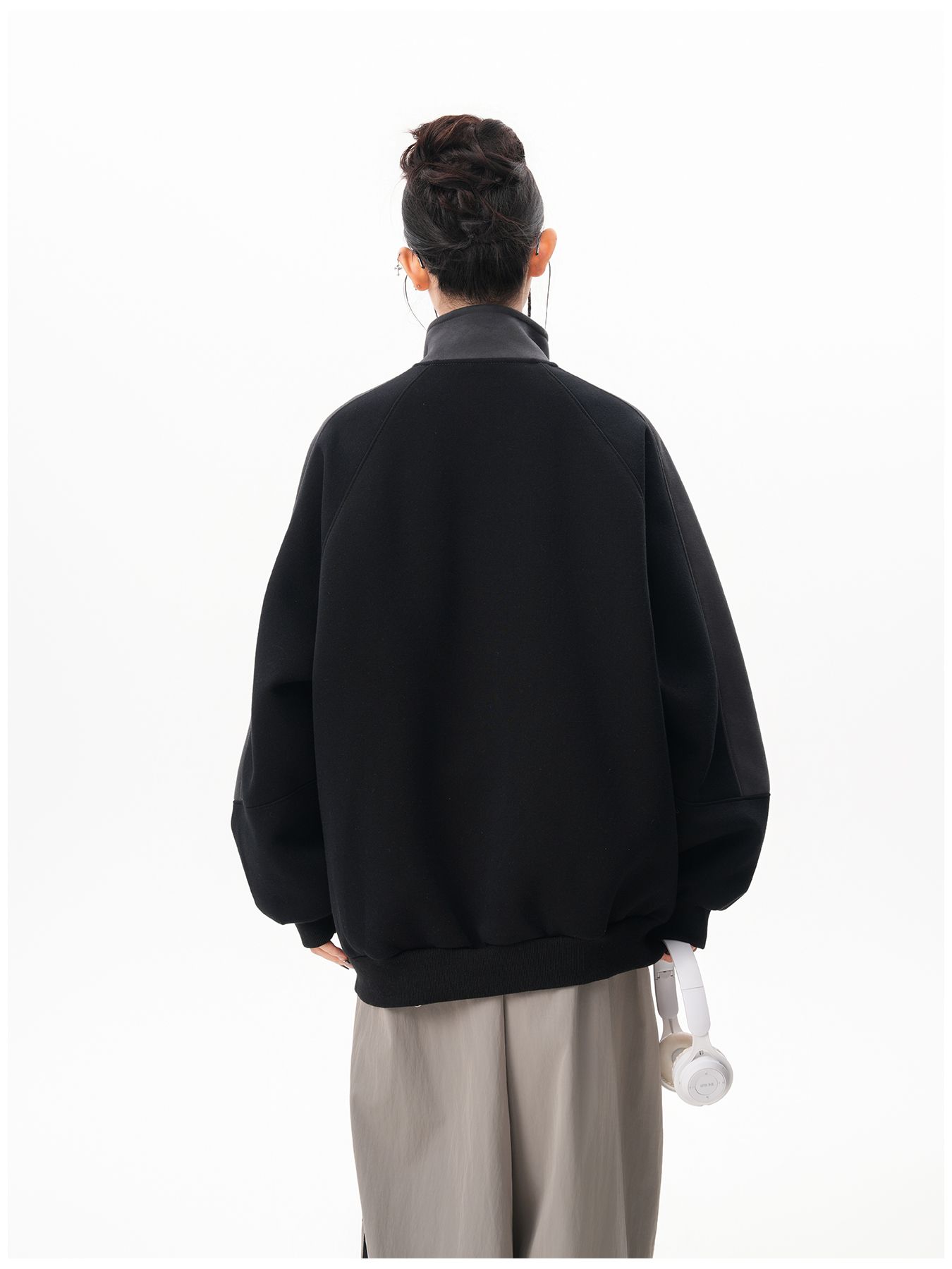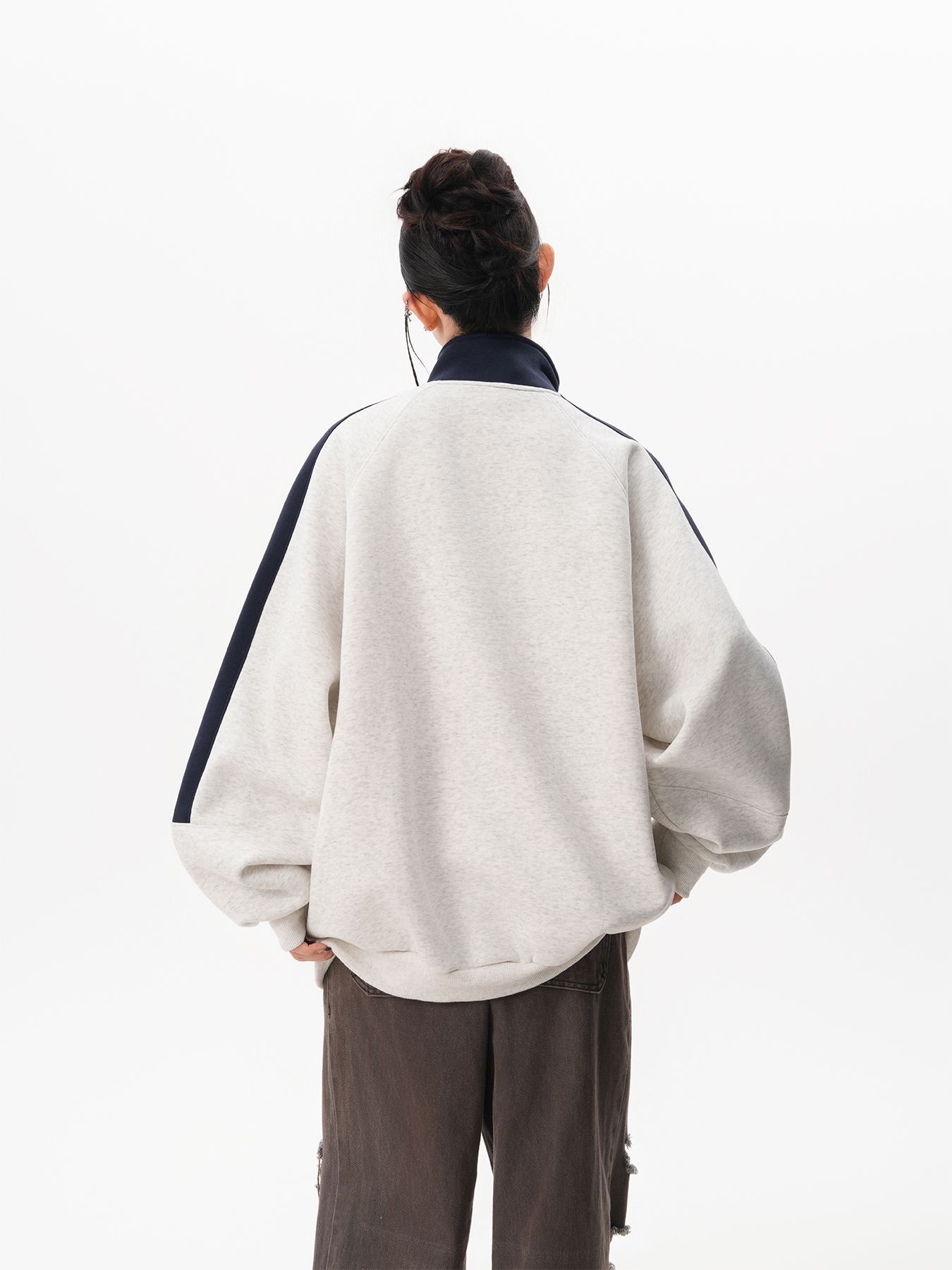 RY1278# 美式复古插肩袖立领卫衣女男宽松休闲运动棒球服情侣