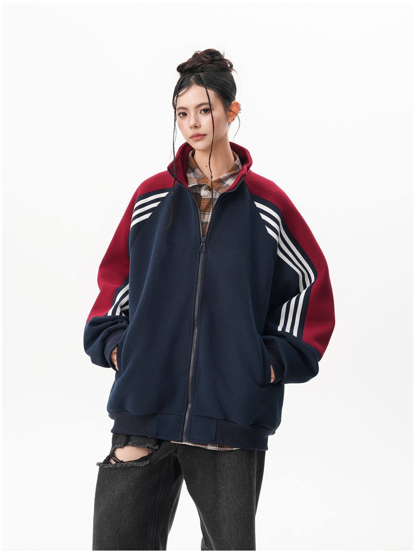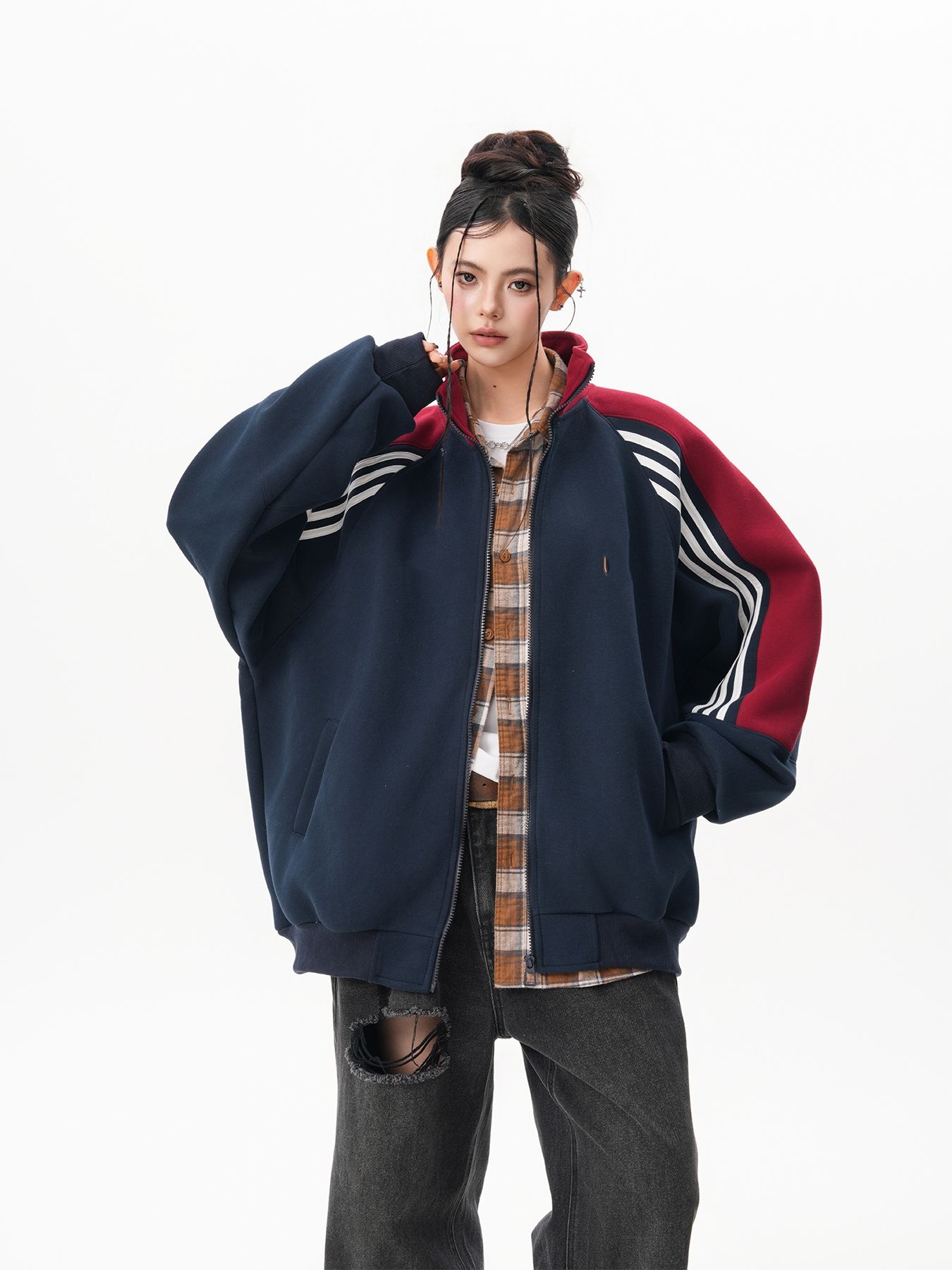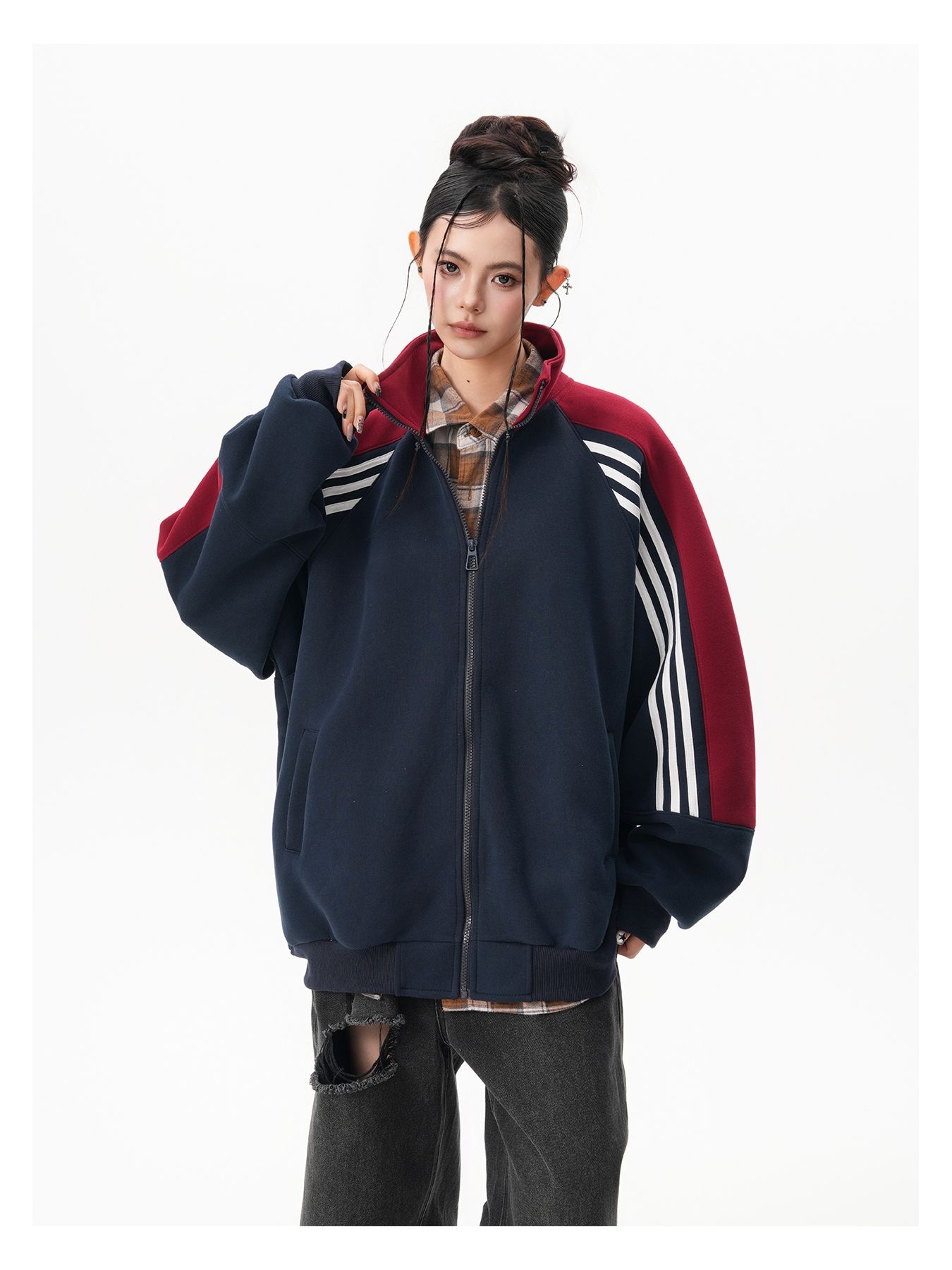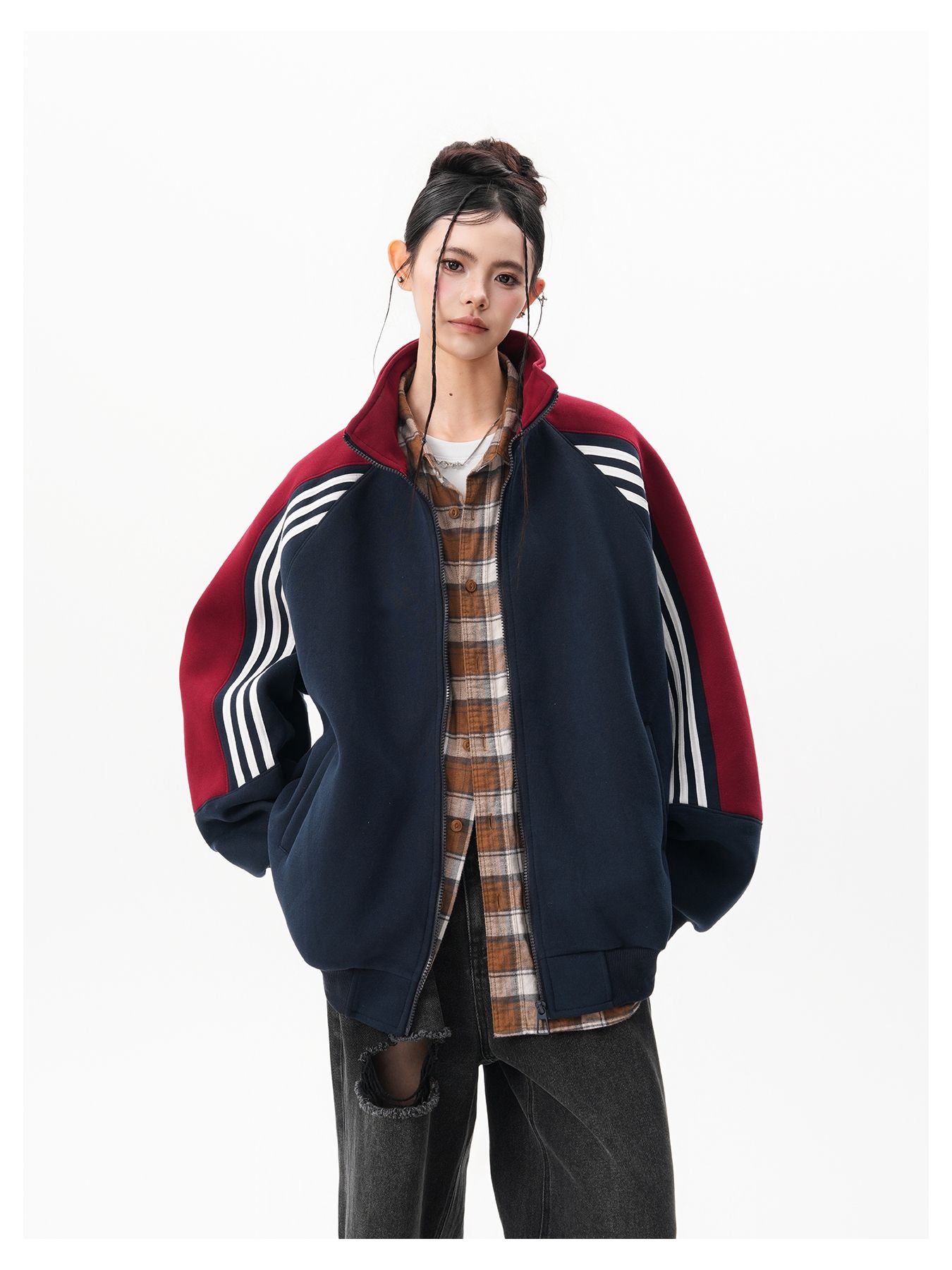 RY1278# 美式复古插肩袖立领卫衣女男宽松休闲运动棒球服情侣