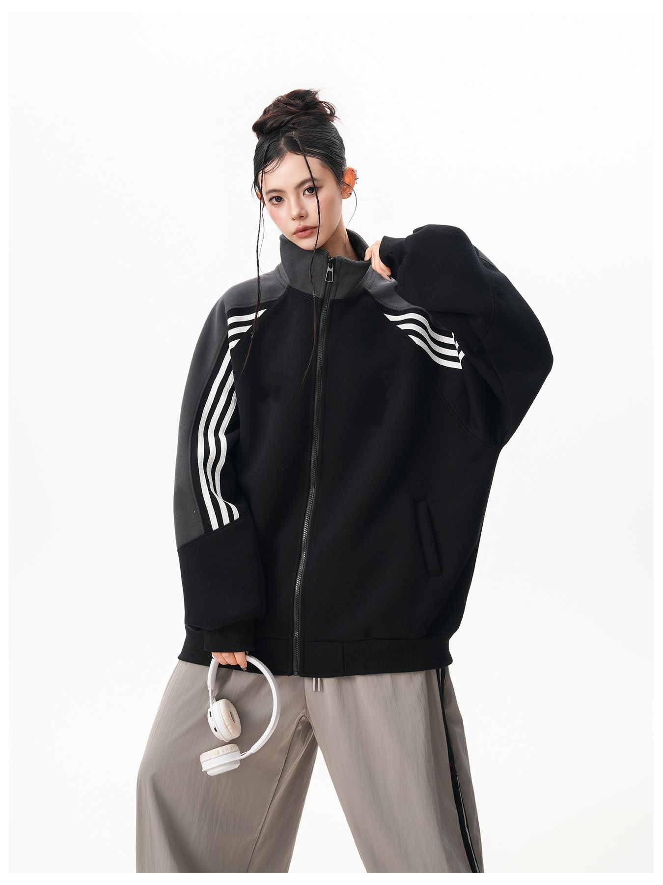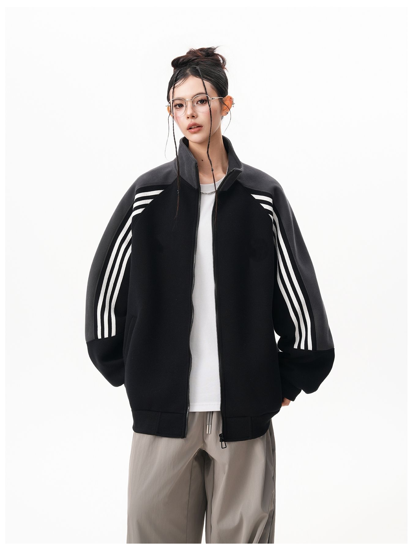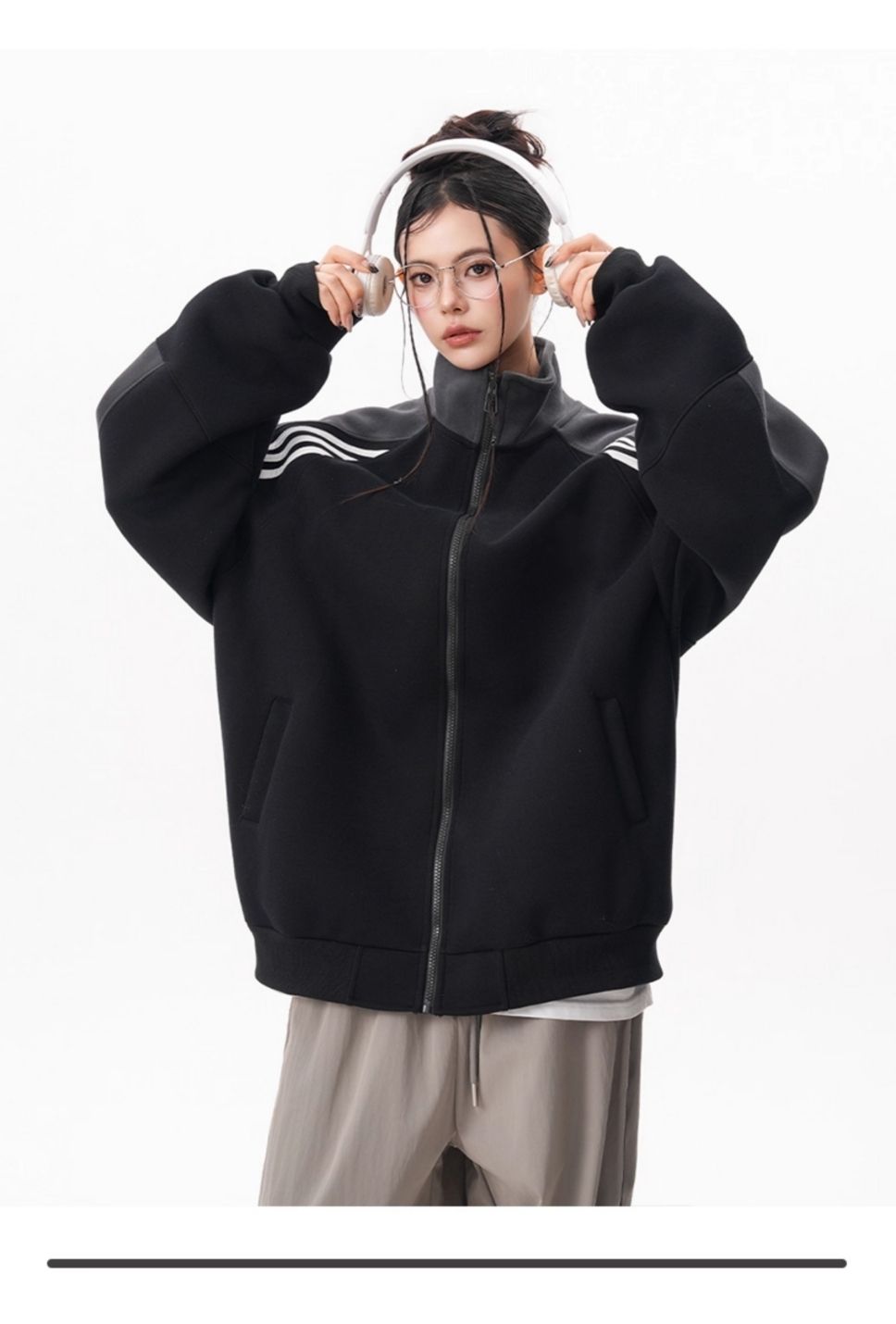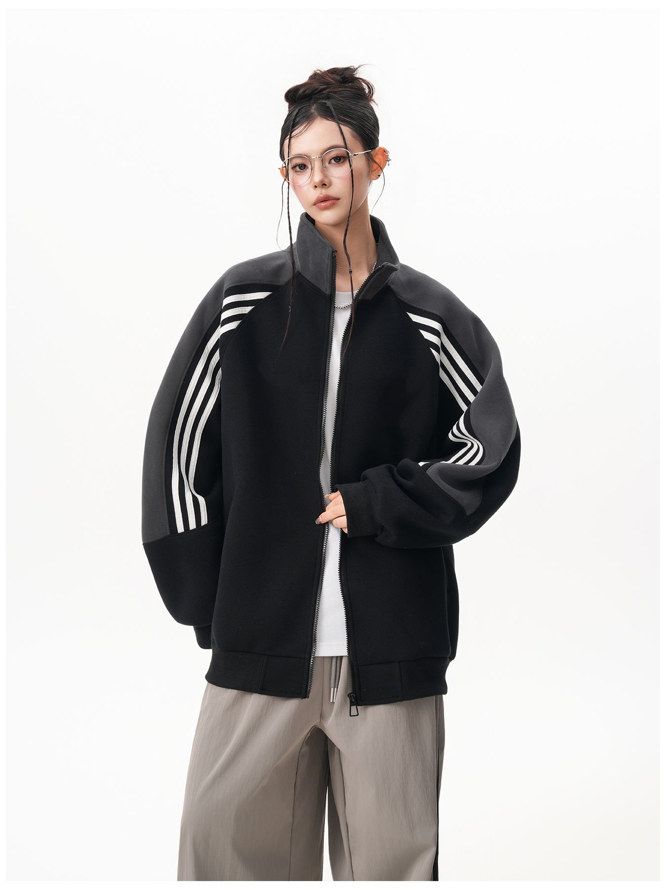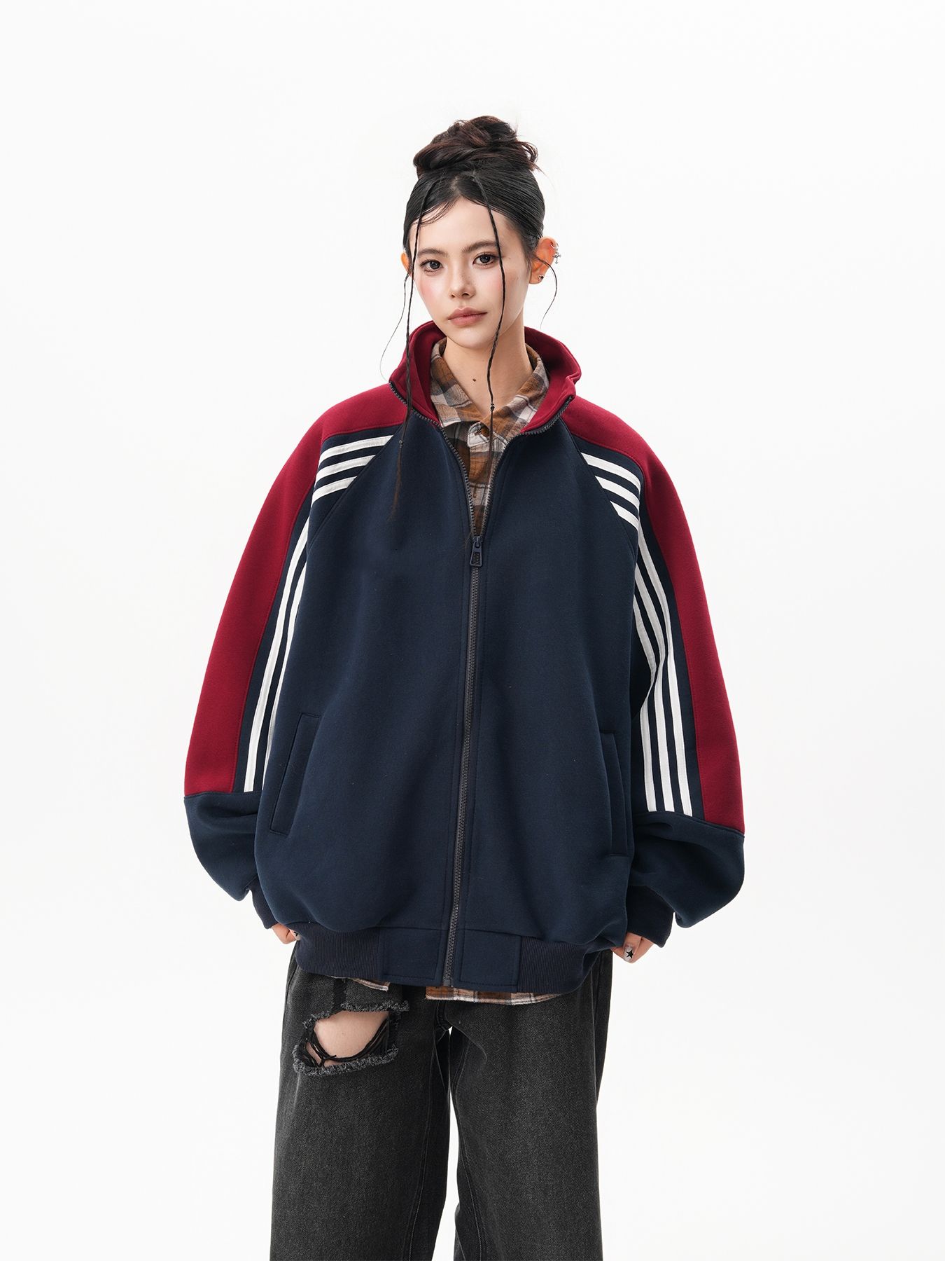 RY1278# 美式复古插肩袖立领卫衣女男宽松休闲运动棒球服情侣