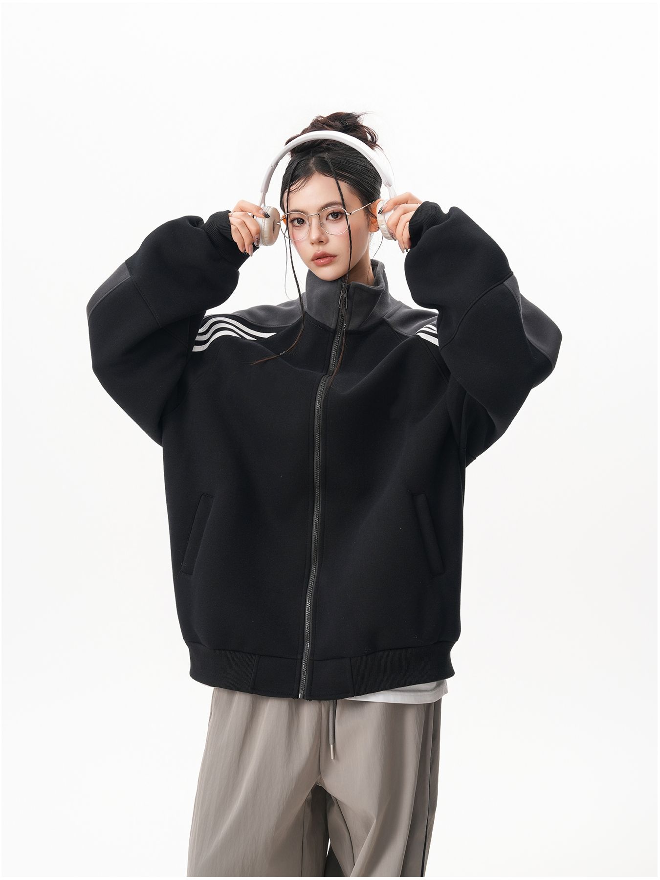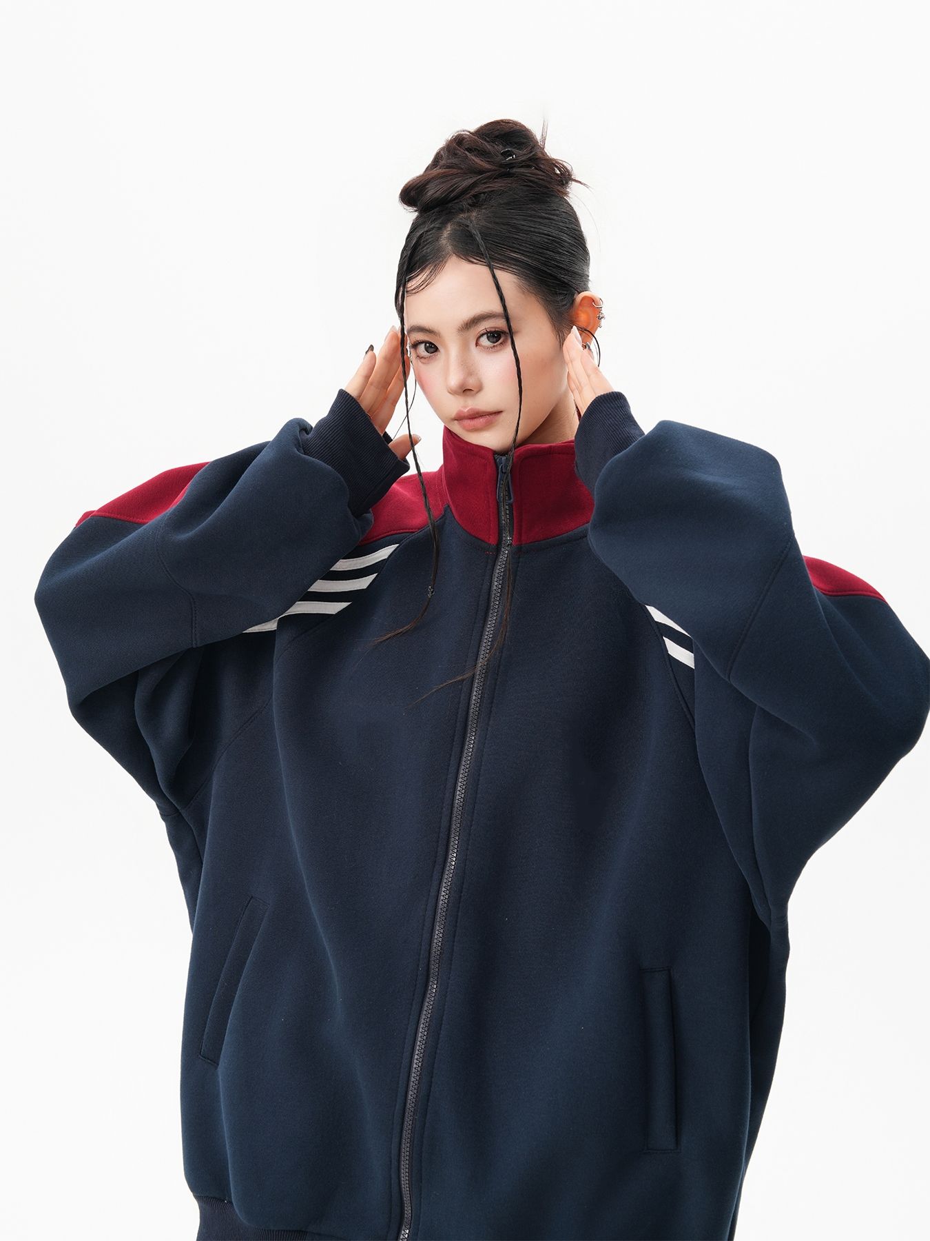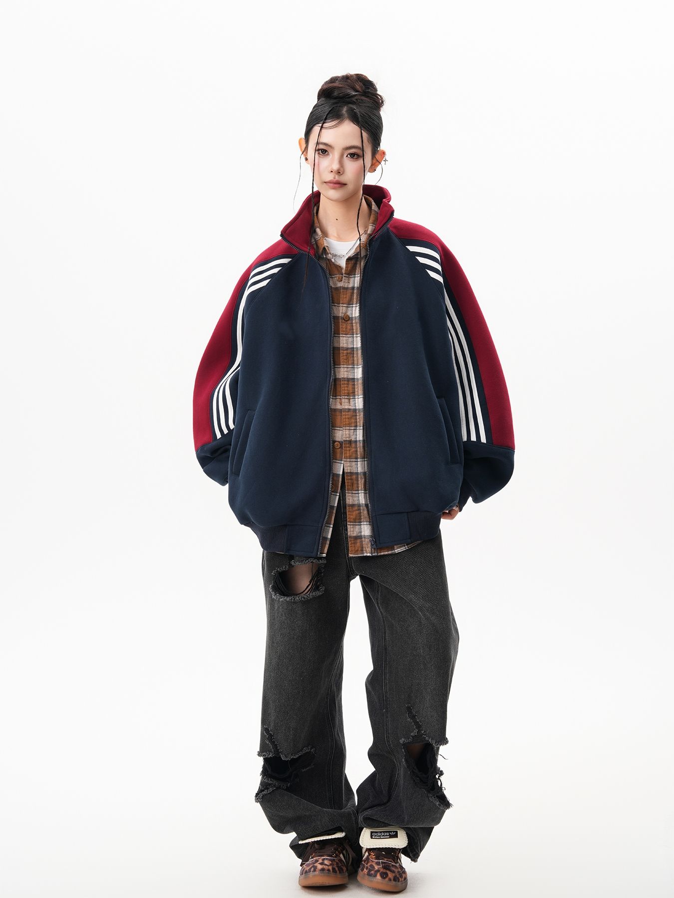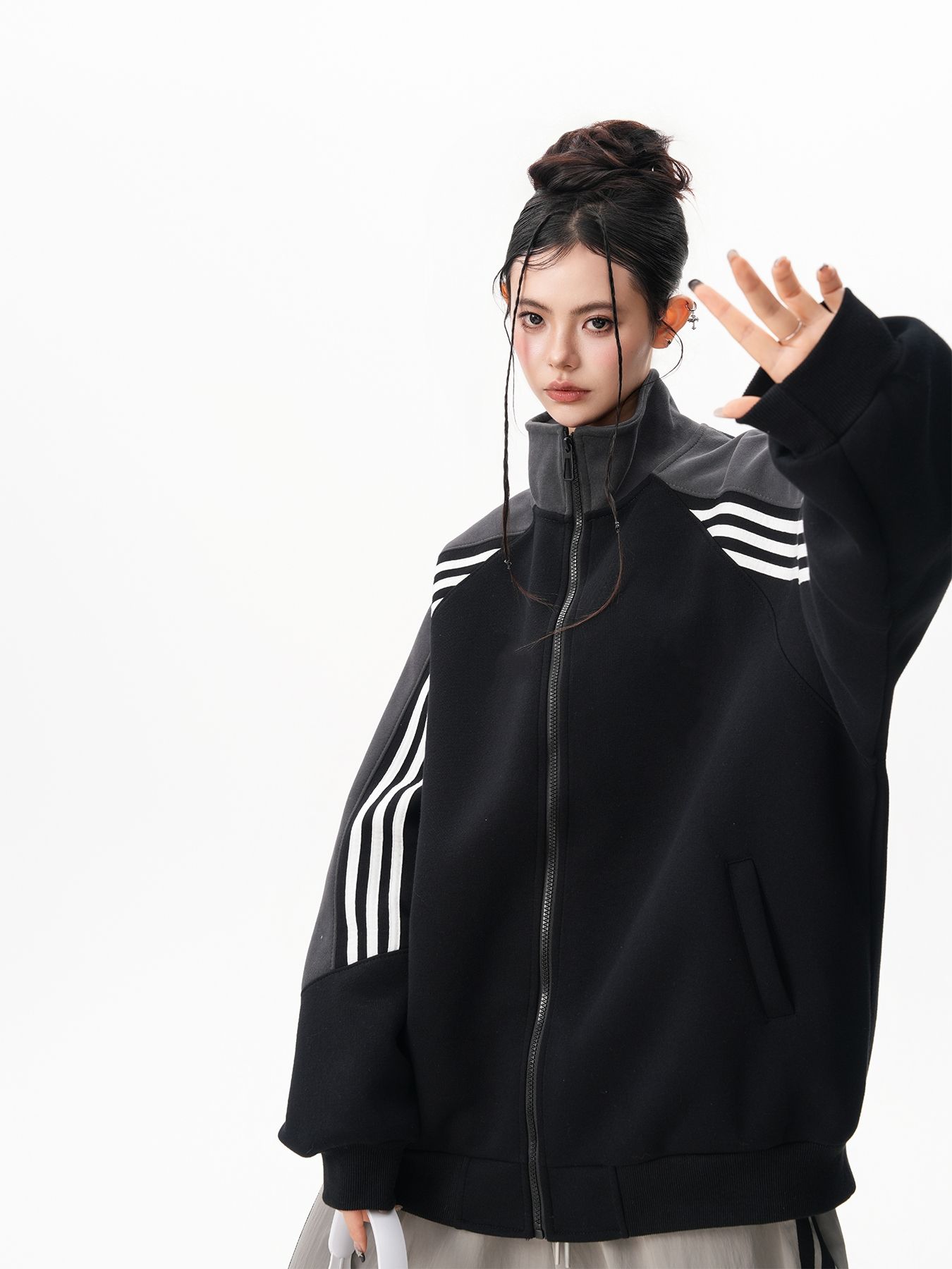 RY1278# 美式复古插肩袖立领卫衣女男宽松休闲运动棒球服情侣
