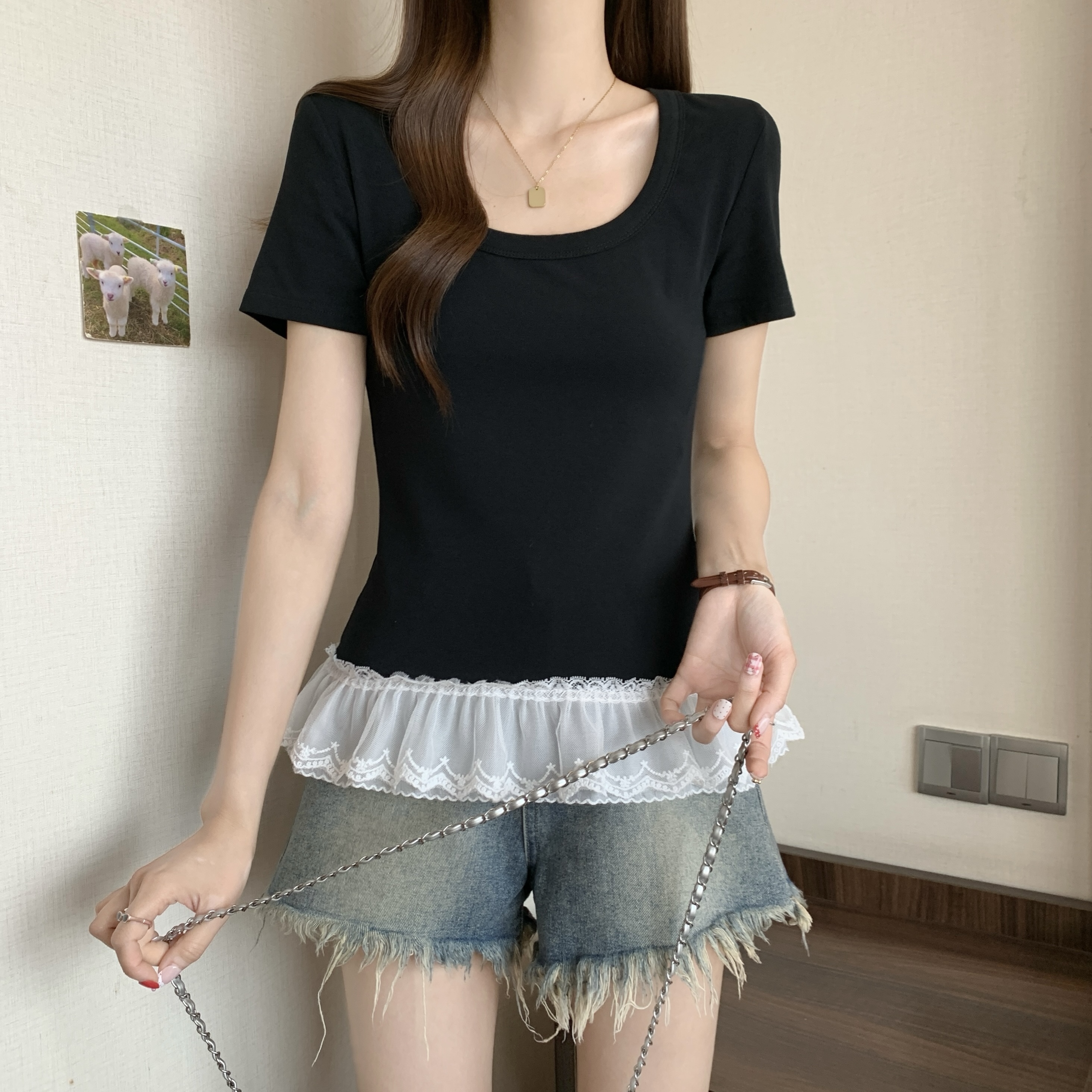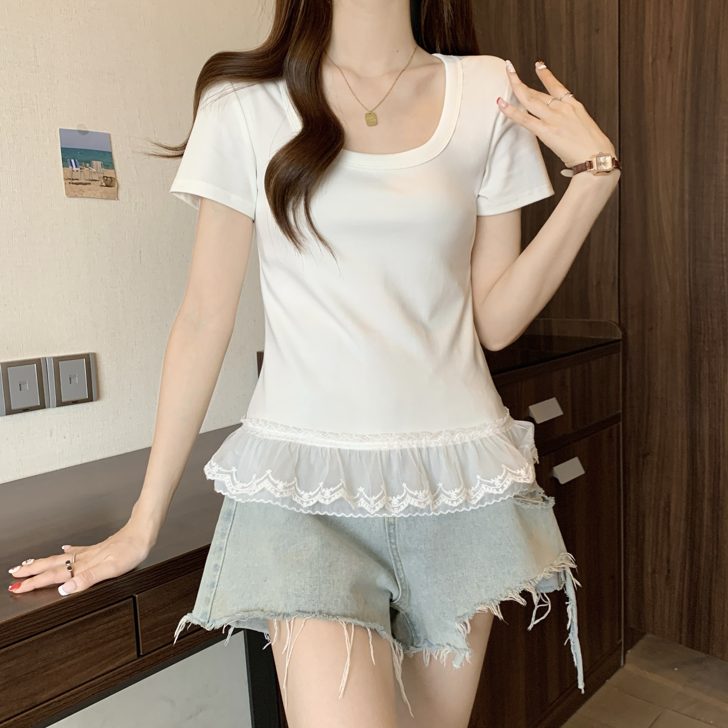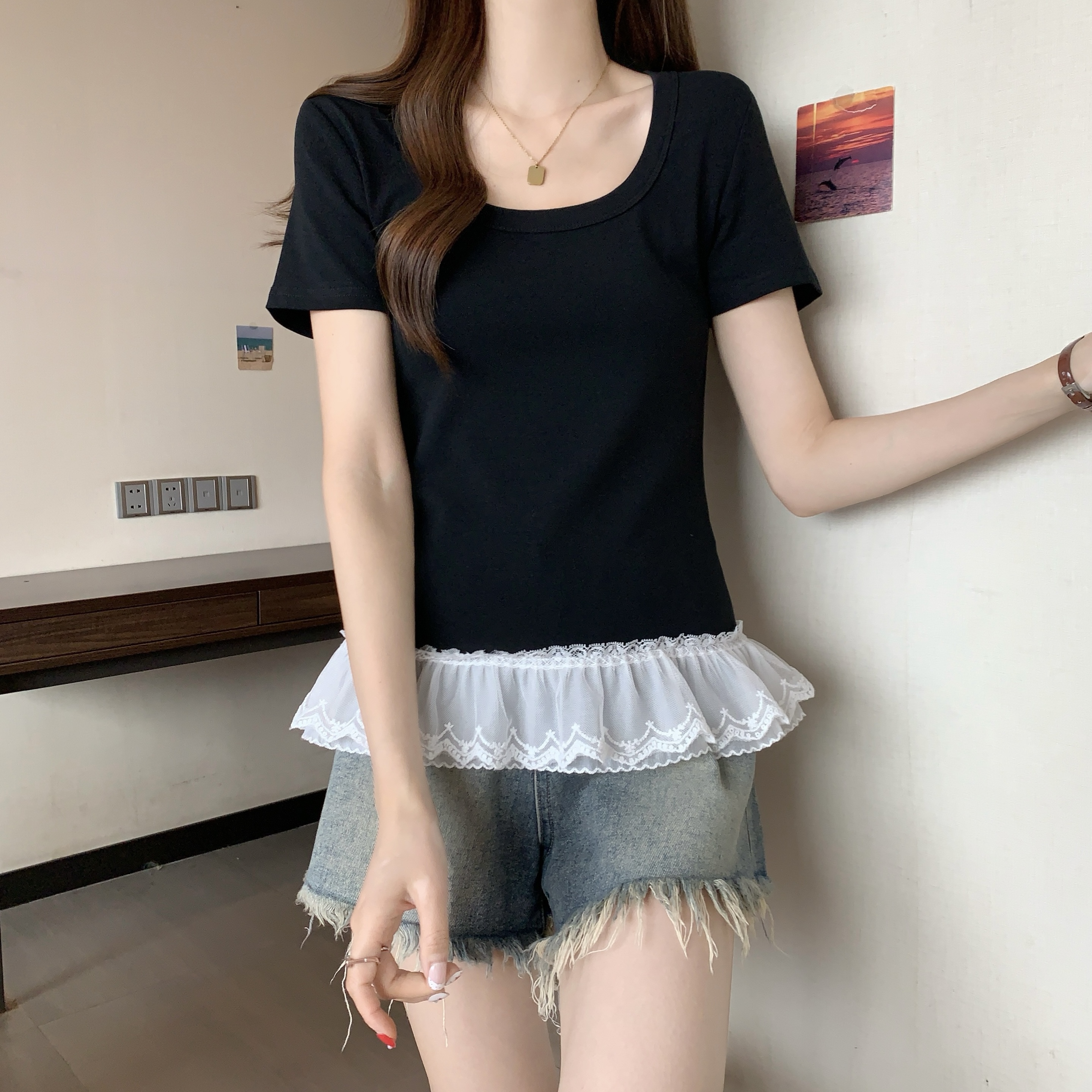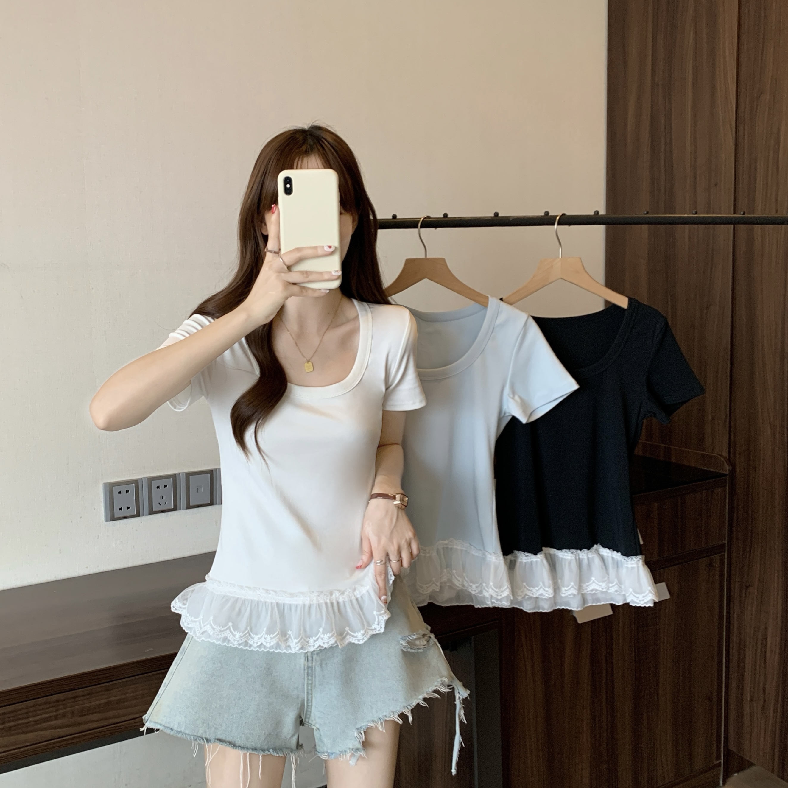 RY1371# 实拍大码~U领T恤短袖女甜美风下摆蕾丝修身气质显瘦百搭打底上衣