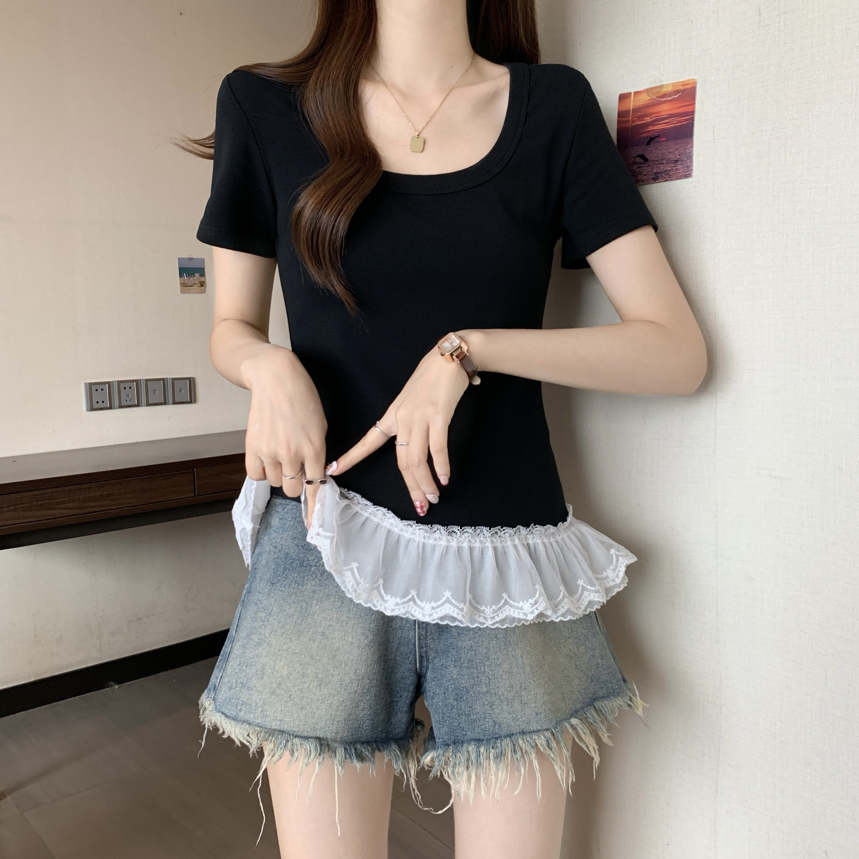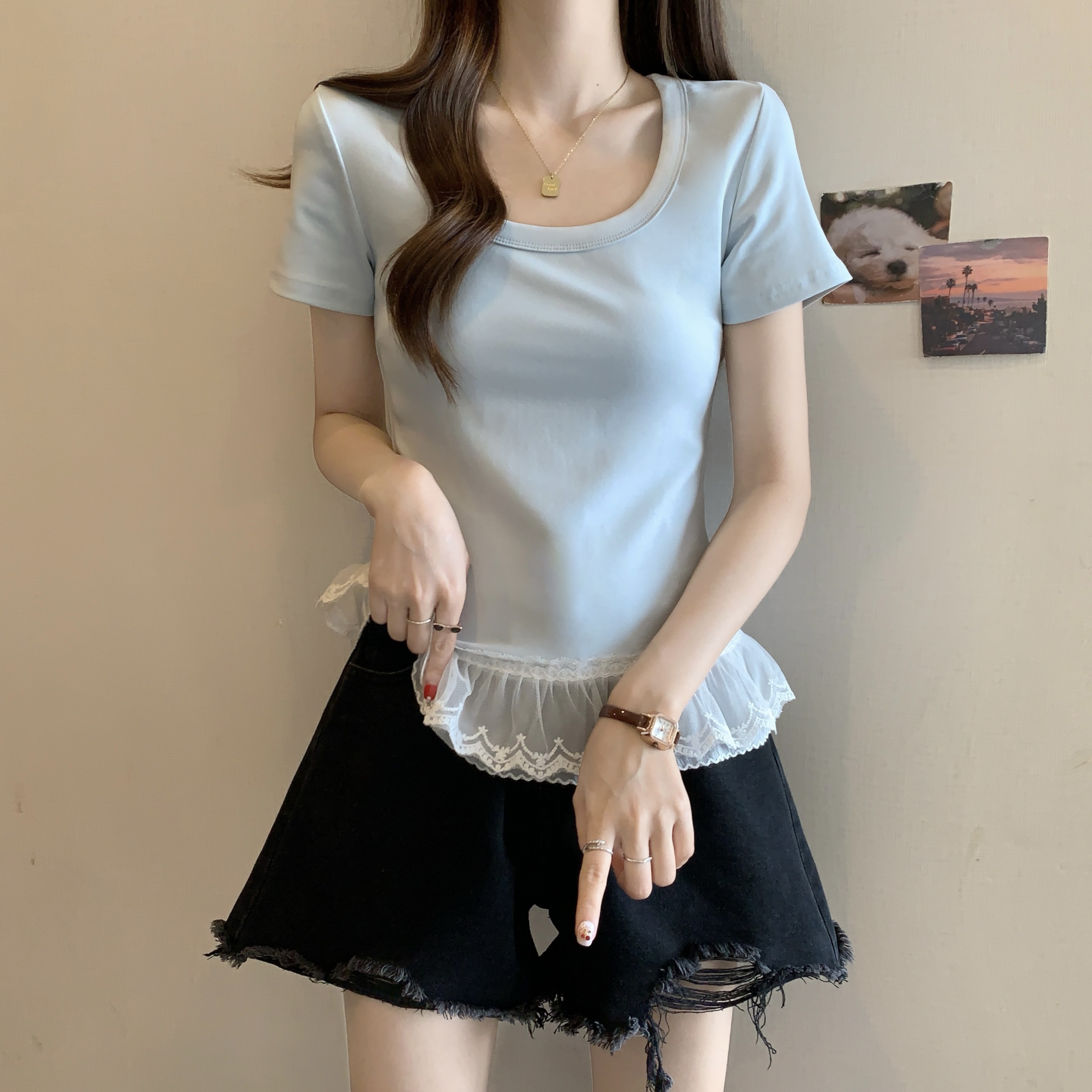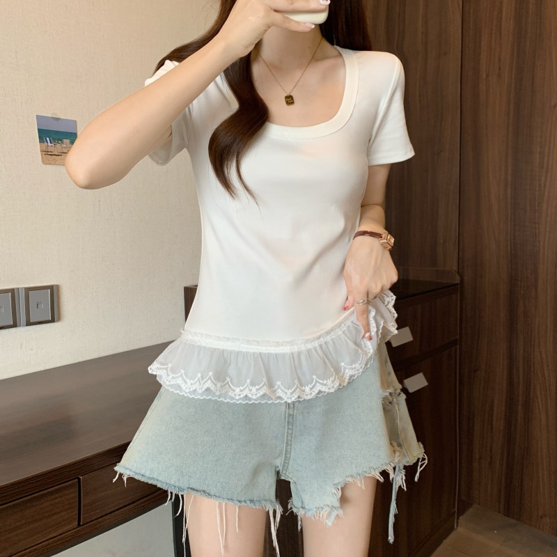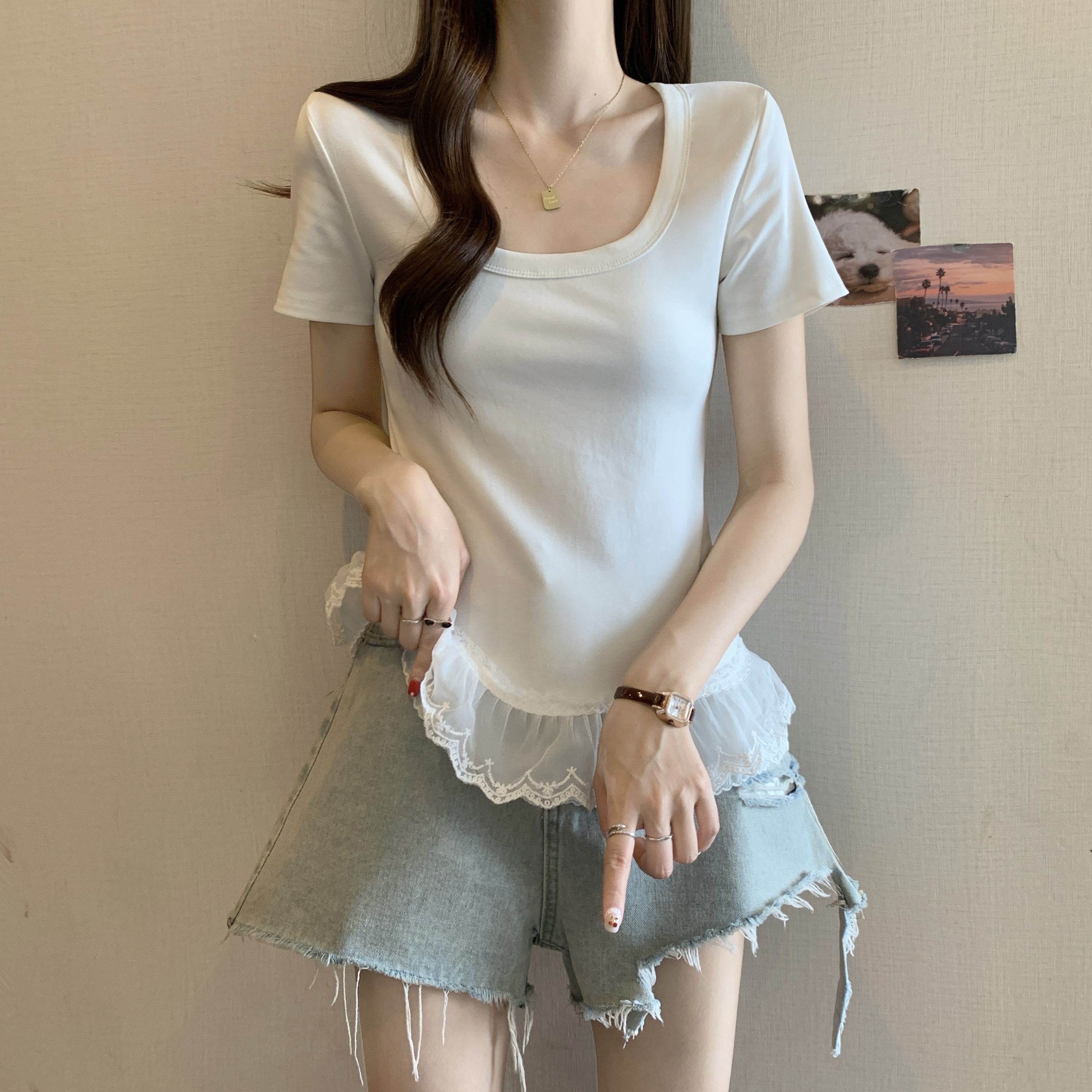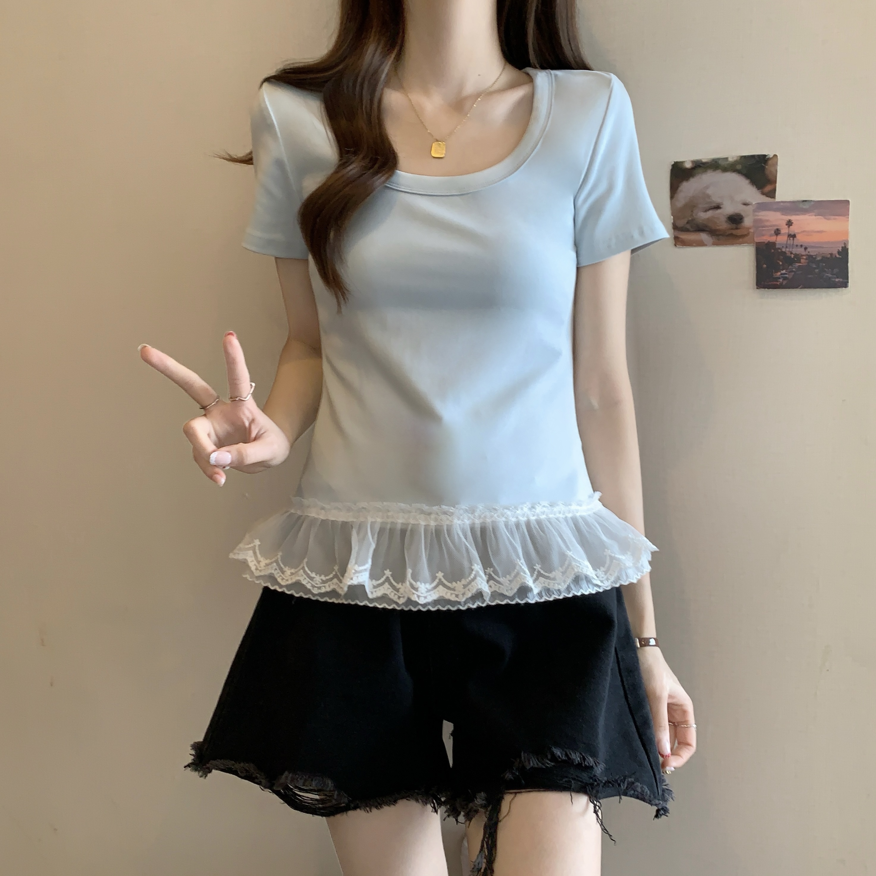 RY1371# 实拍大码~U领T恤短袖女甜美风下摆蕾丝修身气质显瘦百搭打底上衣