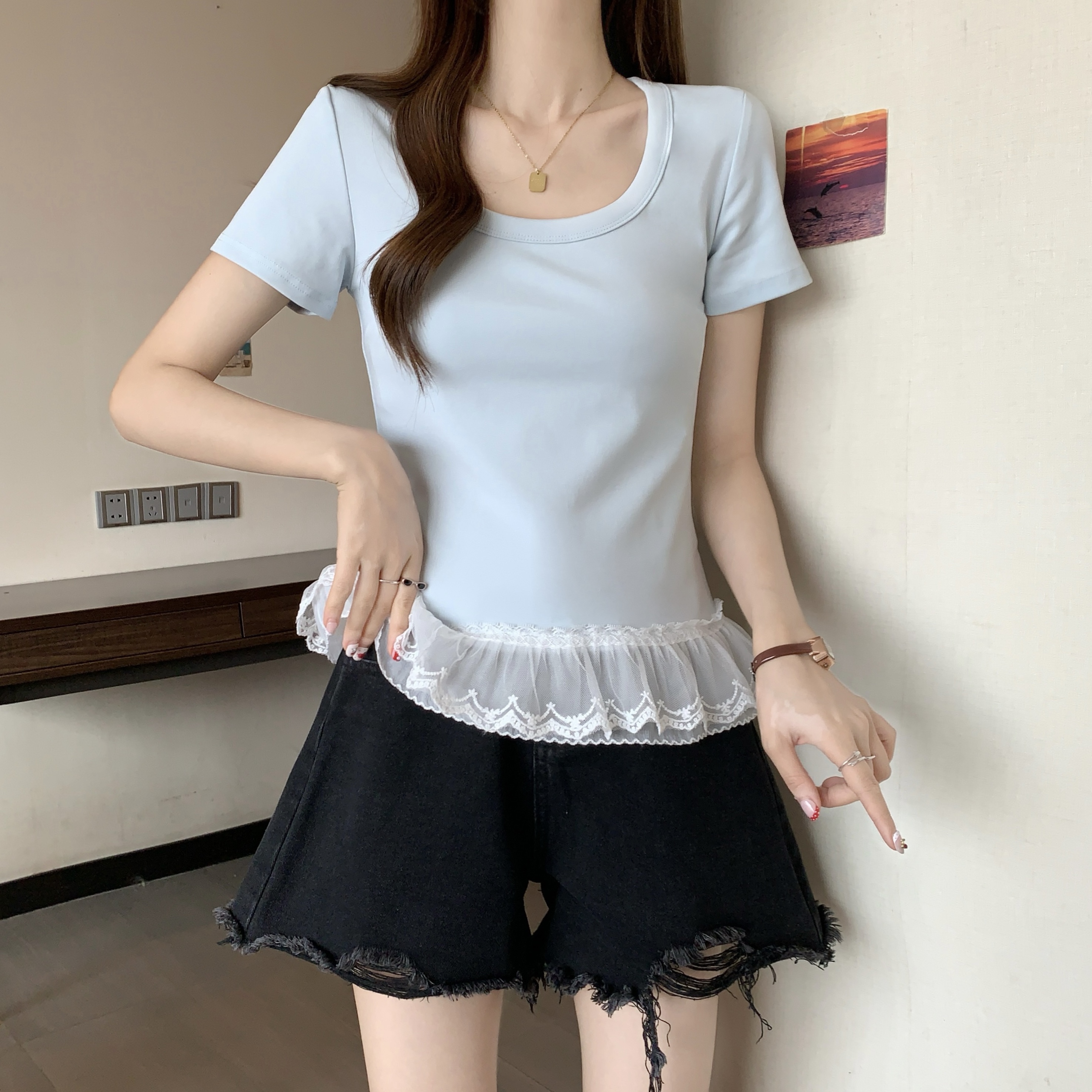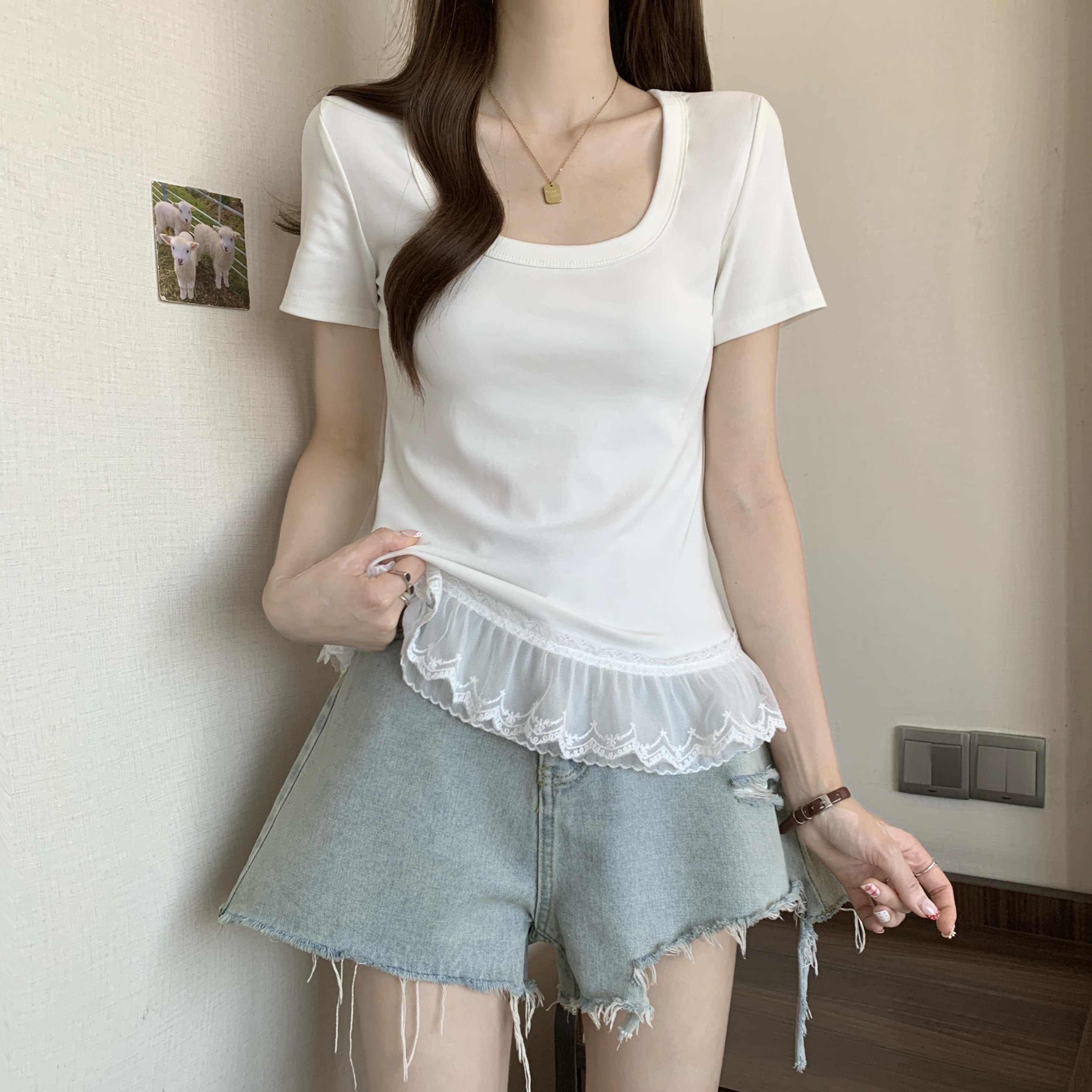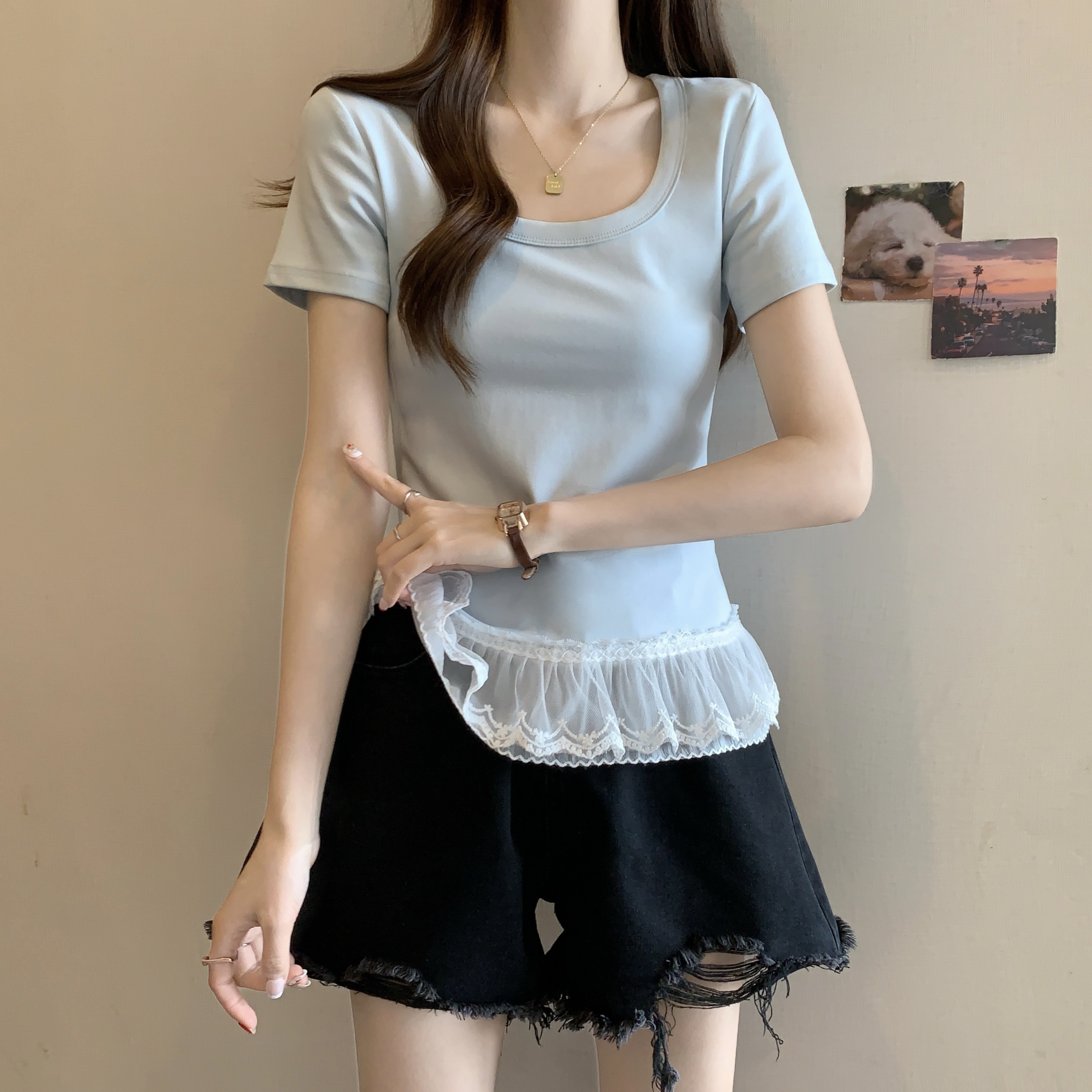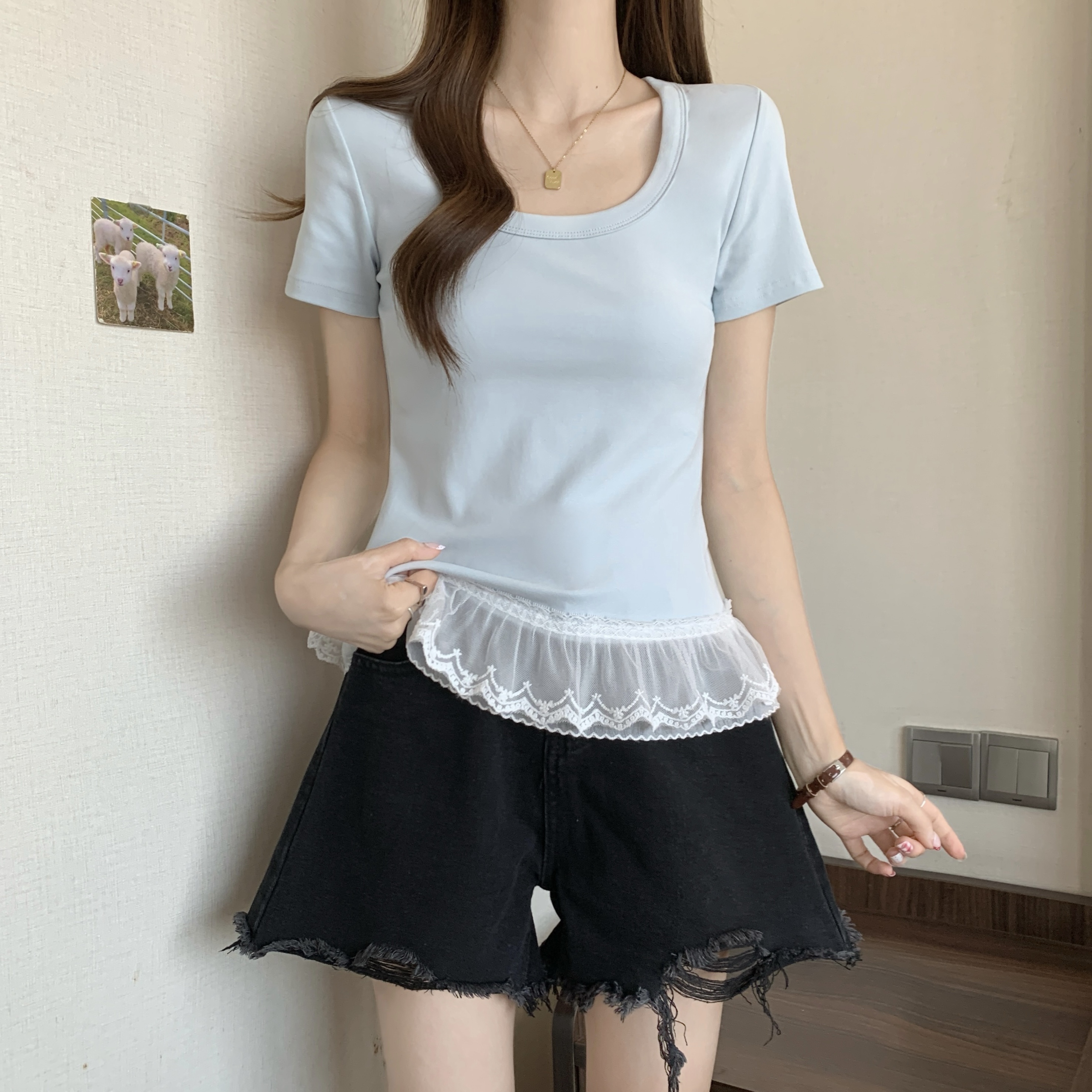 RY1371# 实拍大码~U领T恤短袖女甜美风下摆蕾丝修身气质显瘦百搭打底上衣