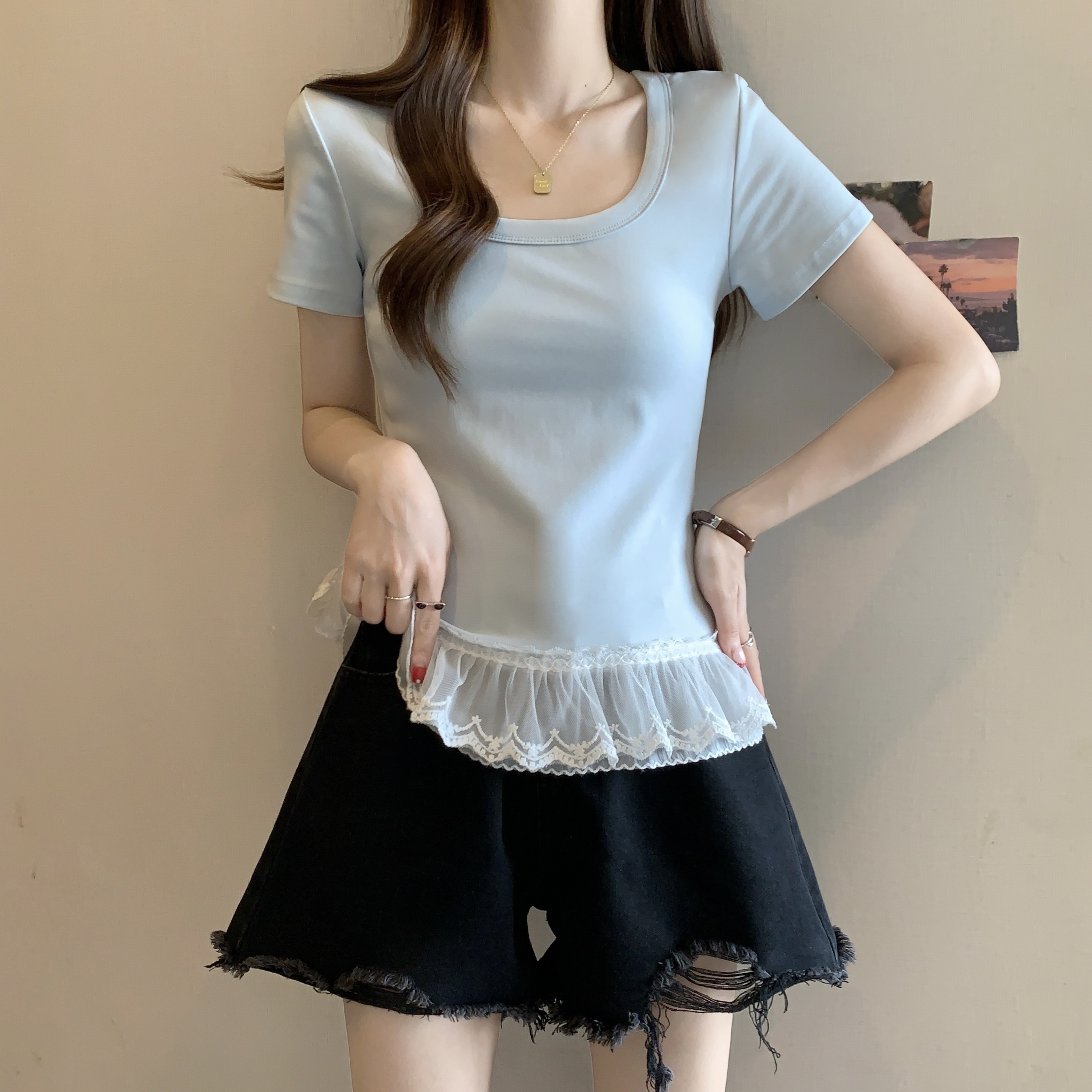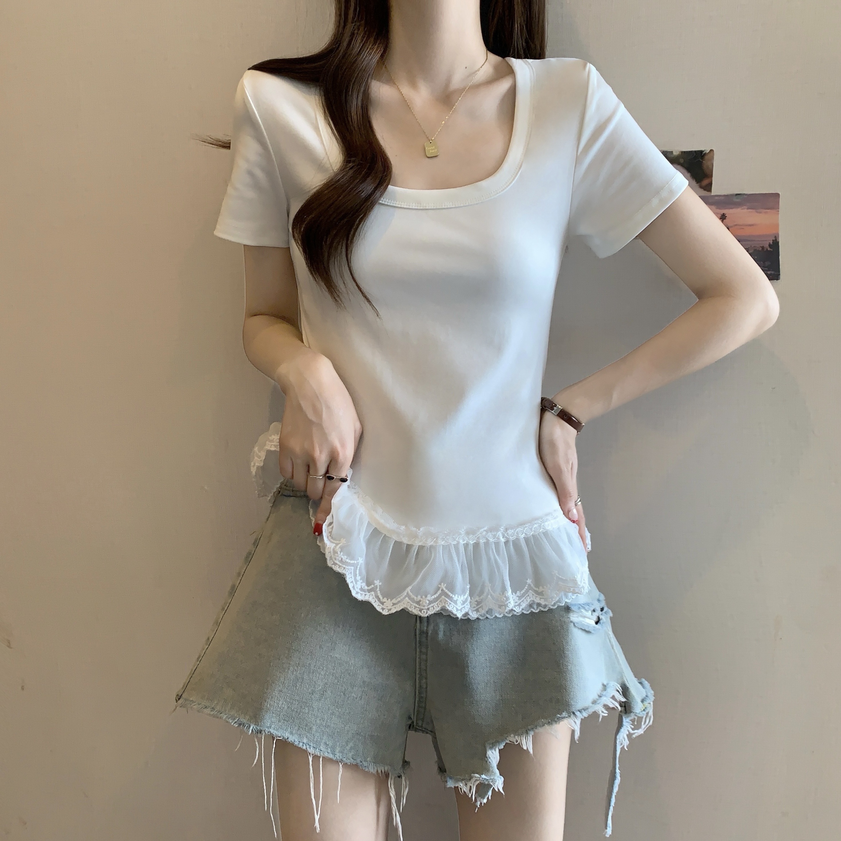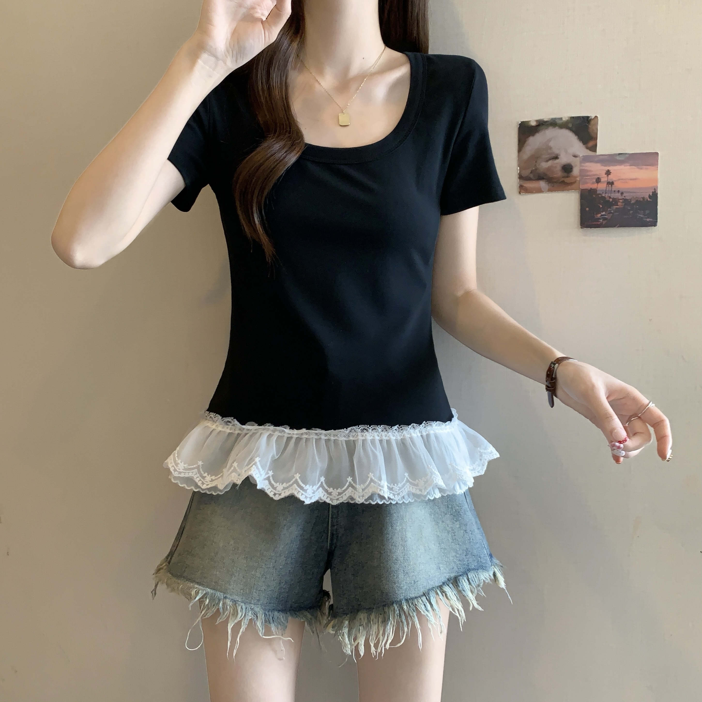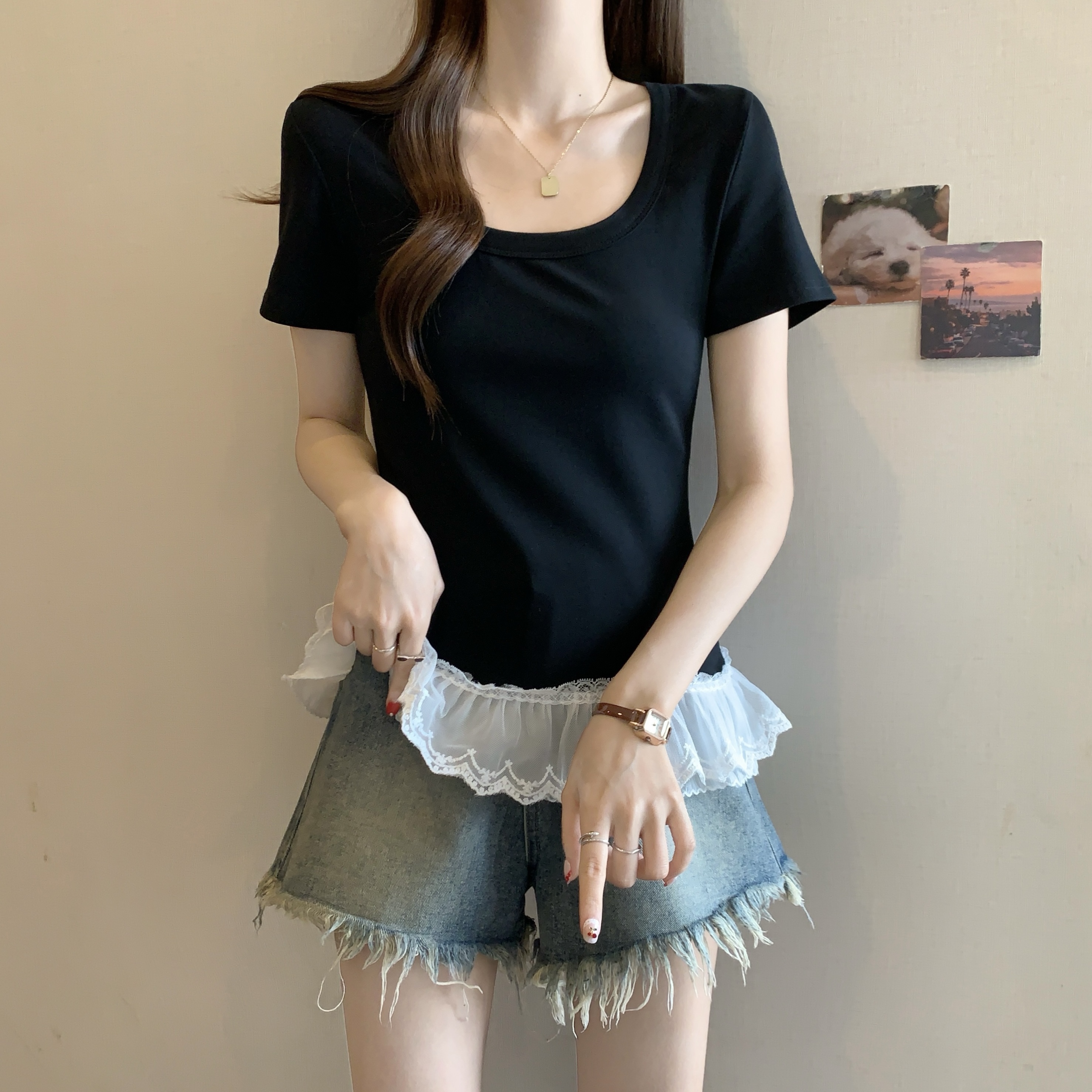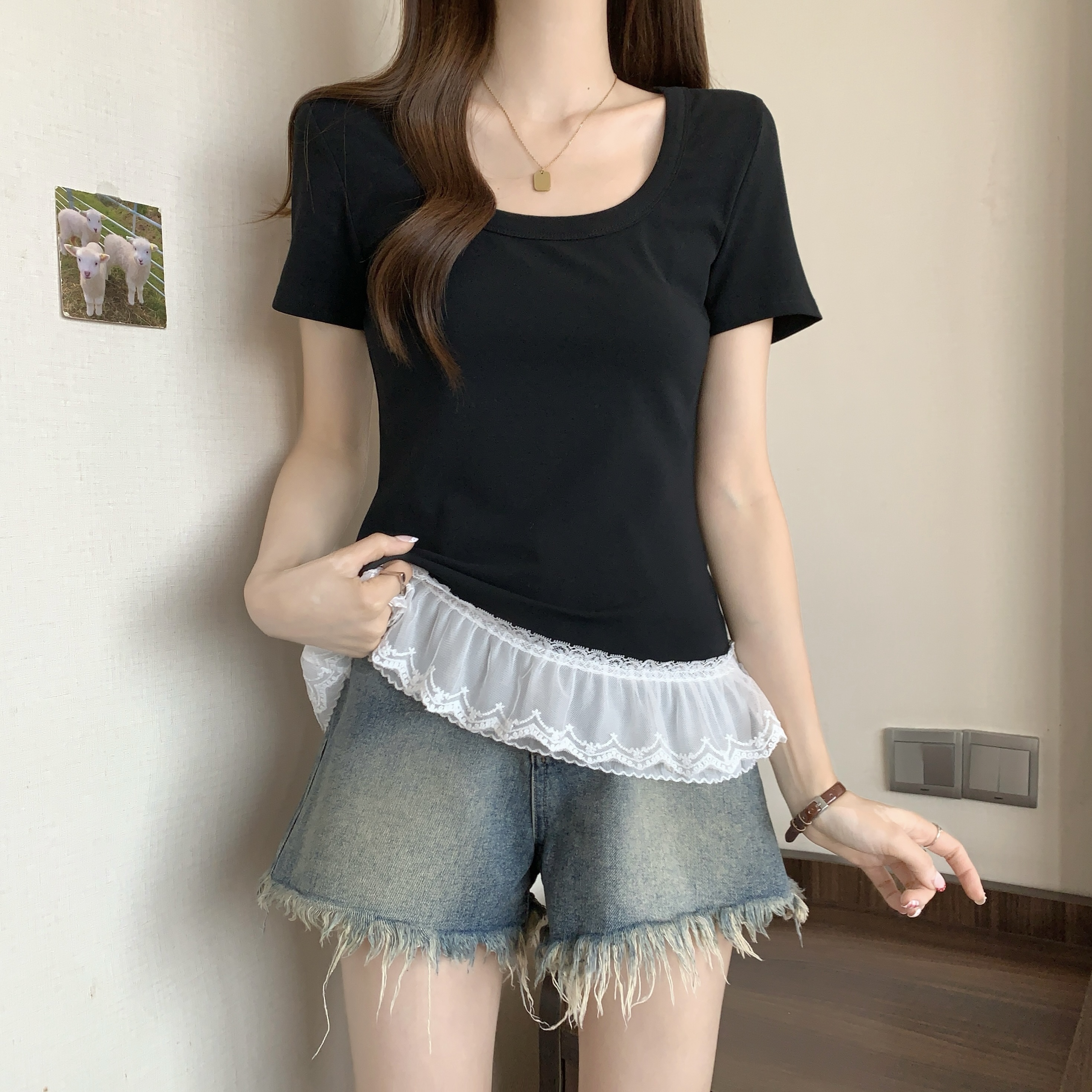RY1371# 实拍大码~U领T恤短袖女甜美风下摆蕾丝修身气质显瘦百搭打底上衣