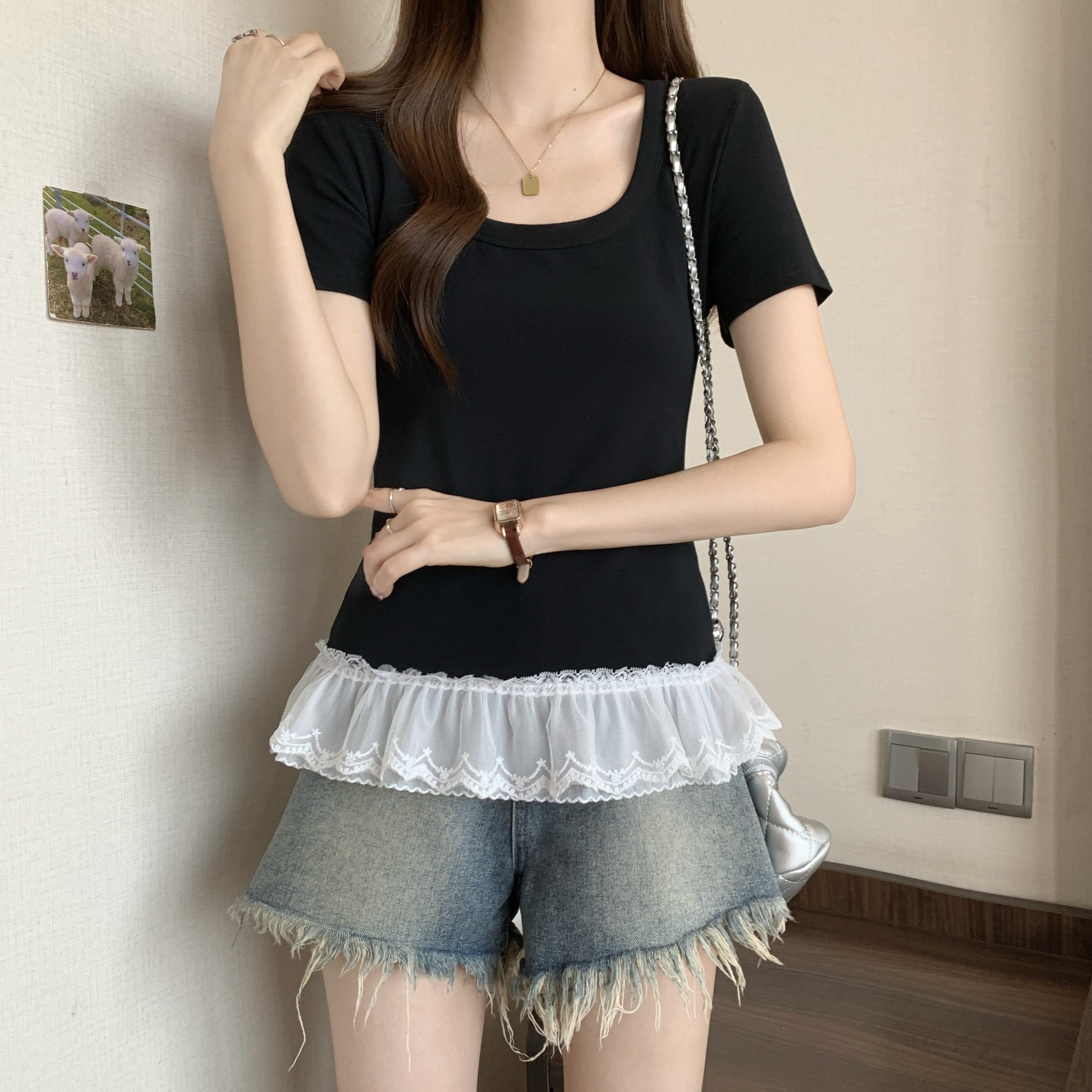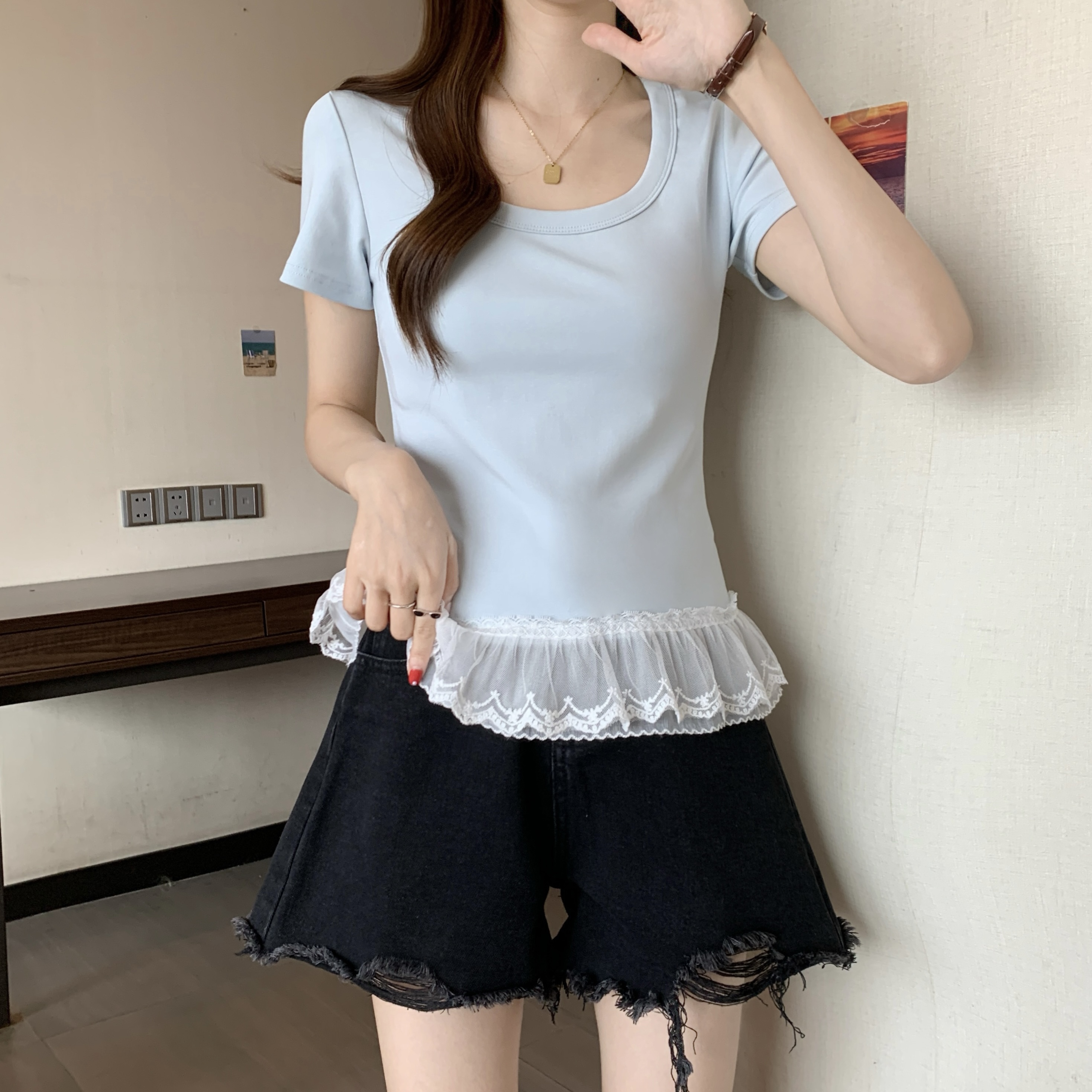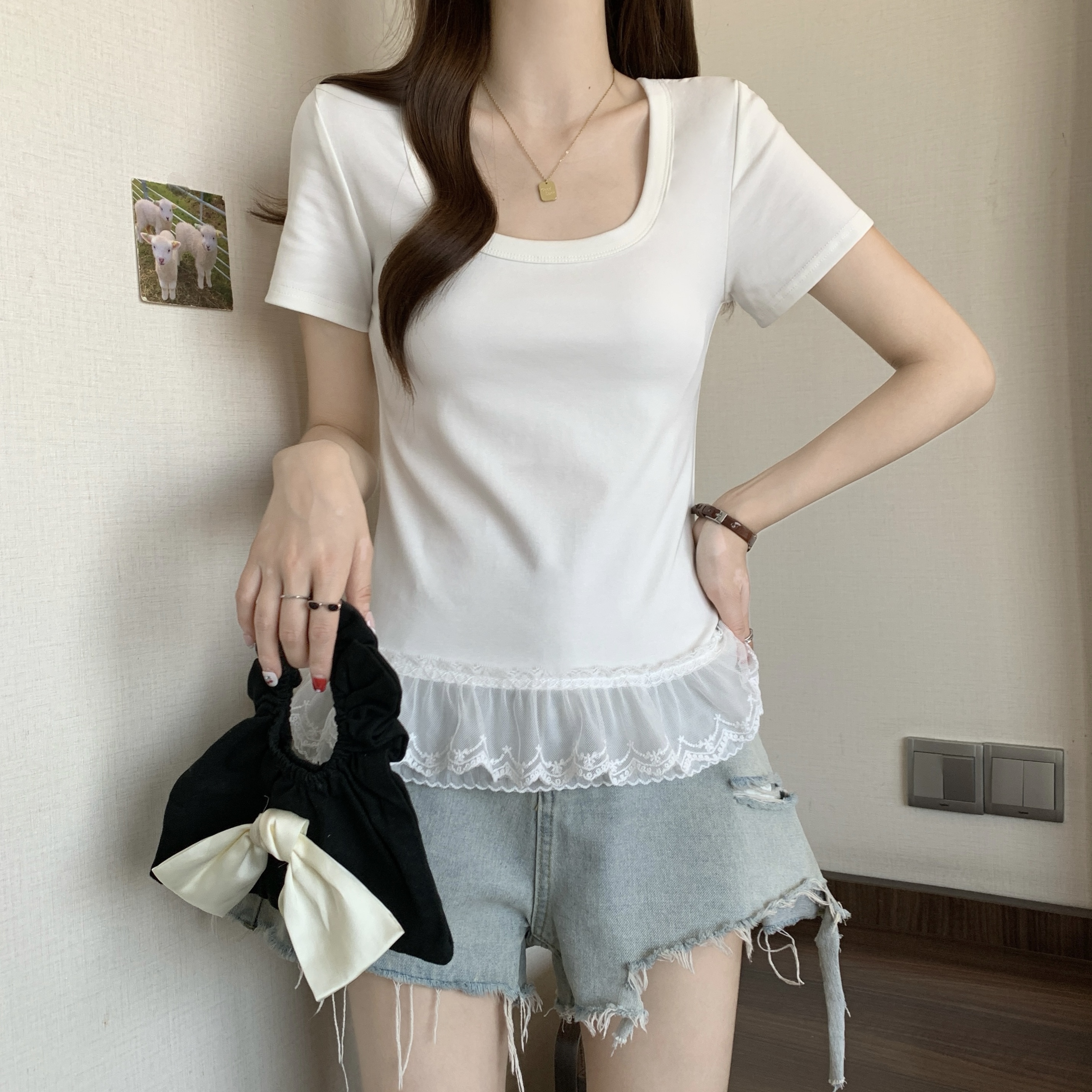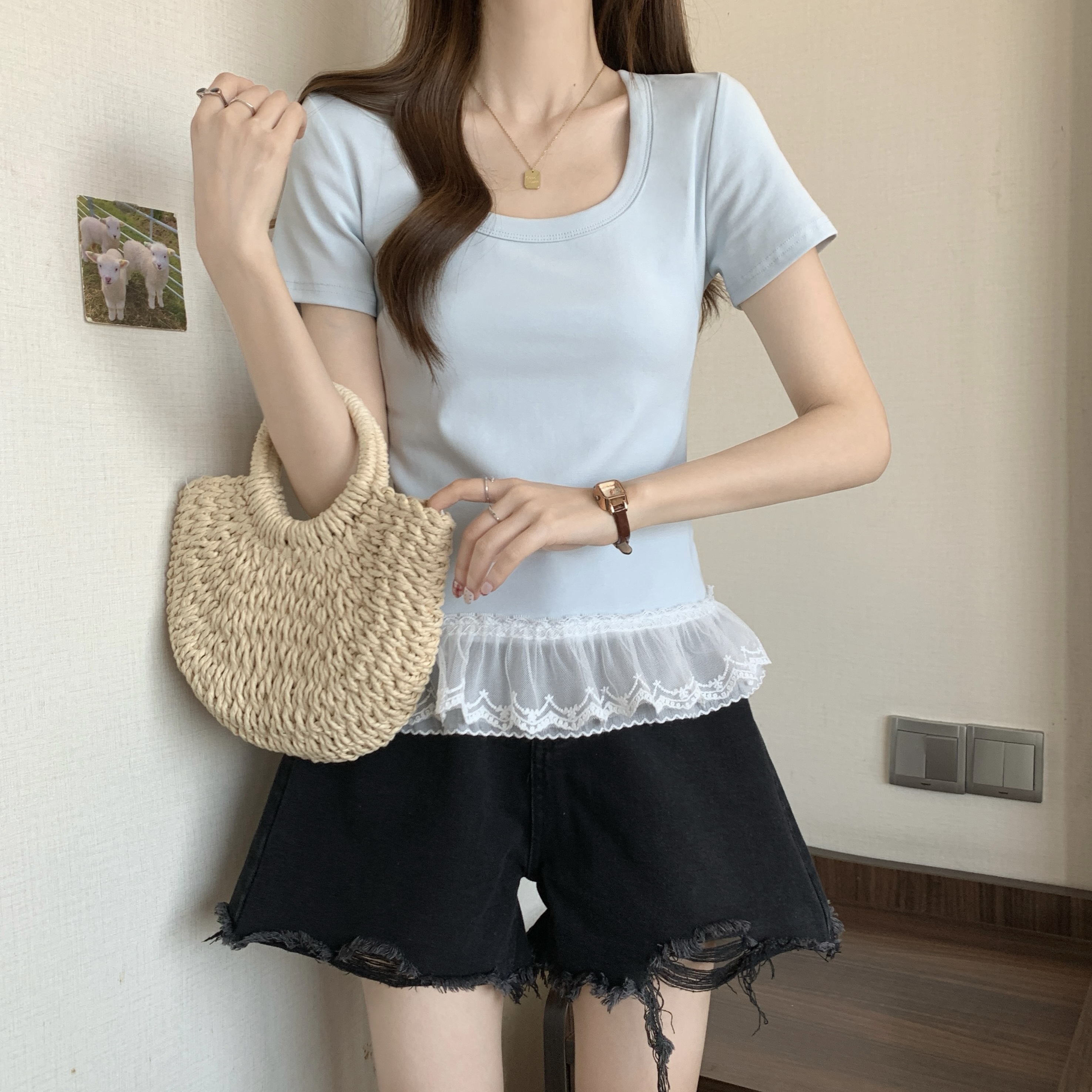 RY1371# 实拍大码~U领T恤短袖女甜美风下摆蕾丝修身气质显瘦百搭打底上衣