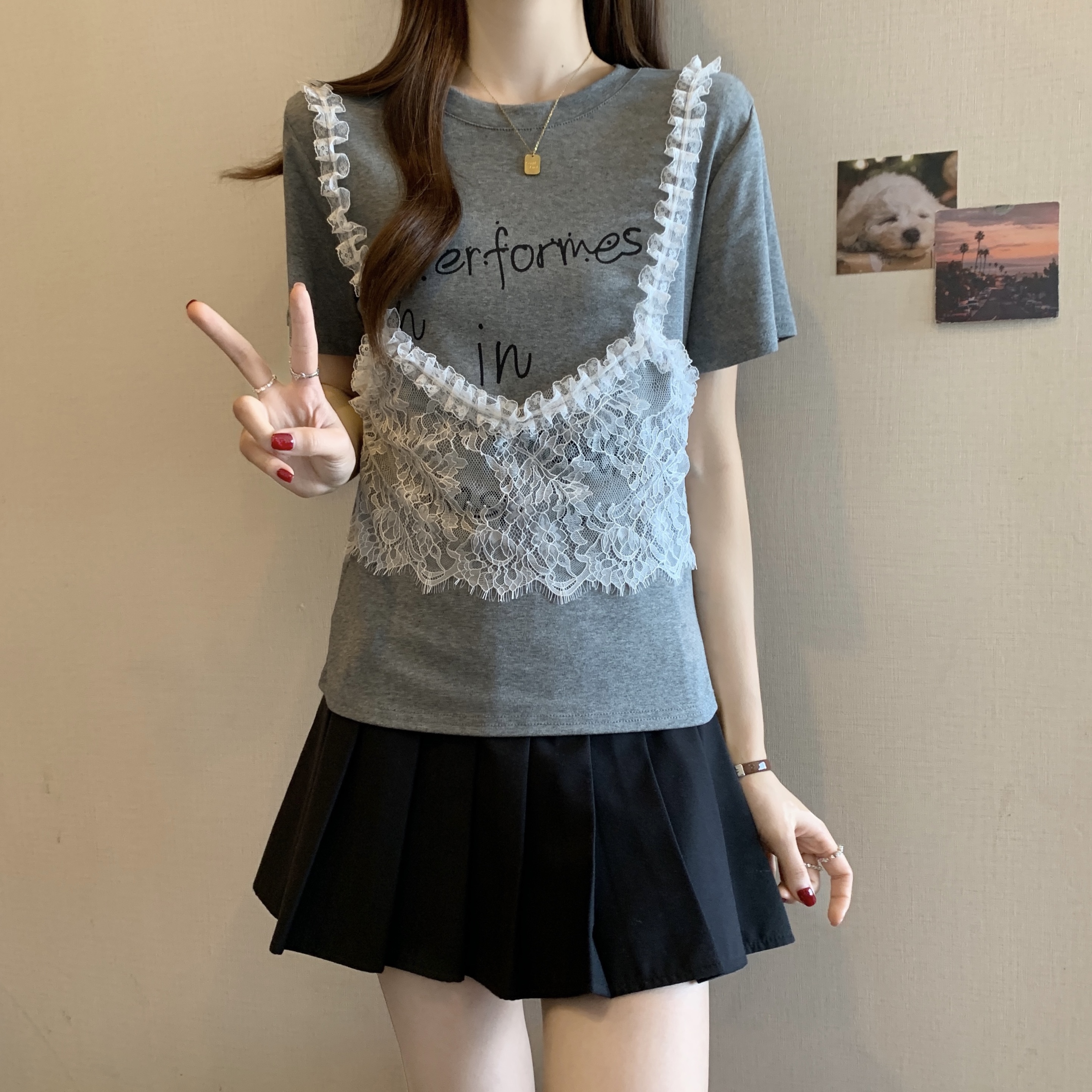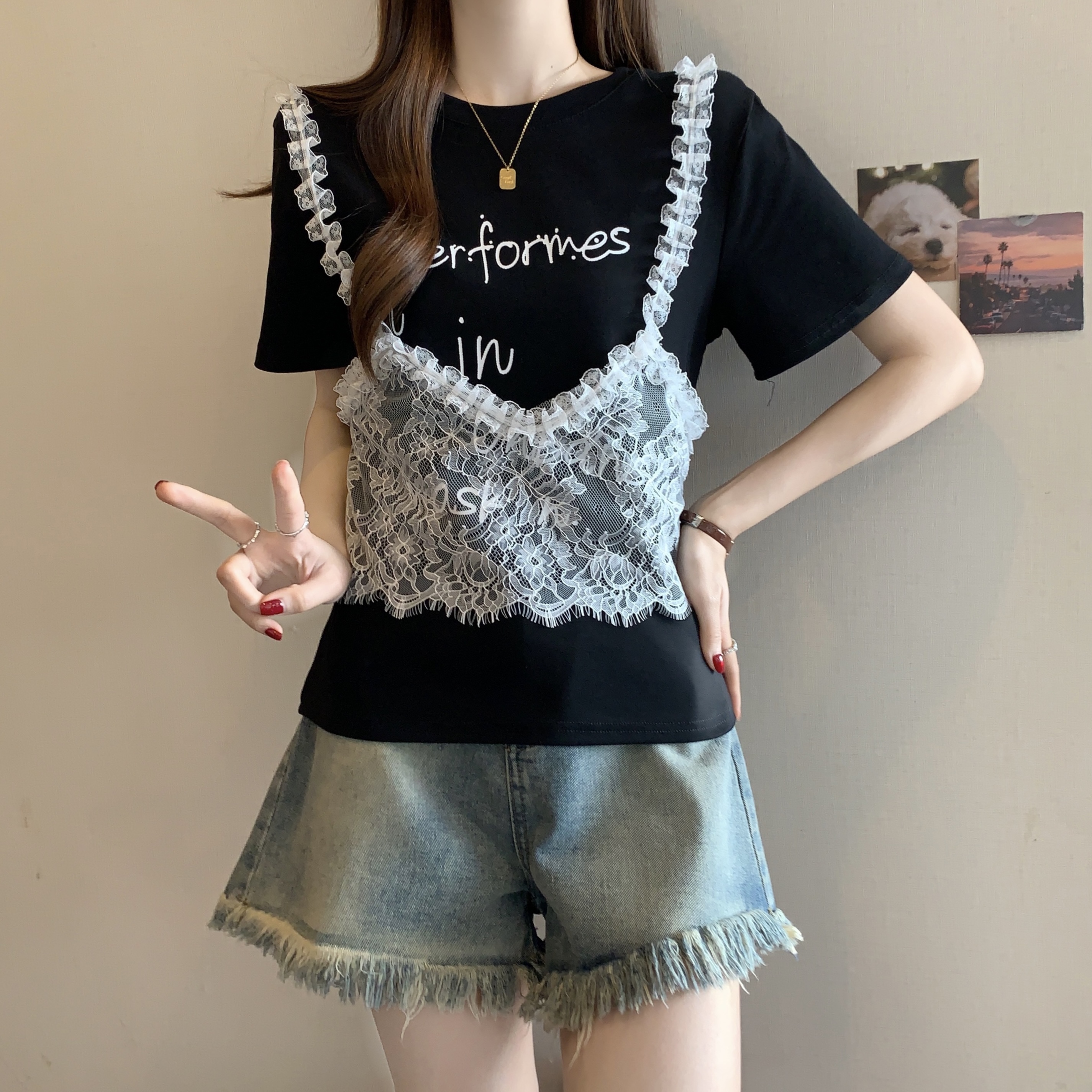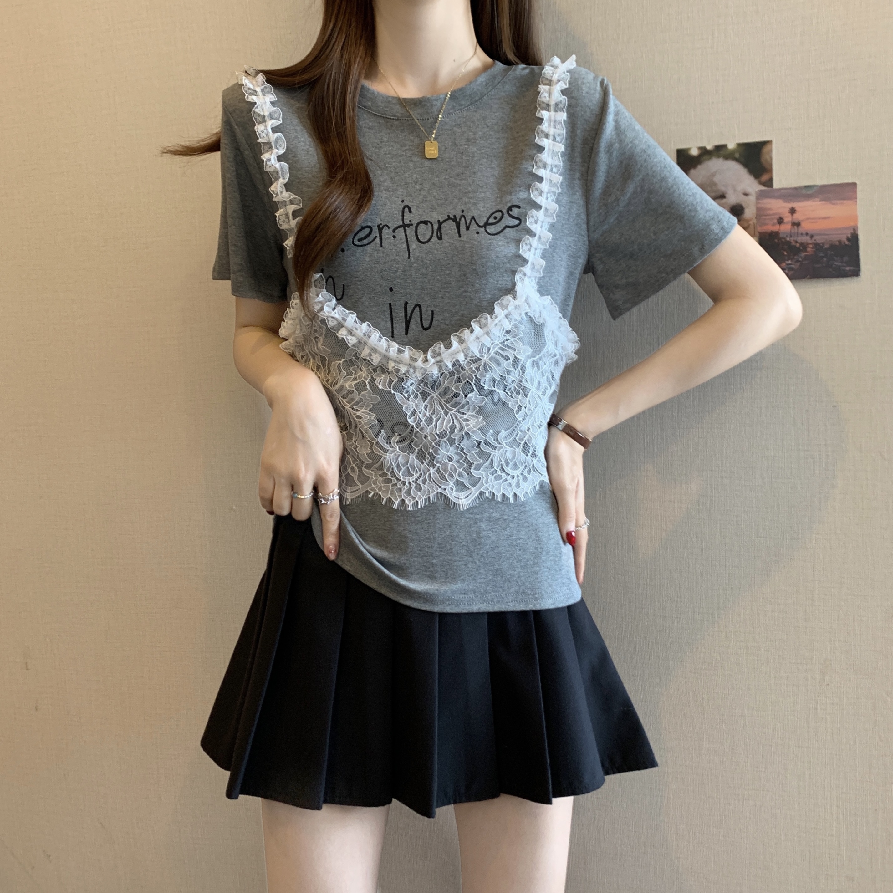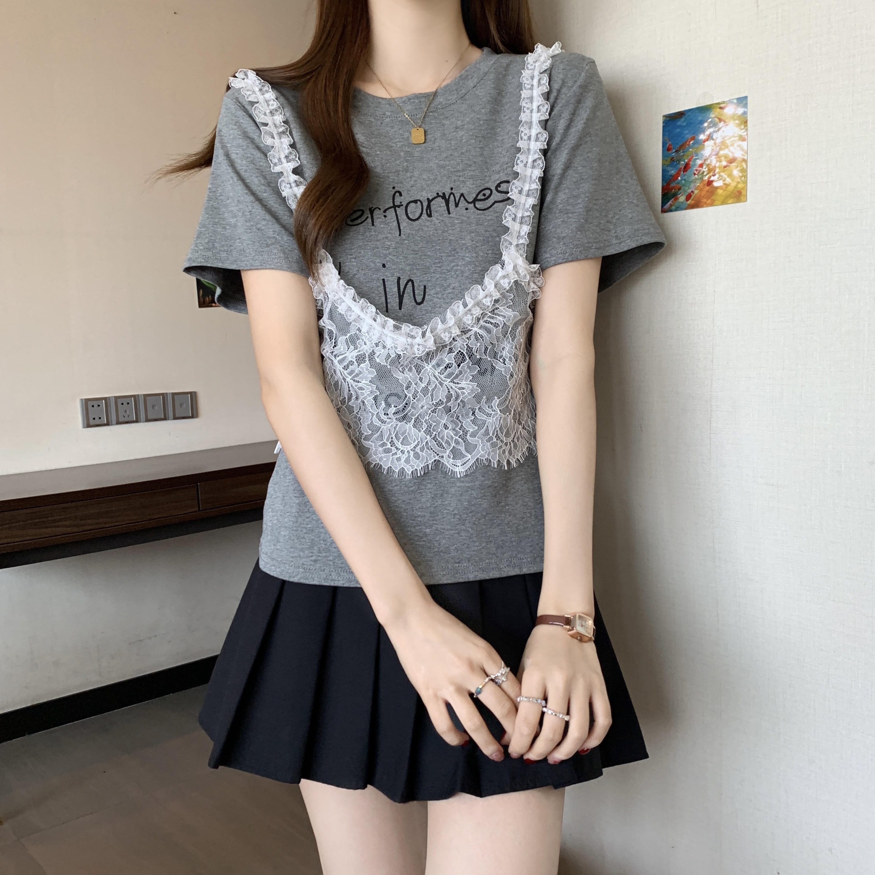 RY1372# 实拍大码~韩系2026春夏新款假两件蕾丝拼接短袖T恤女显瘦百搭上衣