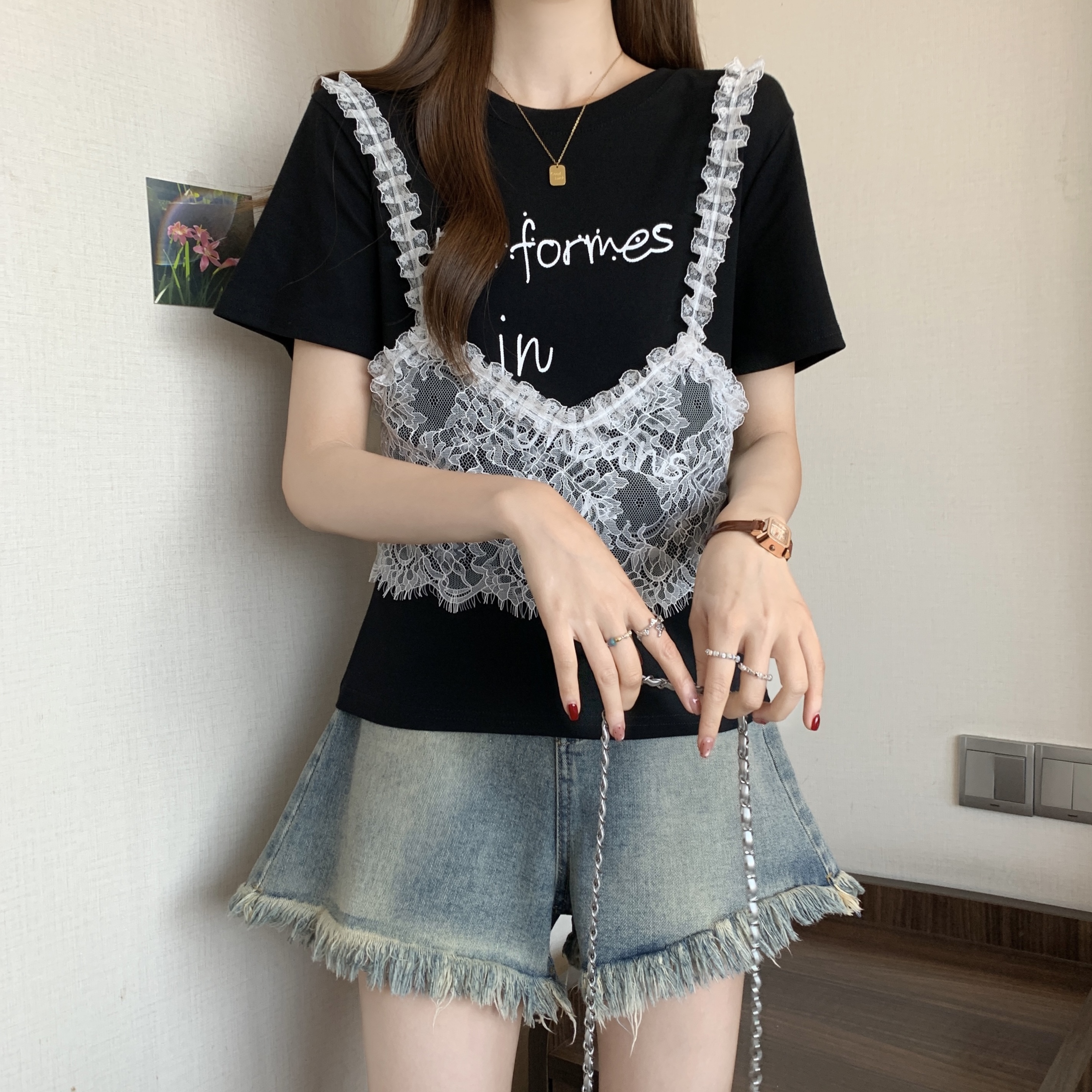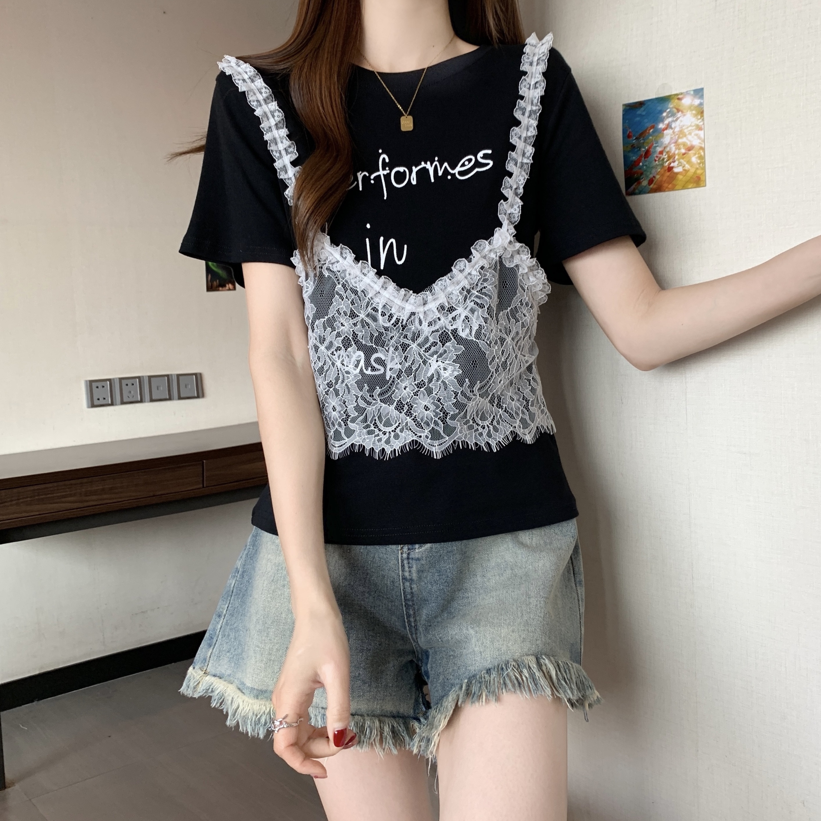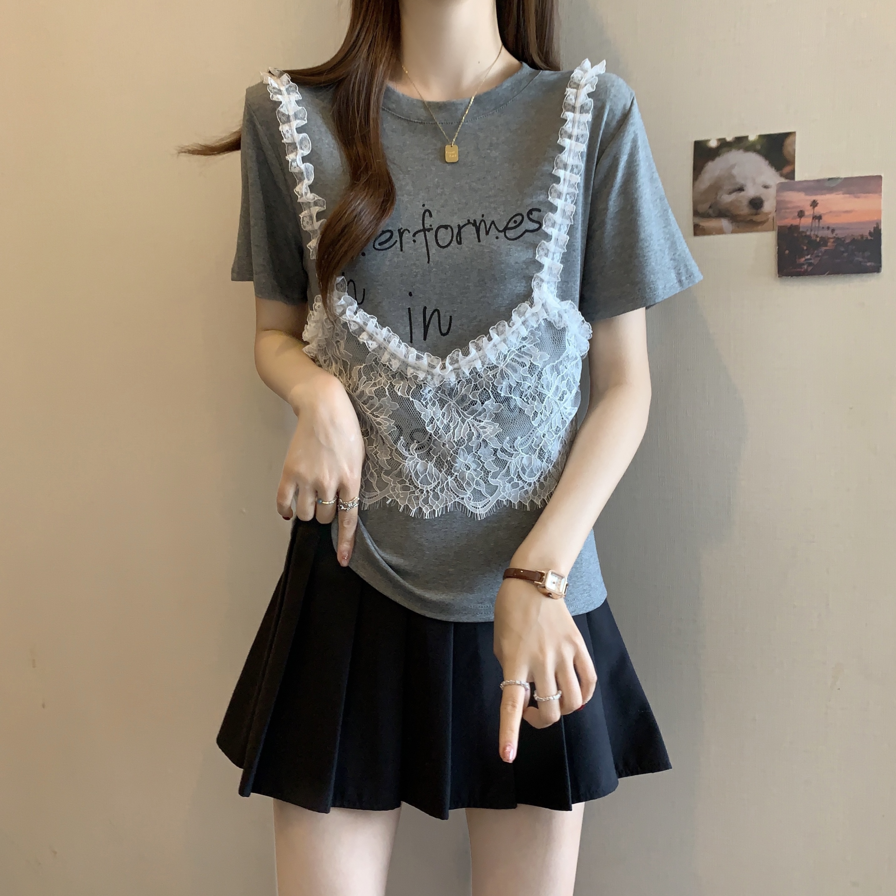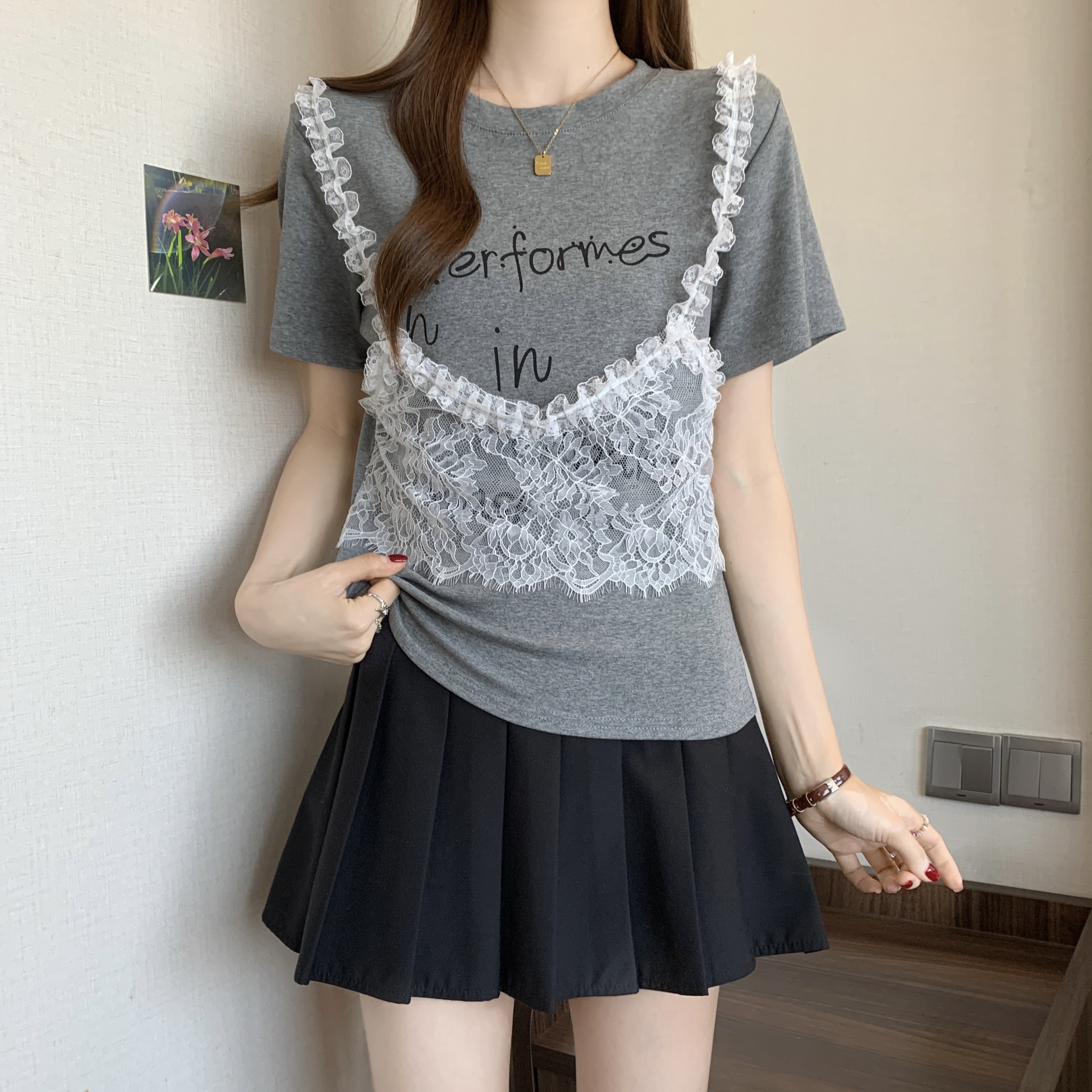 RY1372# 实拍大码~韩系2026春夏新款假两件蕾丝拼接短袖T恤女显瘦百搭上衣