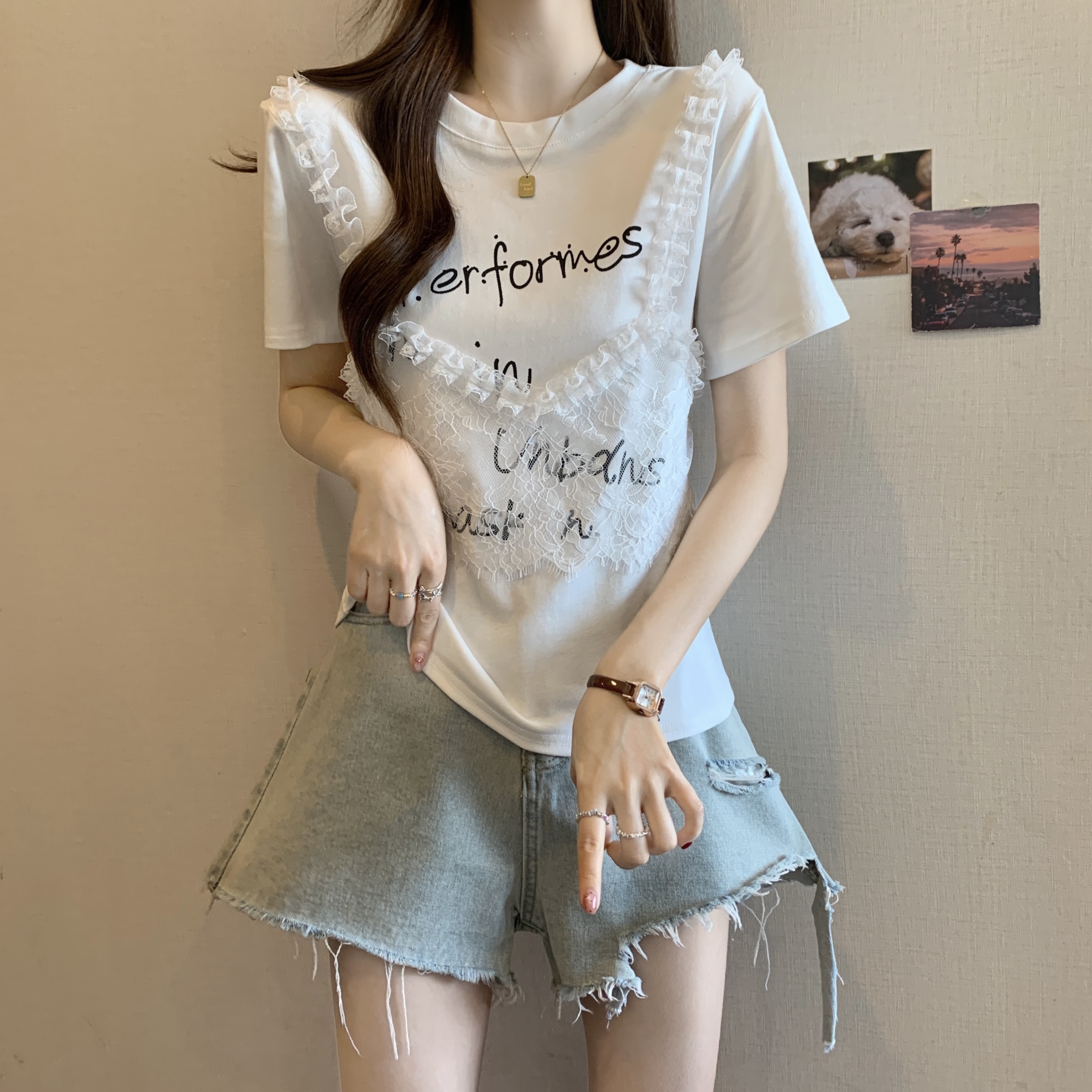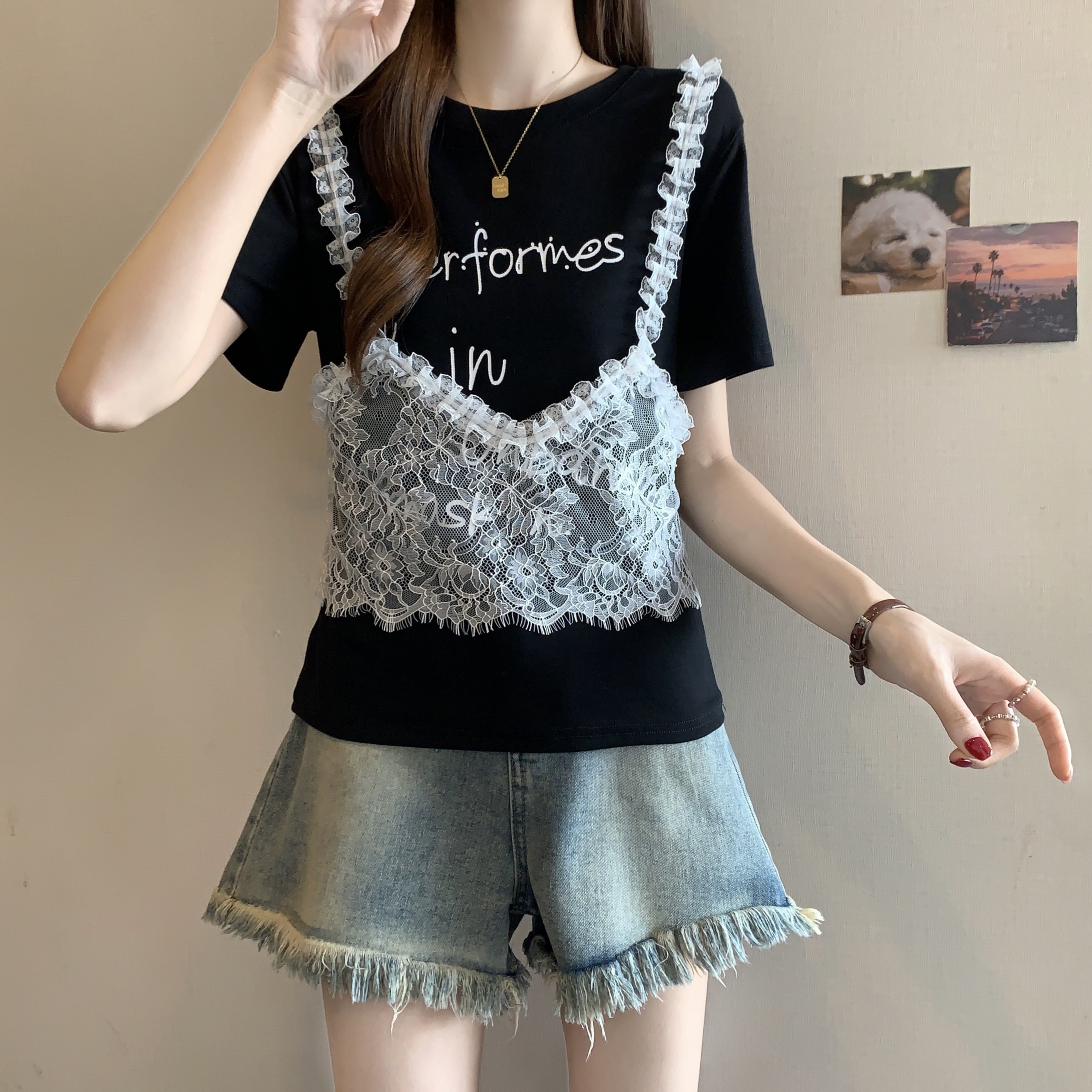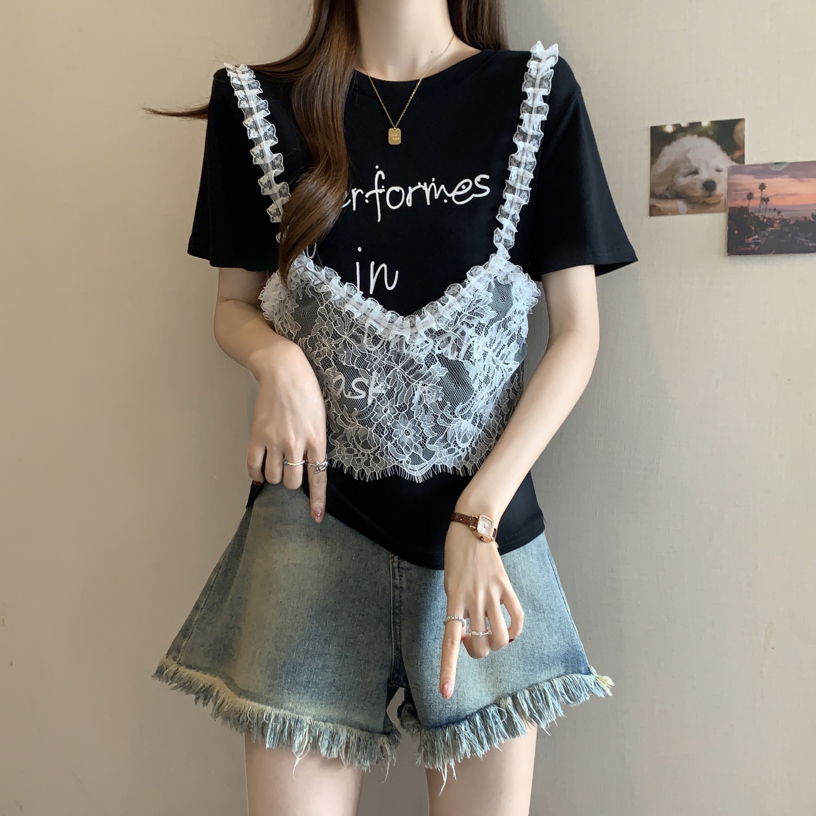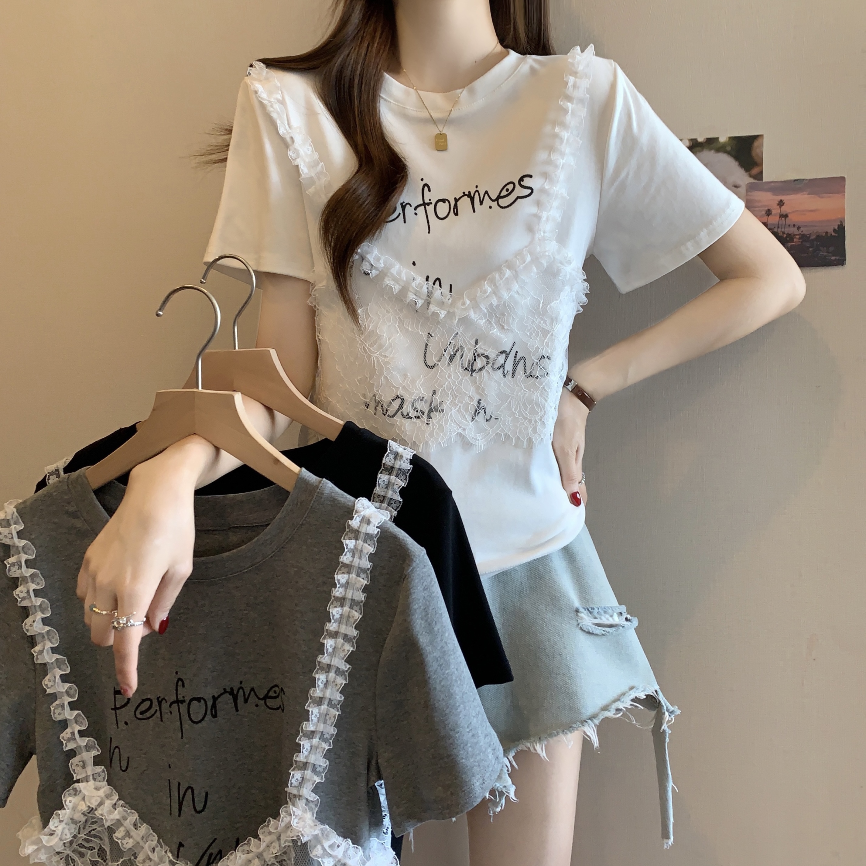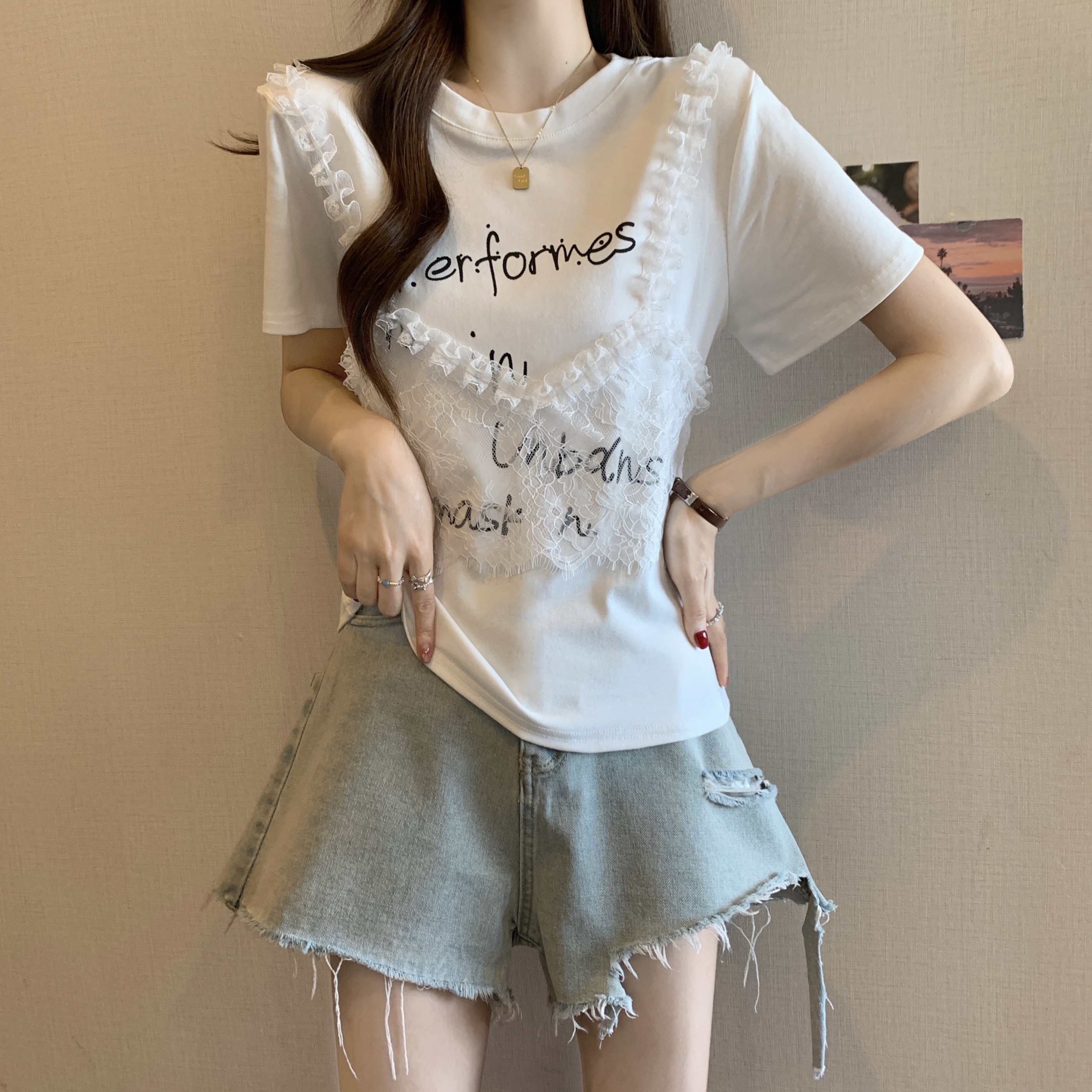 RY1372# 实拍大码~韩系2026春夏新款假两件蕾丝拼接短袖T恤女显瘦百搭上衣