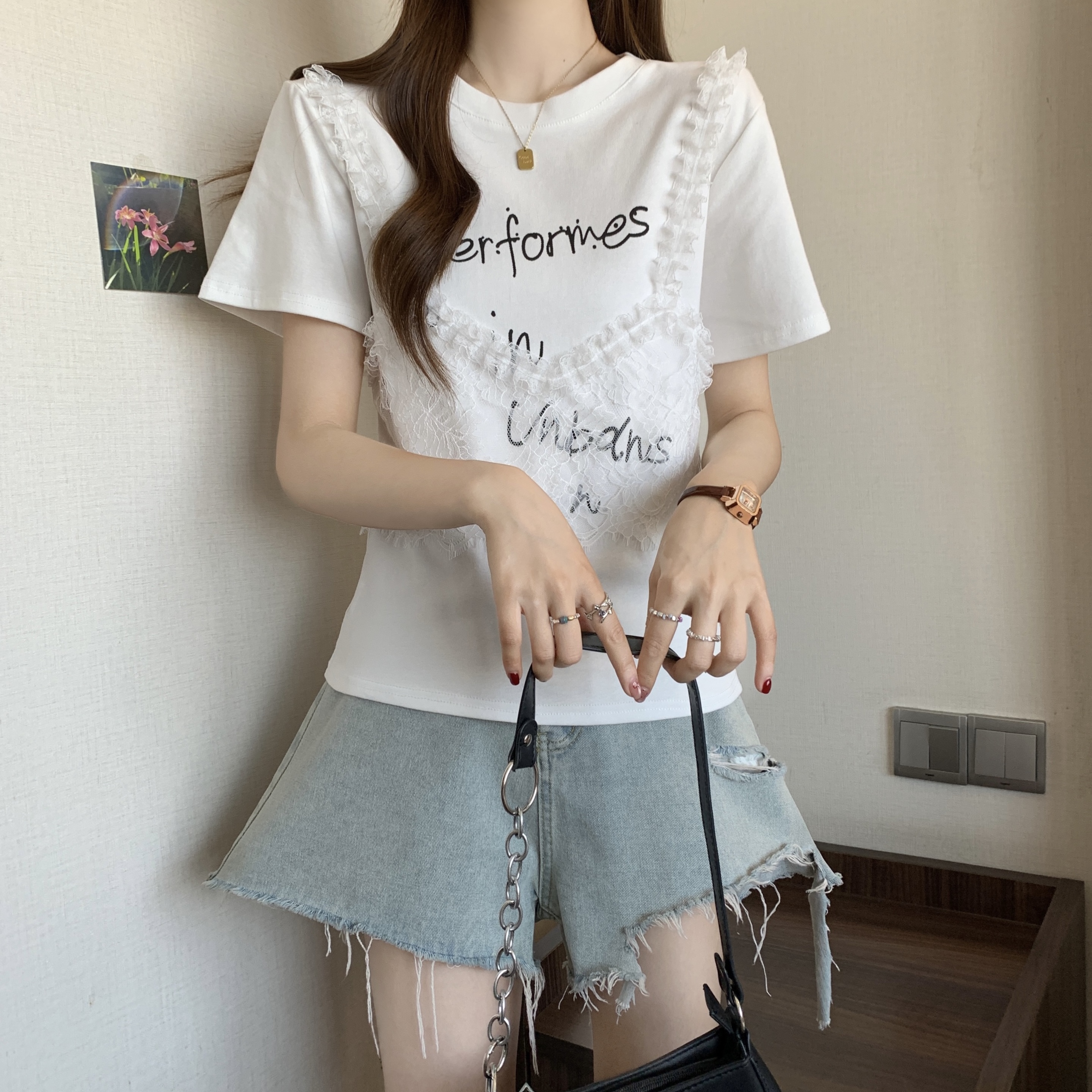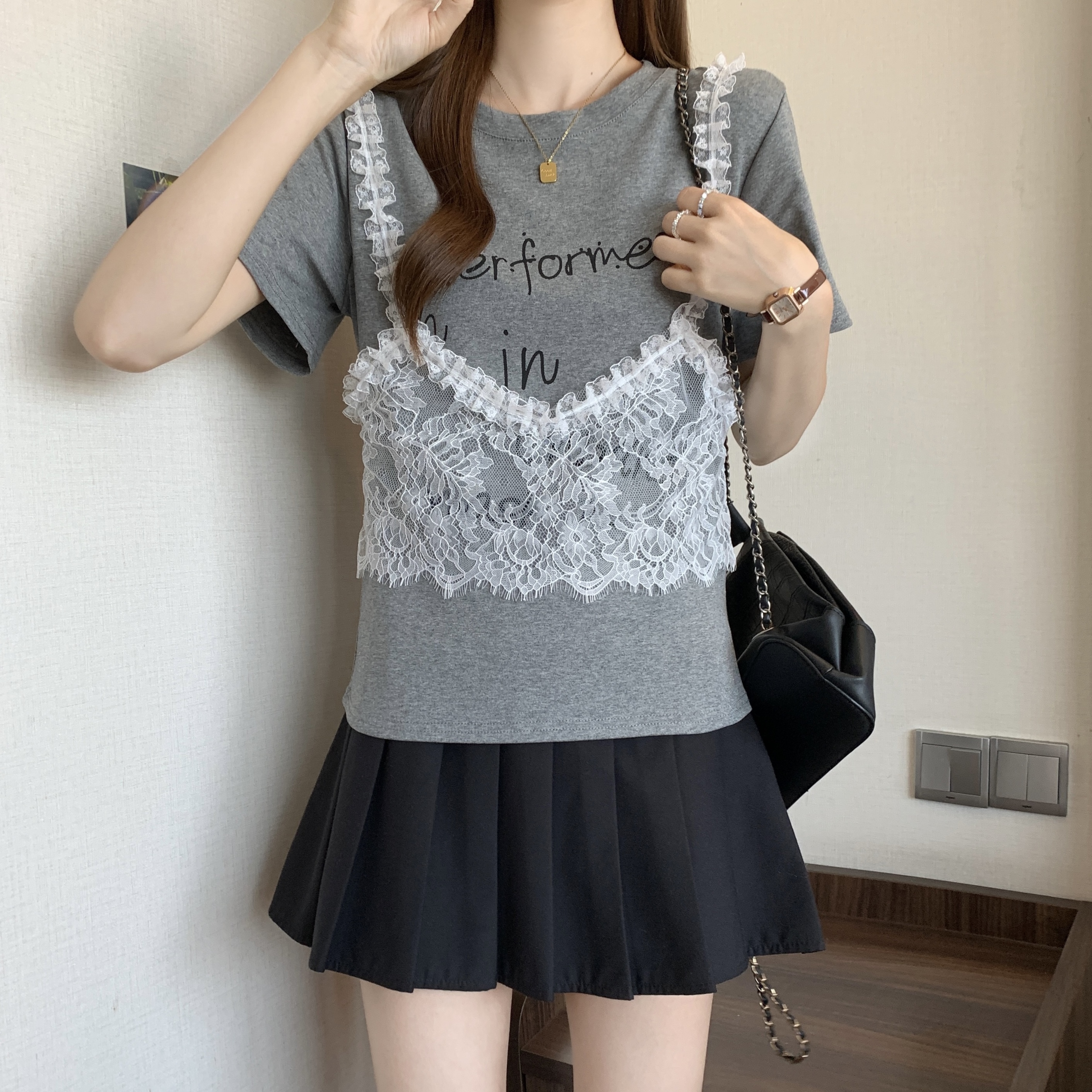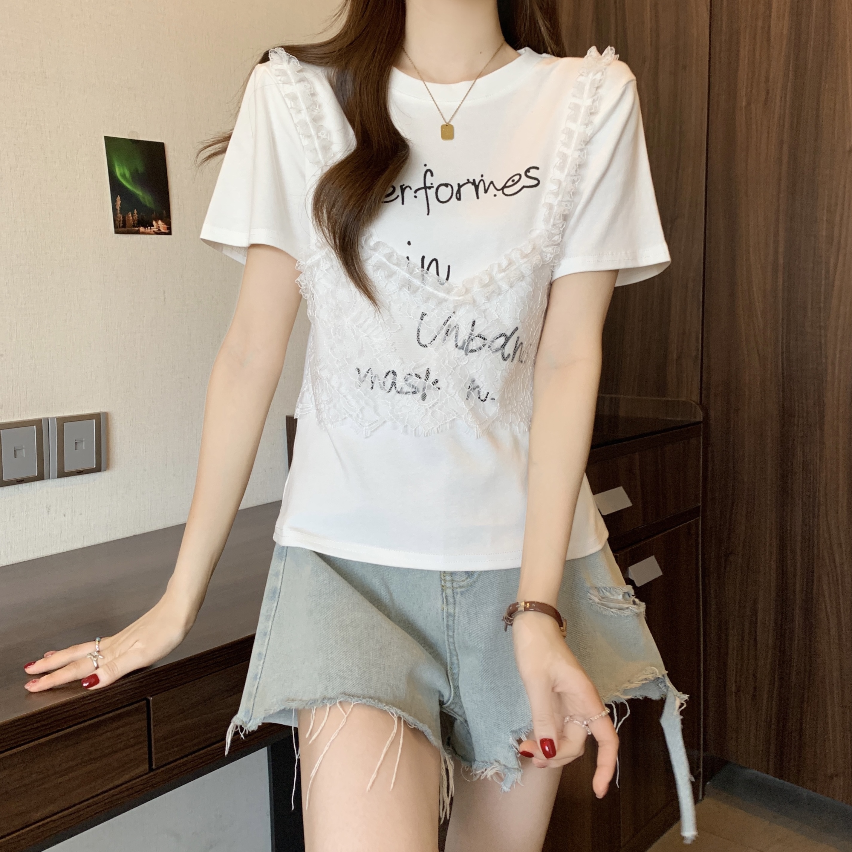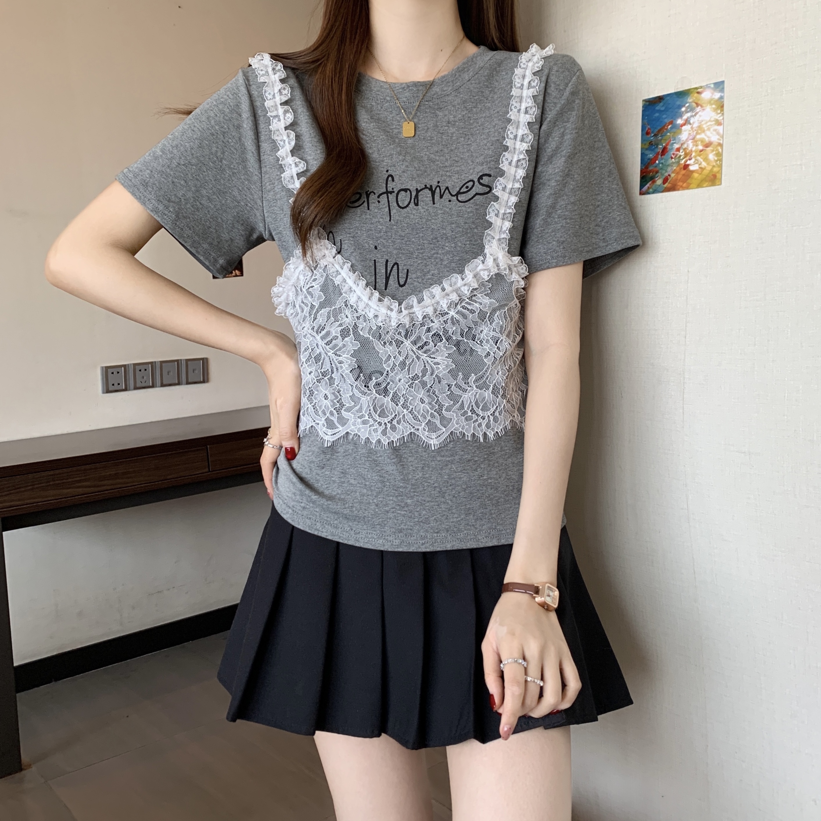 RY1372# 实拍大码~韩系2026春夏新款假两件蕾丝拼接短袖T恤女显瘦百搭上衣