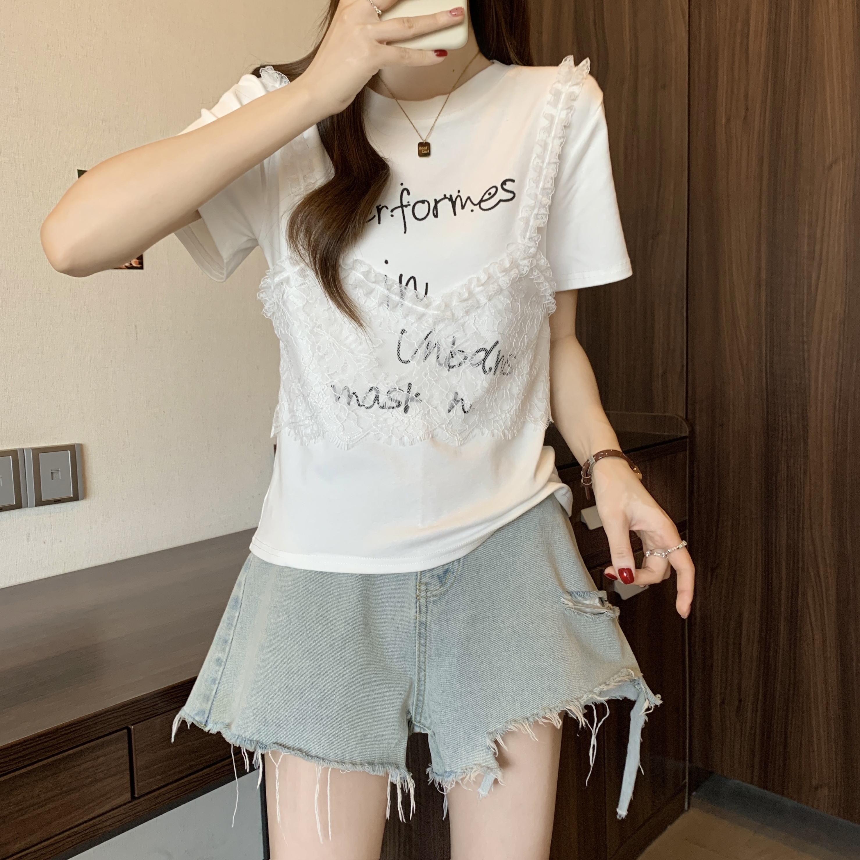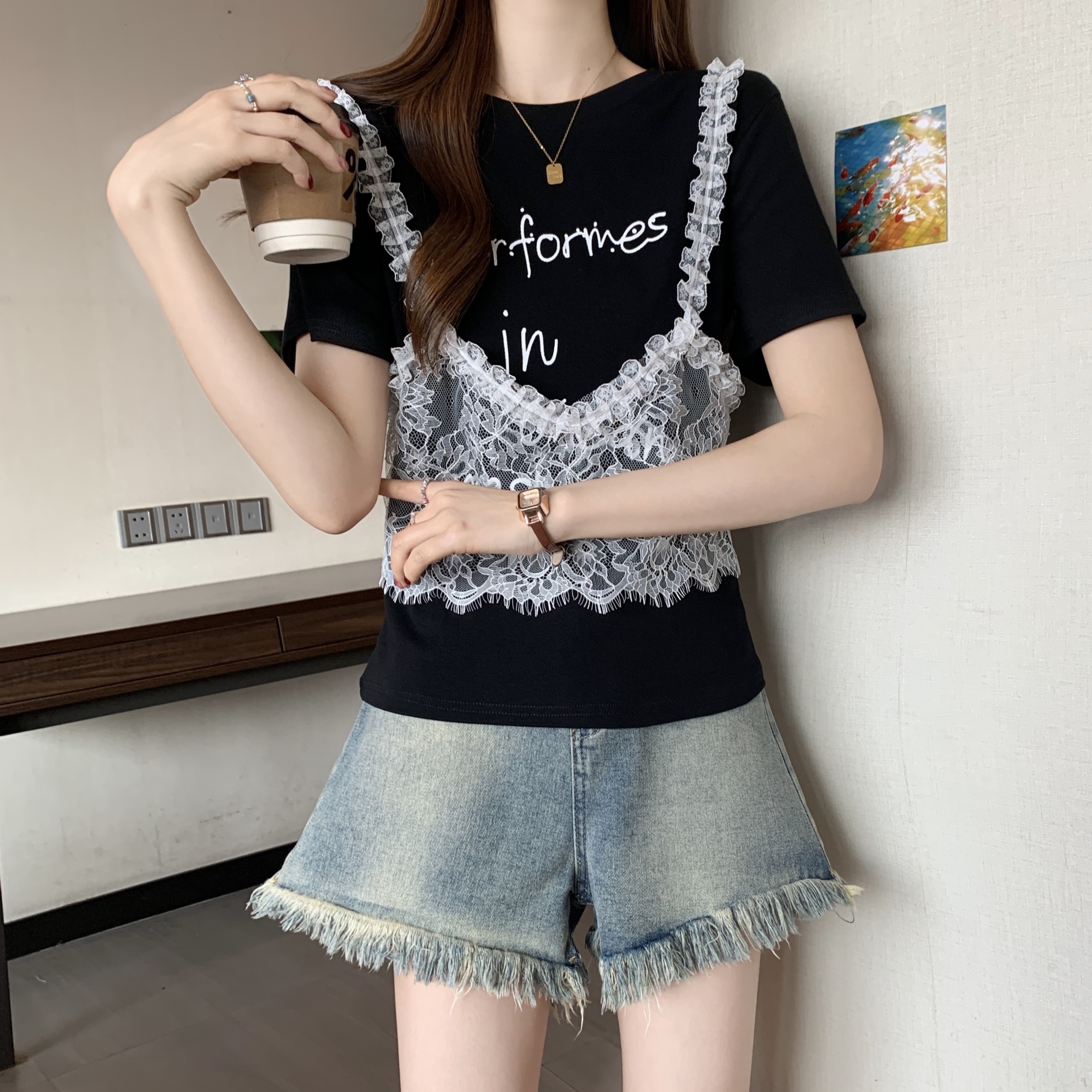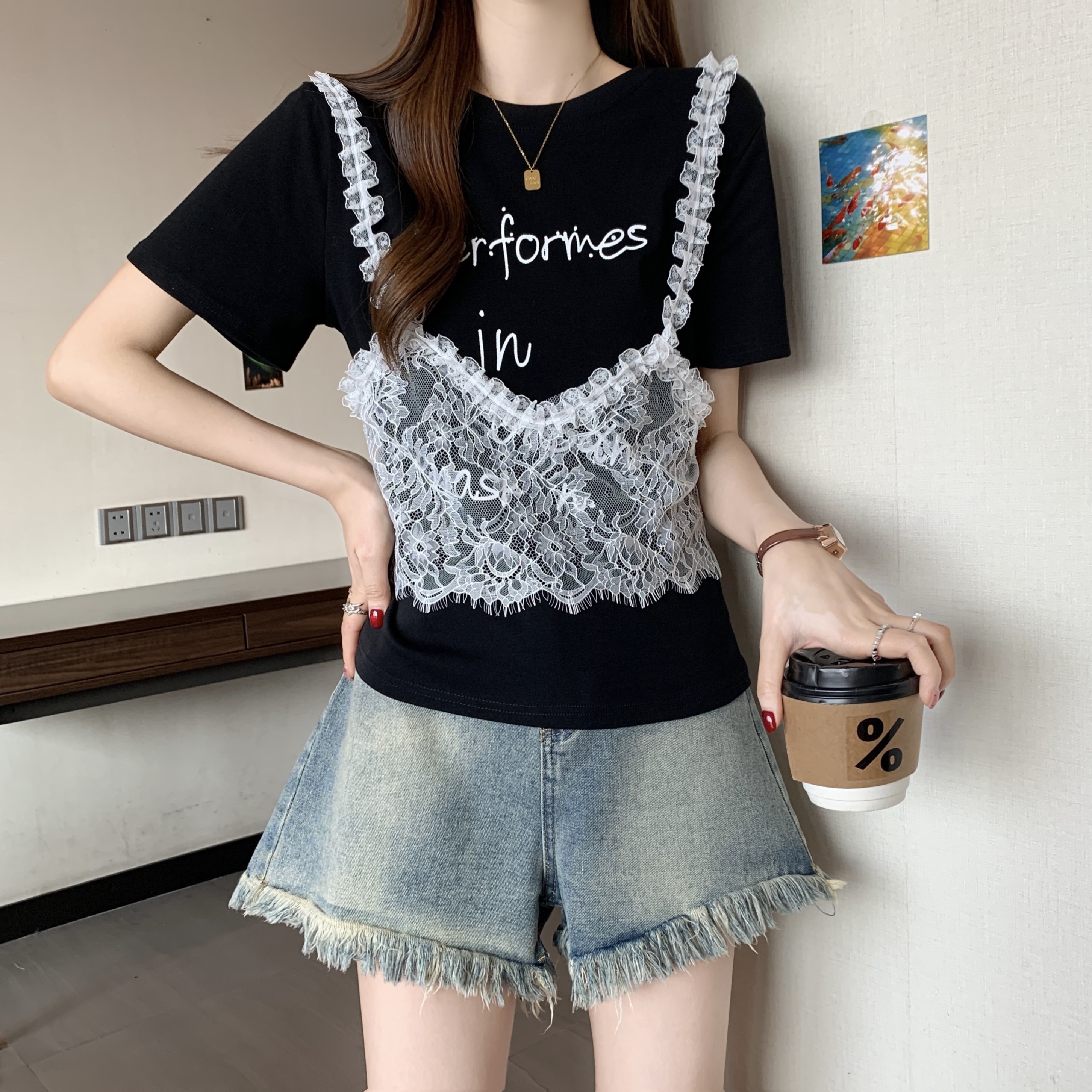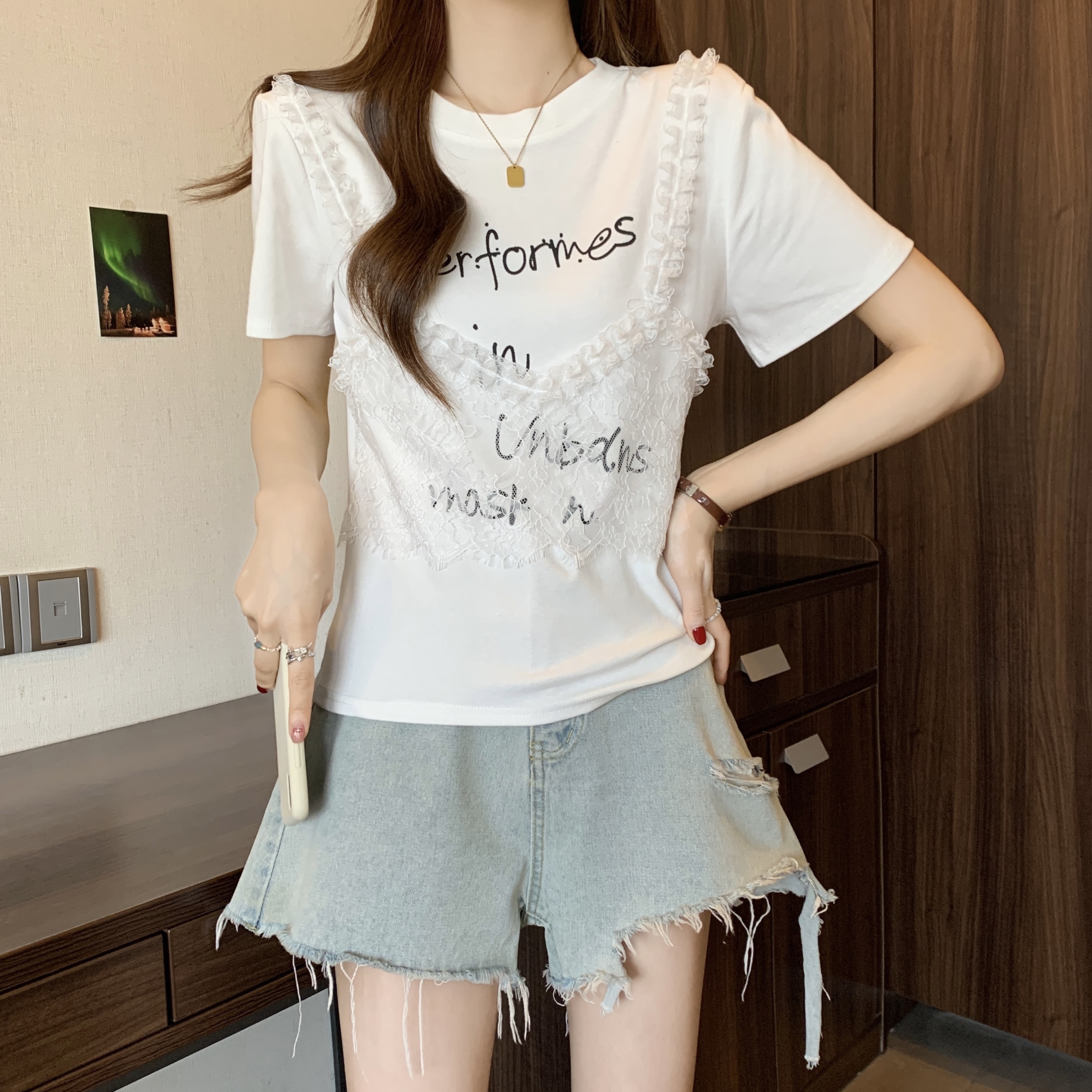 RY1372# 实拍大码~韩系2026春夏新款假两件蕾丝拼接短袖T恤女显瘦百搭上衣