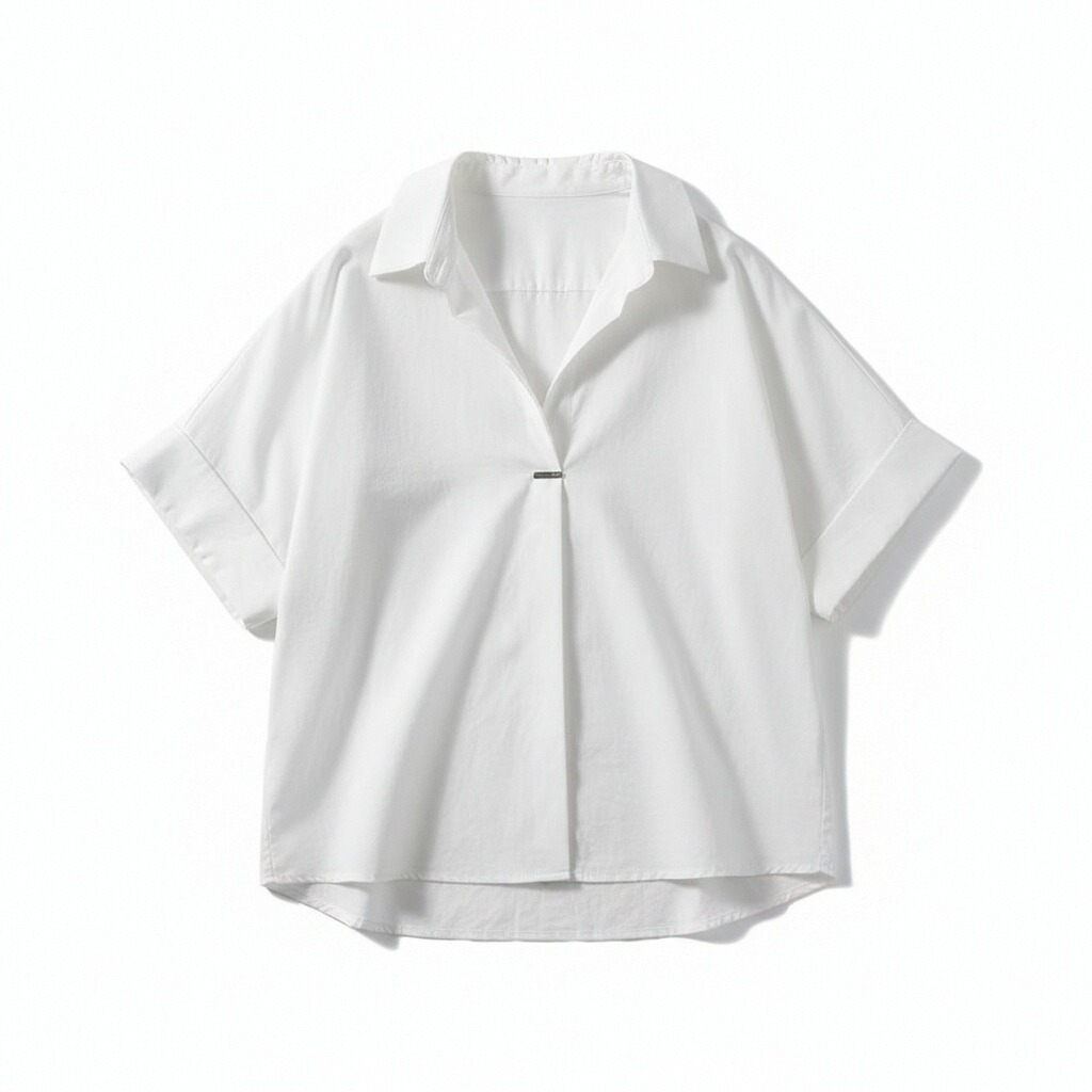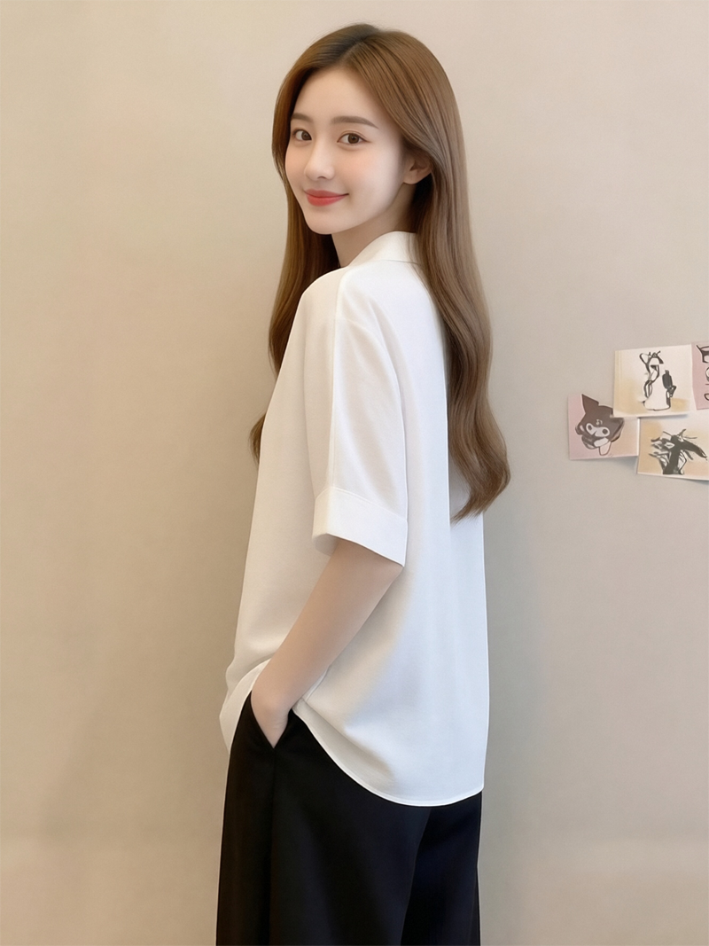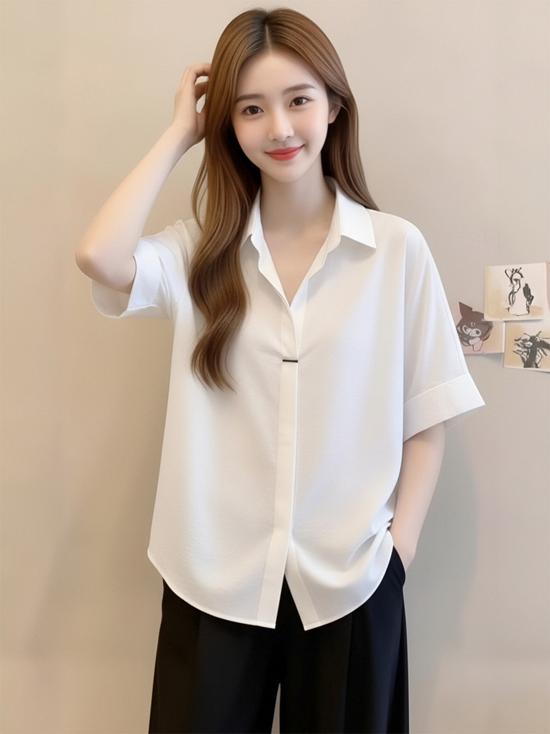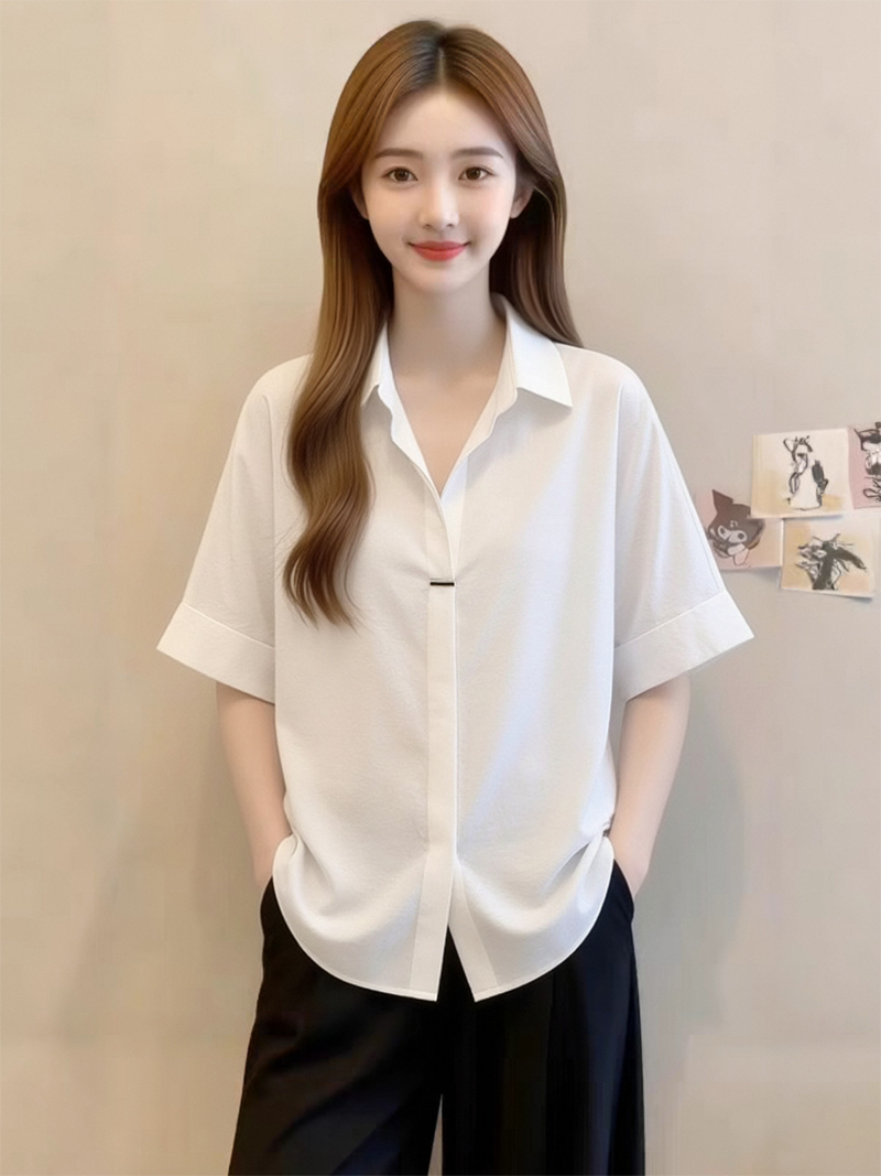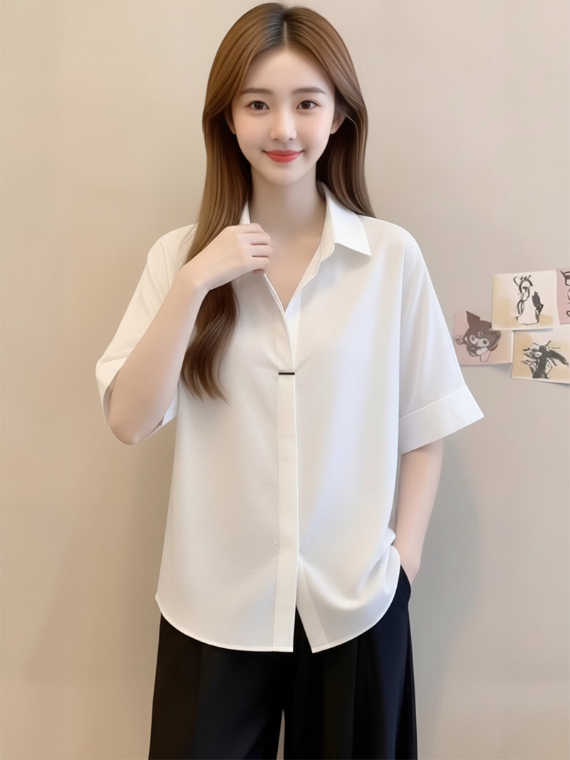 RY1449# 短袖衬衫夏季新款法式高级气质别致衬衣显瘦白色上衣雪纺衫