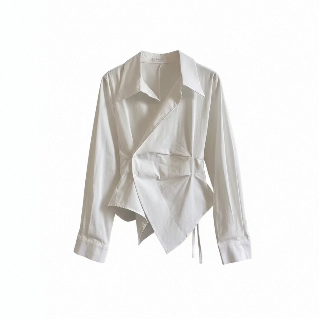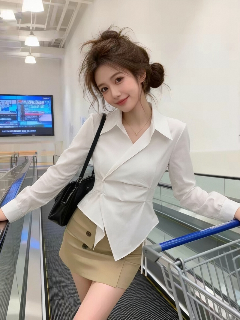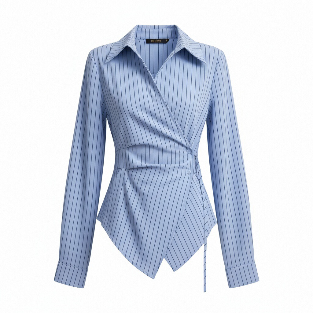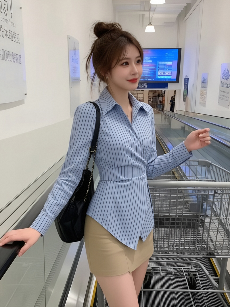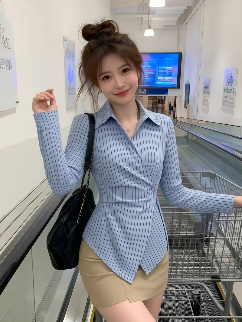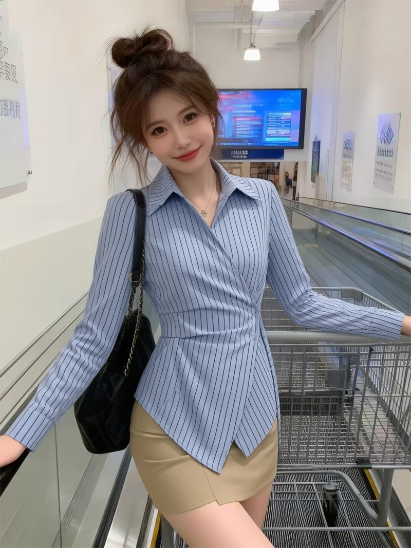 RY1450# 设计感小众不规则收腰显瘦时髦条纹衬衫长袖上衣