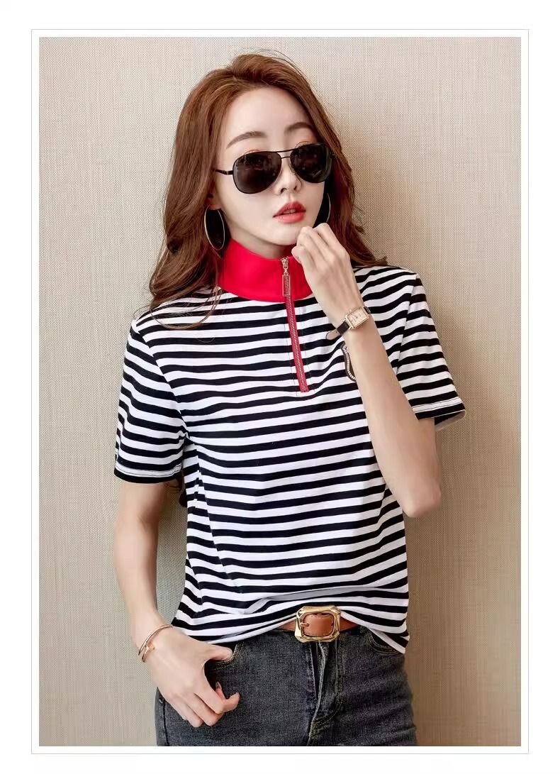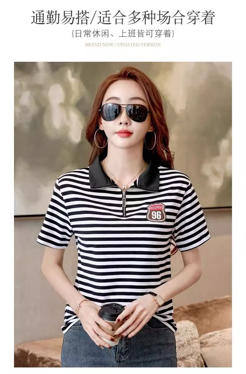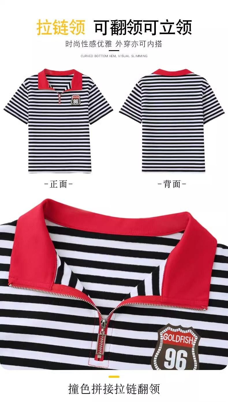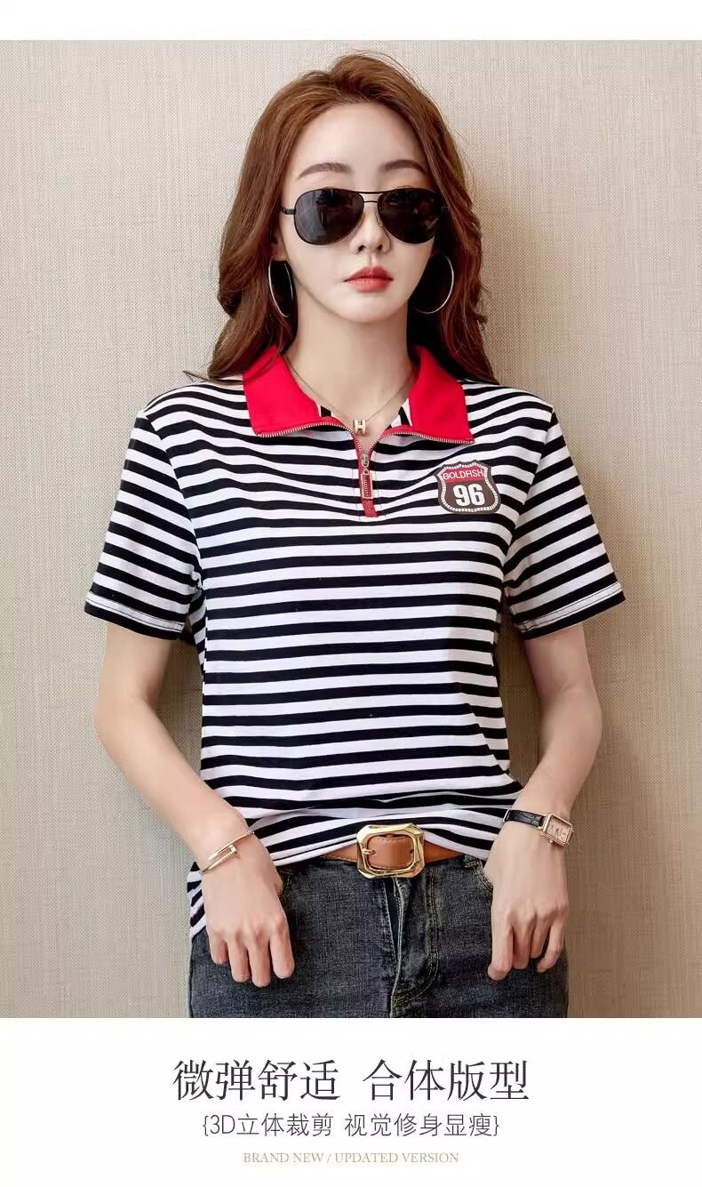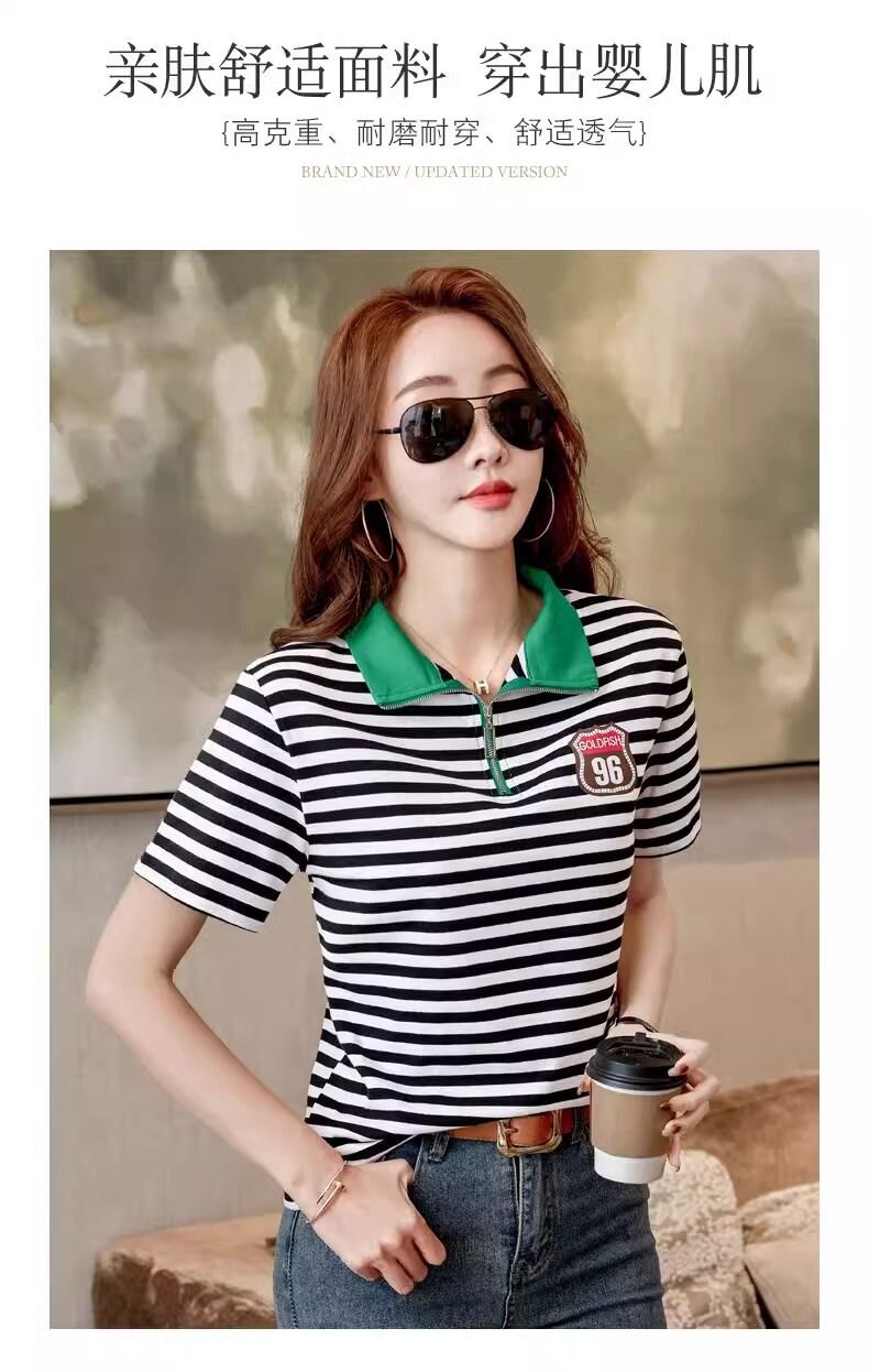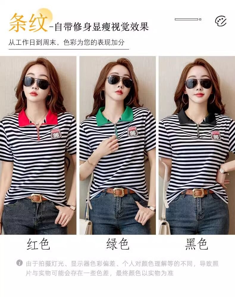 RY1458# 棉95氨纶5时尚休闲撞色翻领短袖夏季新款百搭拉链立领条纹t恤