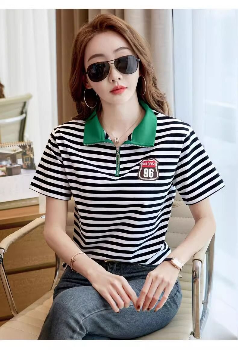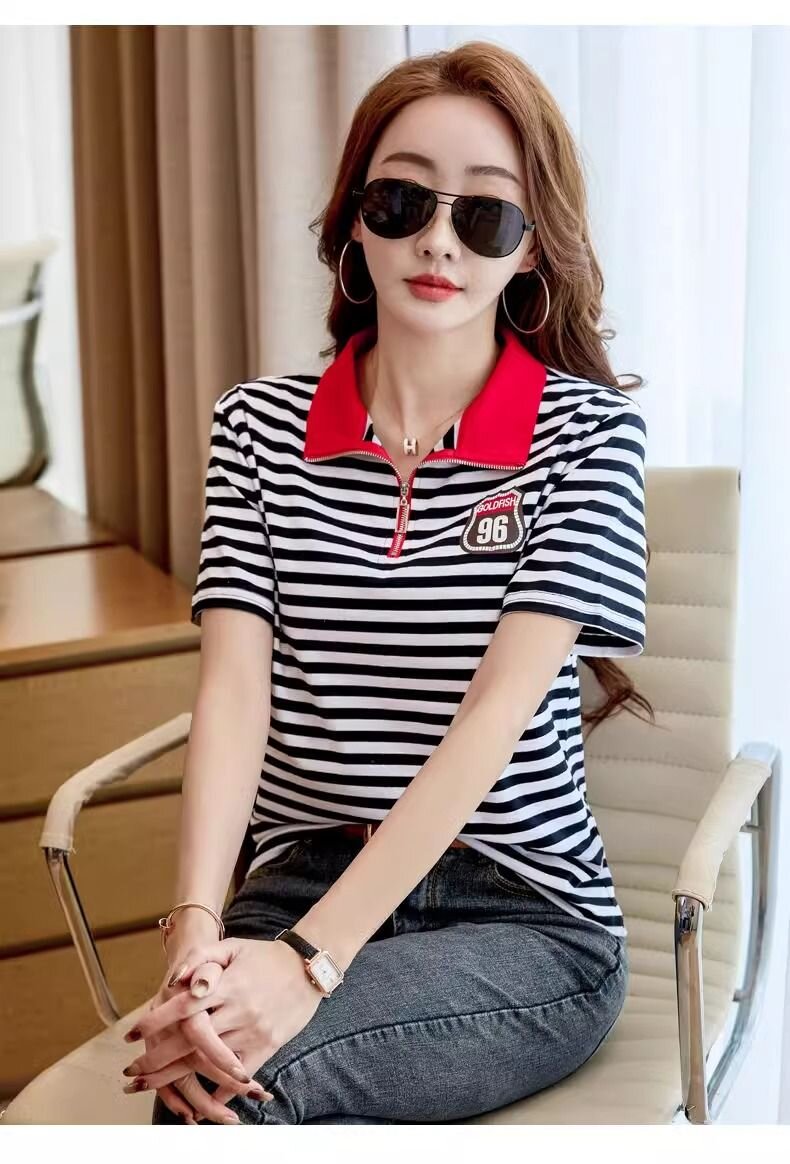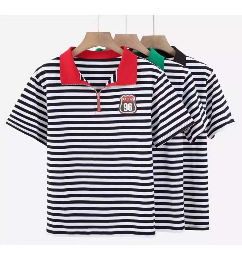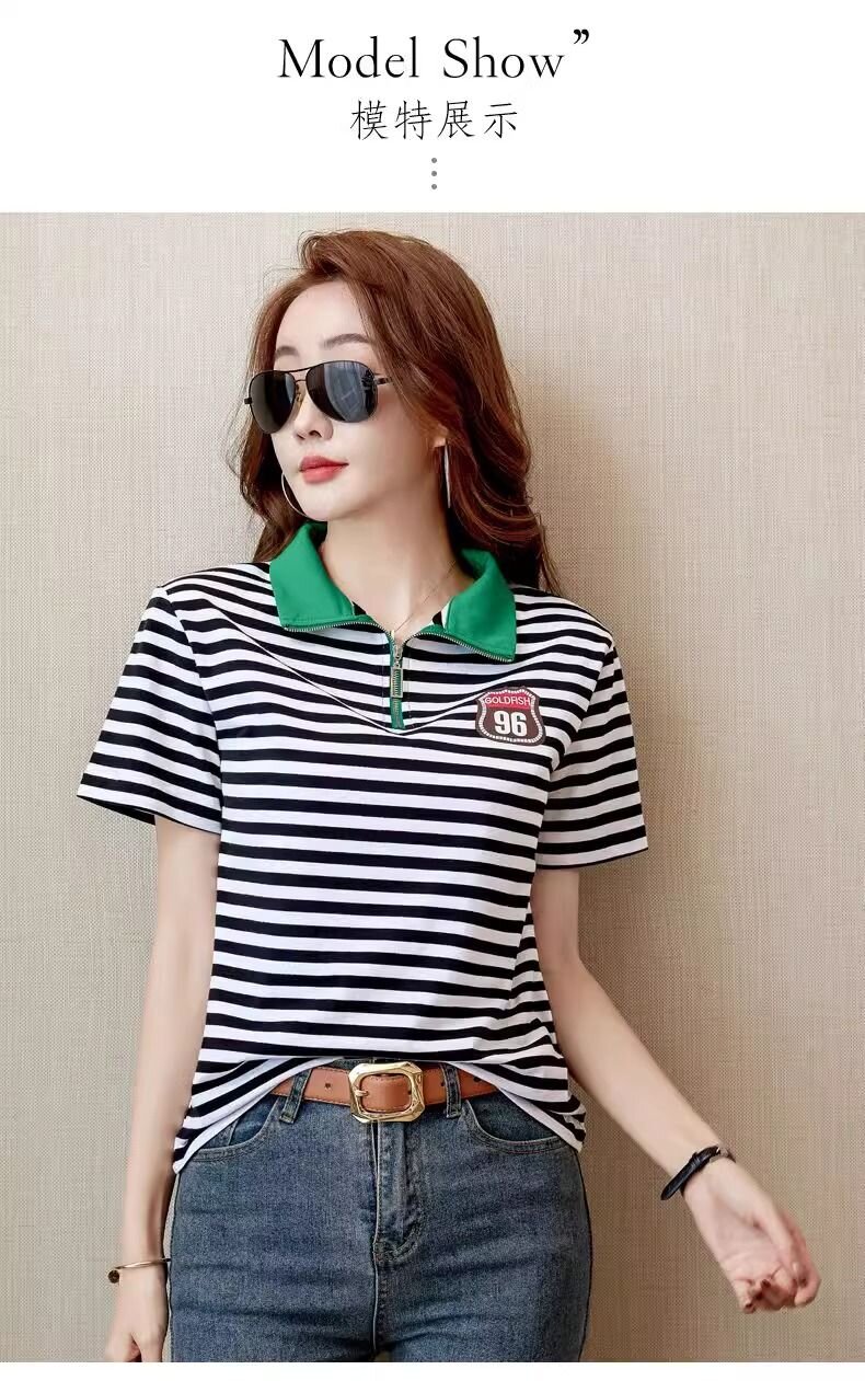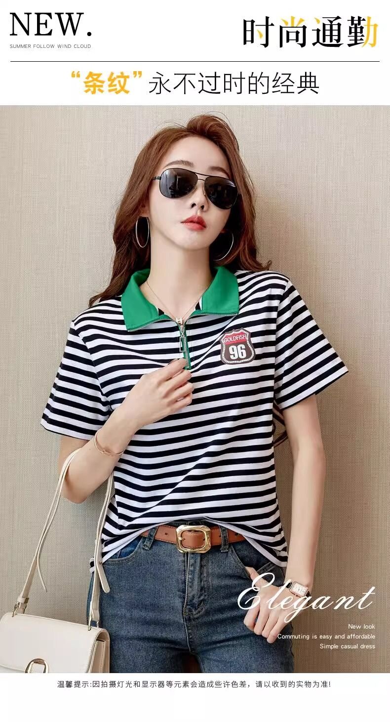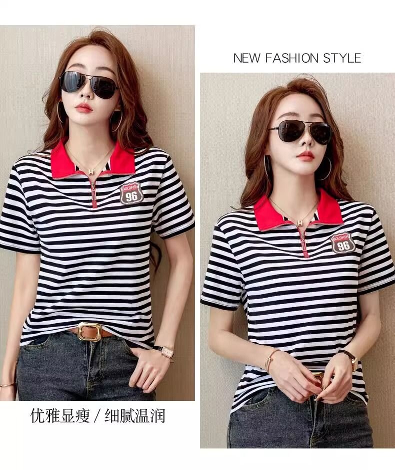RY1458# 棉95氨纶5时尚休闲撞色翻领短袖夏季新款百搭拉链立领条纹t恤