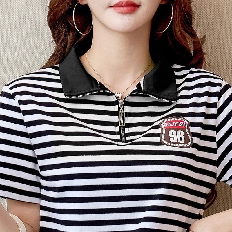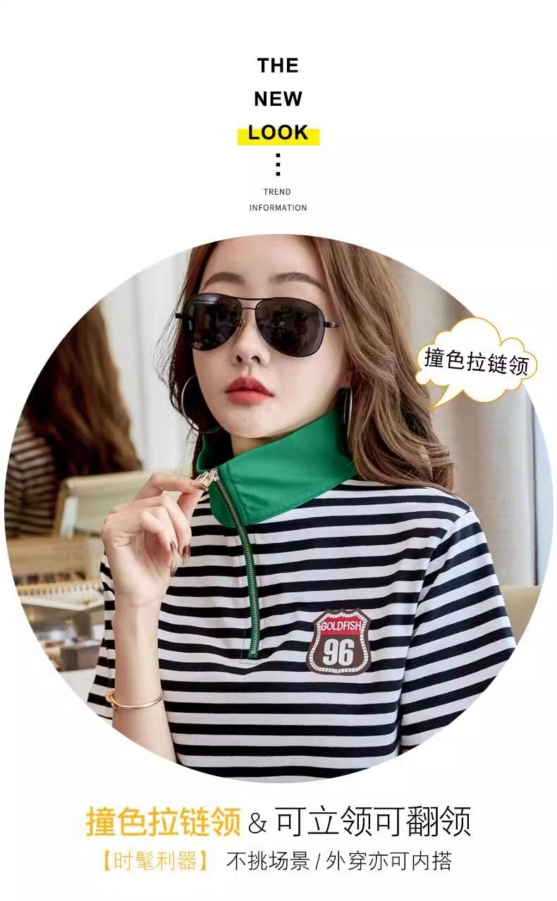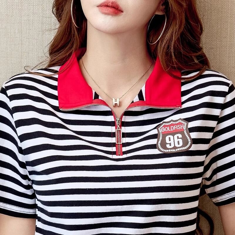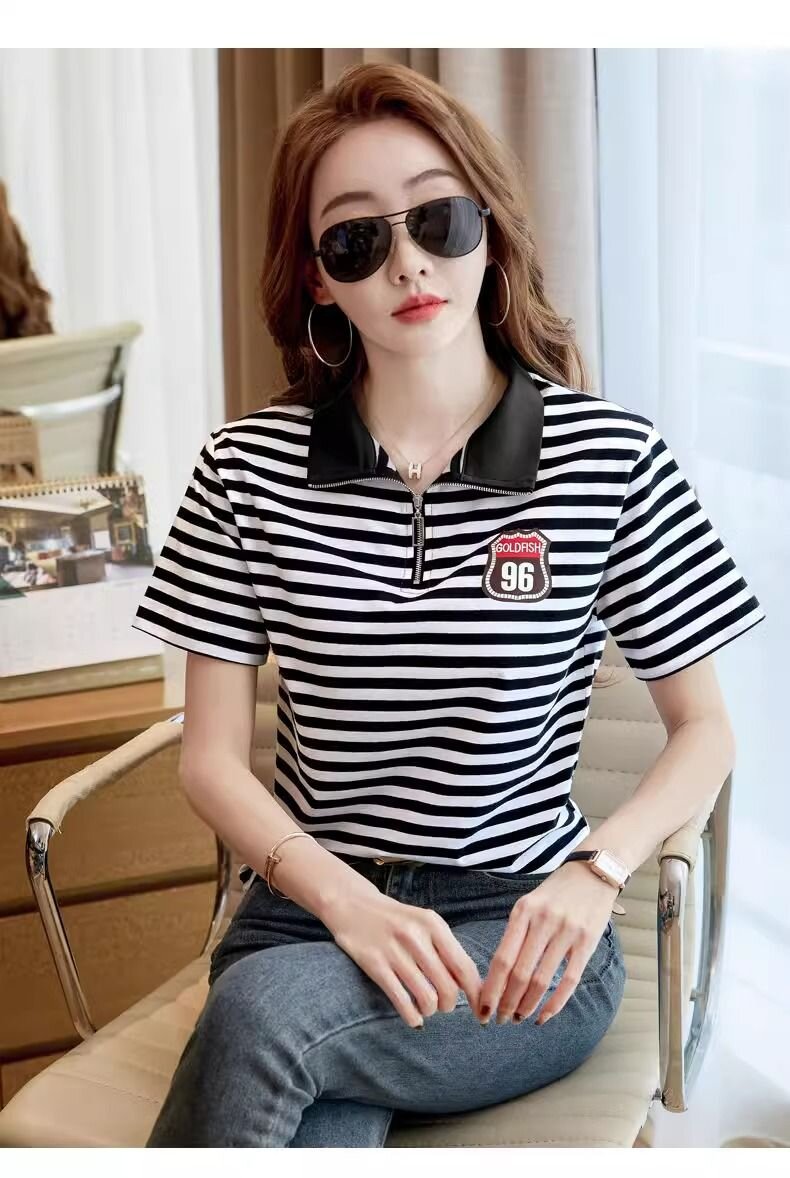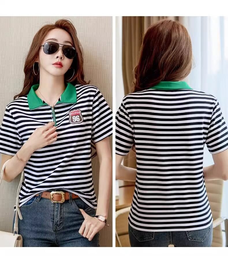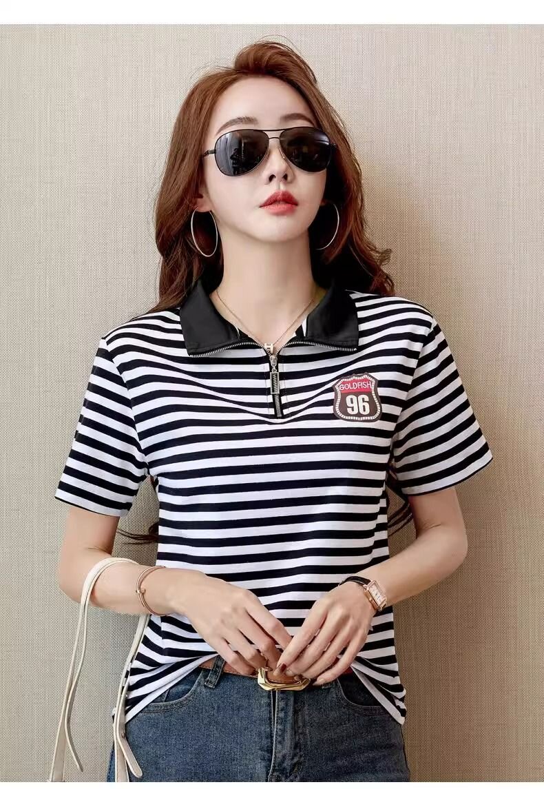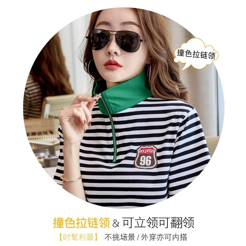 RY1458# 棉95氨纶5时尚休闲撞色翻领短袖夏季新款百搭拉链立领条纹t恤