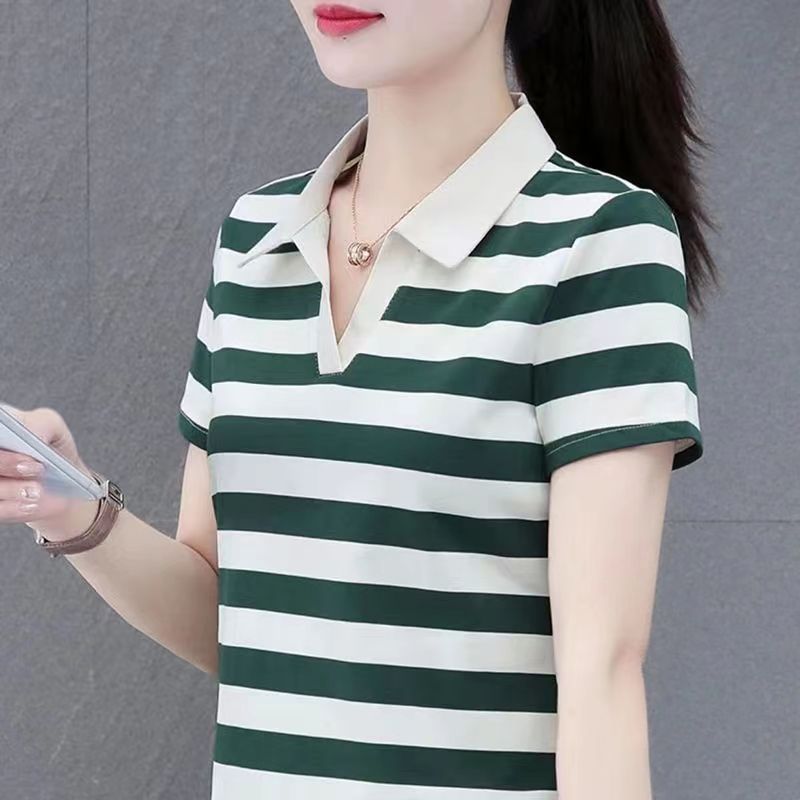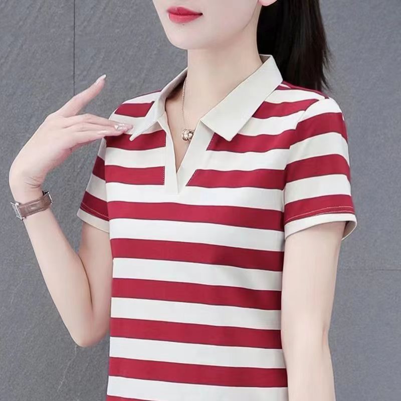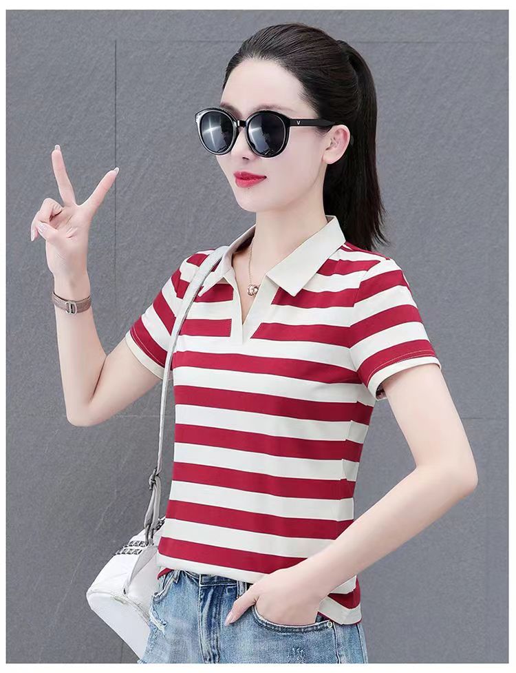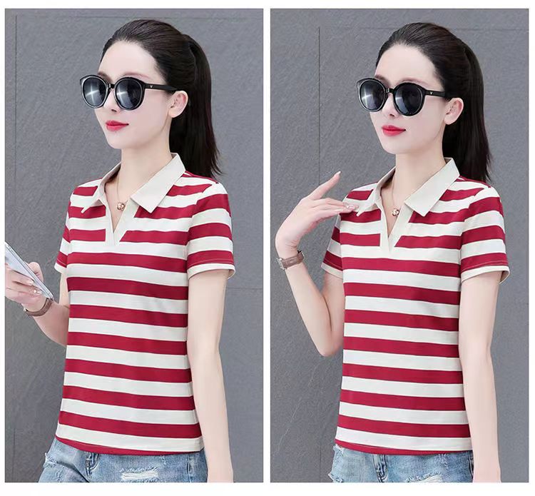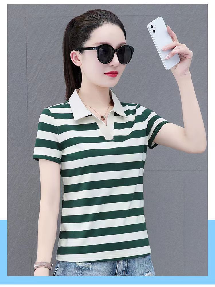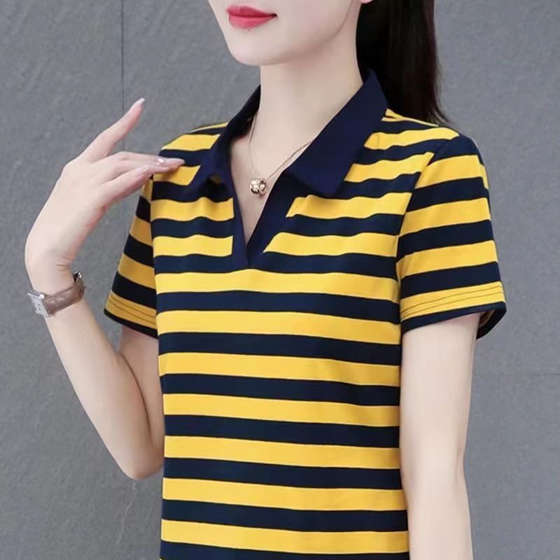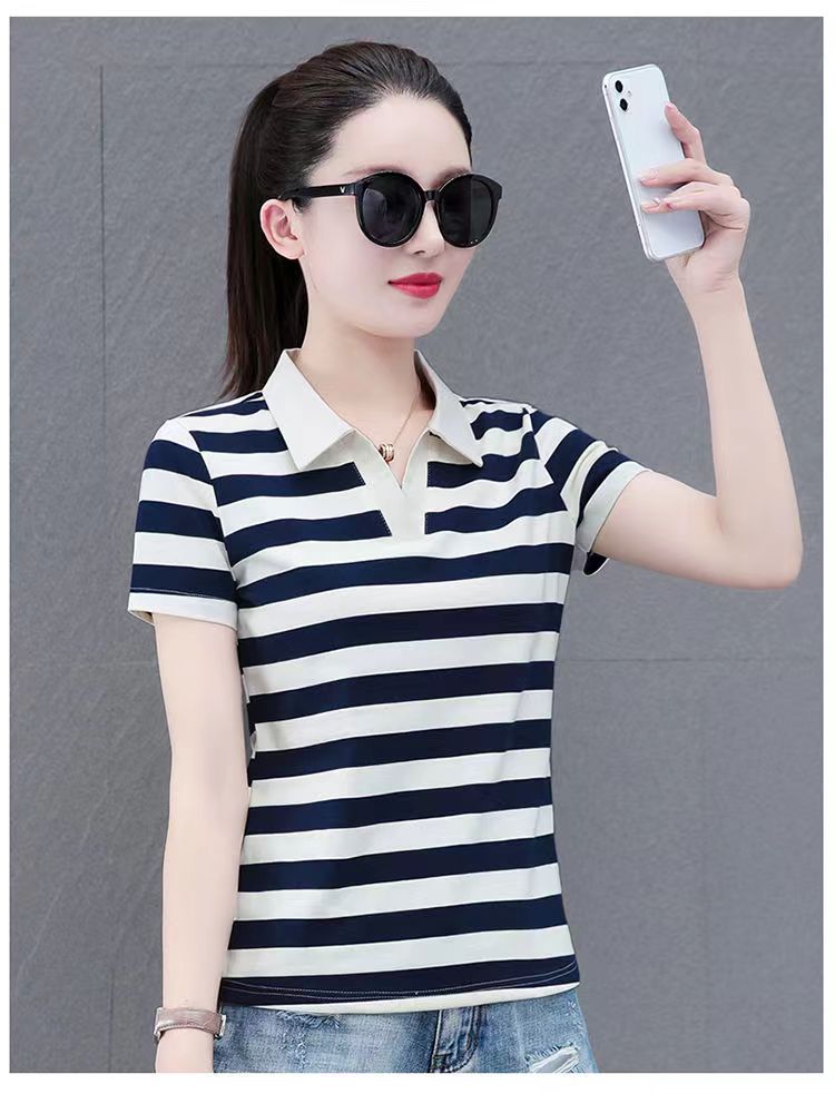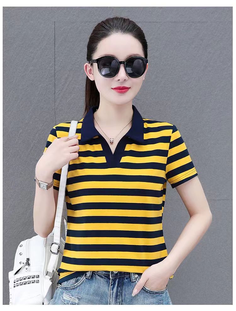 RY1462# 纯棉夏季潮流百搭时尚拼接撞色条纹短袖2024新款POLO翻领显瘦t恤