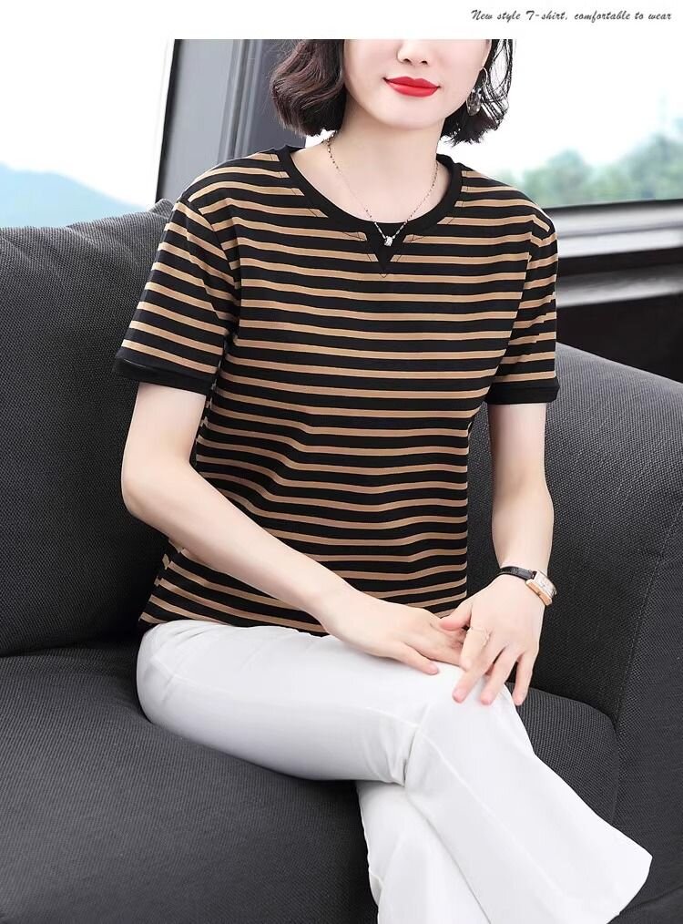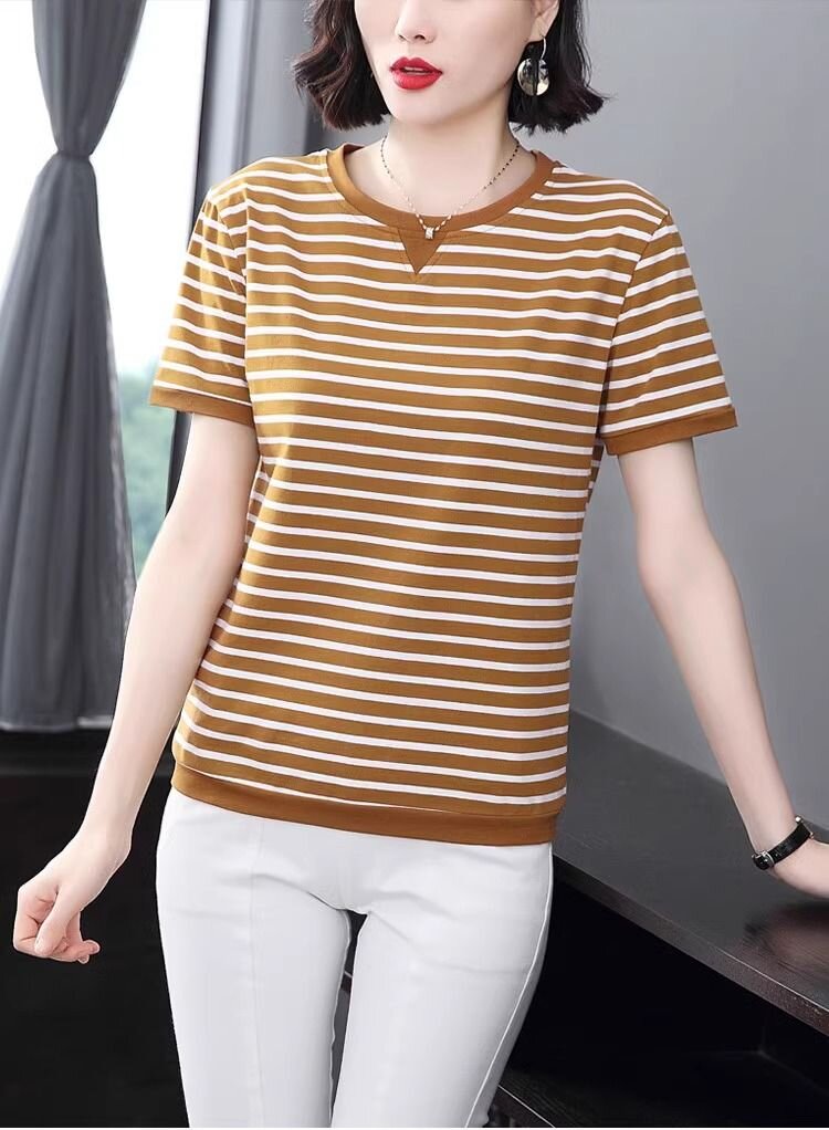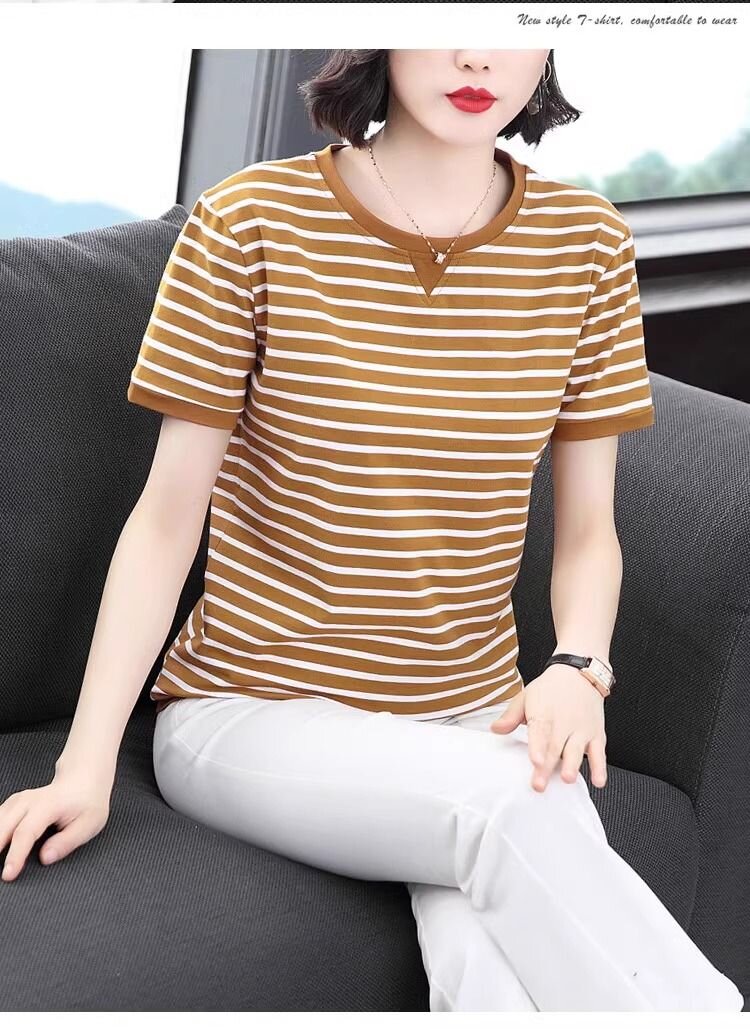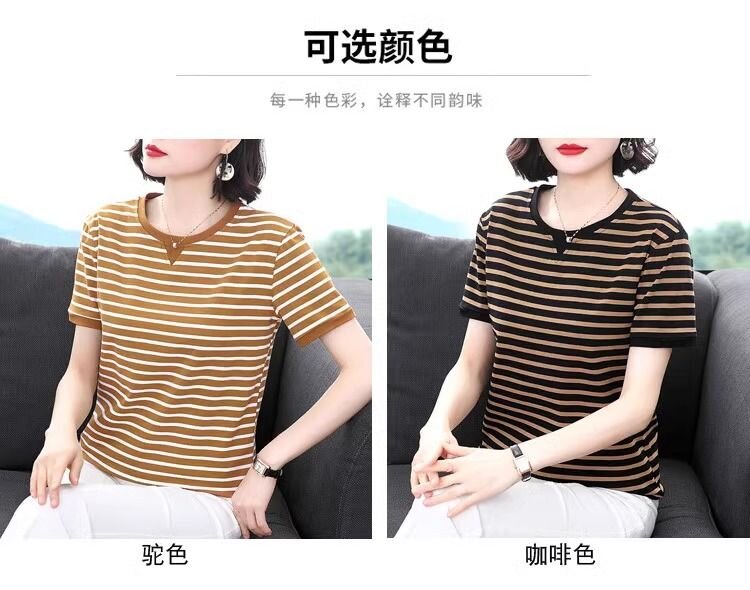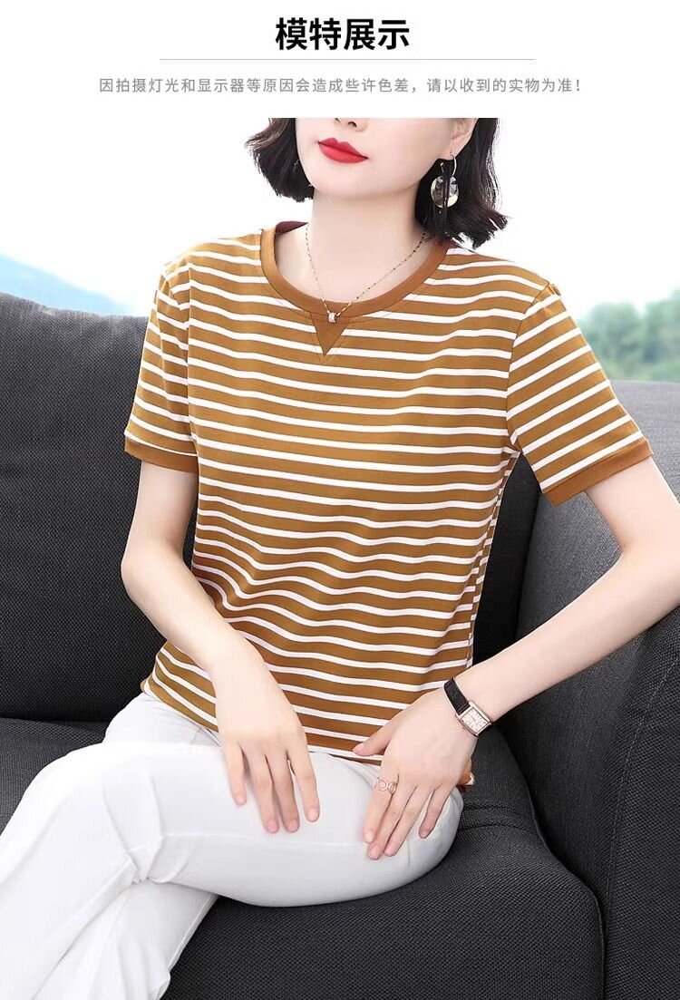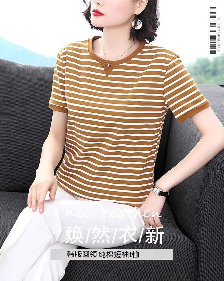 RY1464# 纯棉夏季百搭拼色条纹圆领T恤女士潮流时尚休闲通勤穿搭显瘦短袖