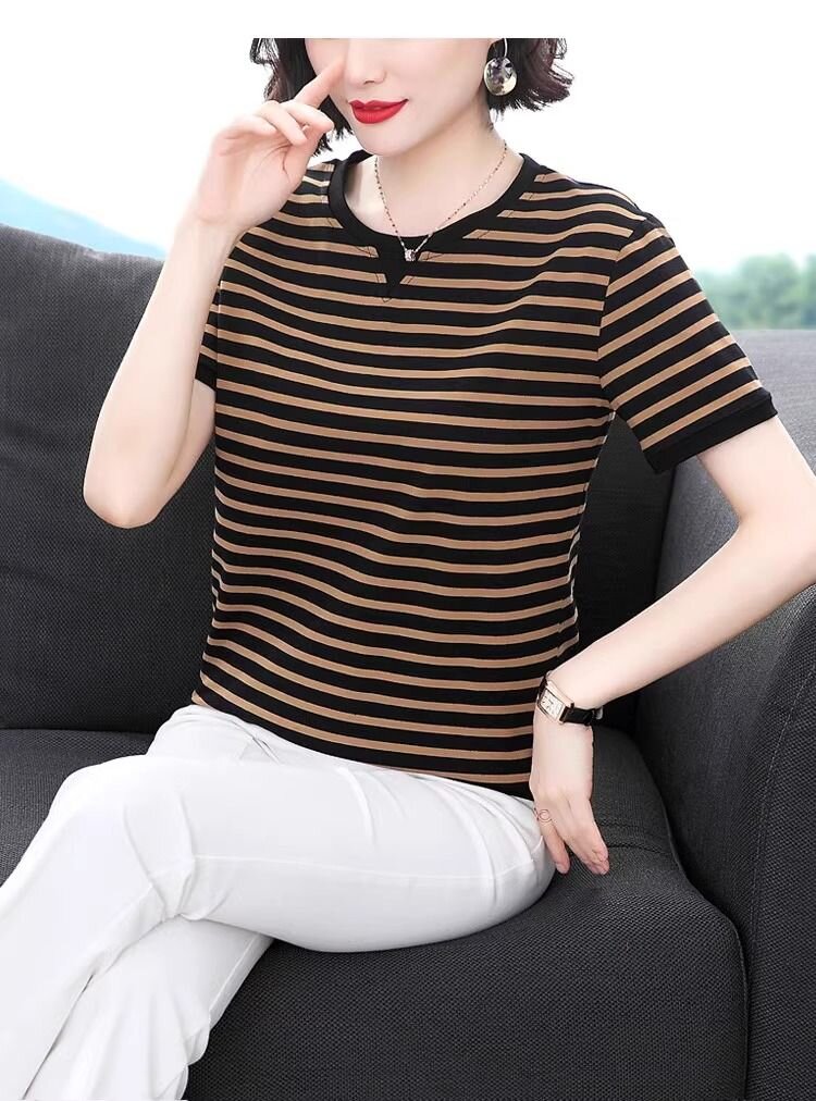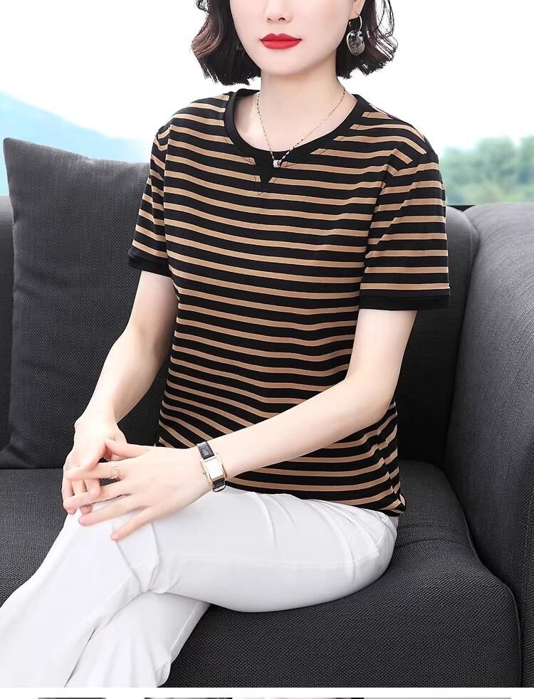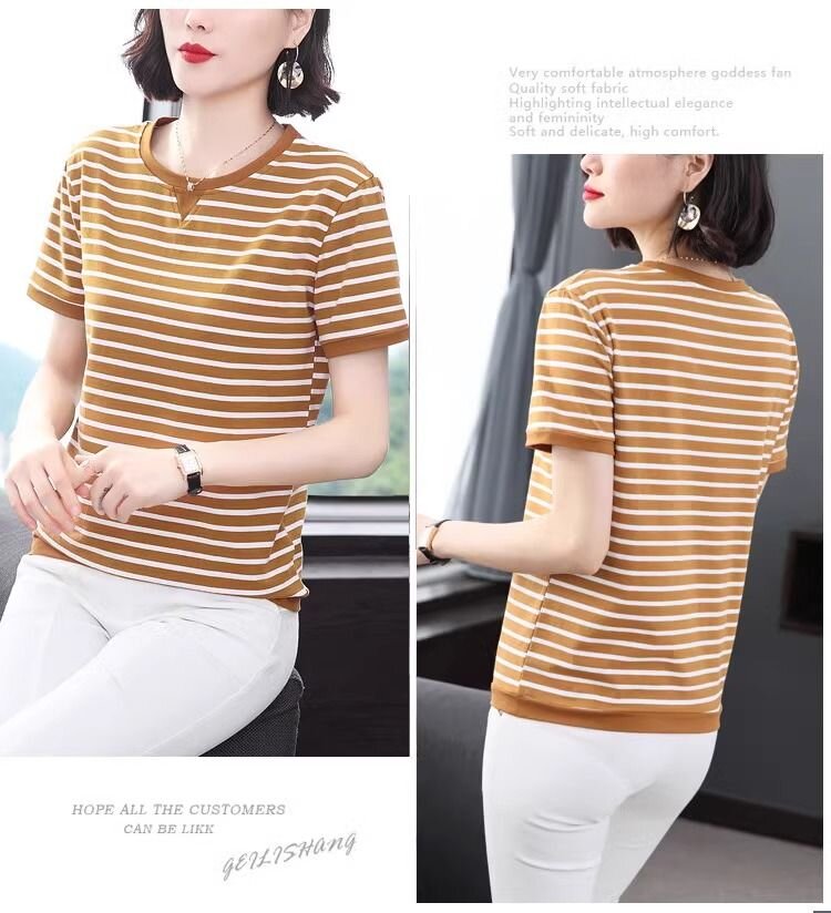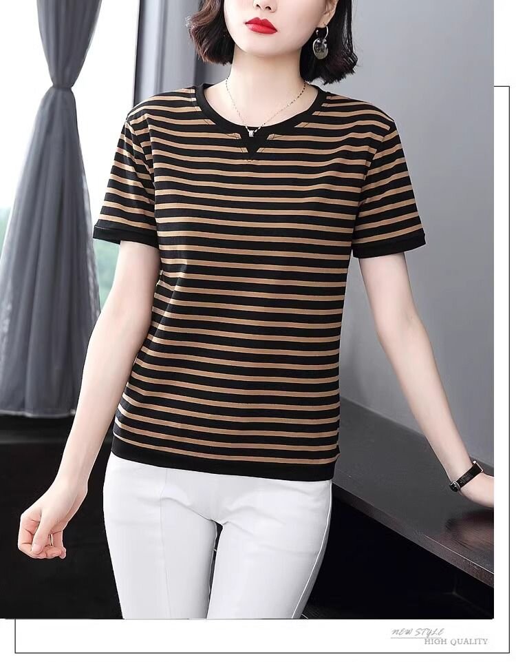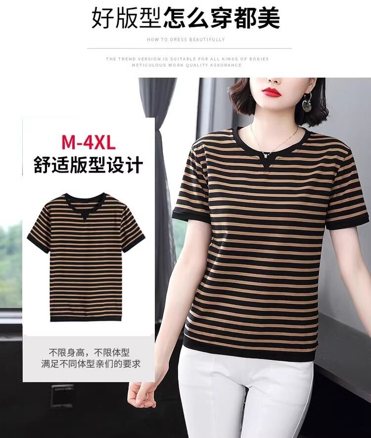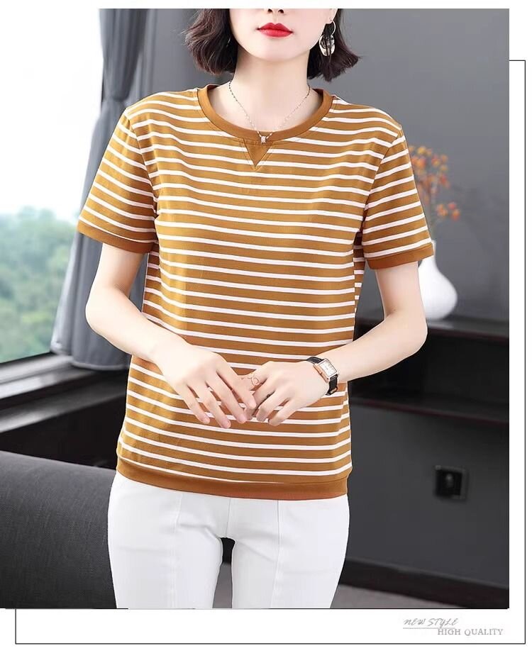 RY1464# 纯棉夏季百搭拼色条纹圆领T恤女士潮流时尚休闲通勤穿搭显瘦短袖
