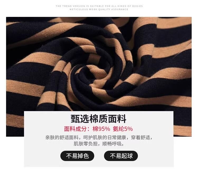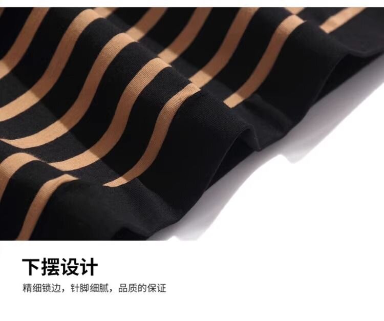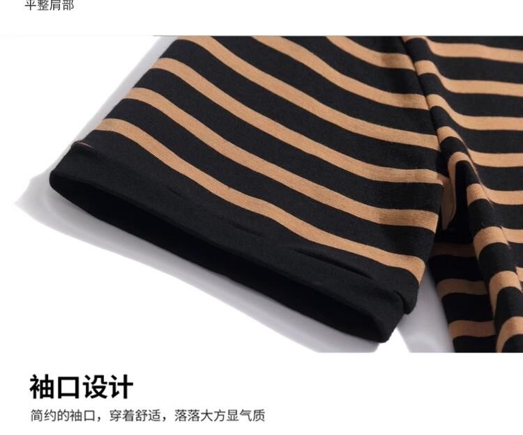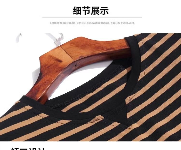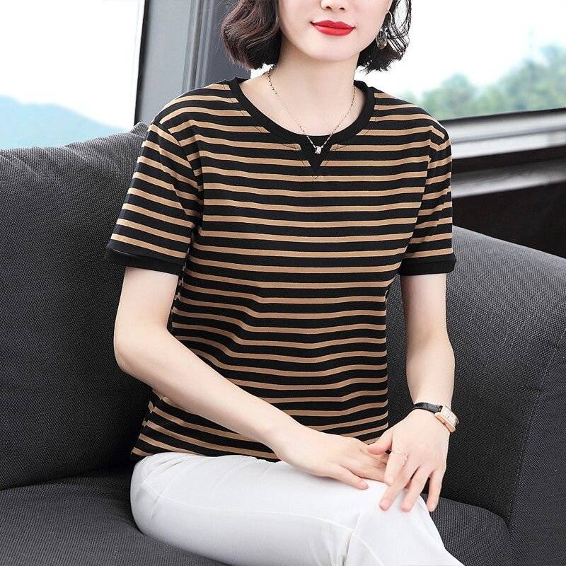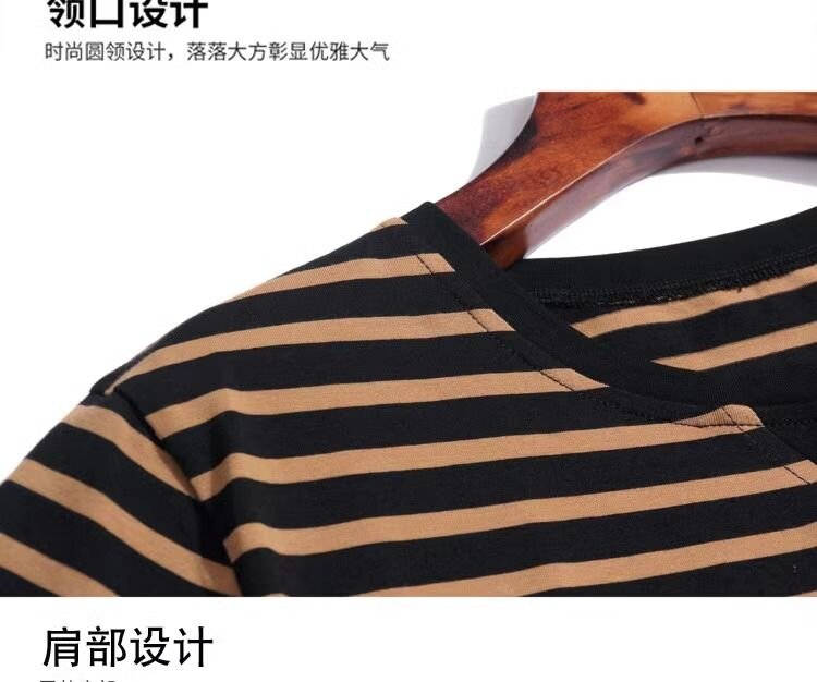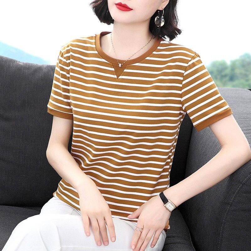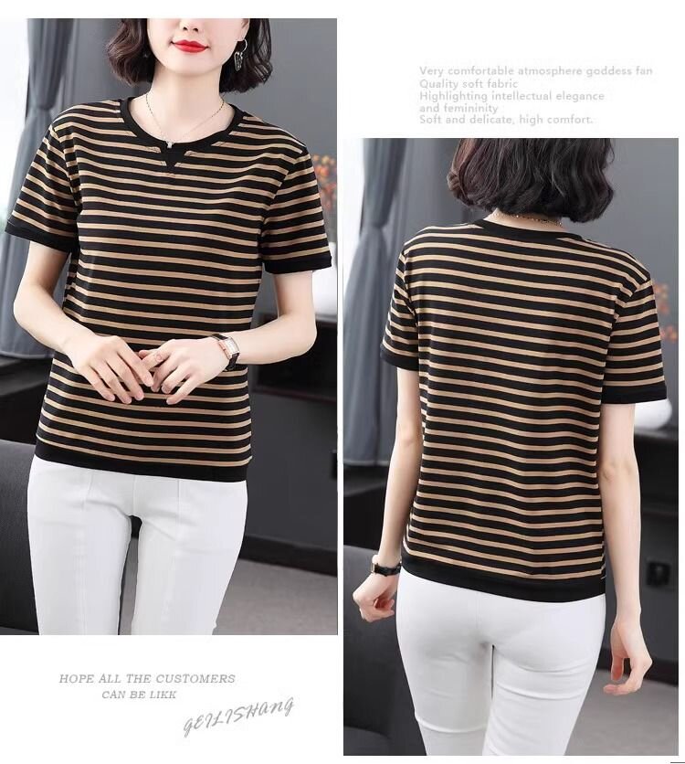 RY1464# 纯棉夏季百搭拼色条纹圆领T恤女士潮流时尚休闲通勤穿搭显瘦短袖