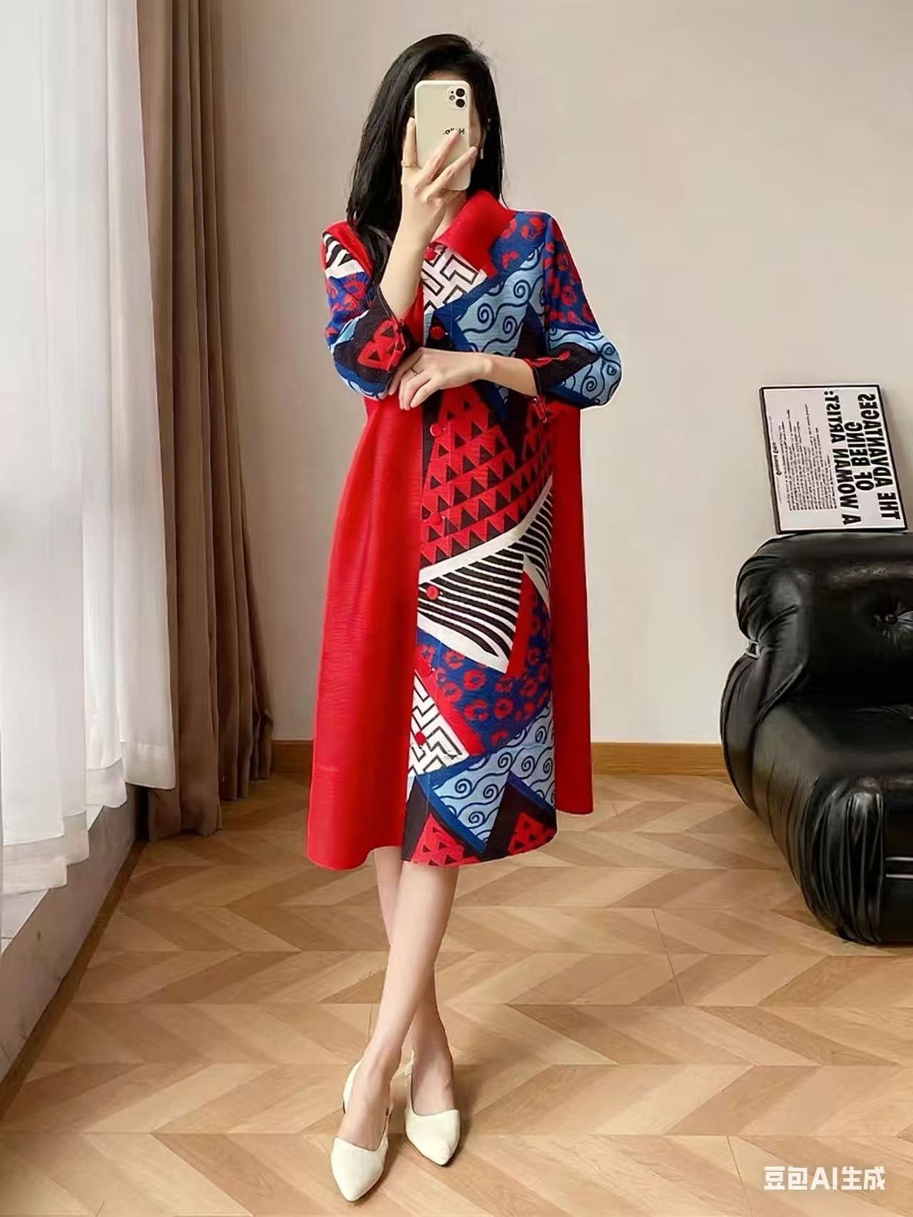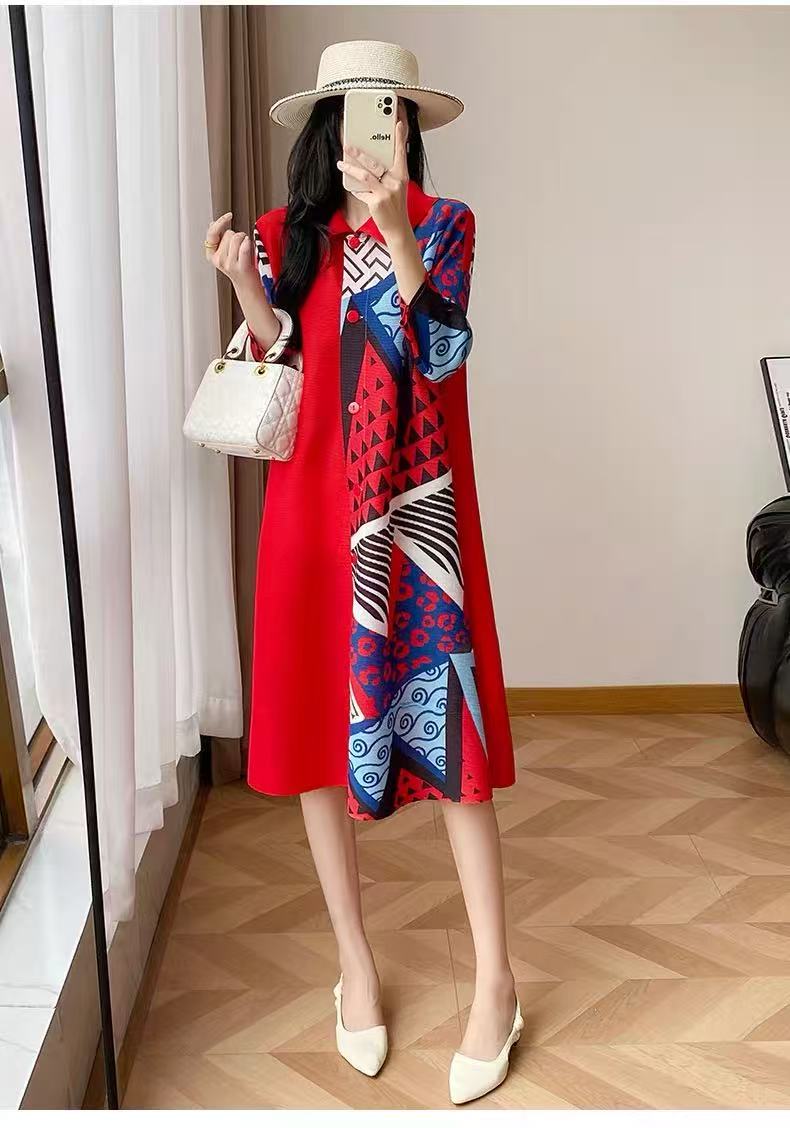 RY1496# 高端褶皱连衣裙2026春秋新款气质大码印花宽松衬衫a字开衫