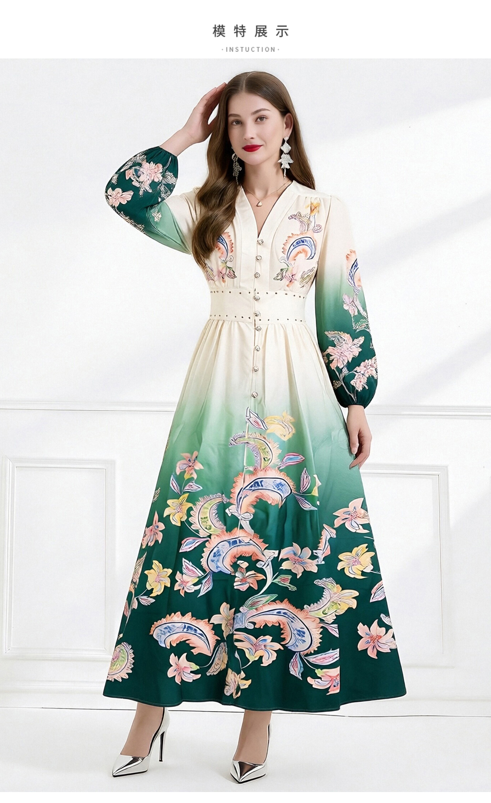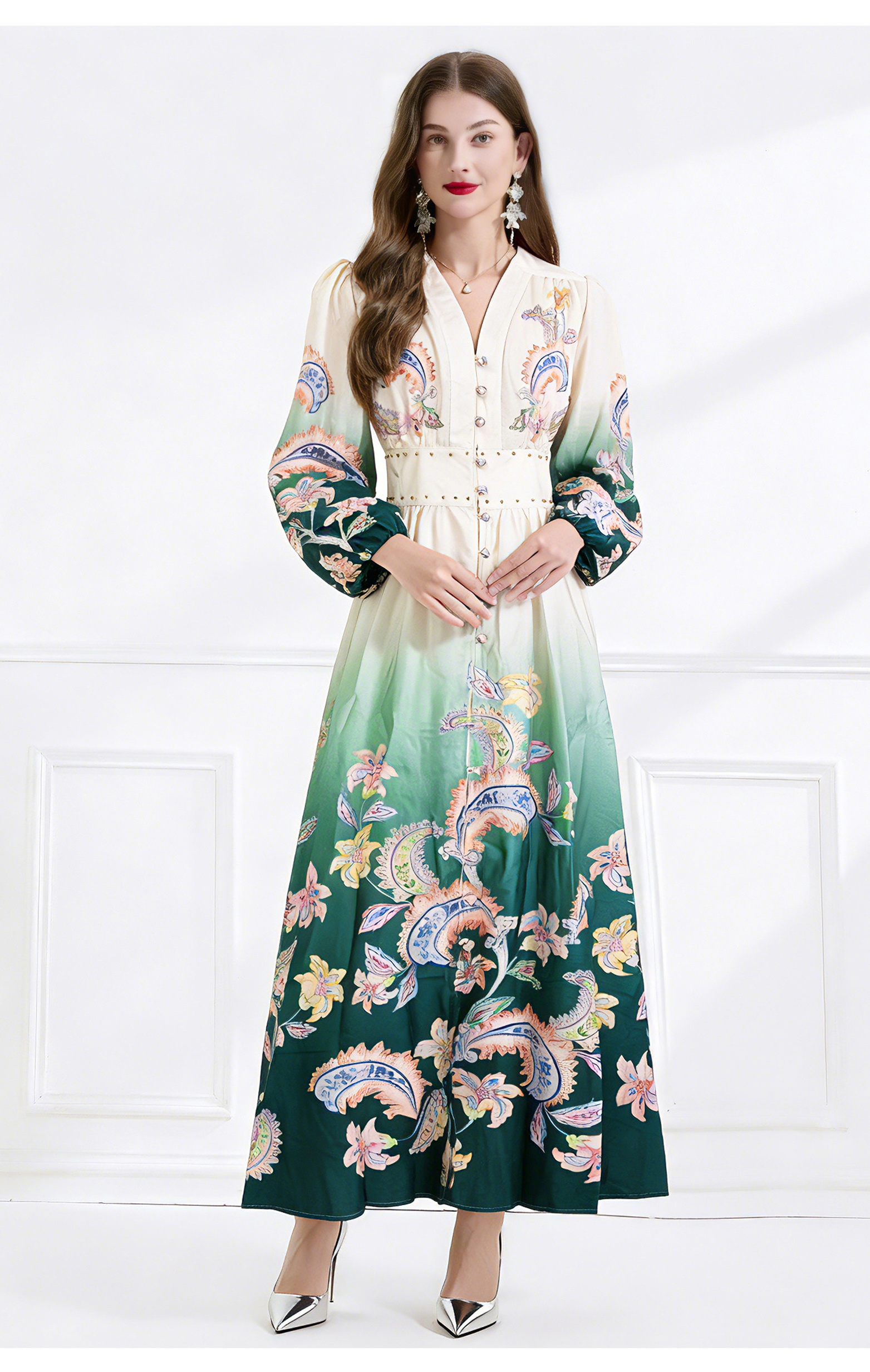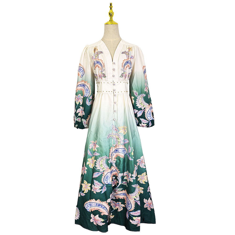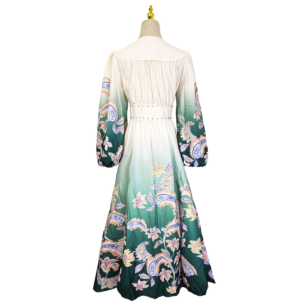 RY1518# NATALIYA 2026早春复古印花V领渐变灯笼袖收腰荷叶边裙
