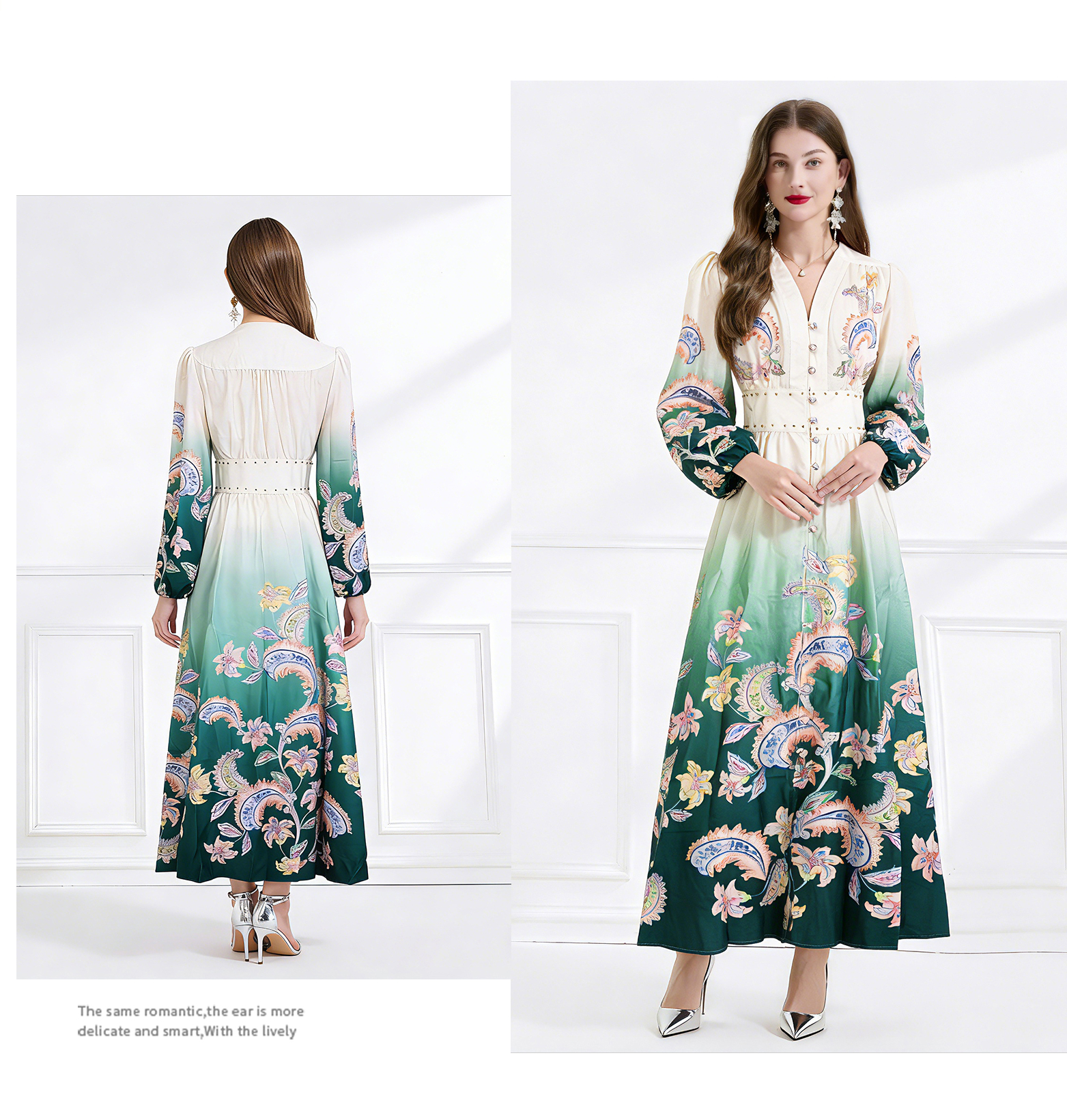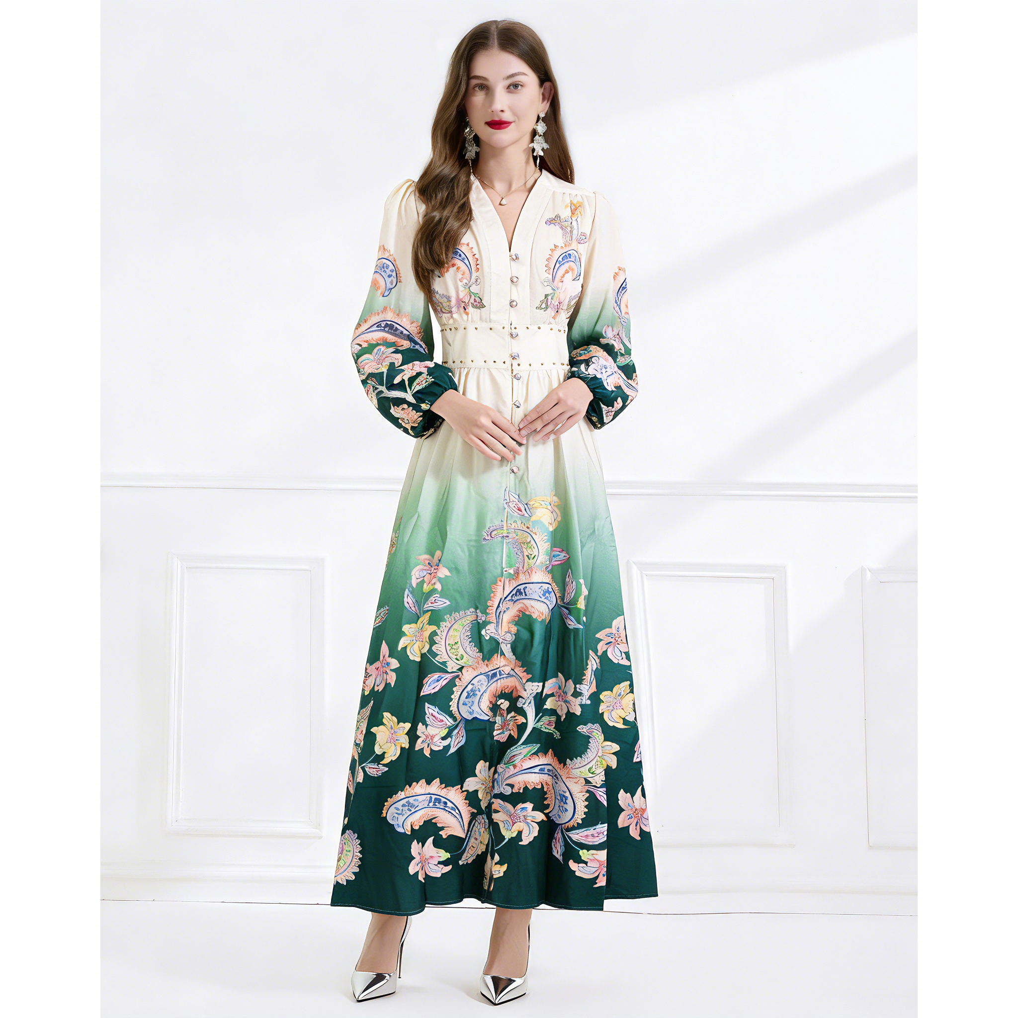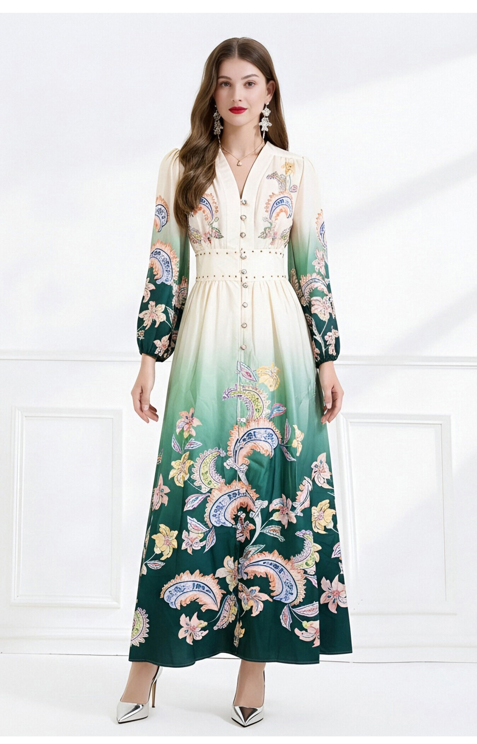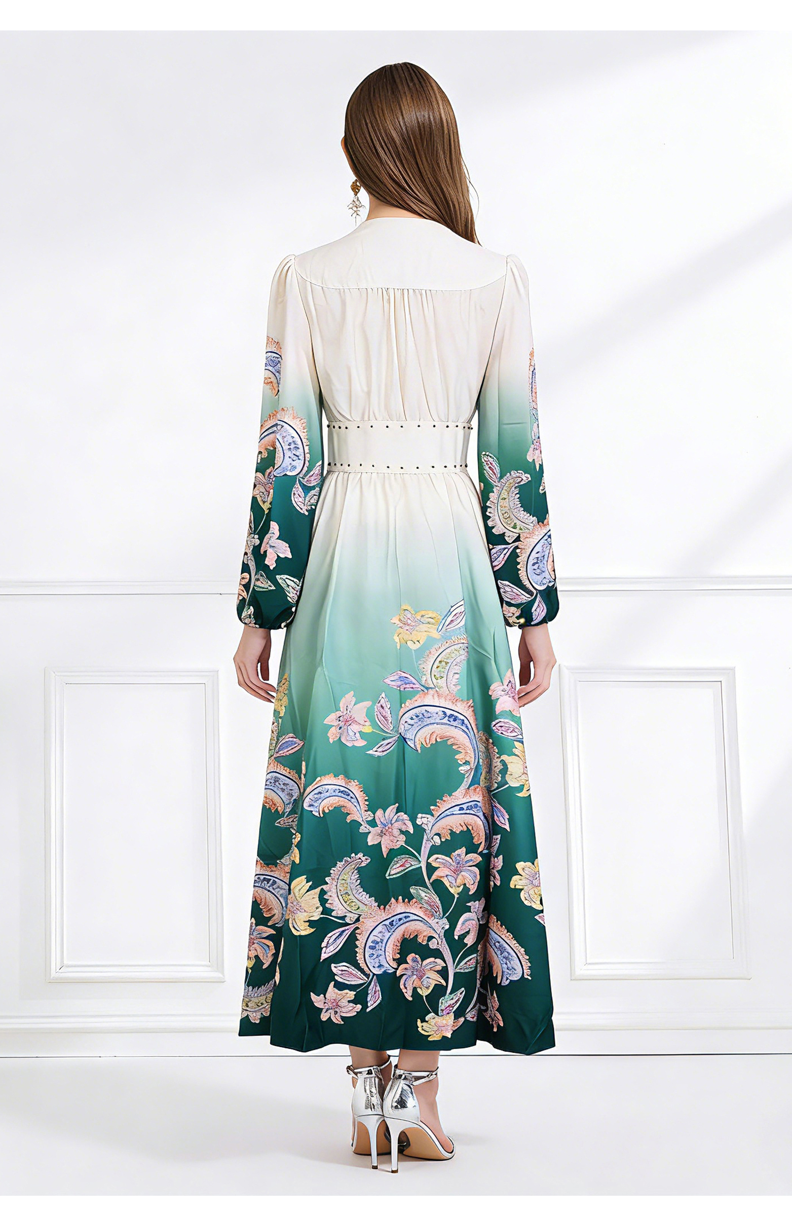 RY1518# NATALIYA 2026早春复古印花V领渐变灯笼袖收腰荷叶边裙