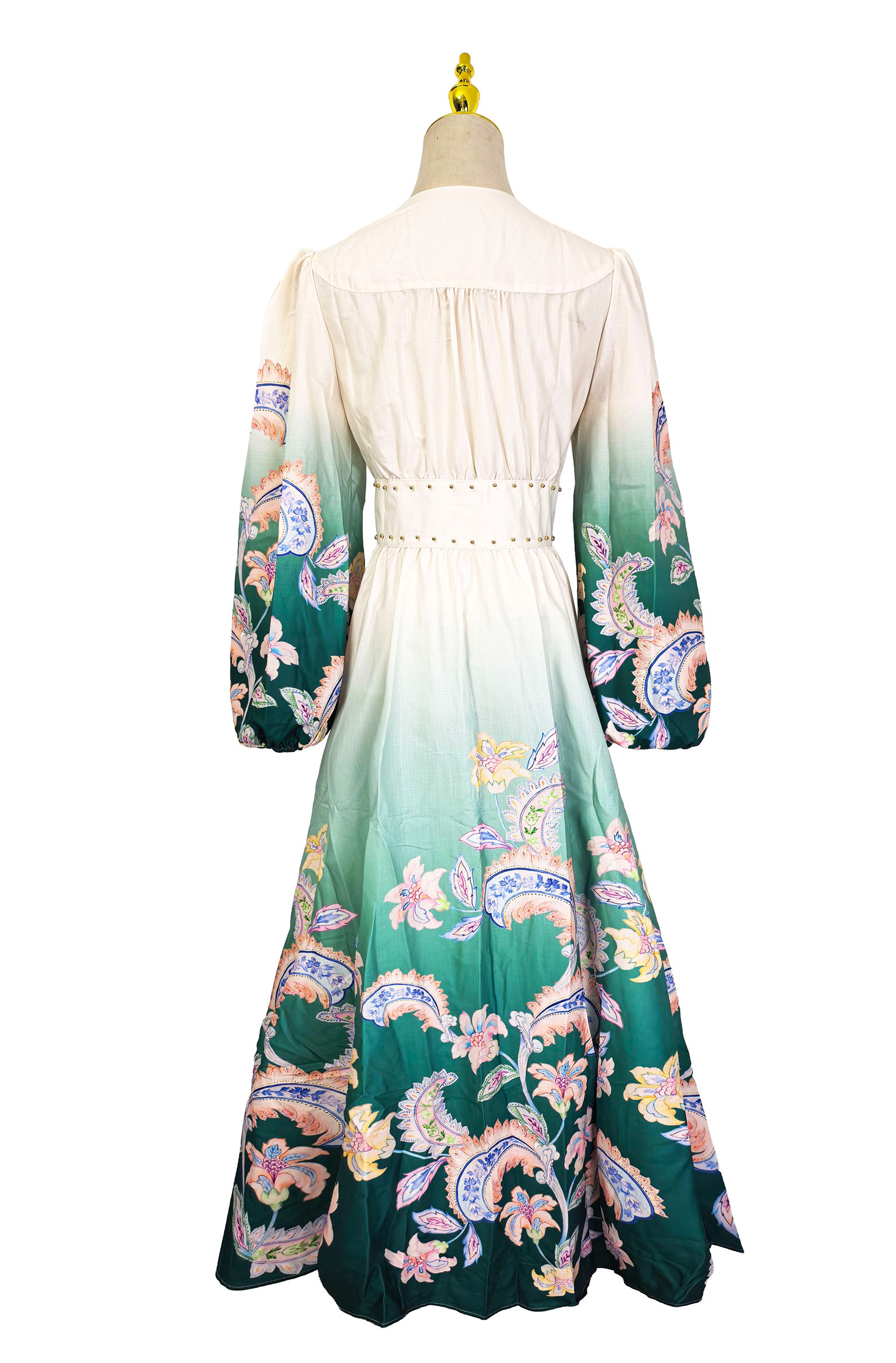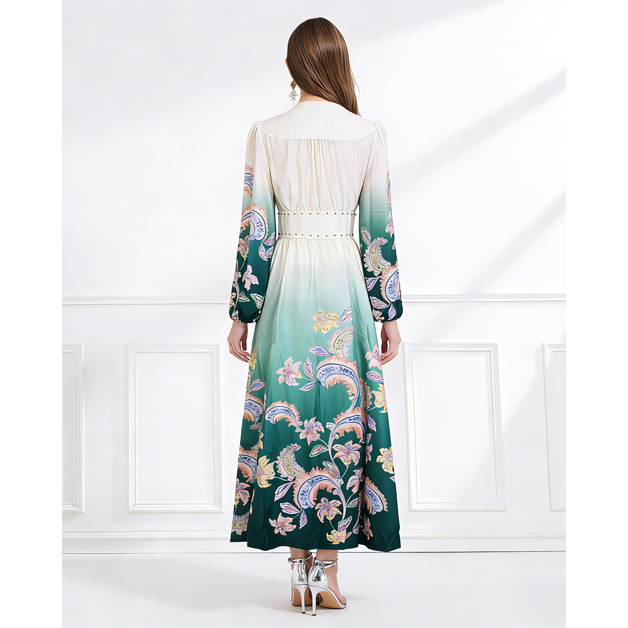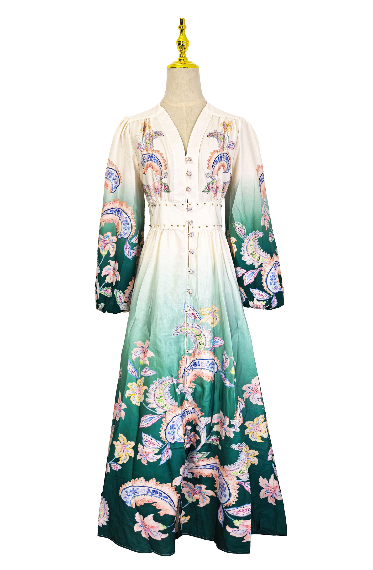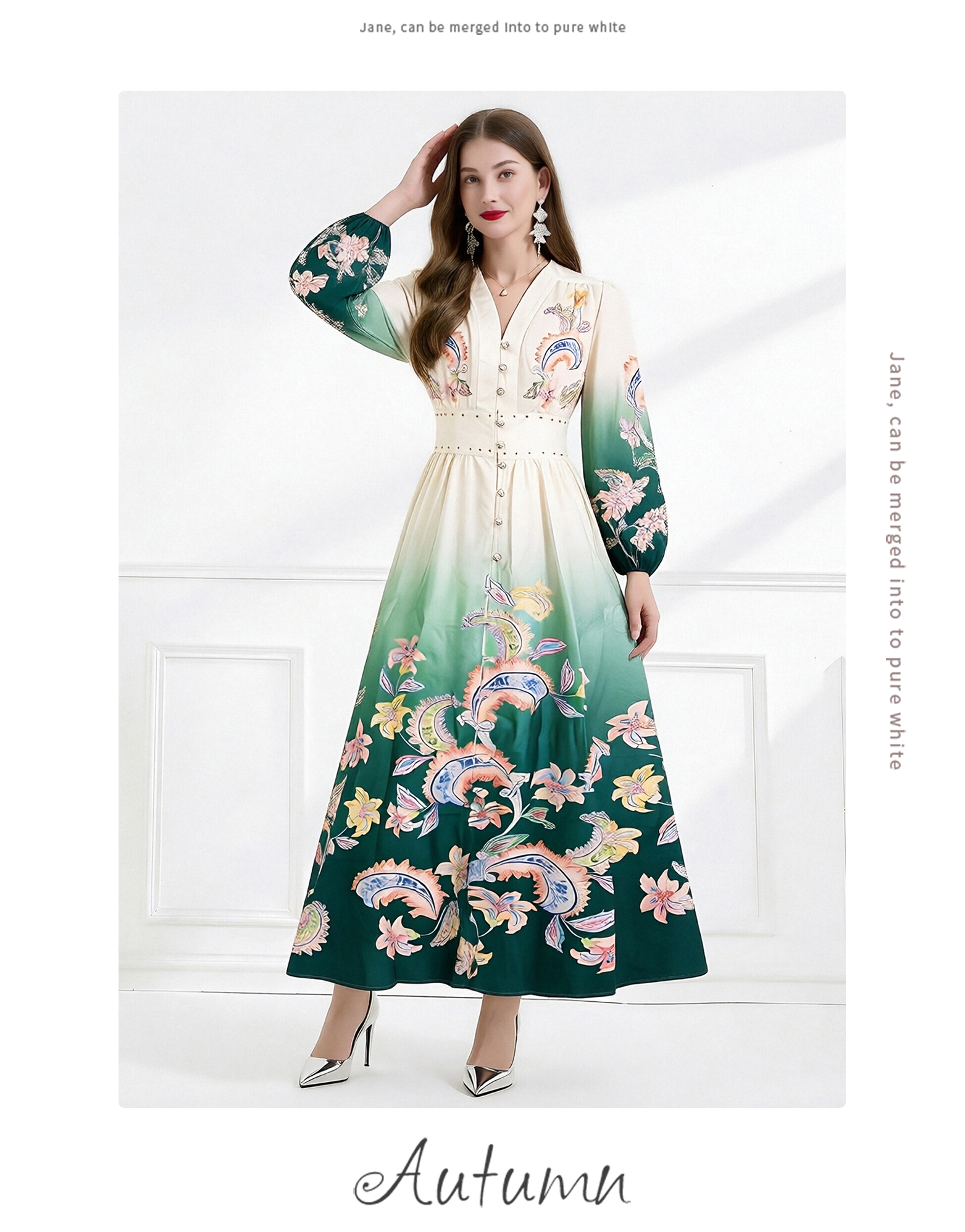 RY1518# NATALIYA 2026早春复古印花V领渐变灯笼袖收腰荷叶边裙