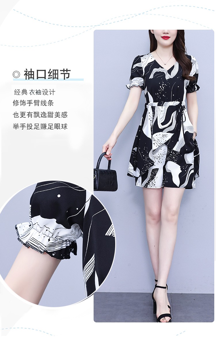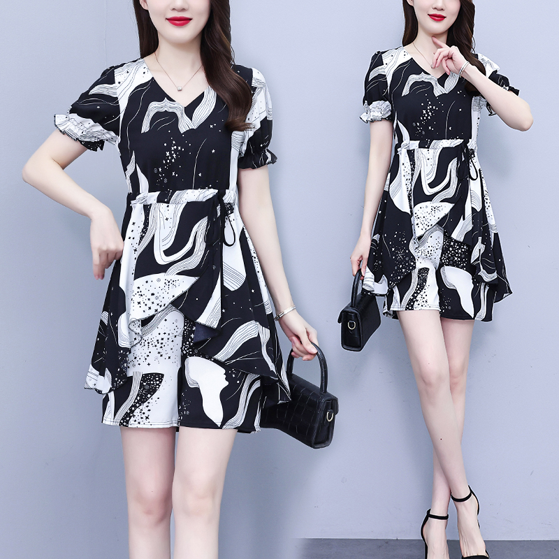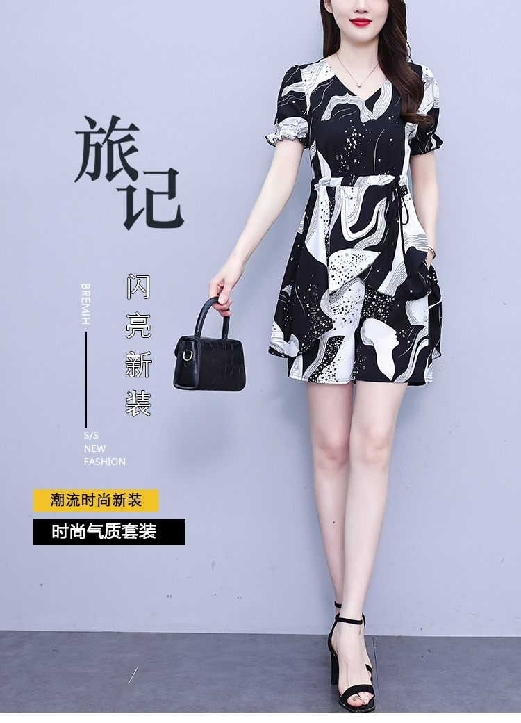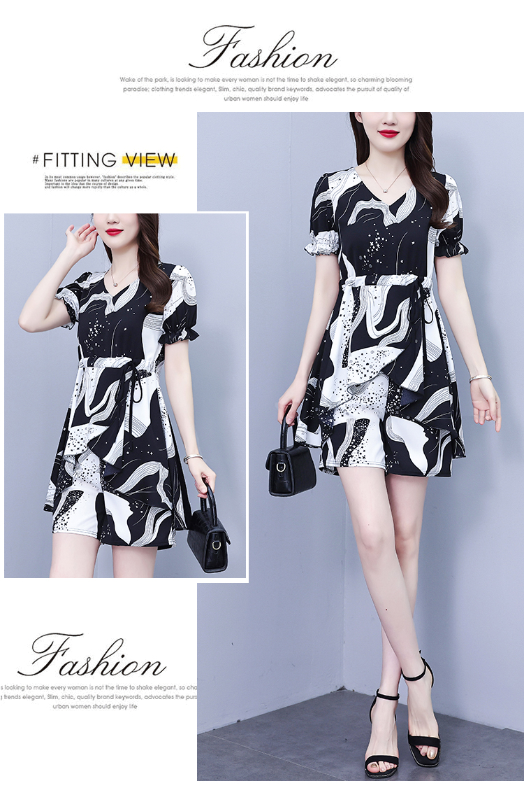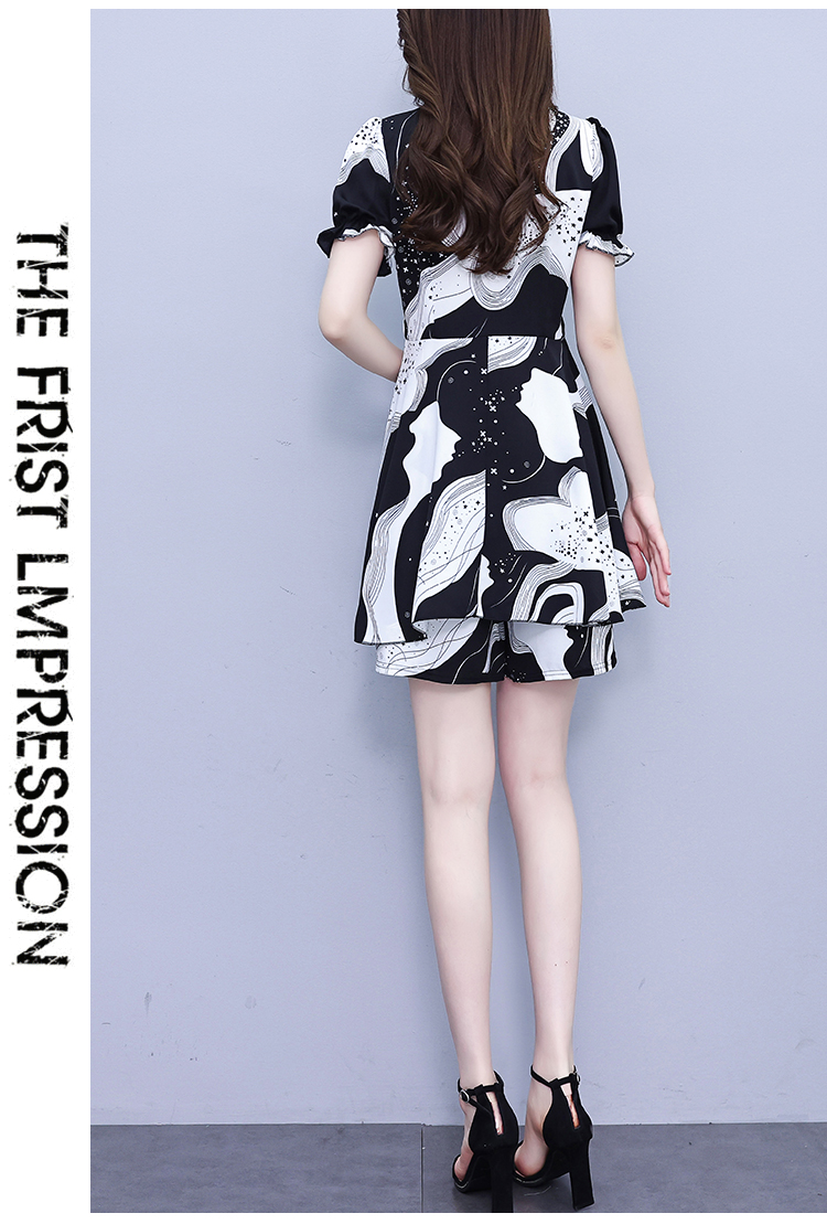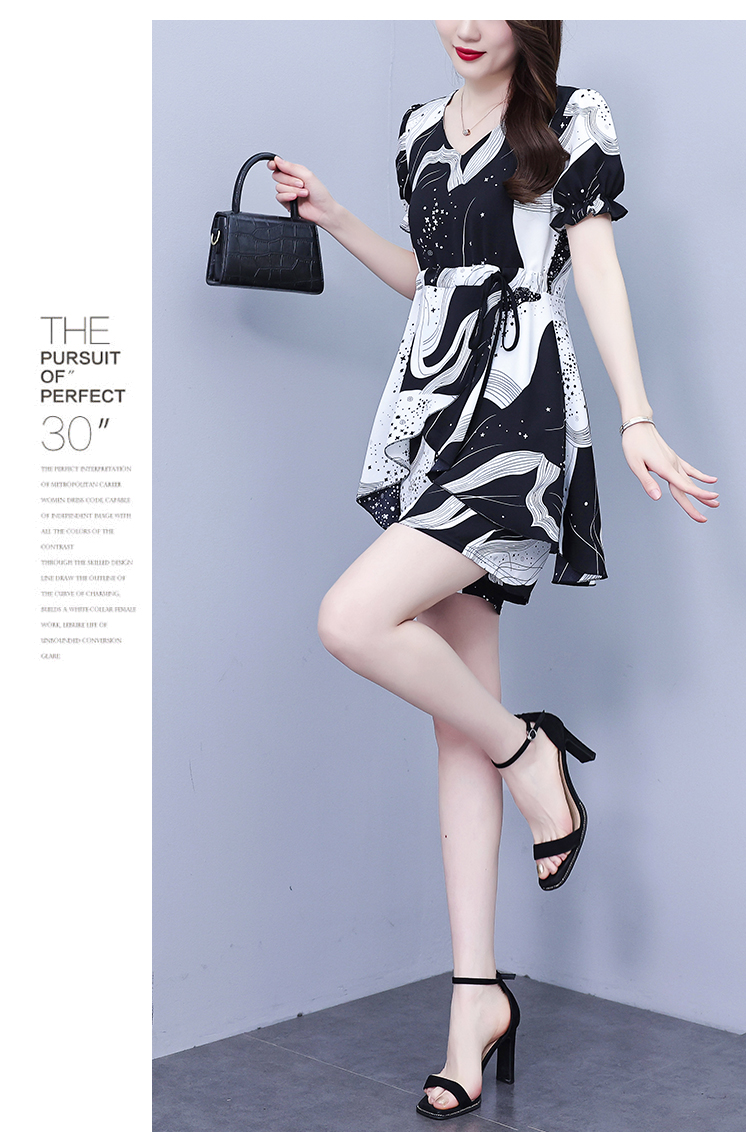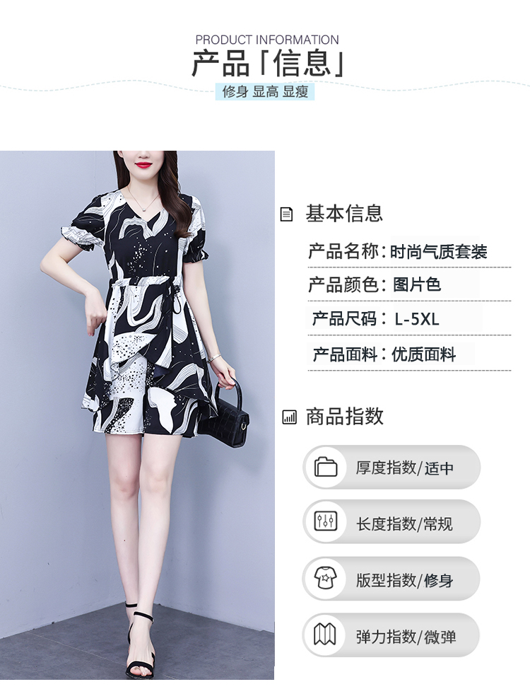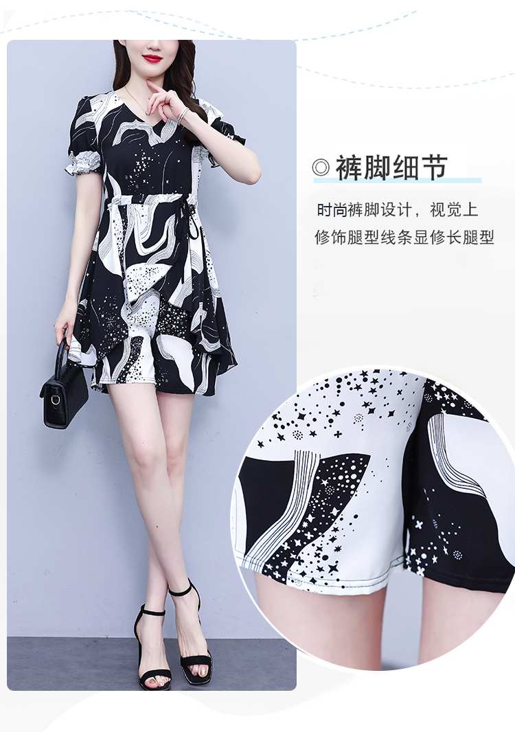 RY1556# 大码女装2026夏季V领气质水墨印花显瘦时尚上衣+短裤两件套套装