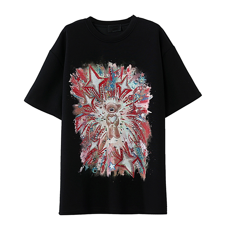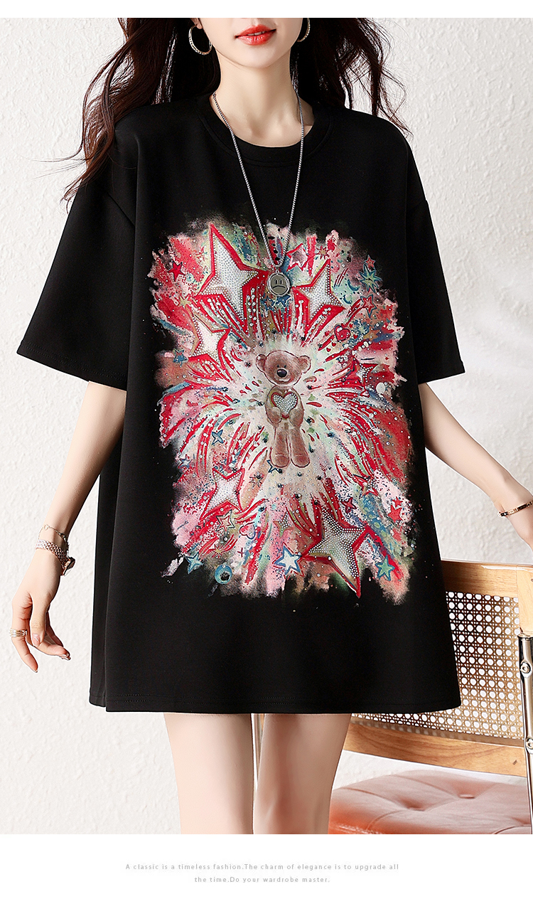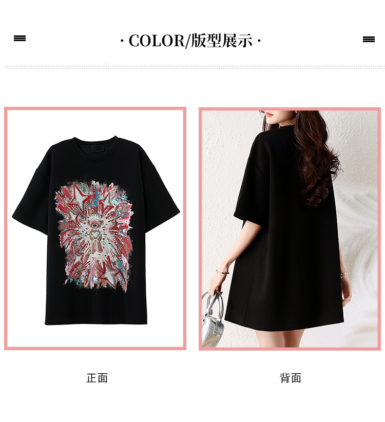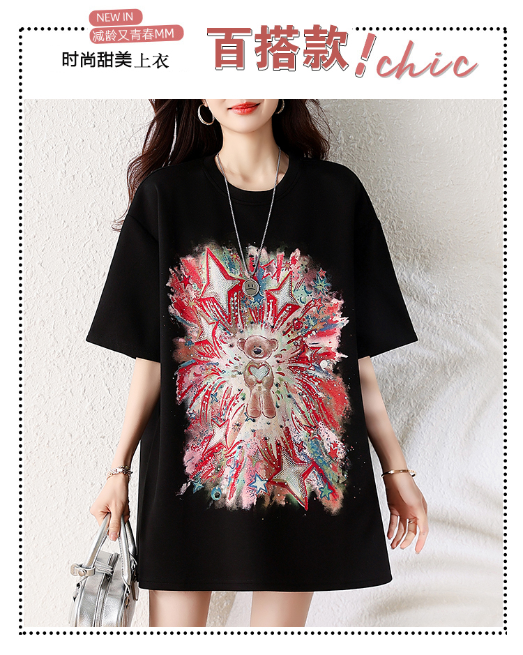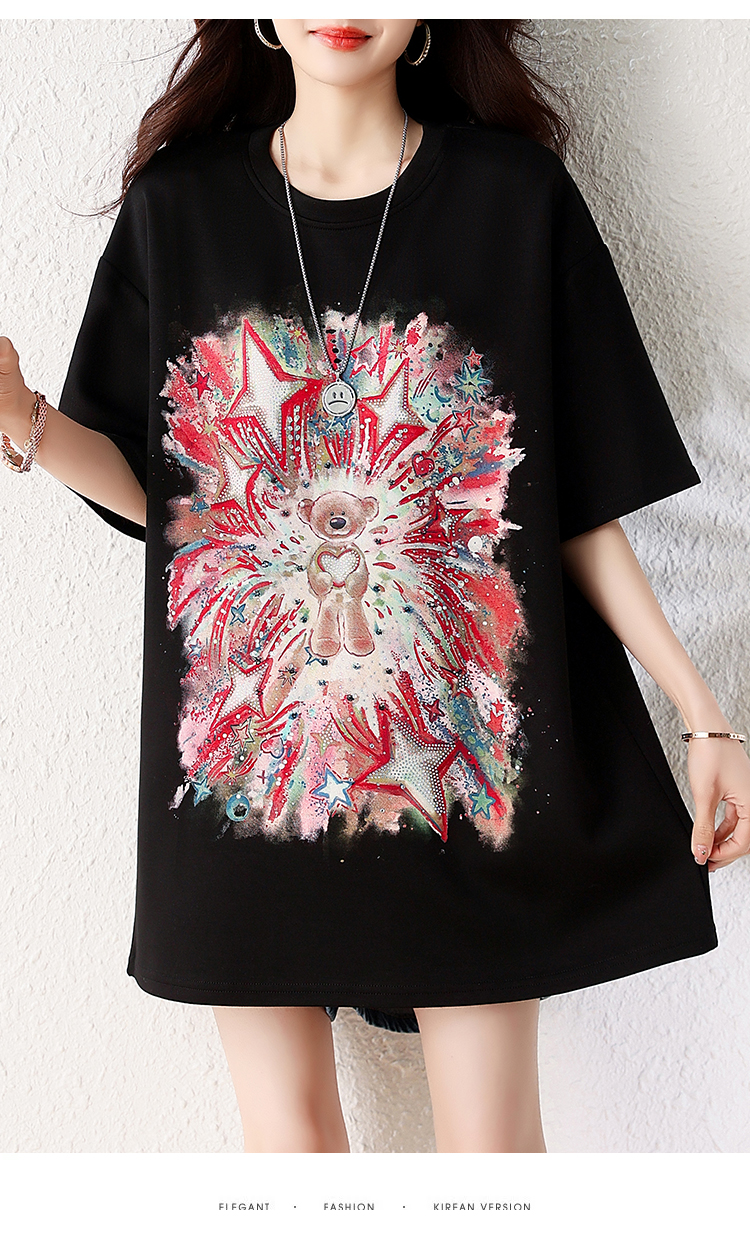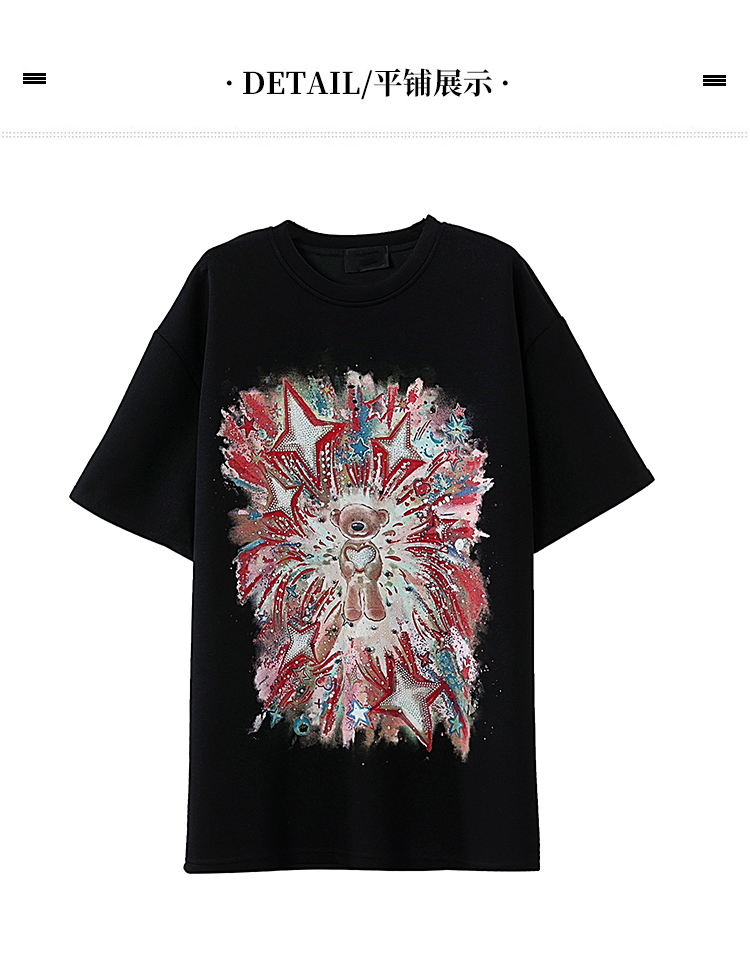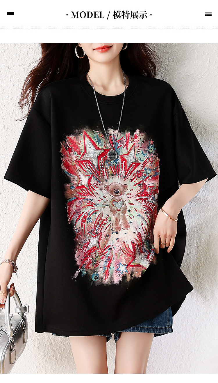RY1584# 实拍2026夏季爆款时尚重工插画宽烫钻宽松百搭显瘦短袖大码T恤女