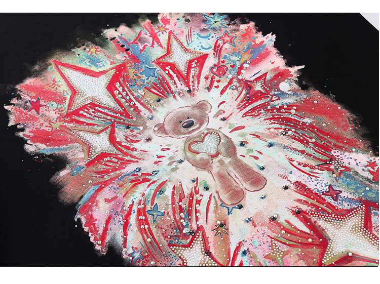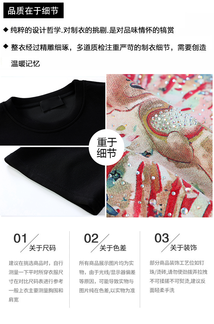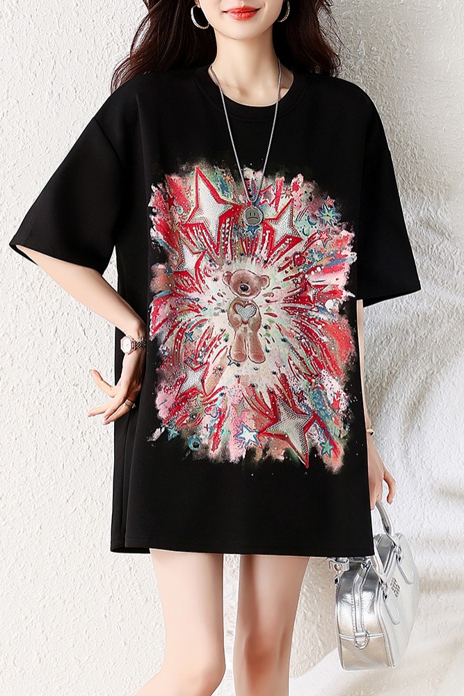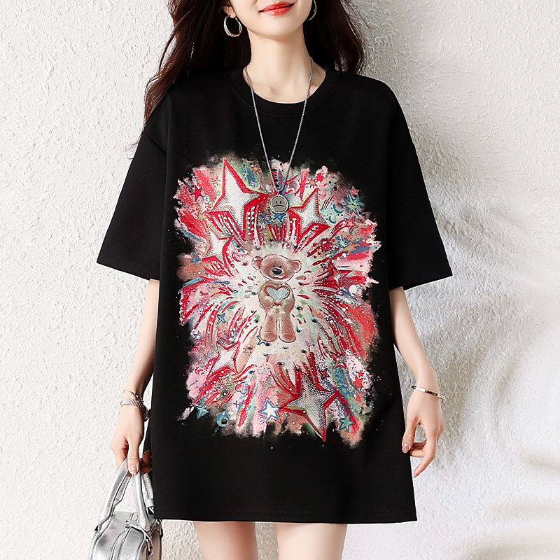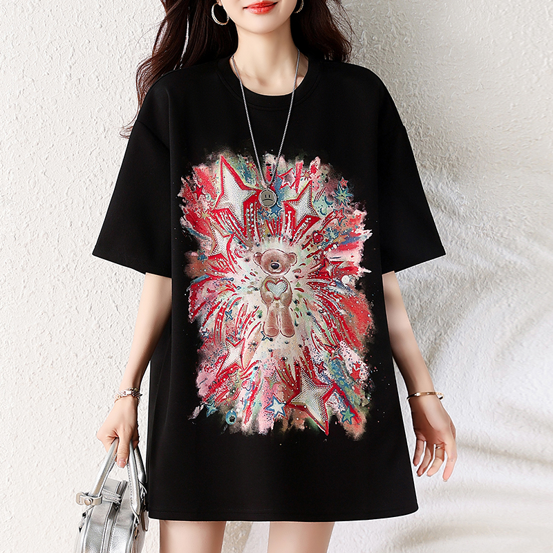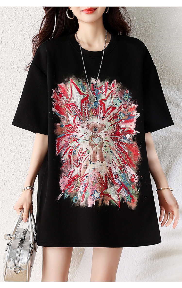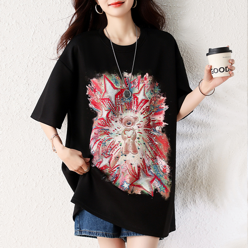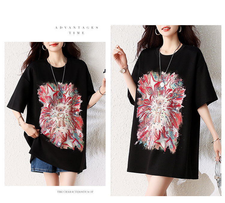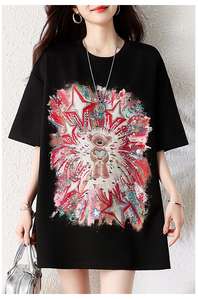 RY1584# 实拍2026夏季爆款时尚重工插画宽烫钻宽松百搭显瘦短袖大码T恤女