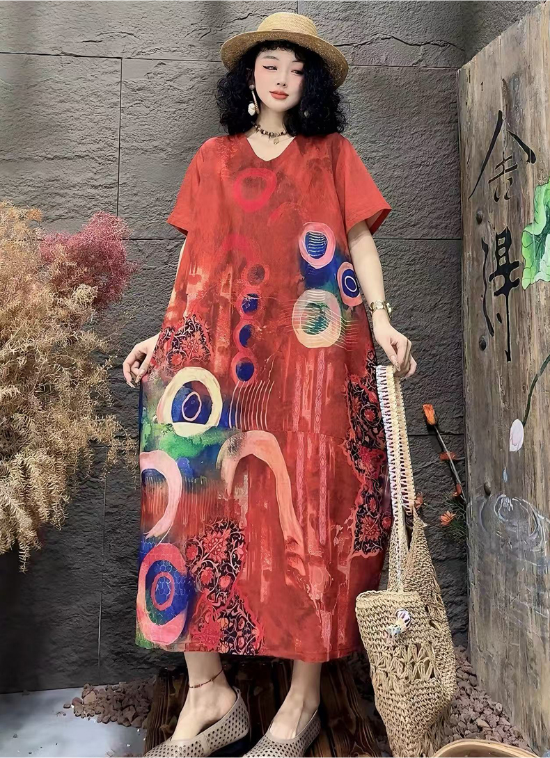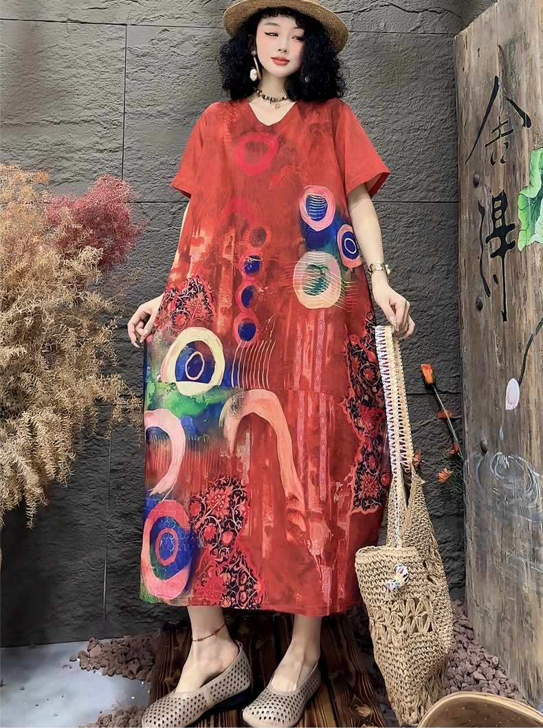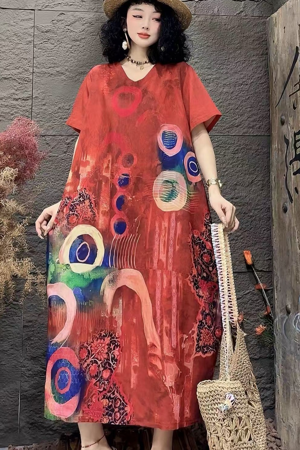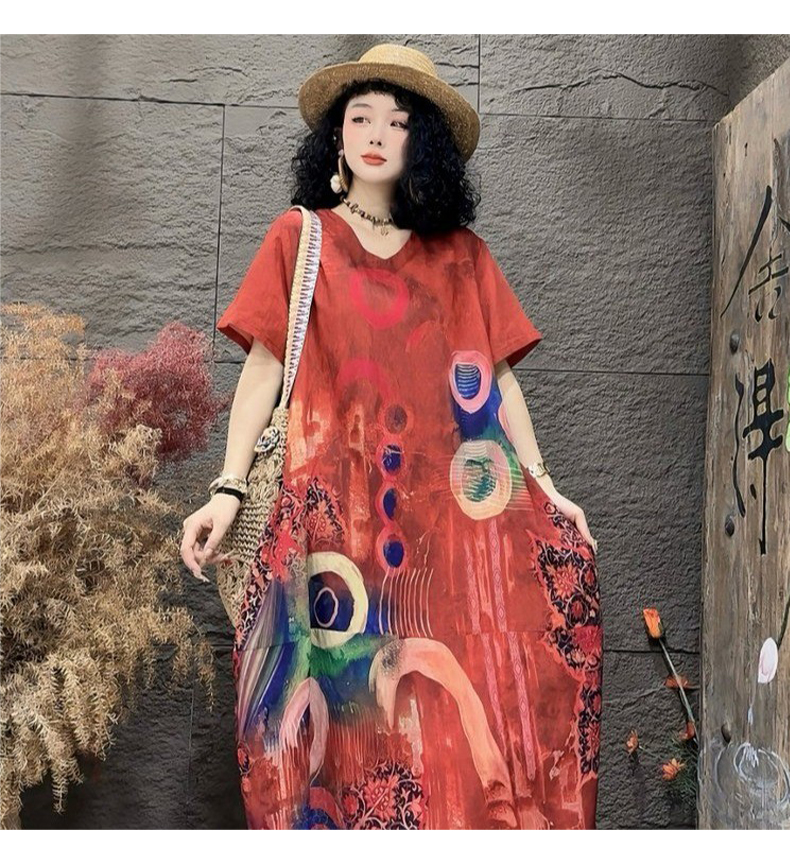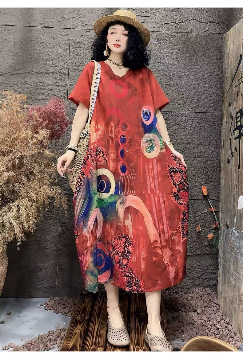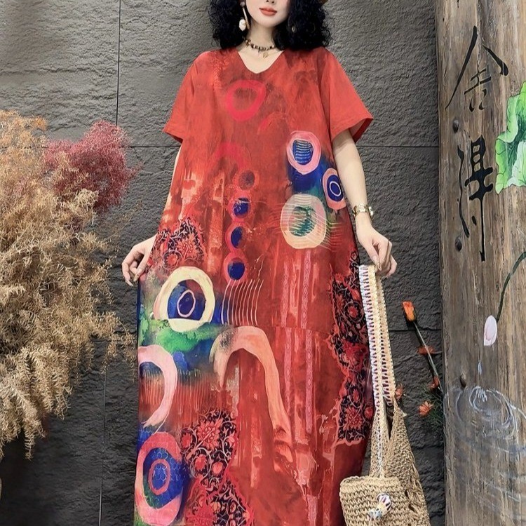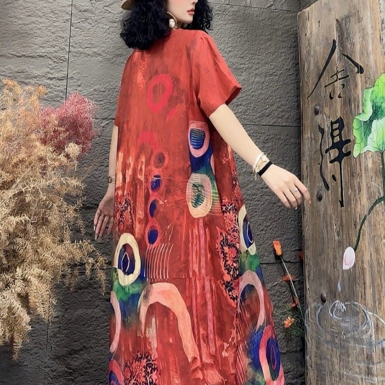 RY1696# 欧美跨境女装2026新款棉麻印花连衣裙女宽松大码休闲高端萱麻长裙