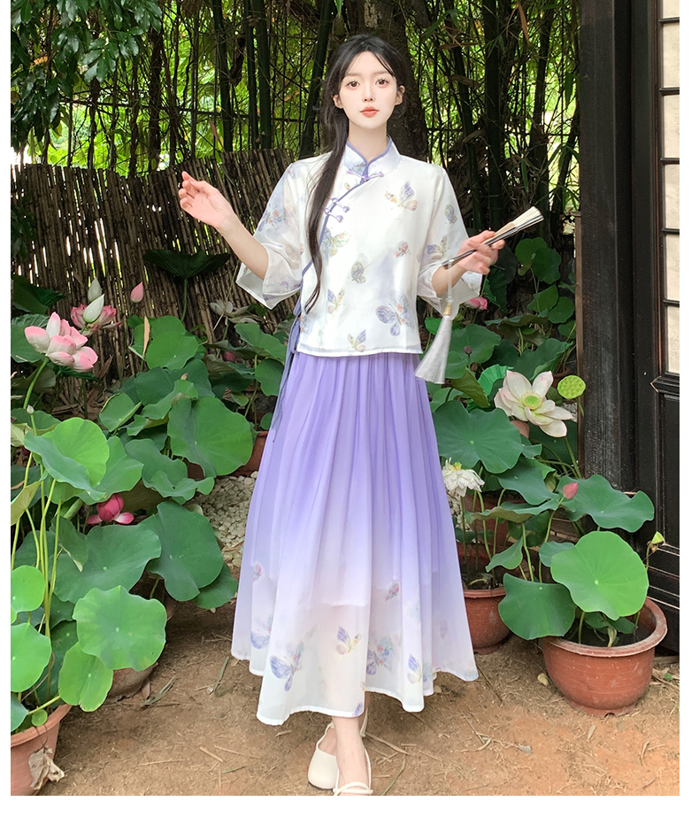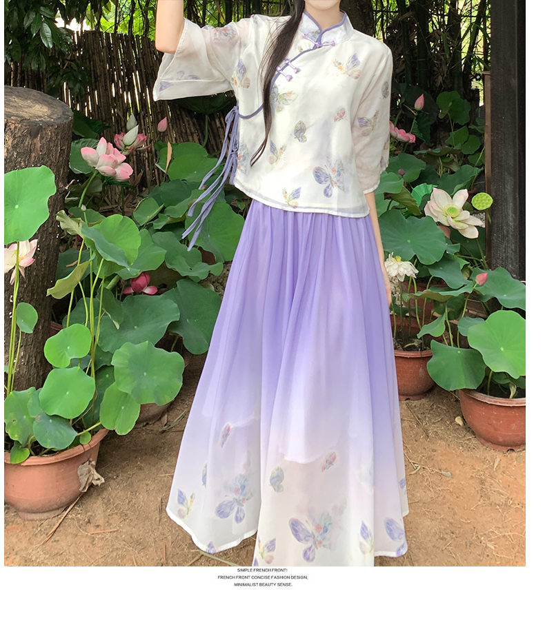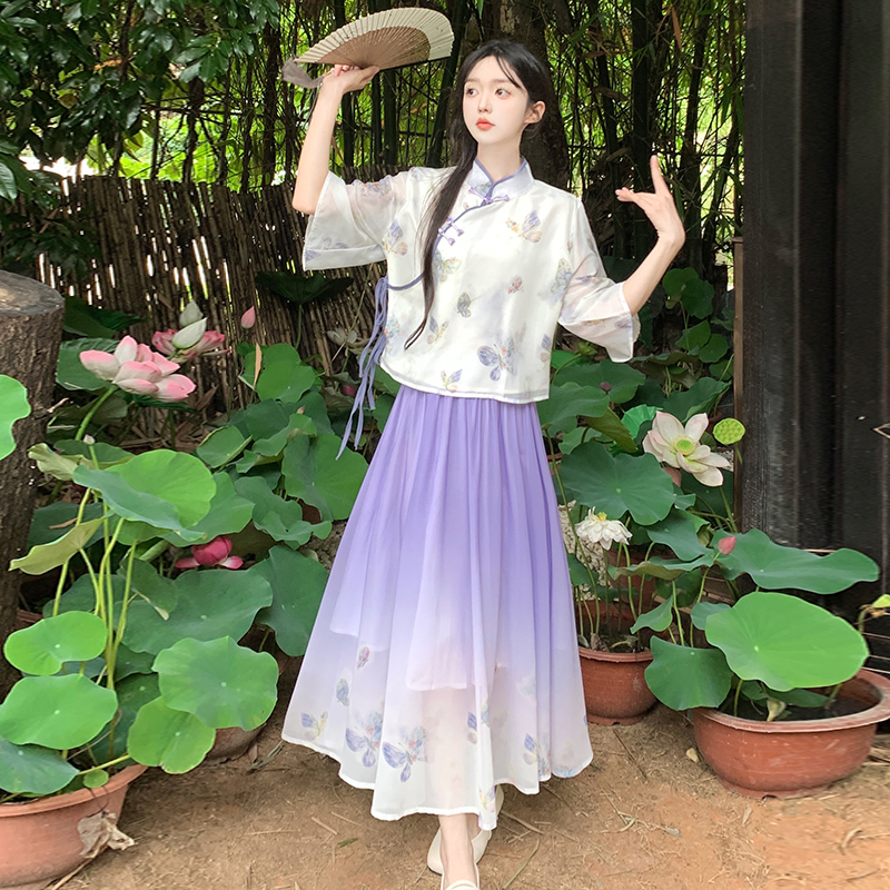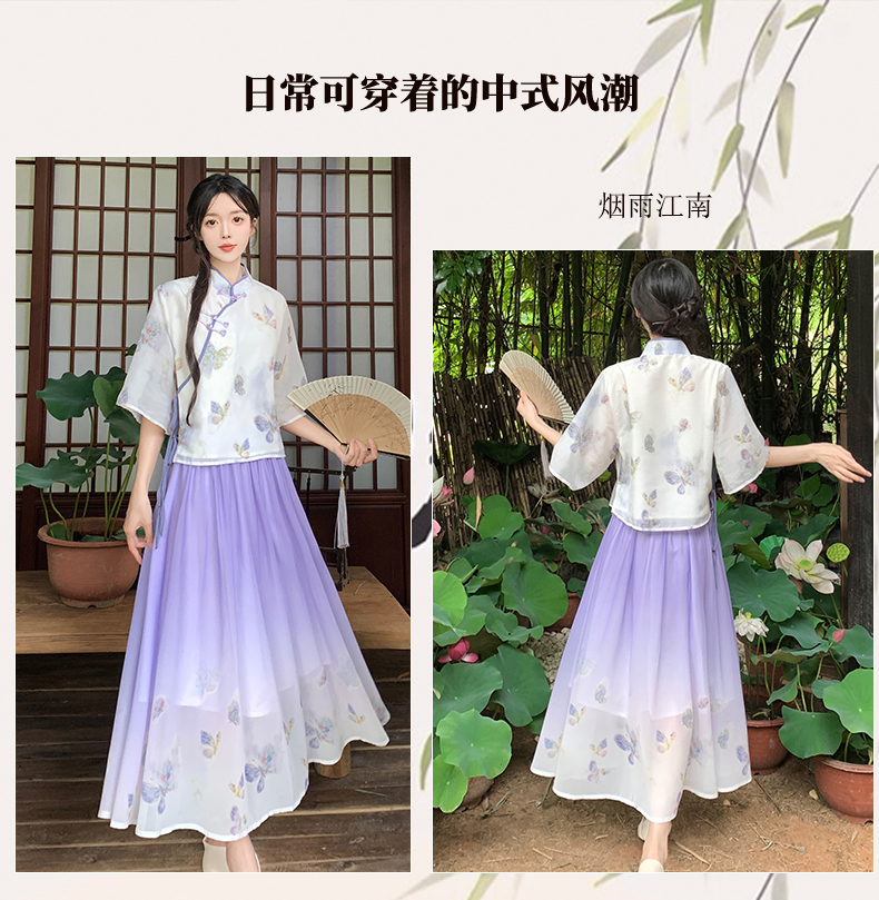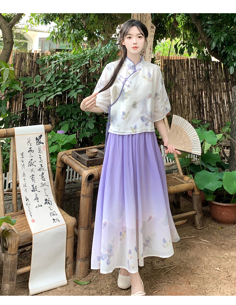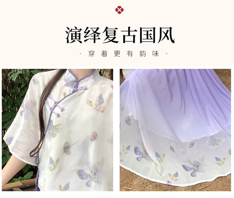 RY1702# 大码女装胖夏季新款新中式国风盘扣上衣+半身长裙两件套