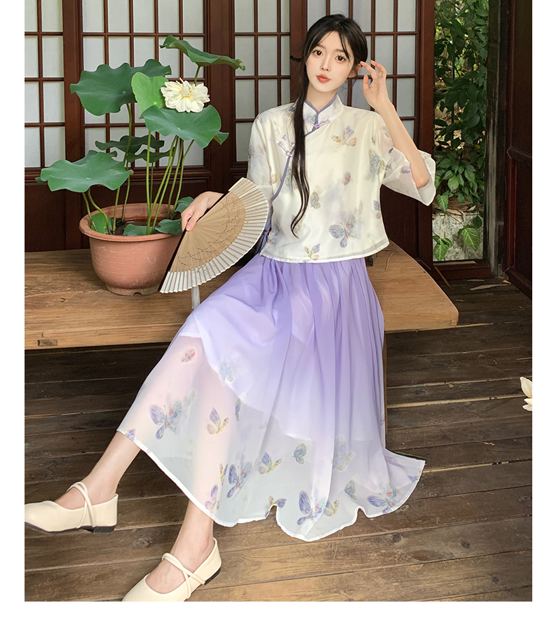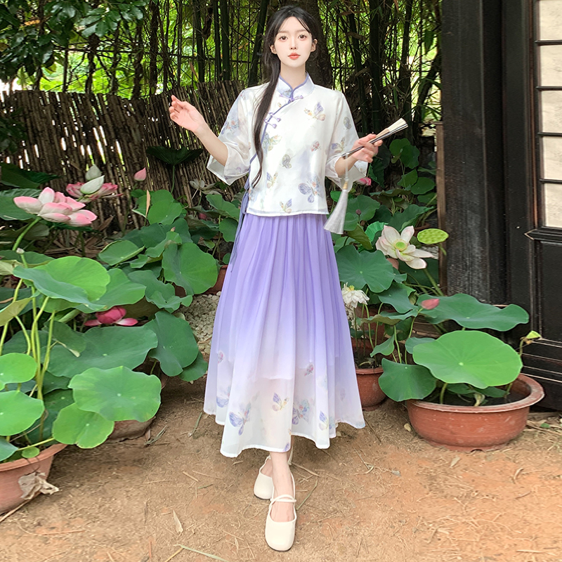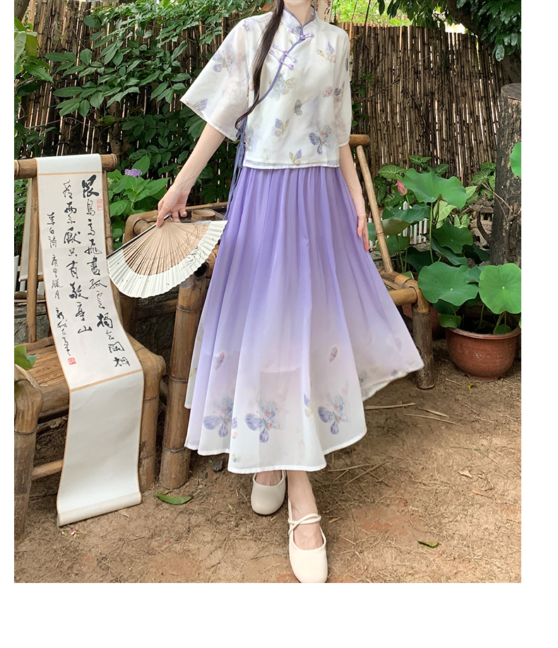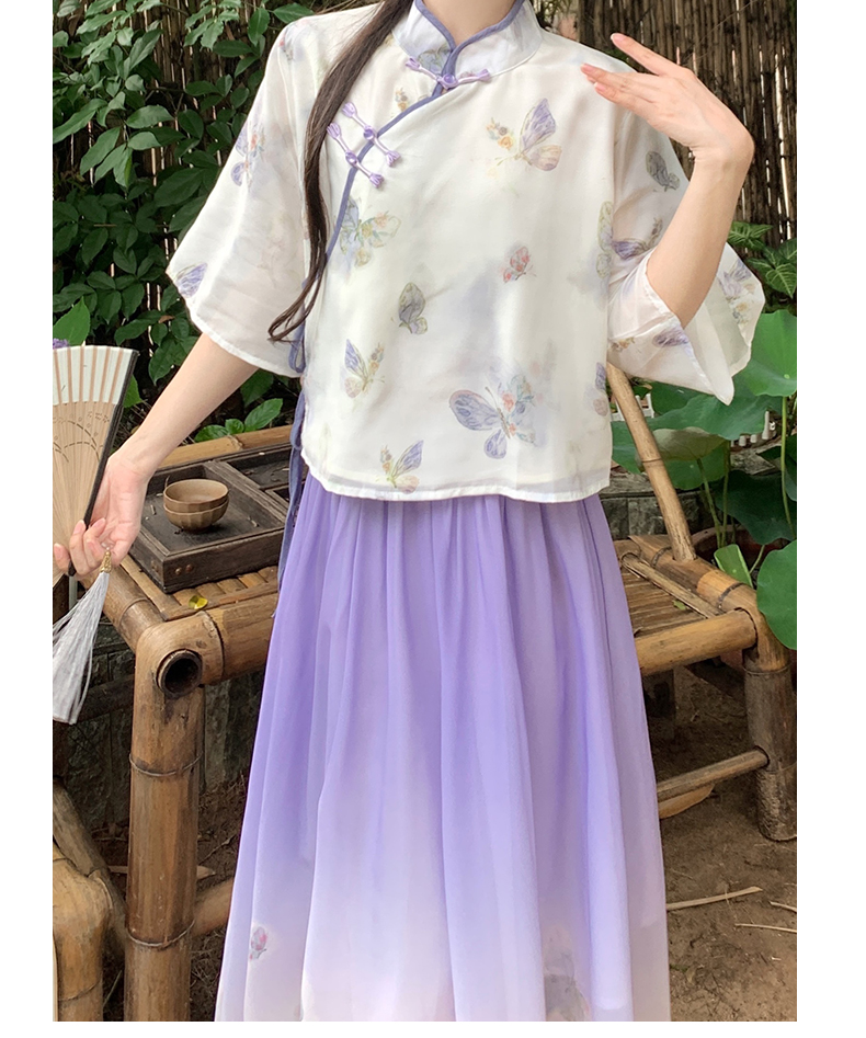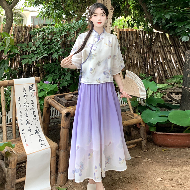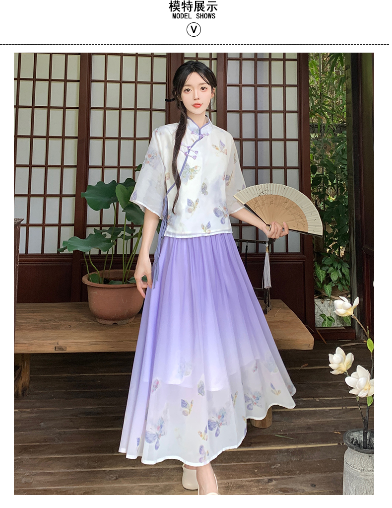 RY1702# 大码女装胖夏季新款新中式国风盘扣上衣+半身长裙两件套
