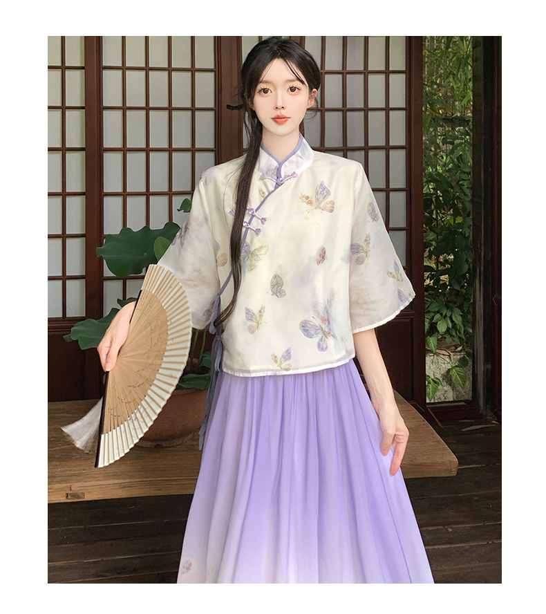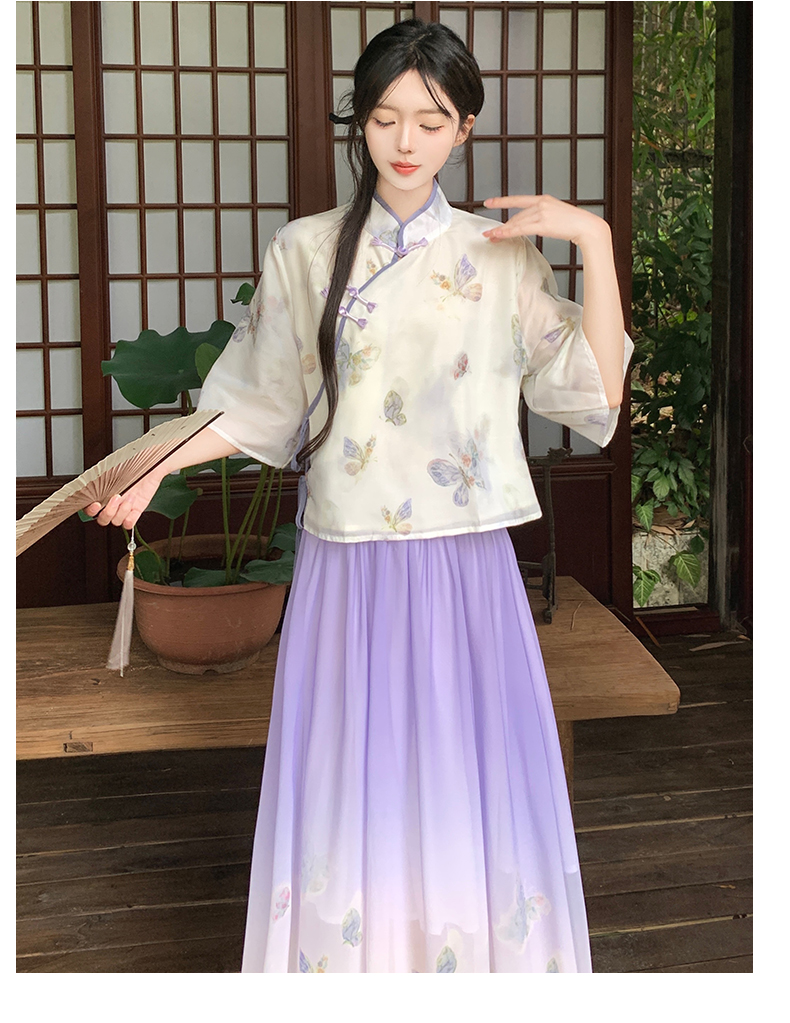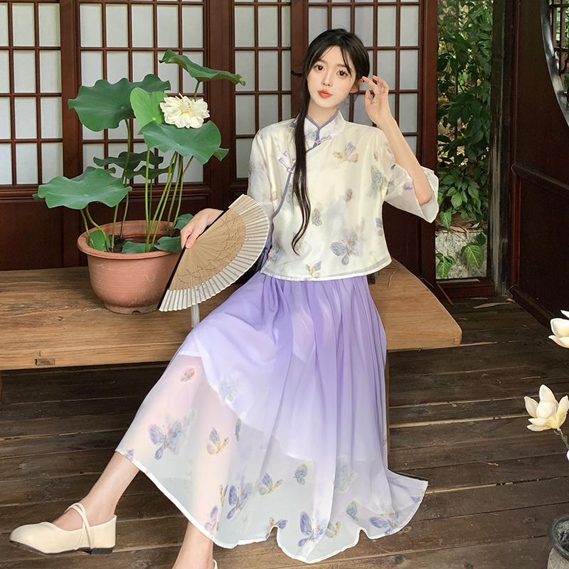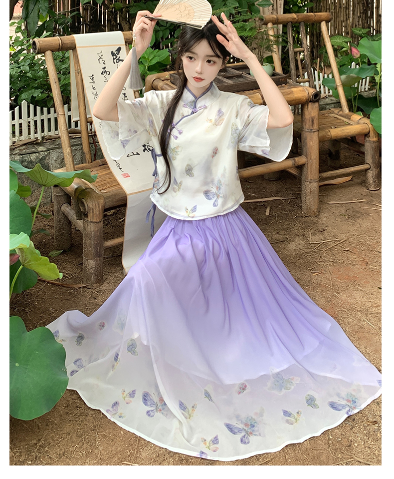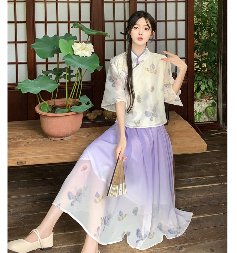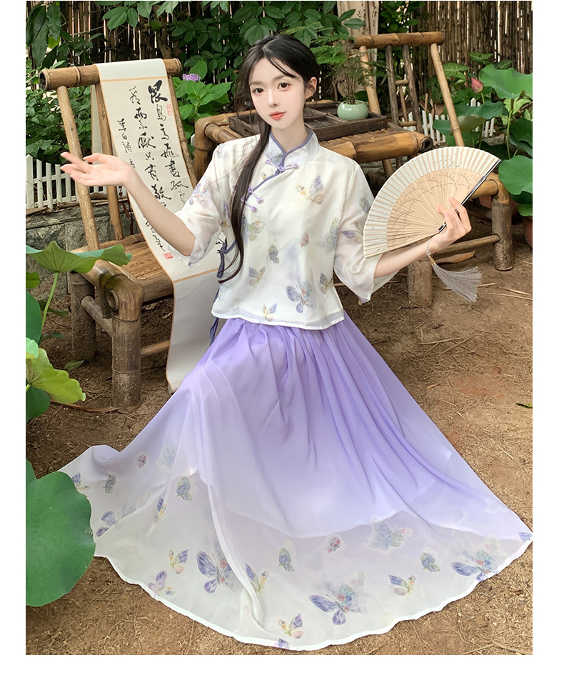 RY1702# 大码女装胖夏季新款新中式国风盘扣上衣+半身长裙两件套