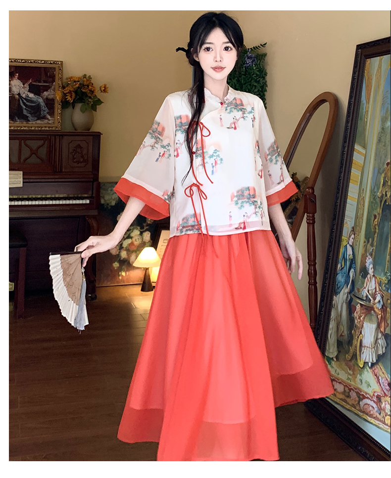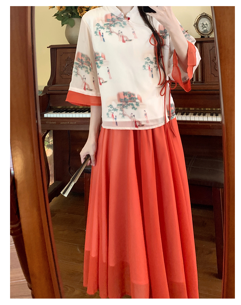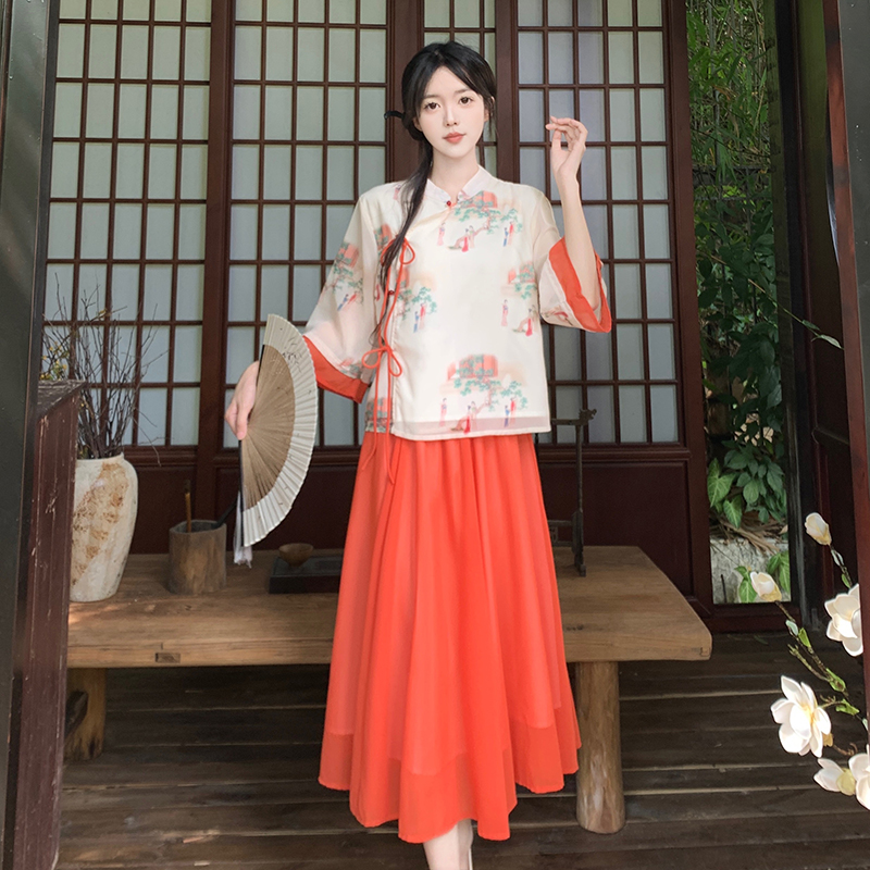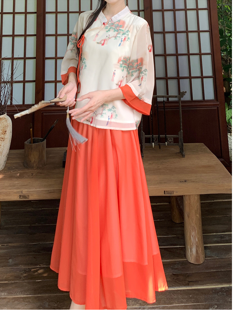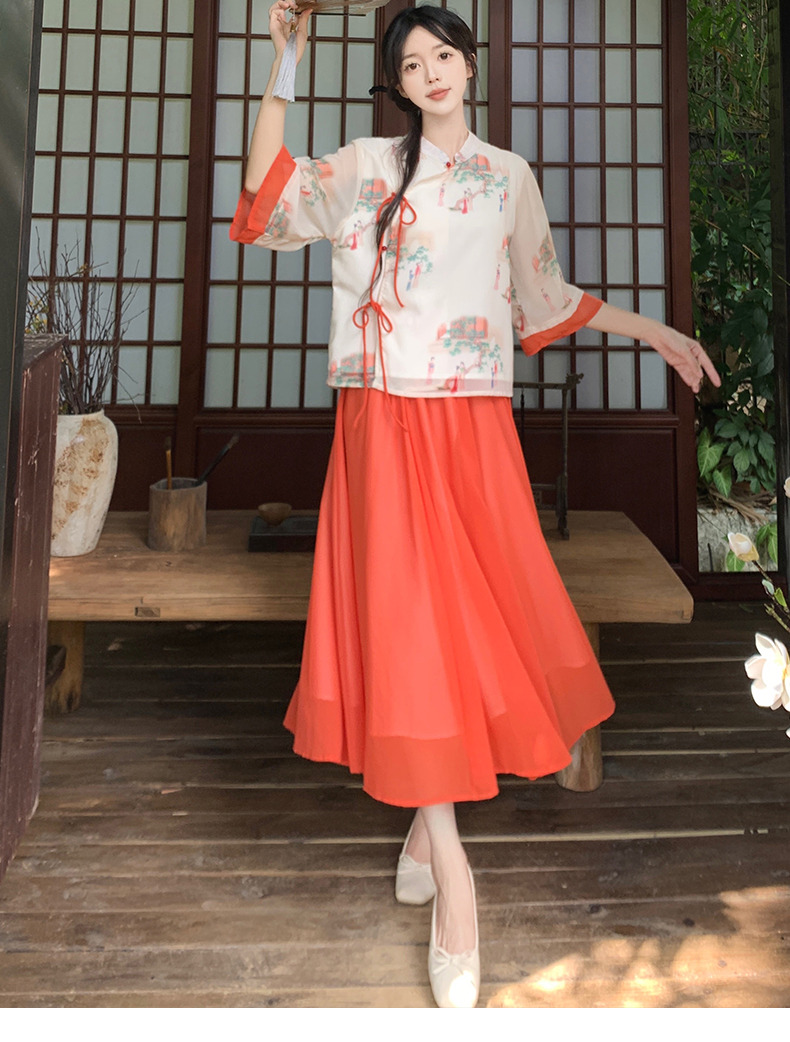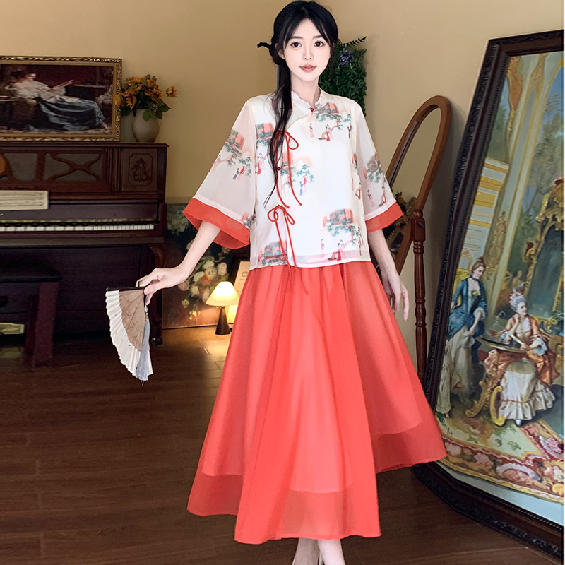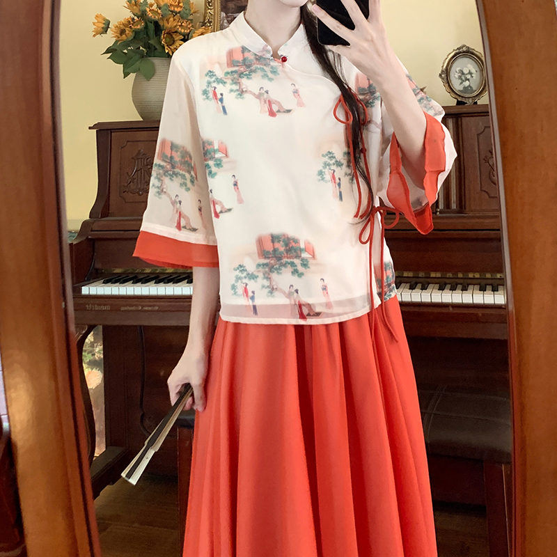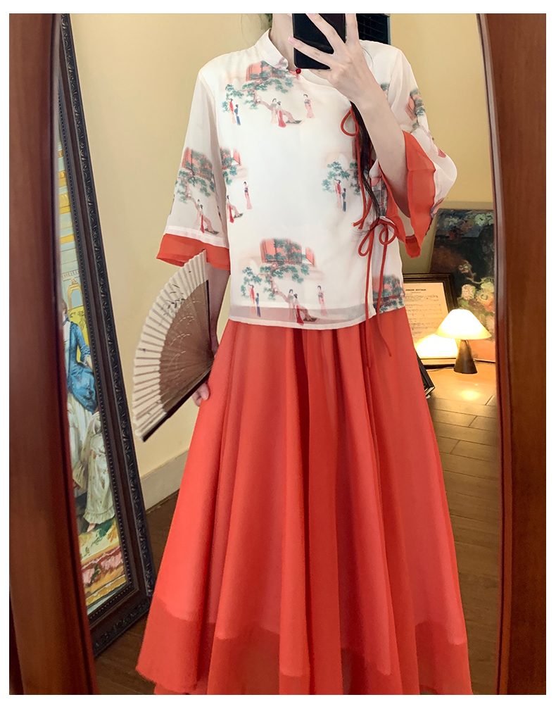 RY1703# 大码女装夏季新款新中式改良盘扣国风印花上衣+半身裙两件套