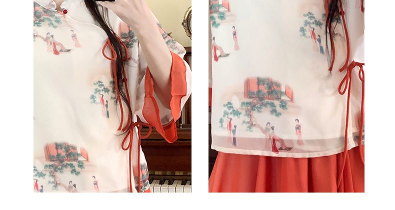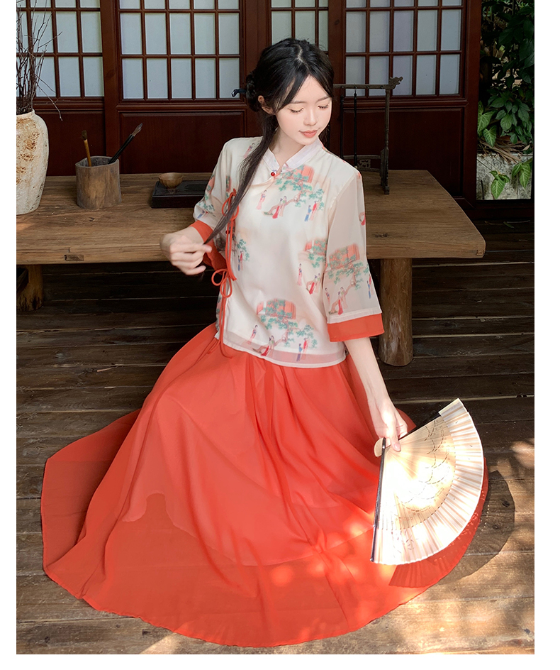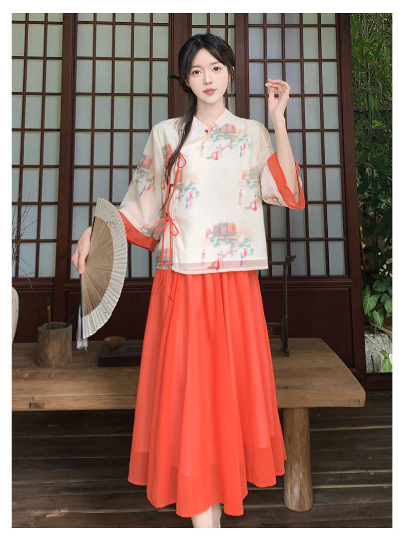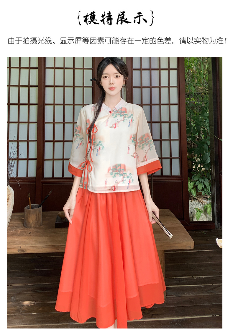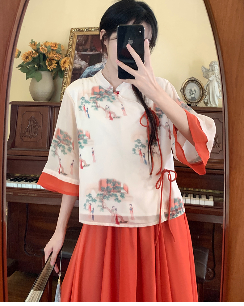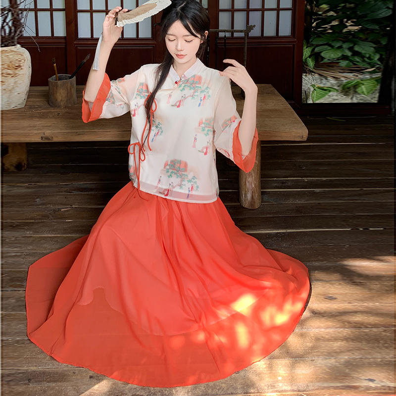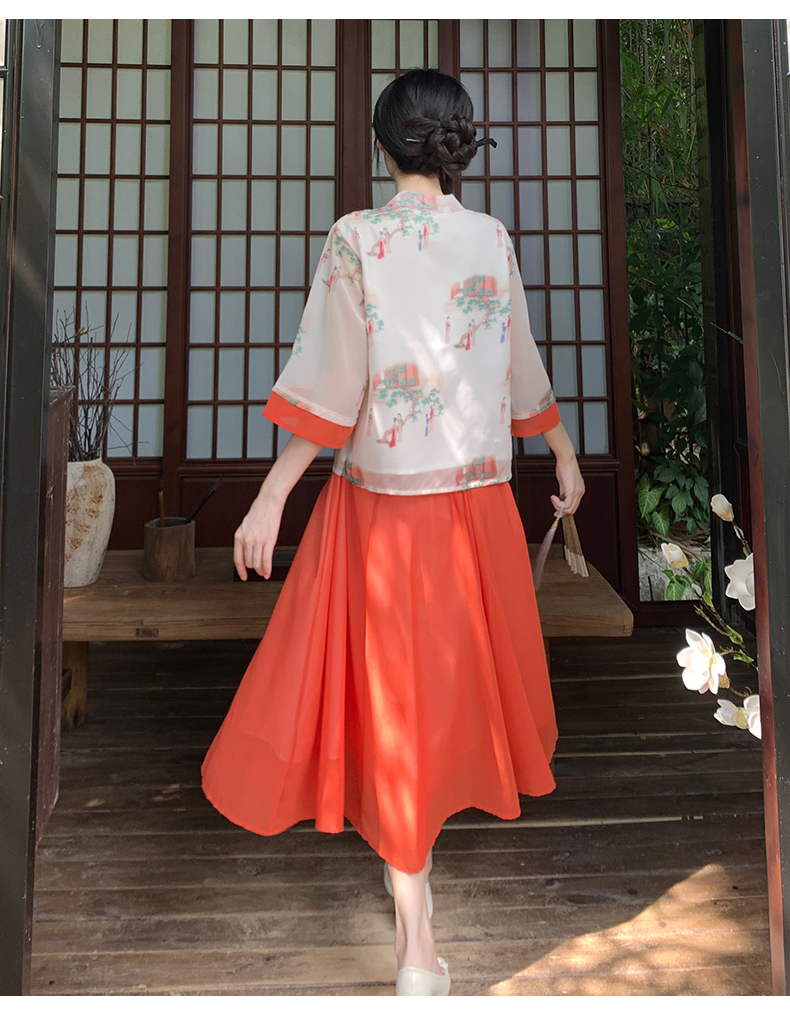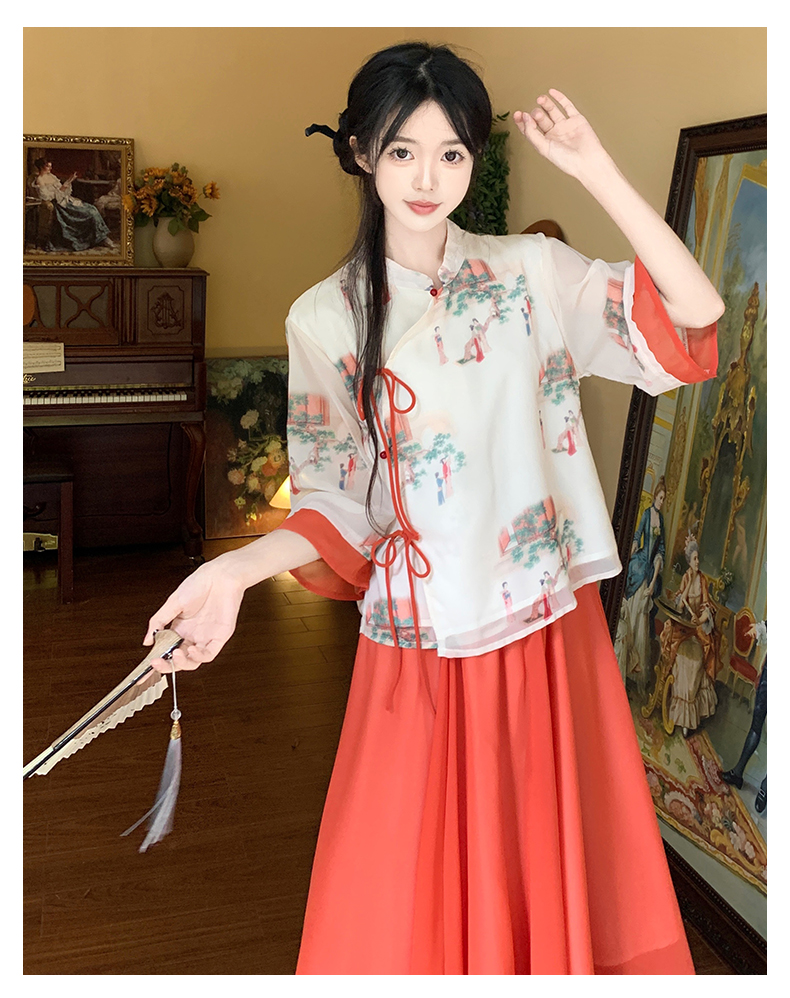 RY1703# 大码女装夏季新款新中式改良盘扣国风印花上衣+半身裙两件套